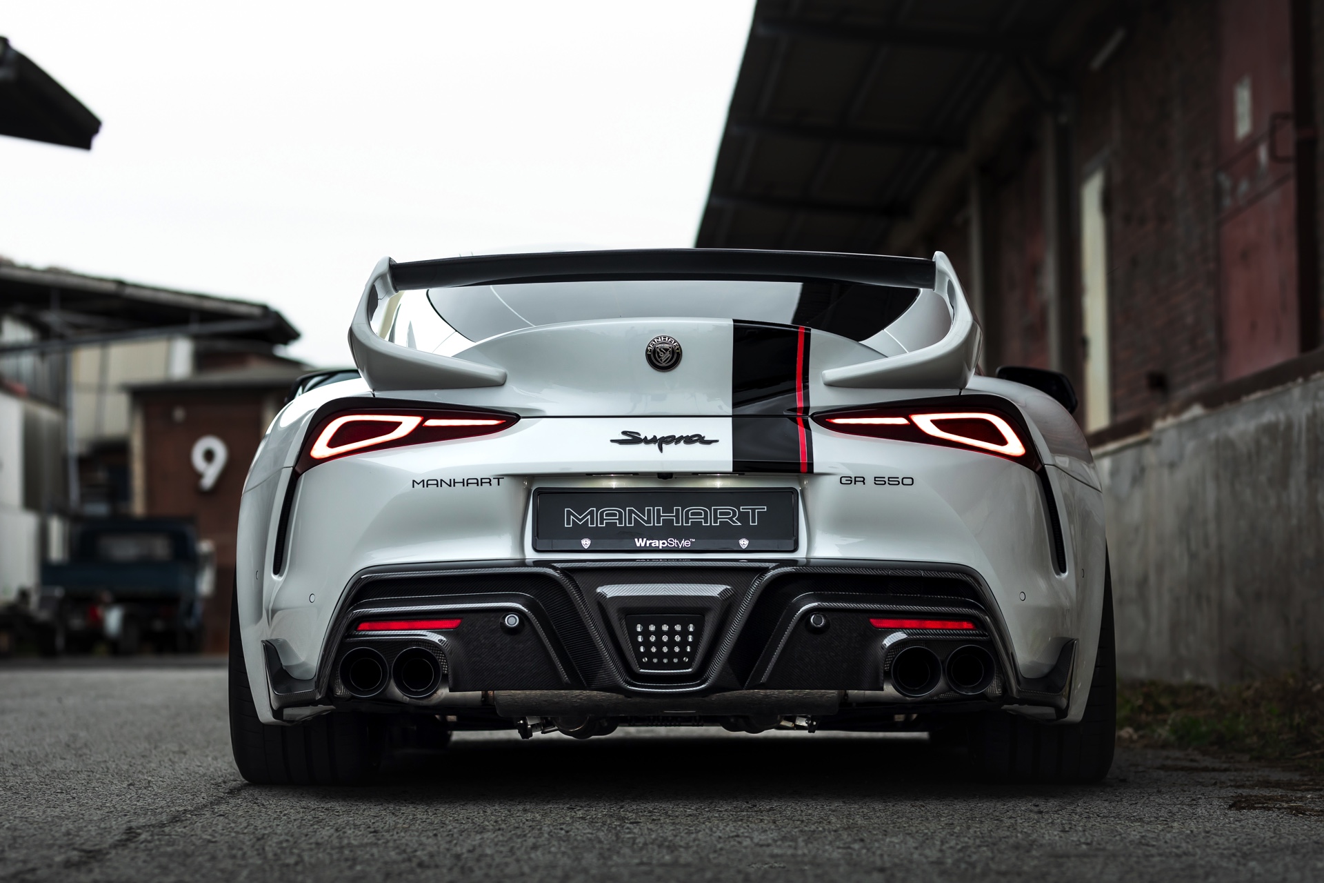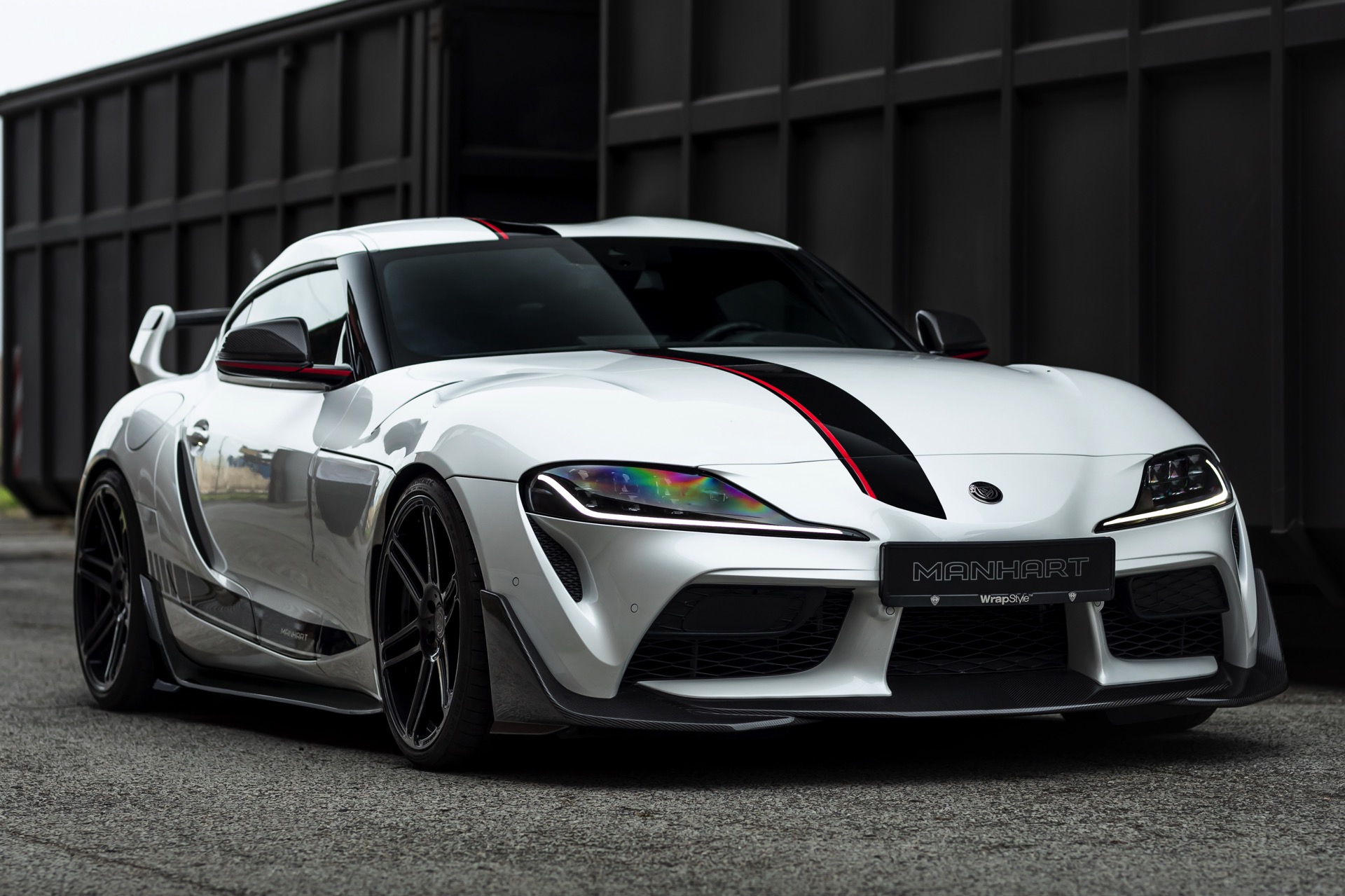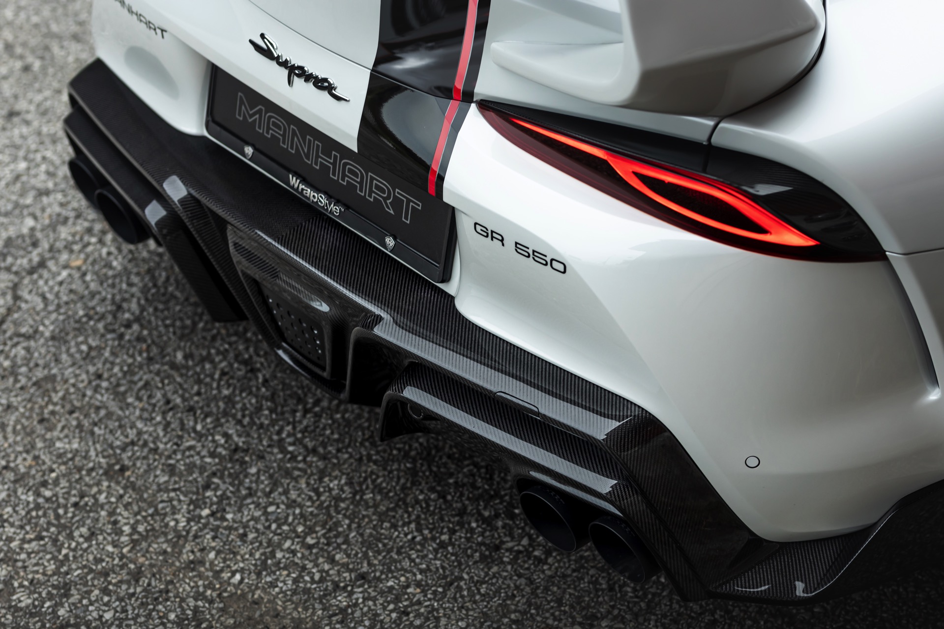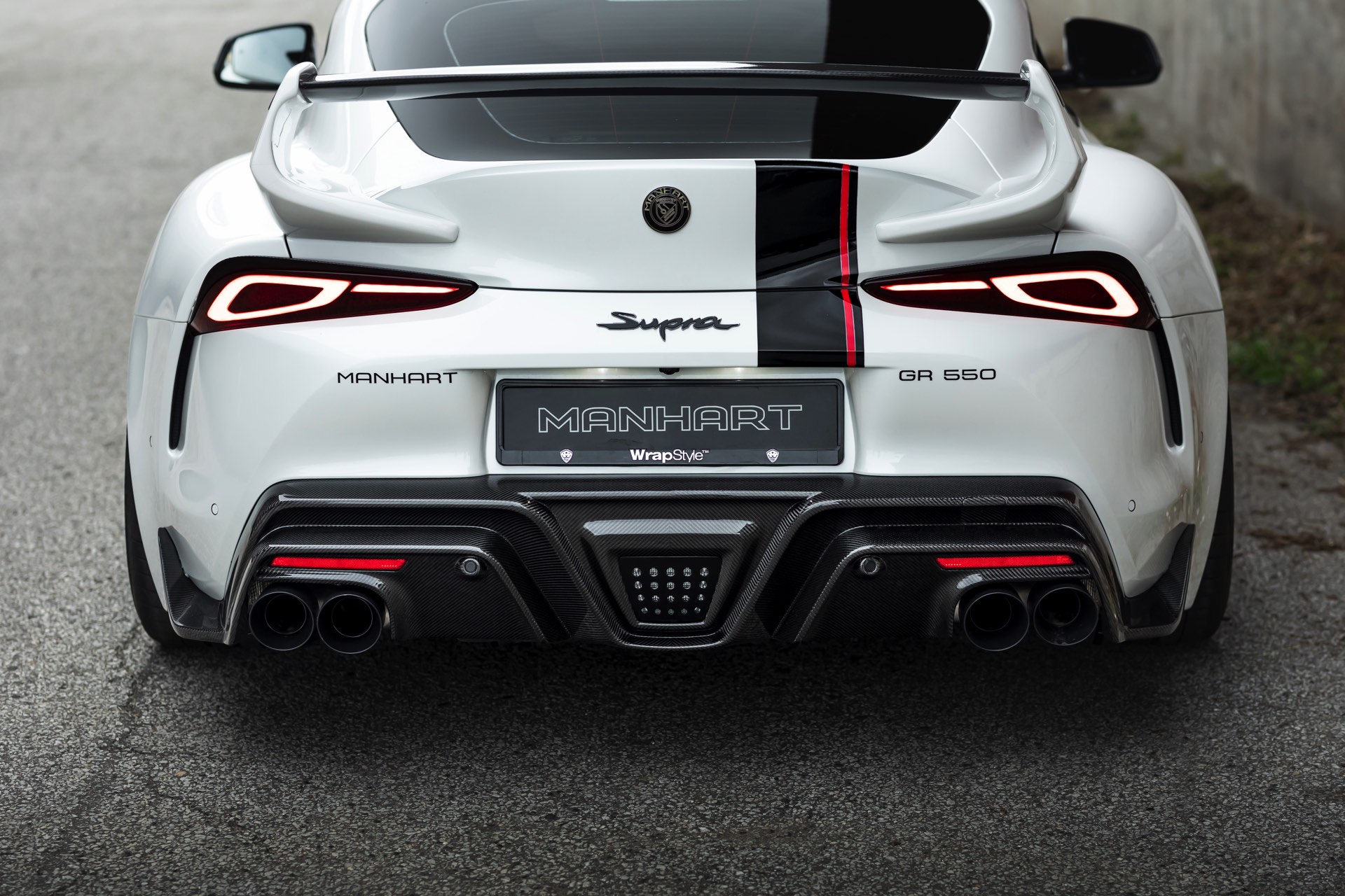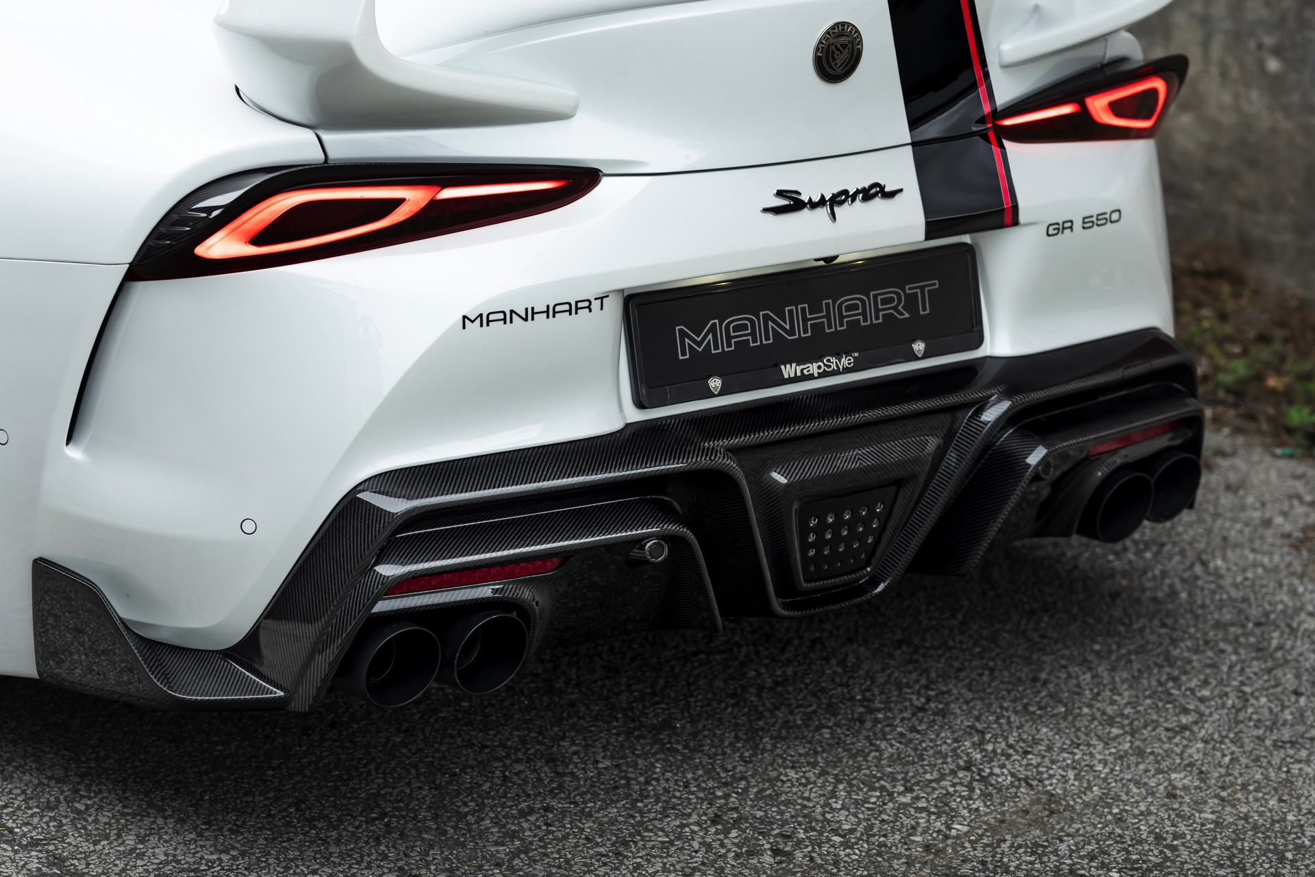 Die ohnehin außergewöhnliche Optik des Supra kann dem Coupé mit einem Manhart Carbon-Bodykit unter die Arme greifen: Frontspoiler, Motorhauben-Einsätze, Seitenschweller, Spiegelkappen und Diffusor stehen dabei klar im Schatten des Heckflügels, der schon von weitem für eine klare Abgrenzung von der Serie sorgt.