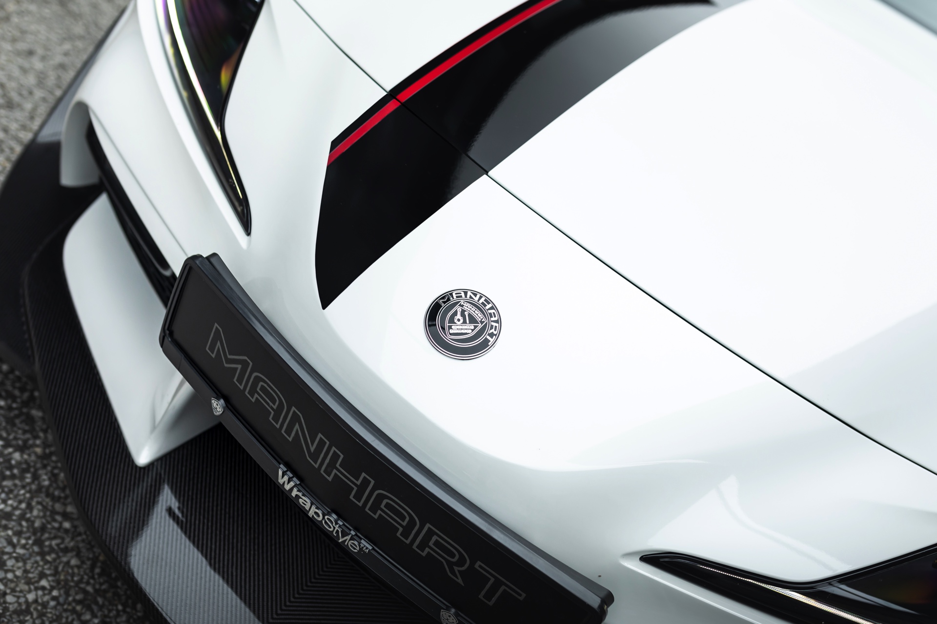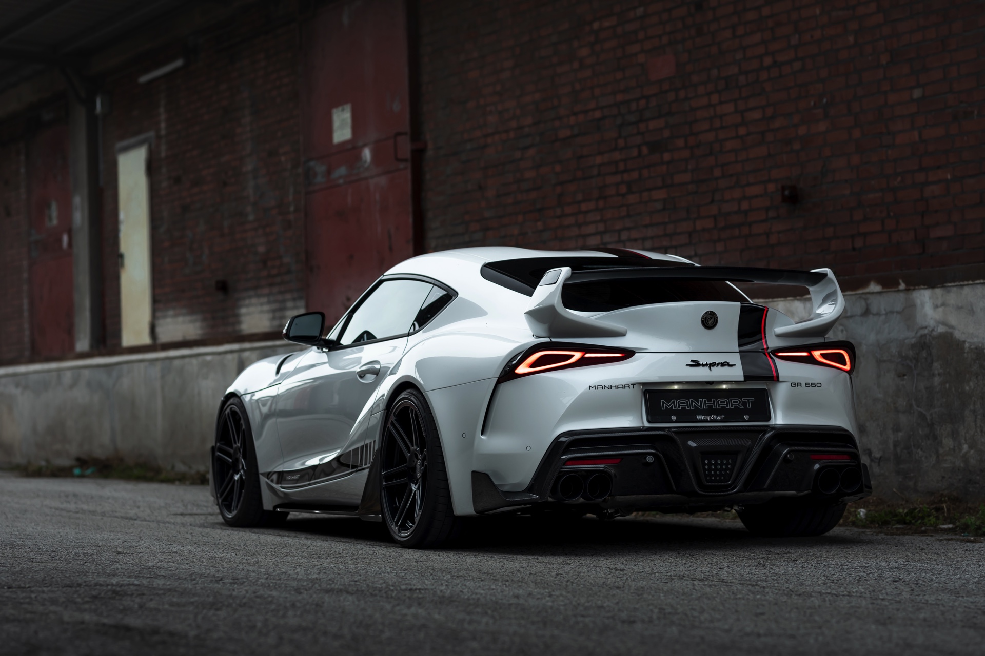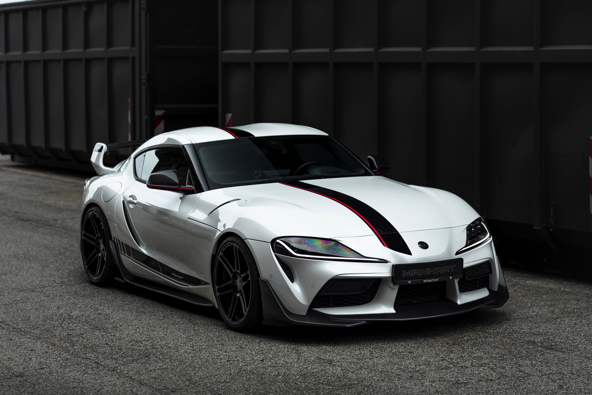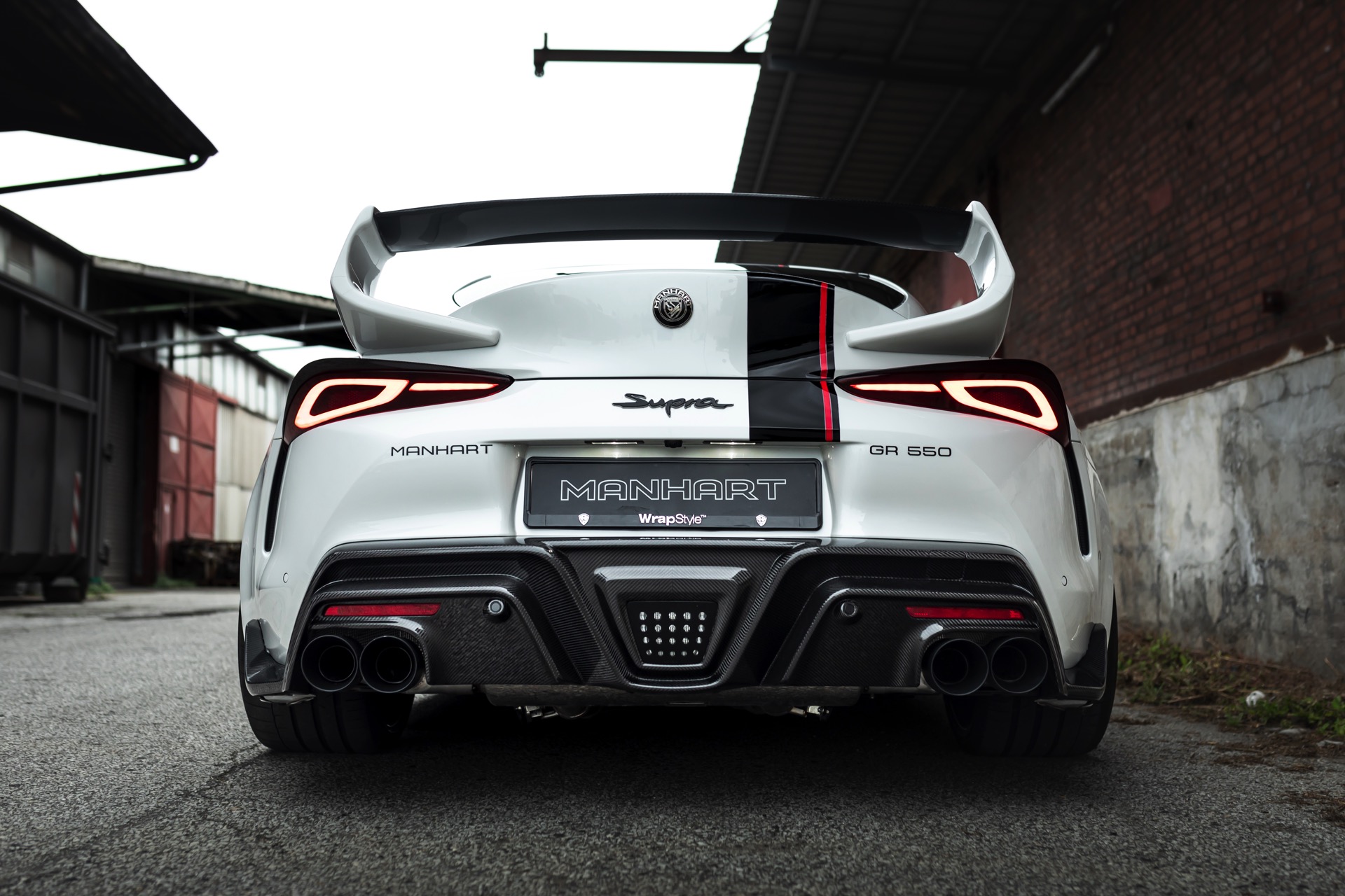Die ohnehin außergewöhnliche Optik des Supra kann dem Coupé mit einem Manhart Carbon-Bodykit unter die Arme greifen: Frontspoiler, Motorhauben-Einsätze, Seitenschweller, Spiegelkappen und Diffusor stehen dabei klar im Schatten des Heckflügels, der schon von weitem für eine klare Abgrenzung von der Serie sorgt.