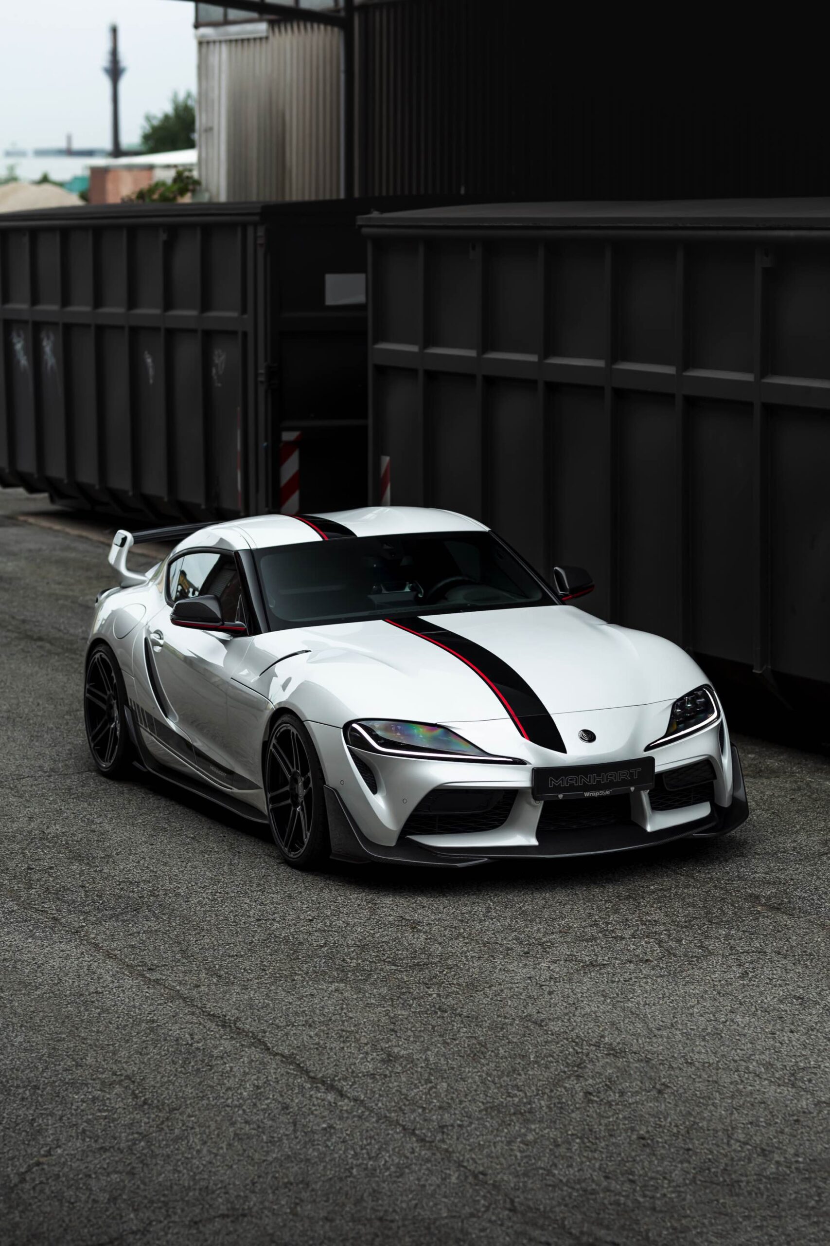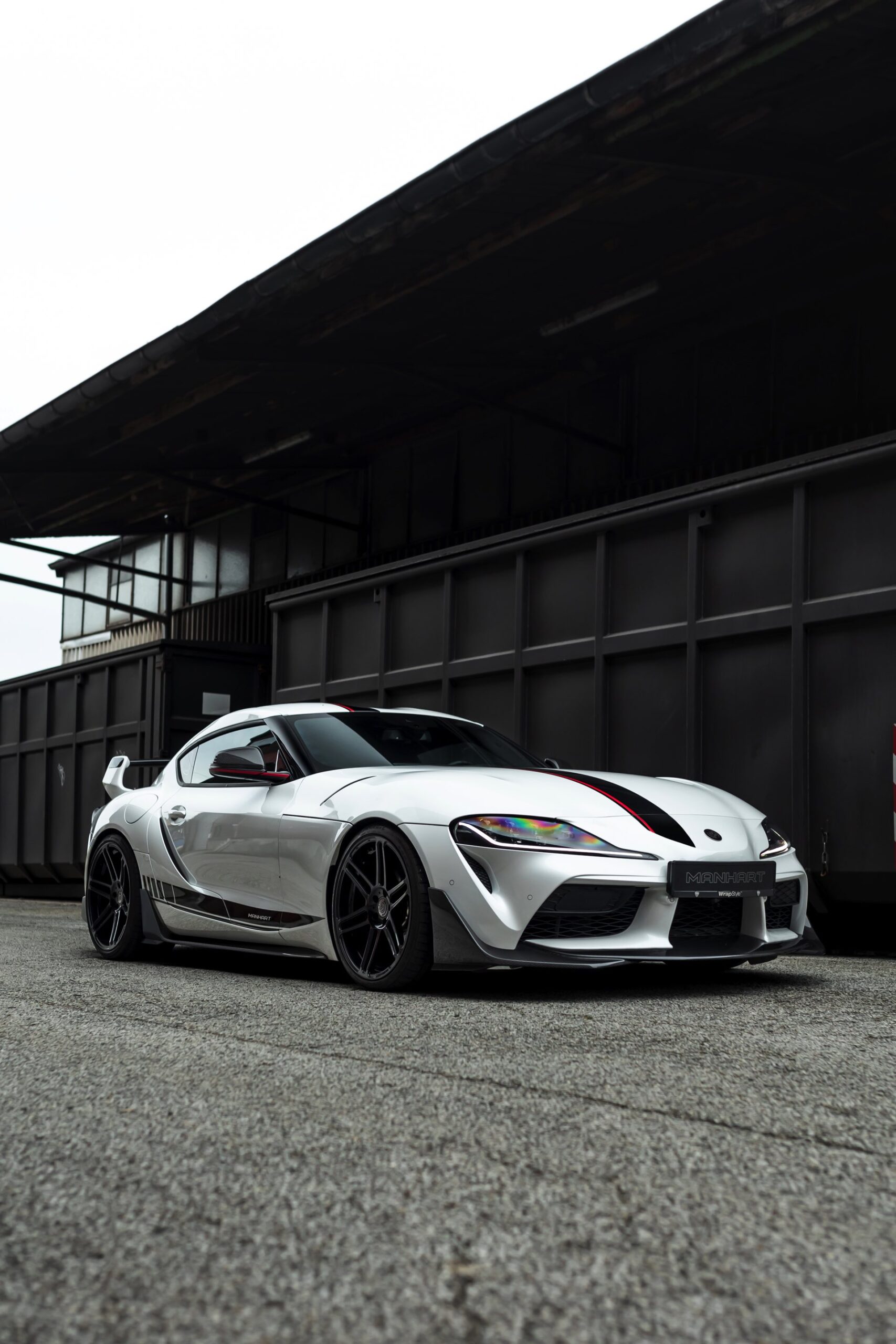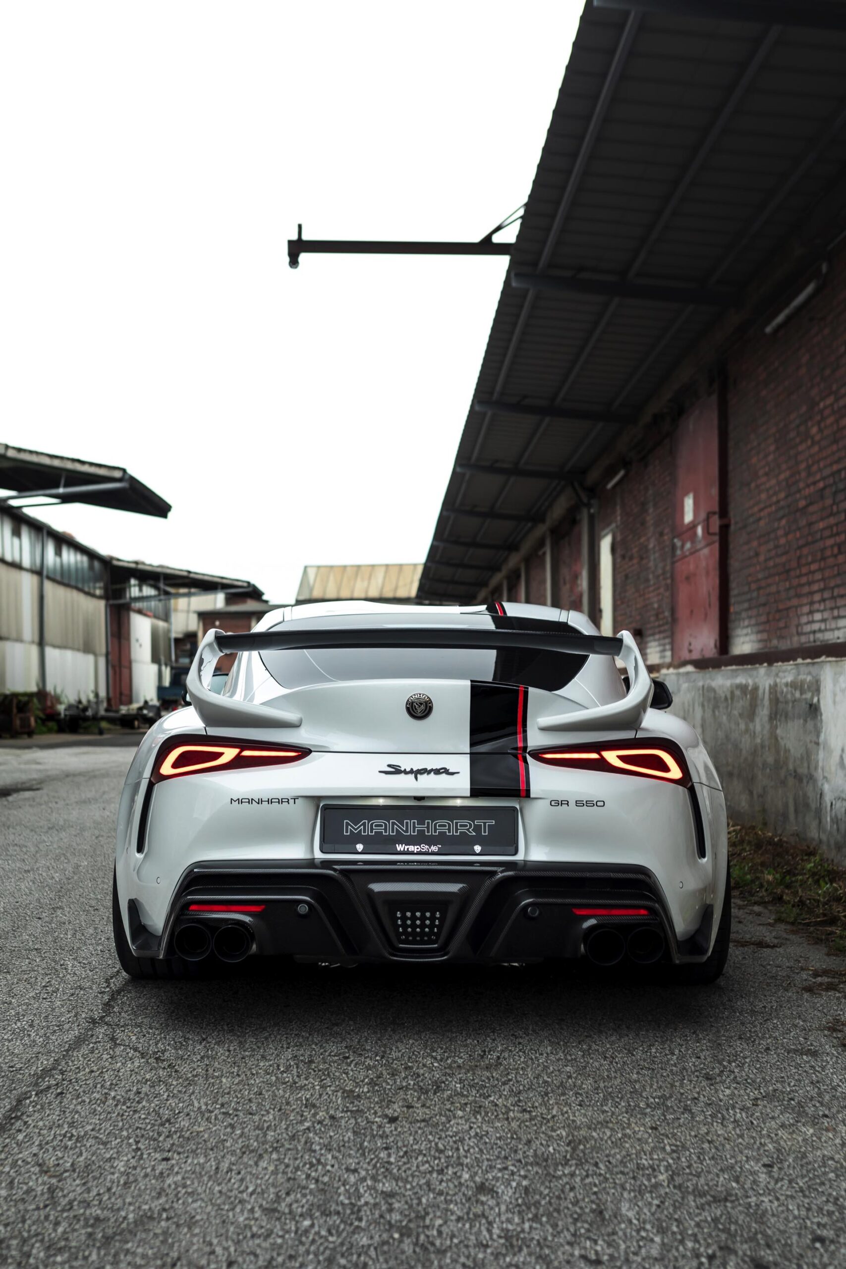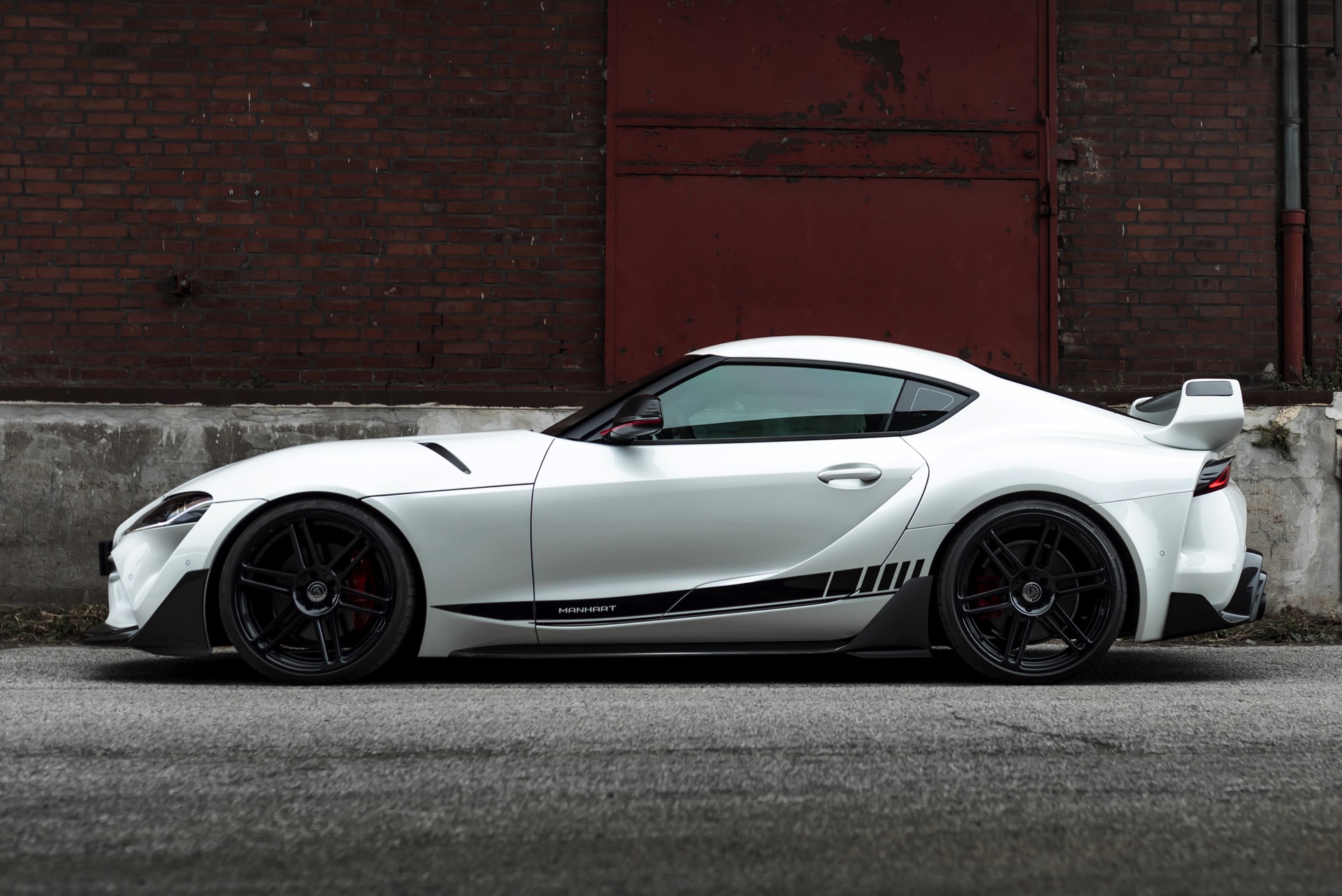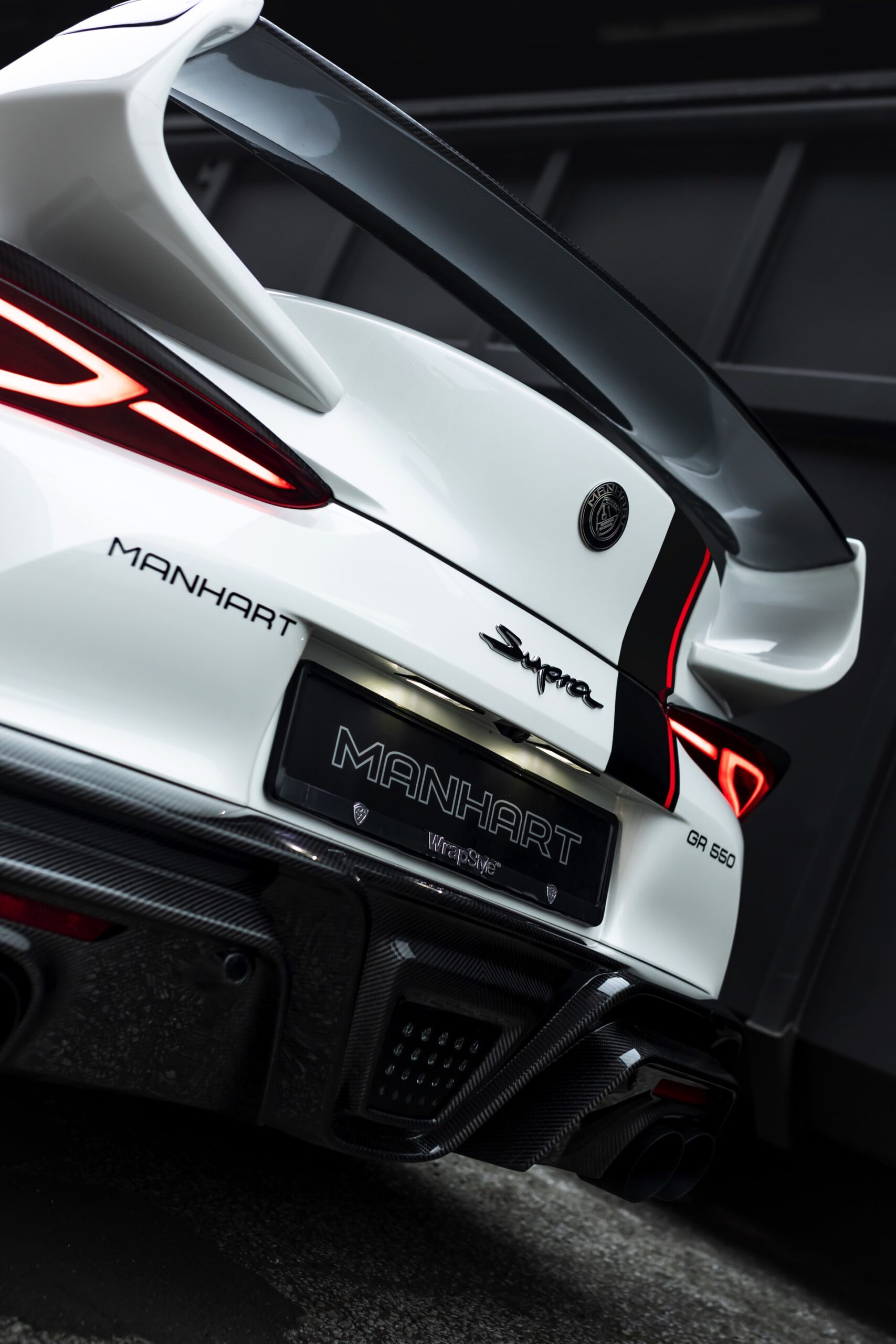Die ohnehin außergewöhnliche Optik des Supra kann dem Coupé mit einem Manhart Carbon-Bodykit unter die Arme greifen: Frontspoiler, Motorhauben-Einsätze, Seitenschweller, Spiegelkappen und Diffusor stehen dabei klar im Schatten des Heckflügels, der schon von weitem für eine klare Abgrenzung von der Serie sorgt.
