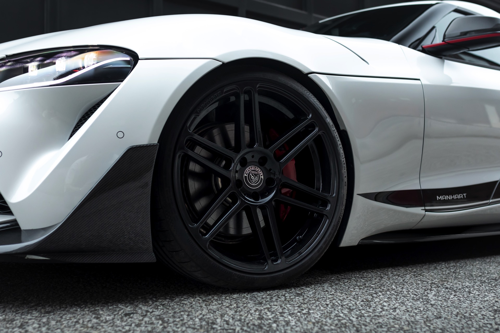 Passend zum Power-Tuning auf 550 PS bietet Manhart auch mehrere Fahrwerks-Optionen, die den Toyota GR Supra auch auf kurvigen Strecken noch schneller macht: Angeboten werden als Einstieg H&R-Tieferlegungs-Federn, es gibt aber auch ein Gewindefahrwerk V3 von KW. Damit die 20 Zoll großen Concave One-Felgen perfekt in den Radhäusern stehen, sorgen Spurverbreiterungen von H&R für ein optimales Setup.