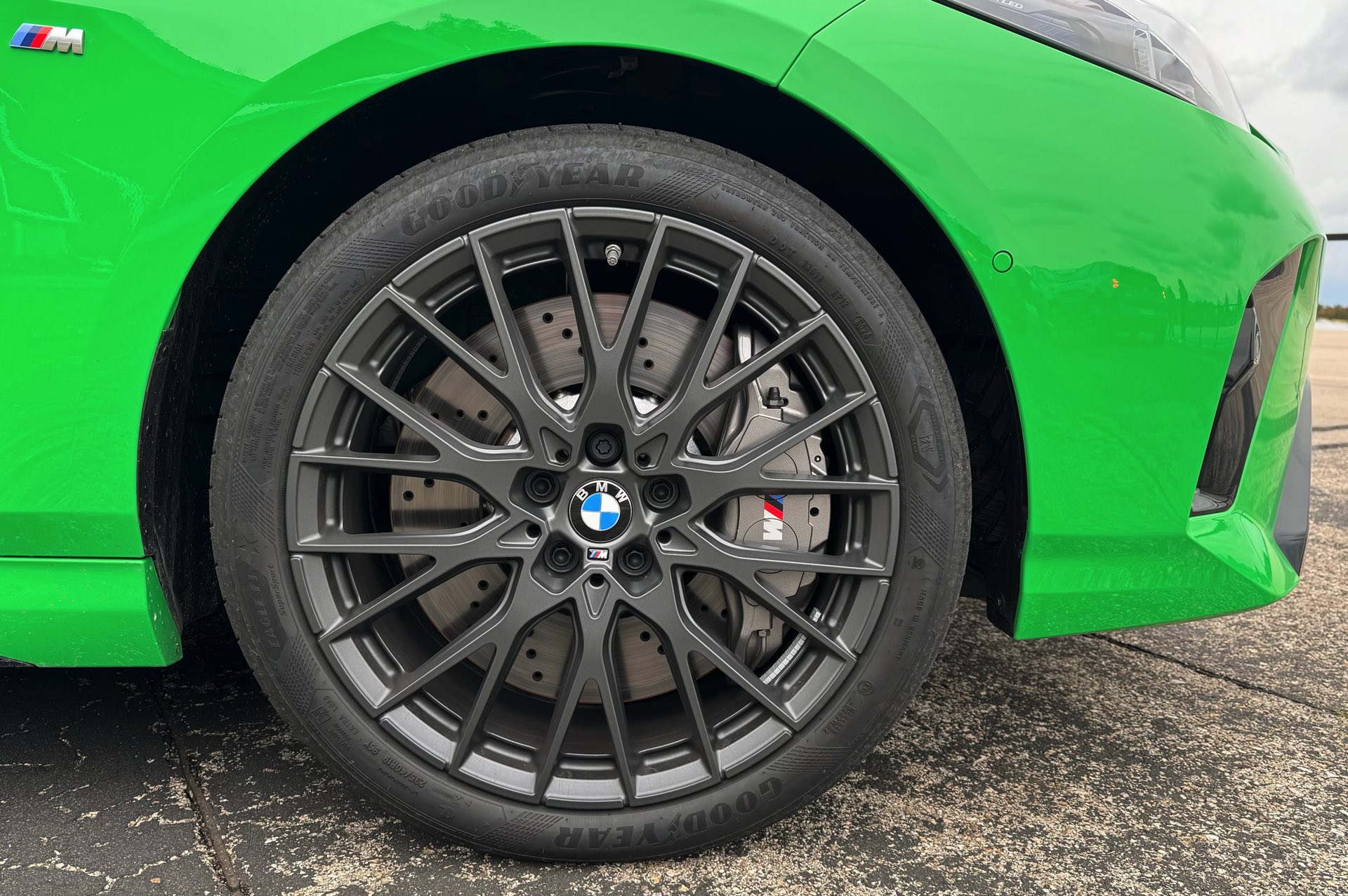 Ein weiterer Hingucker sind die 19 Zoll großen Schmiedefelgen im Design Y-Speiche 1085 M, das nicht im regulären Konfigurator auftaucht. Die Felgen sind mit Sportreifen vom Typ Goodyear Eagle F1 Super Sport bezogen und stehen insofern für eine der griffigsten Optionen zur Bereifung des neuen M135 xDrive. Hinter den Speichen lassen sich die silber-grauen Bremssättel der optionalen M Compound-Bremsanlage erkennen, die 850 Euro Aufpreis kostet und mit größeren, gelochten Bremsscheiben an der Vorderachse wesentlich mehr Standfestigkeit bei scharfer Gangart versprechen. "