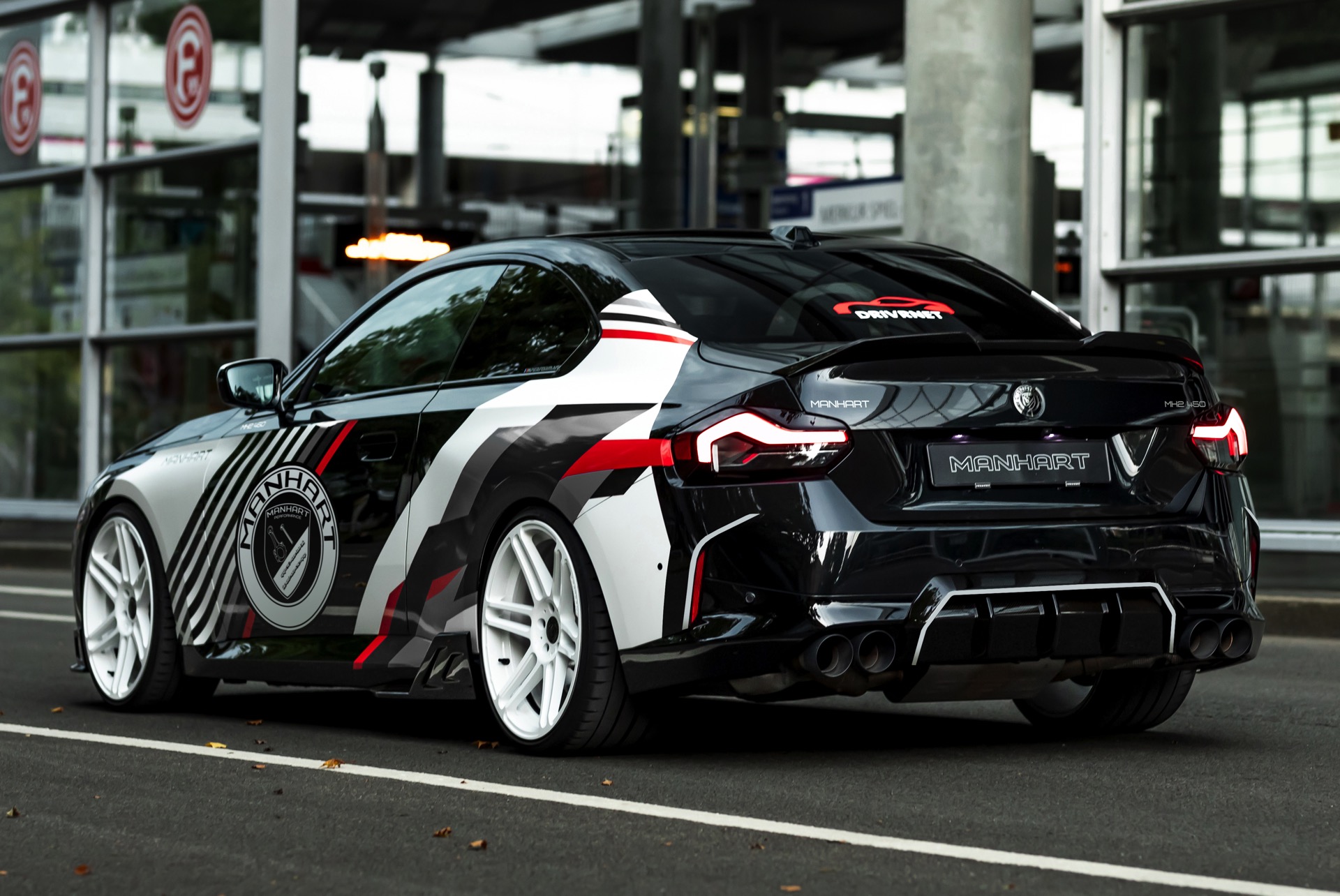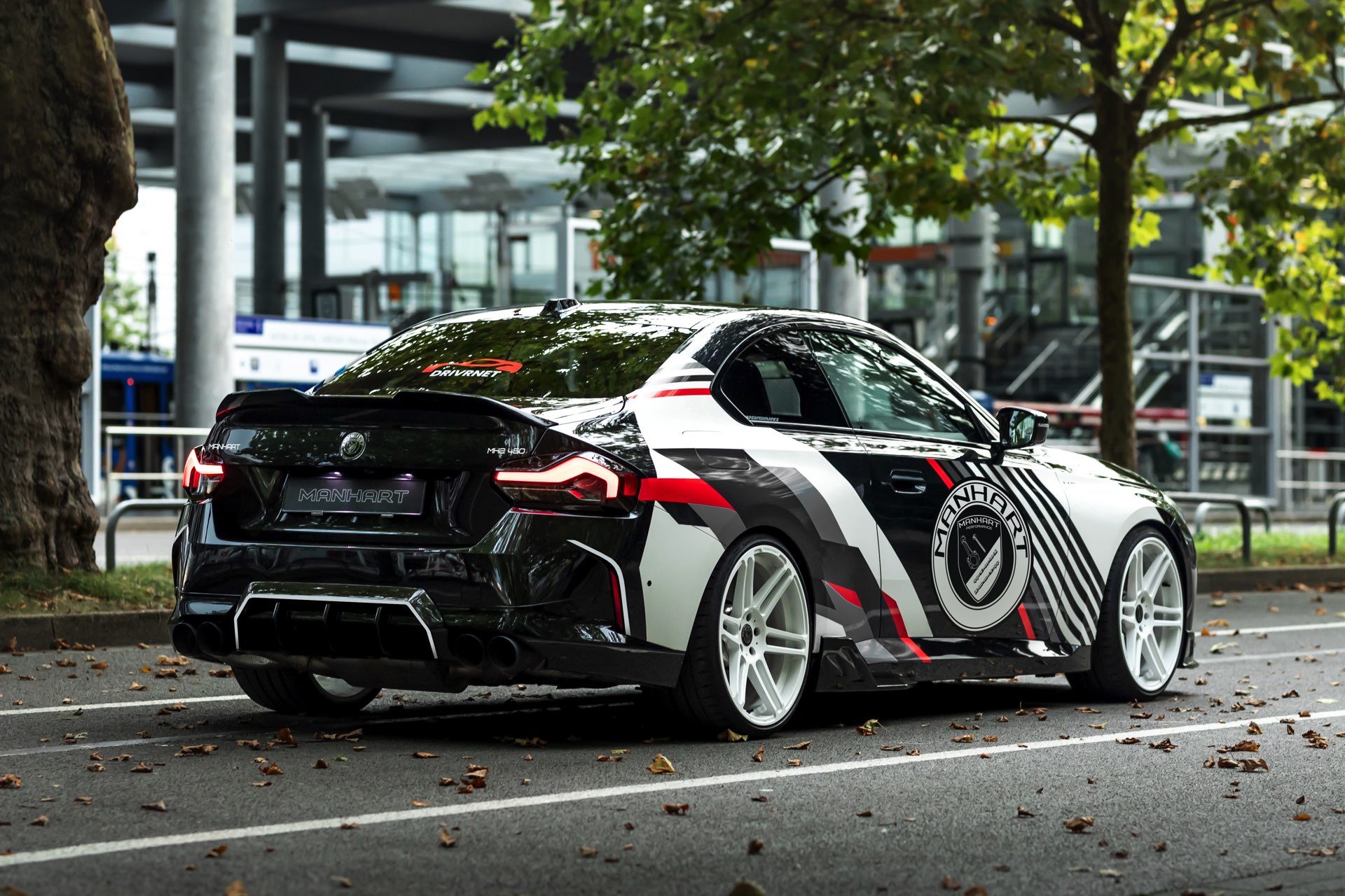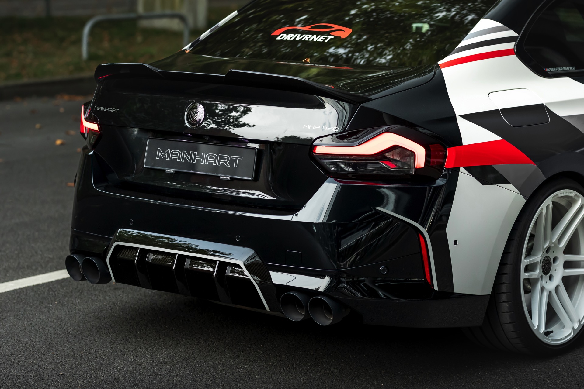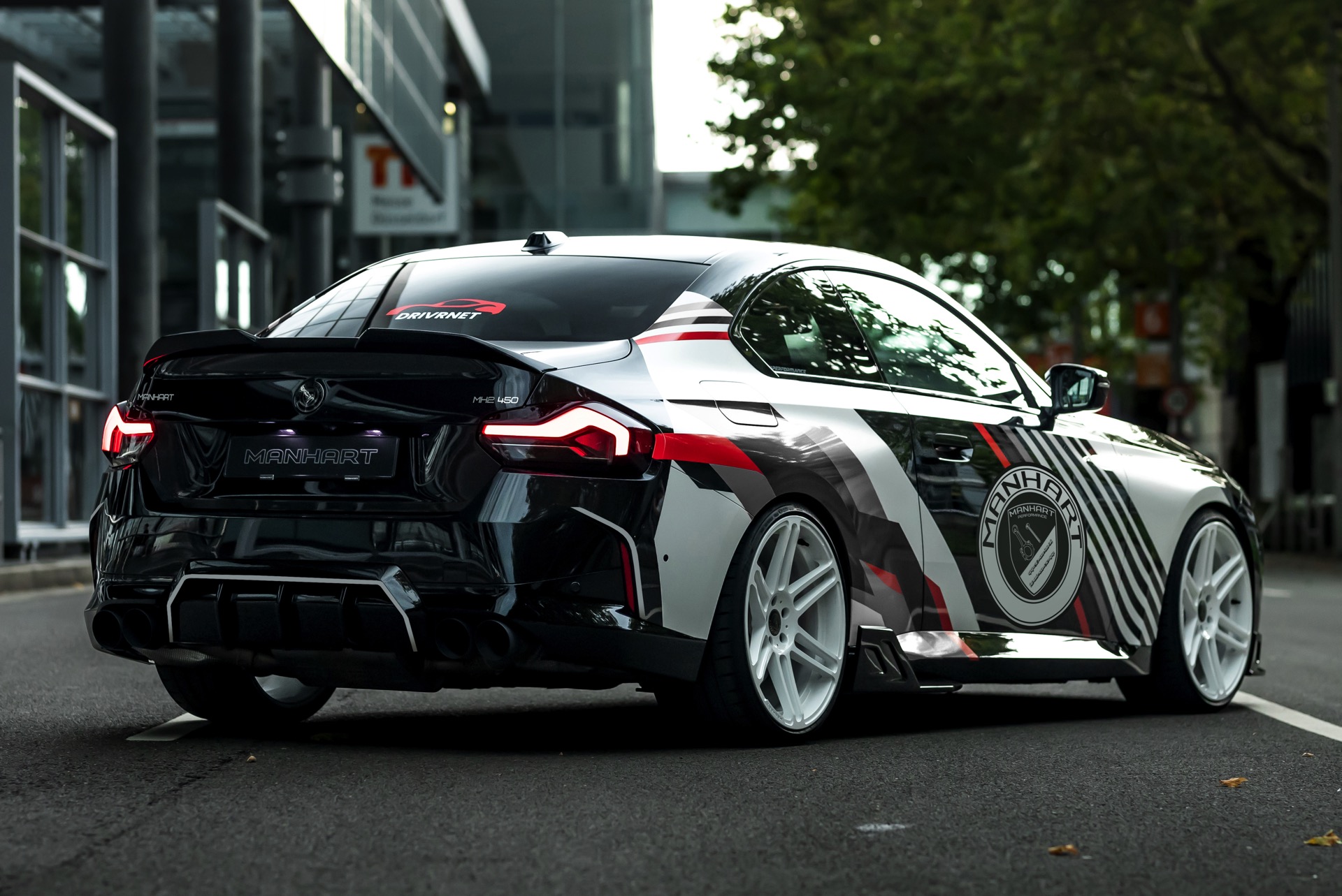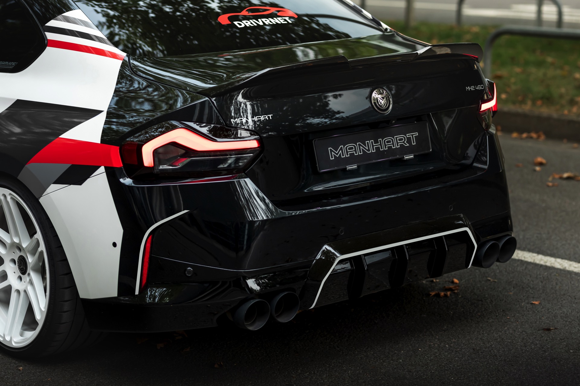 Herzstück des Manhart MH2 450 genannten Kompaktsportlers ist die Leistungssteigerung auf 440 PS und 600 Newtonmeter Drehmoment. Der B58 steht so kaum noch im Schatten des S58, der im M2 bis vor kurzem mit 460 PS angegeben war. Für das Power-Upgrade installiert Manhart einen geänderten Endschalldämpfer mit Klappensteuerung und vier runden 100-Millimeter-Endrohren sowie ein Zusatzsteuergerät – und wer sich noch mehr Leistung wünscht, kann auch nach Stage 2 und sogar Stage 3 mit weit über 500 PS fragen.