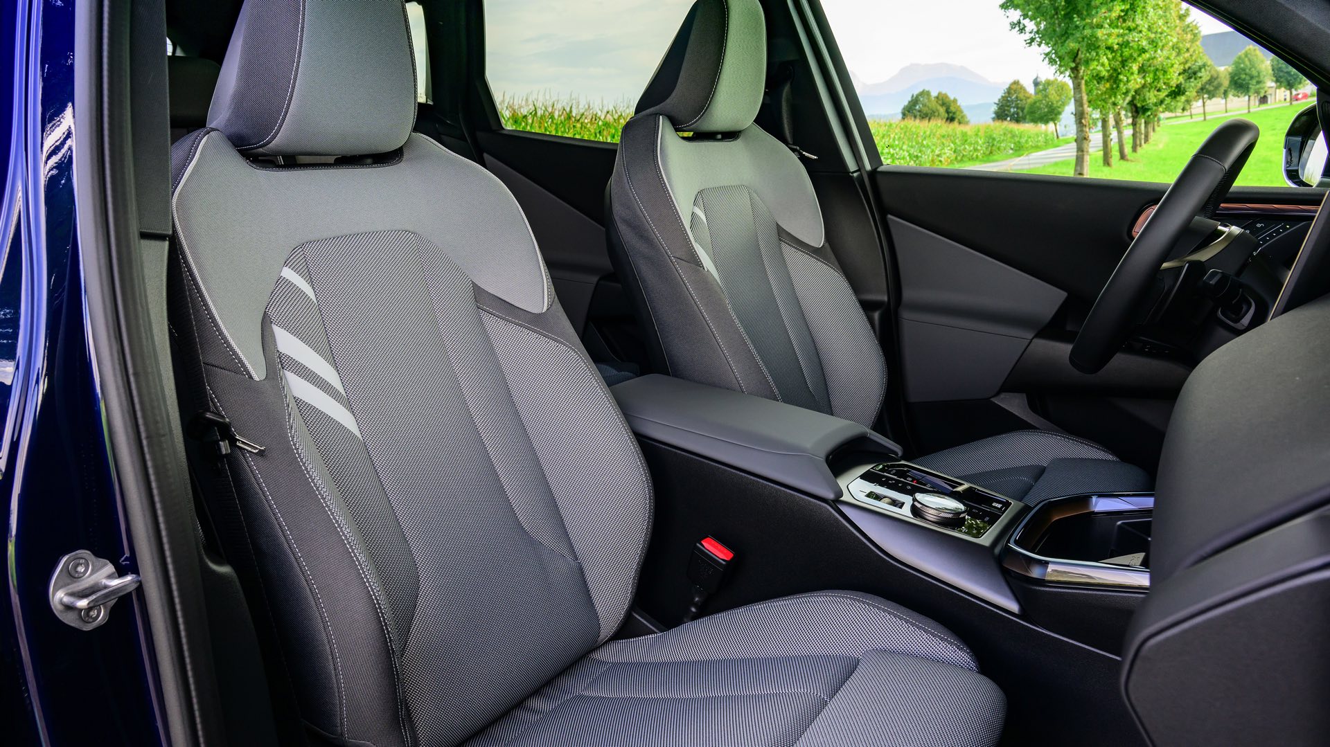 Dennoch erfordern neue Bedienroutinen eine gewisse Eingewöhnung. Die Steuerung der Lichtfunktionen liegt zum Beispiel jetzt auf dem linken Lenkstockhebel. Auch das Design der äußeren Lüftungsdüsen in den Türen sorgt für einen Moment der Irritation: Dass die mit einer Skala von 0 bis 1 beschriftete Touch-Oberfläche neben dem Türgriff die Düsen öffnet und schließt, fällt unter die Kategorie „muss man wissen“. Die Bereitschaft für Veränderung belohnt BMW allerdings mit einer Verarbeitungsqualität auf höchstem Niveau und einer äußerst hochwertigen Auswahl teils ungewöhnlicher Materialien. So besteht der Bezug der optionalen Instrumententafel Luxury aus recyceltem Polyester in einer eleganten Strick-Struktur. Die bequemen Sportsitze unseres BMW X3 20 xDrive tragen lederartiges Veganza.