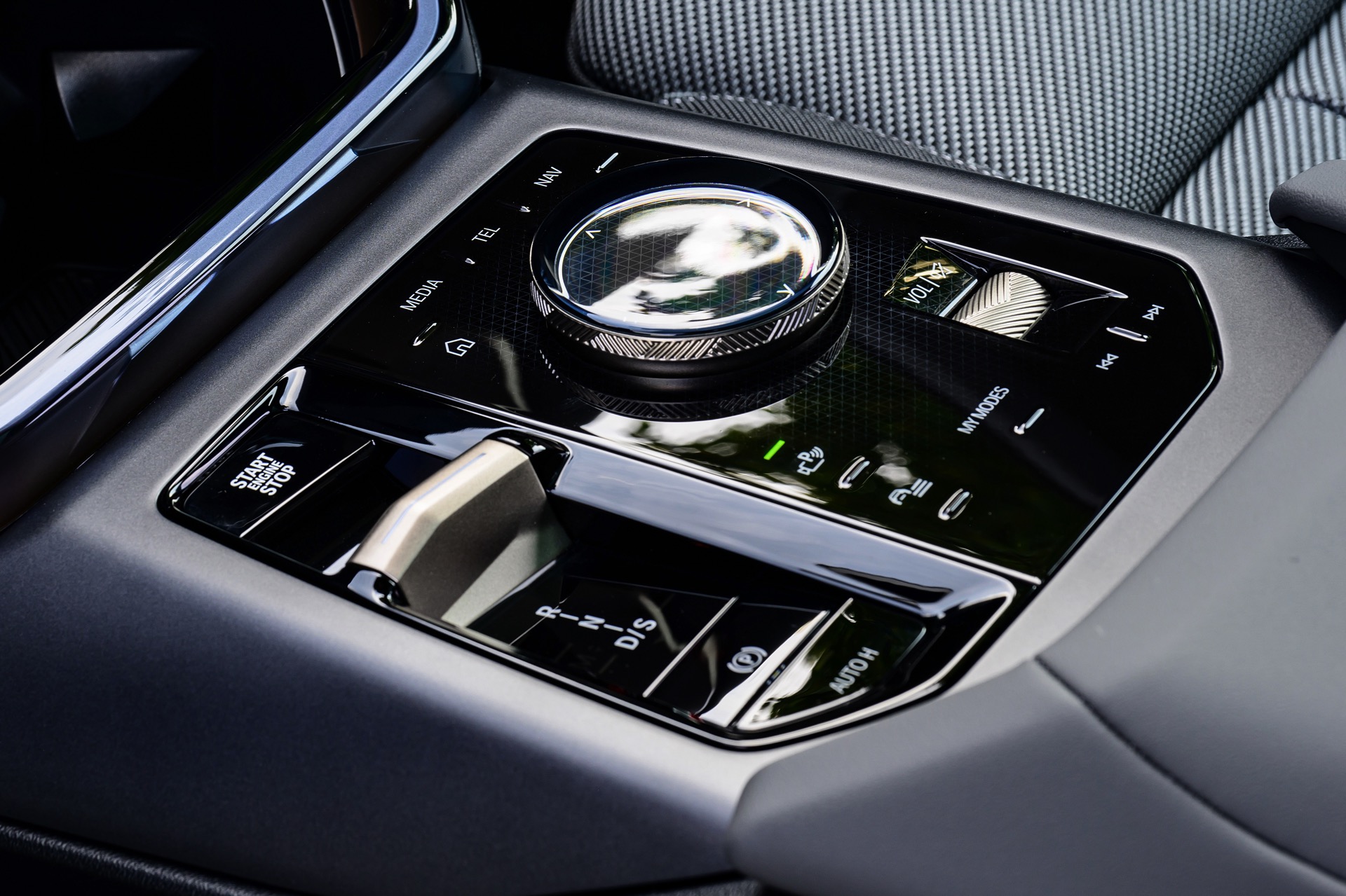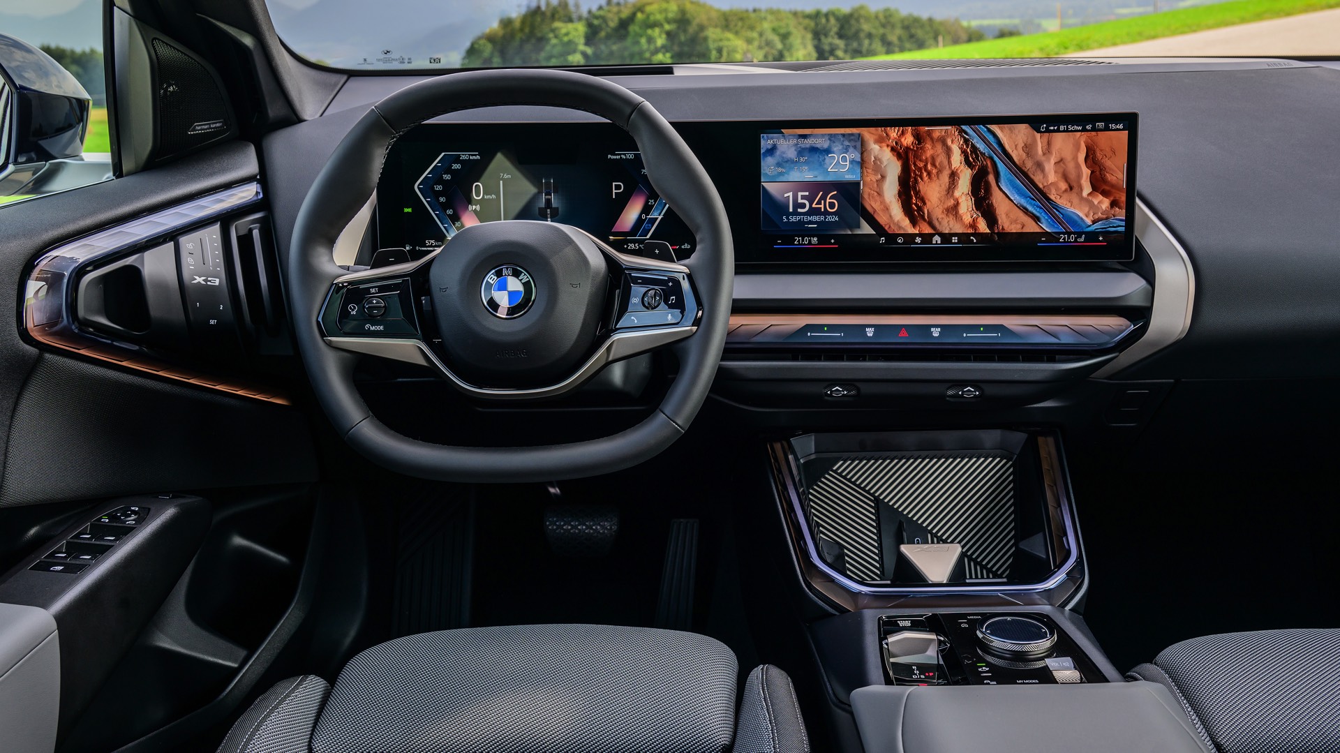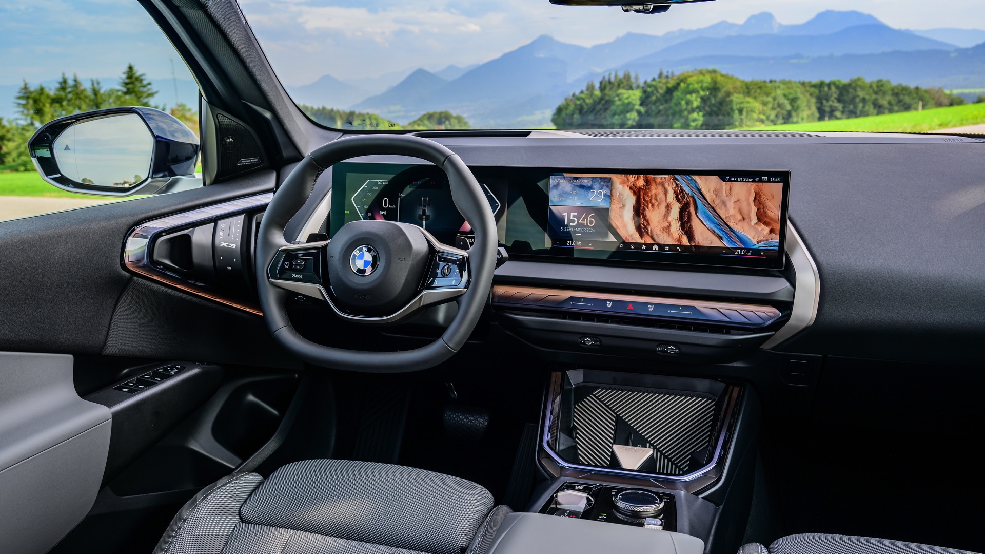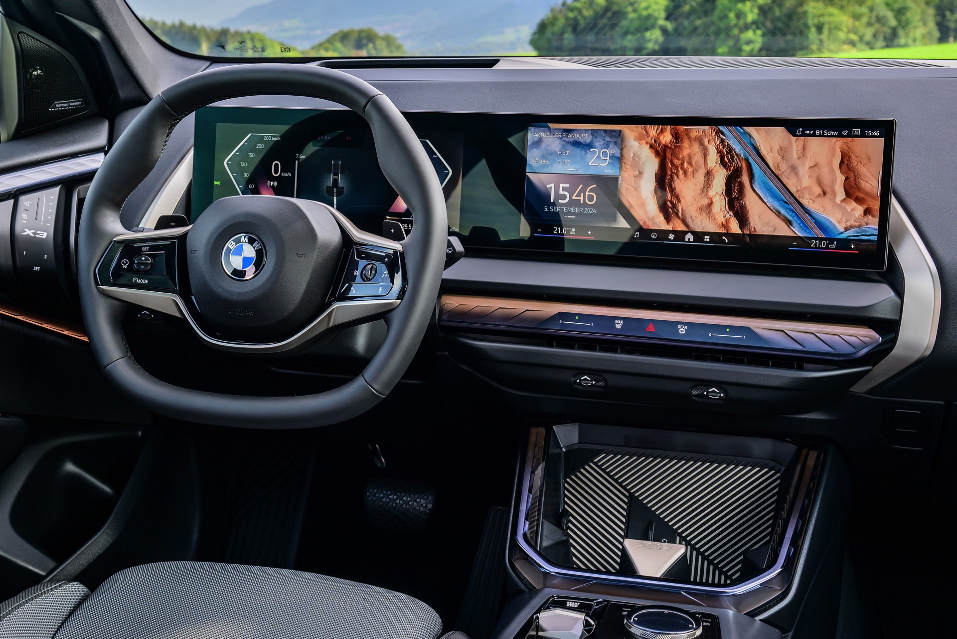 Draußen in Maisach findet der Regen kein Ende. Es ist xDrive-Wetter und höchste Zeit für einen Blick in den Innenraum. Hier hat BMW für die Zukunft aufgeräumt. Viele Schalter und Knöpfe wandern in die Menüs des BMW iDrive 9 mit seinem 14,9 Zoll großen Curved Display. Der Fokus liegt nun auch hier deutlich auf Touch- und Sprachbedienung, wobei sich jedoch niemand auf eine Radikallösung im Tesla-Stil einstellen muss. Der iDrive Controller und die umliegenden Tasten für Shortcuts bleiben an Ort und Stelle.