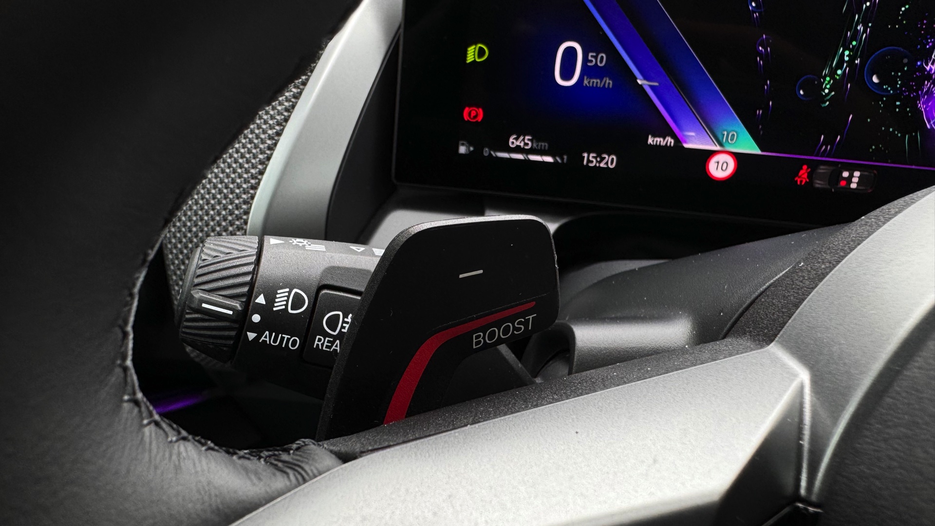 Die zackigen und präzisen Gangwechsel kann man bei Bedarf mit den großen Schaltwippen am Lenkrad selbst übernehmen. Wer die Mitreisenden zwischendurch aufwecken möchte, zieht einfach länger an der linken Lenkradwippe. Dann aktiviert sich für 10 Sekunden die „Boost“-Funktion und stellt alle Antriebskomponenten auf radikale Sportlichkeit ein – inklusive Countdown im Display.