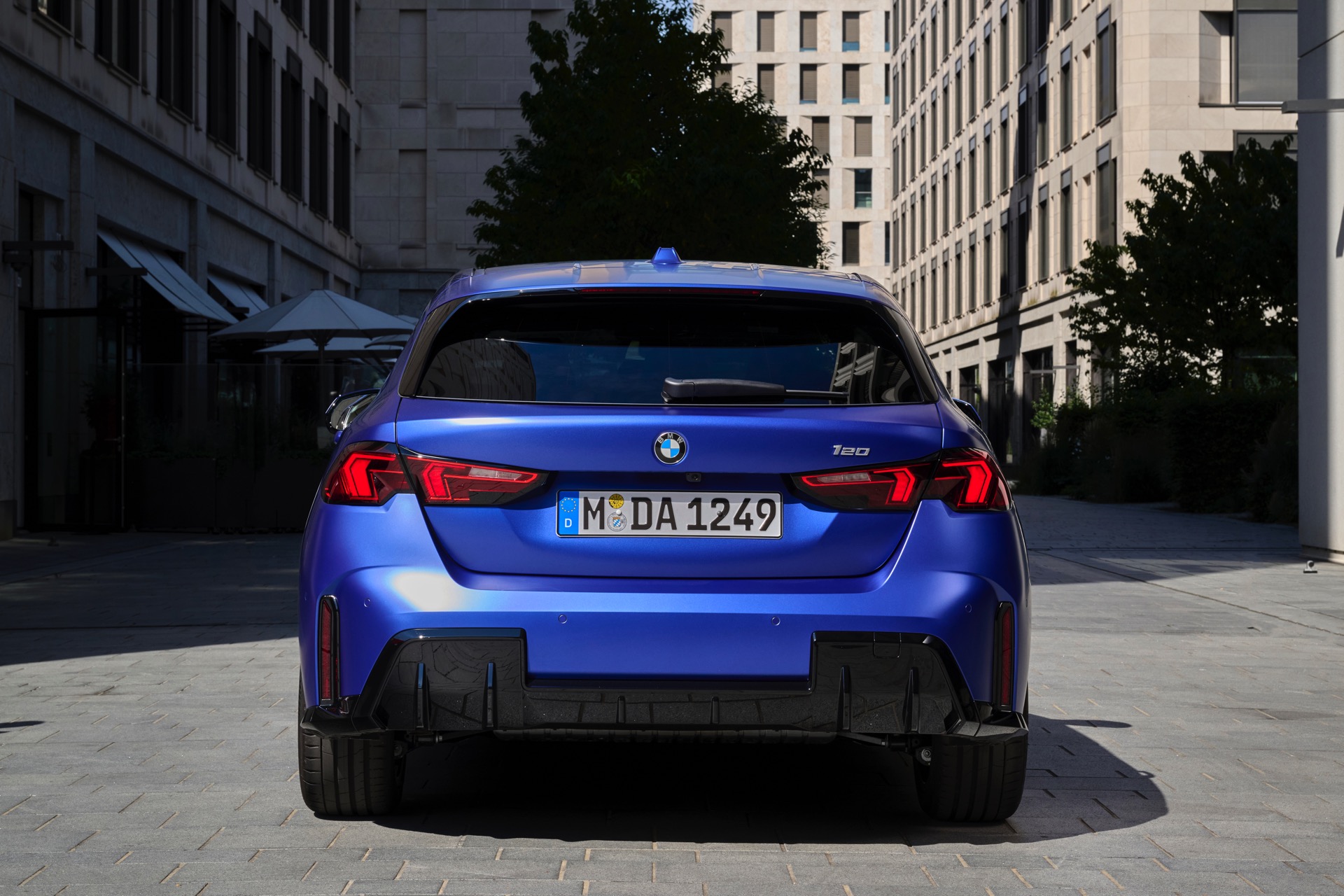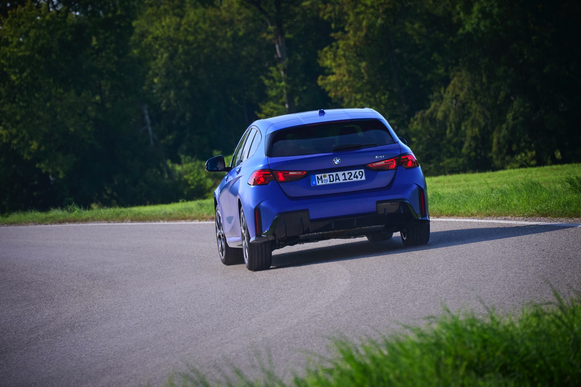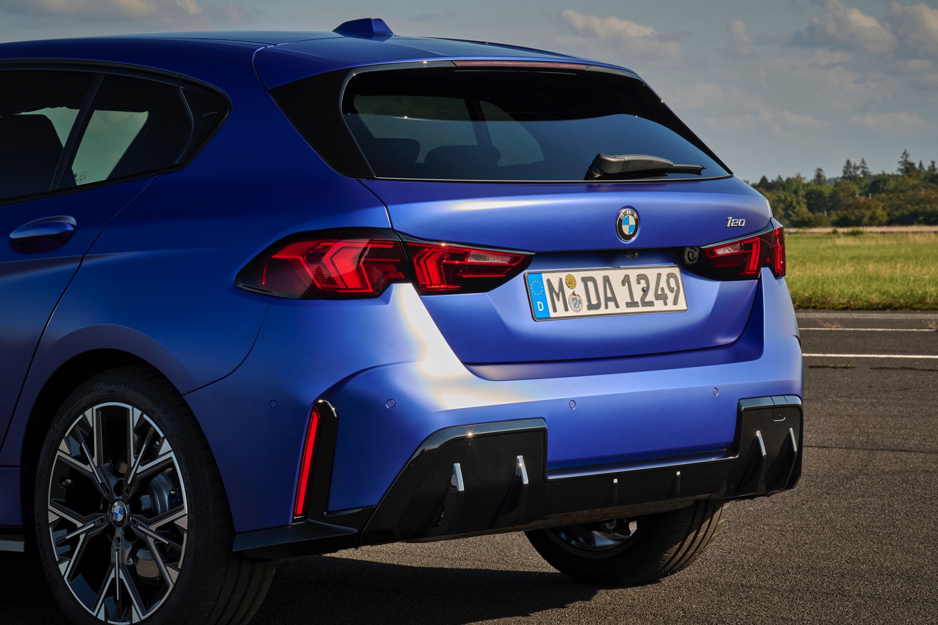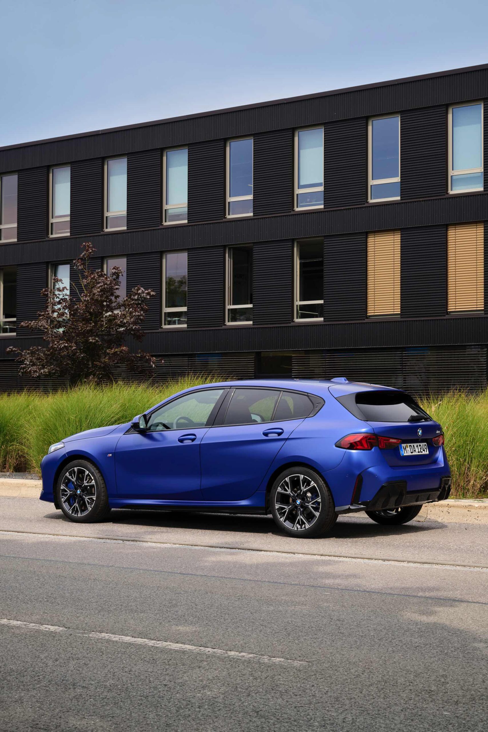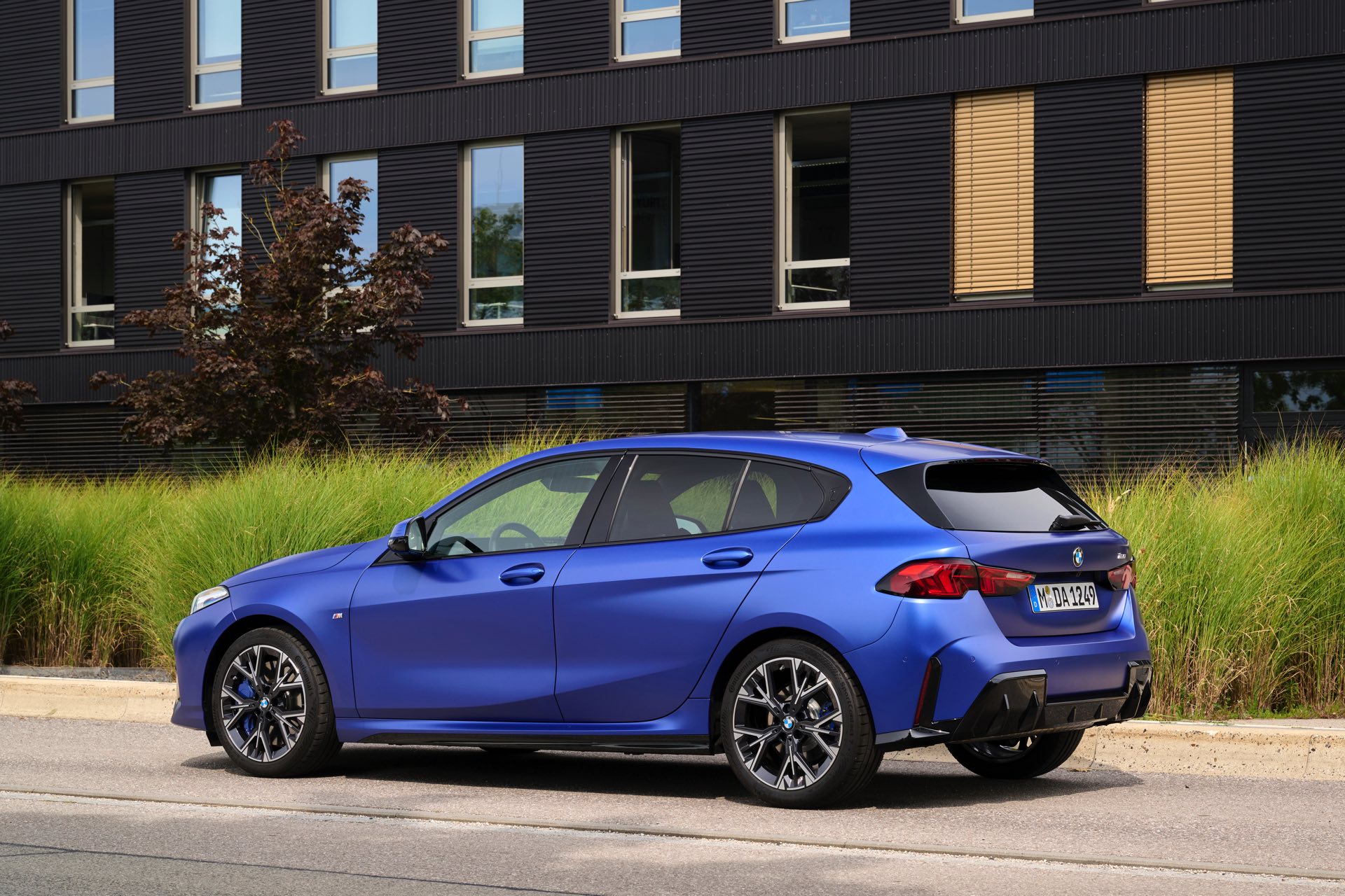 Zu diesem Eindruck tragen – neben dem matten BMW Individual-Lack Frozen Portimao Blue – auch die kleinere, steiler stehende Doppelniere und der weit nach vorn gezogene Frontsplitter des M Sportpakets bei. Selbiges beschert der Heckpartie einen stark ausgeprägten Diffusoreinsatz in Hochglanzschwarz. Sichtbare Endrohre bleiben jedoch grundsätzlich dem BMW M135 xDrive vorbehalten – der bekommt dafür gleich vier Stück.