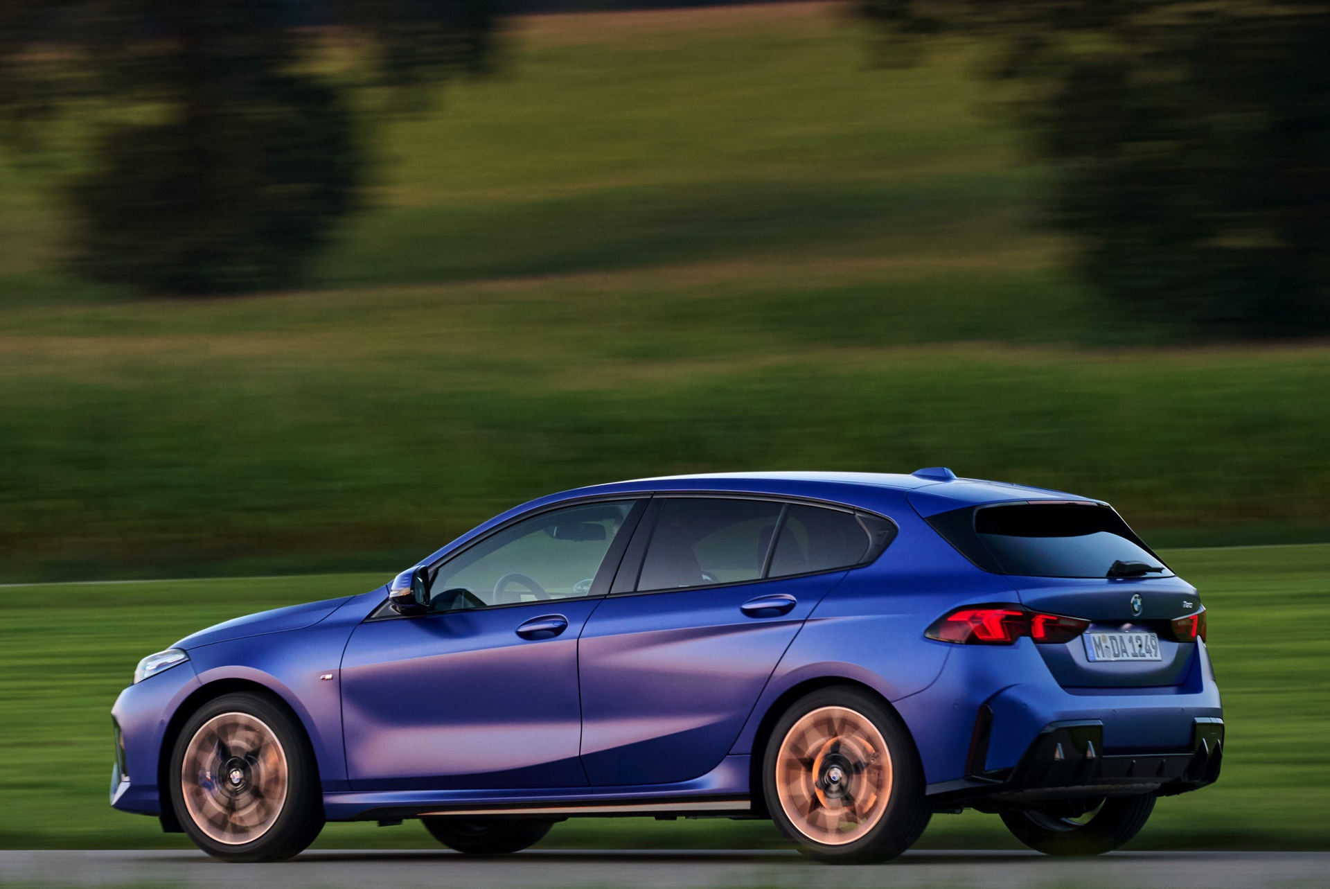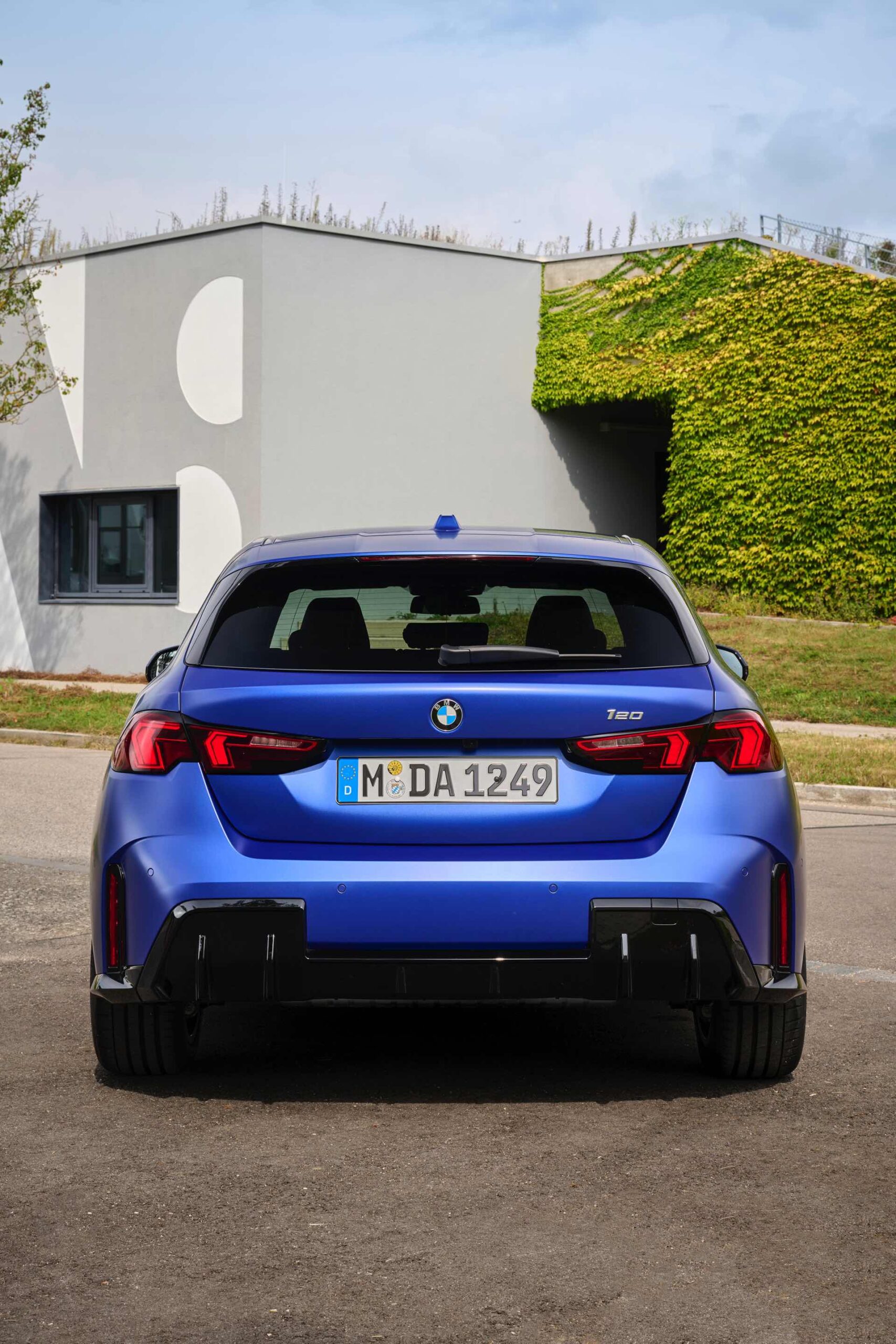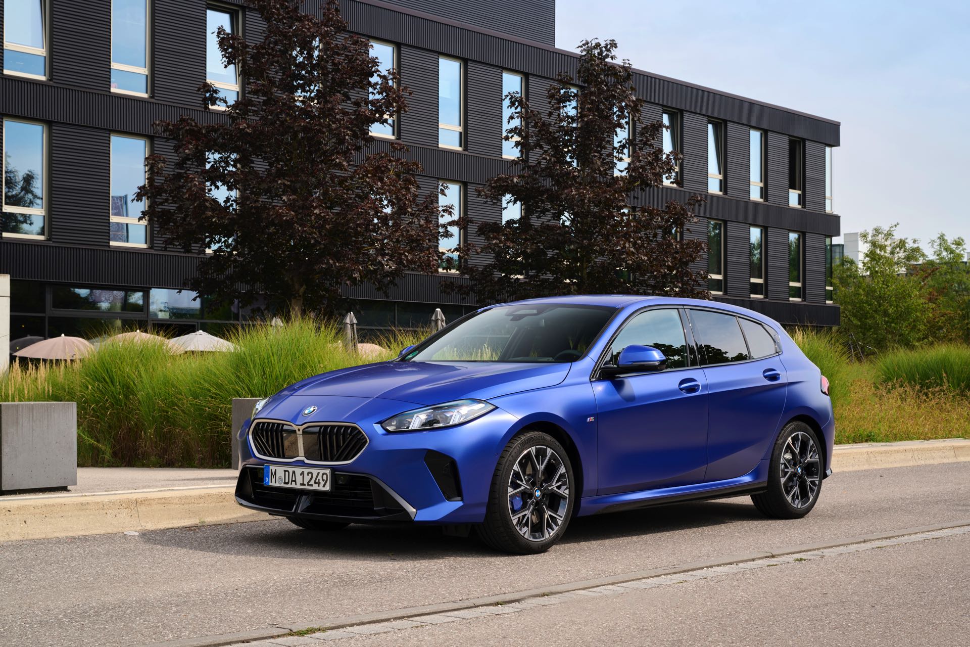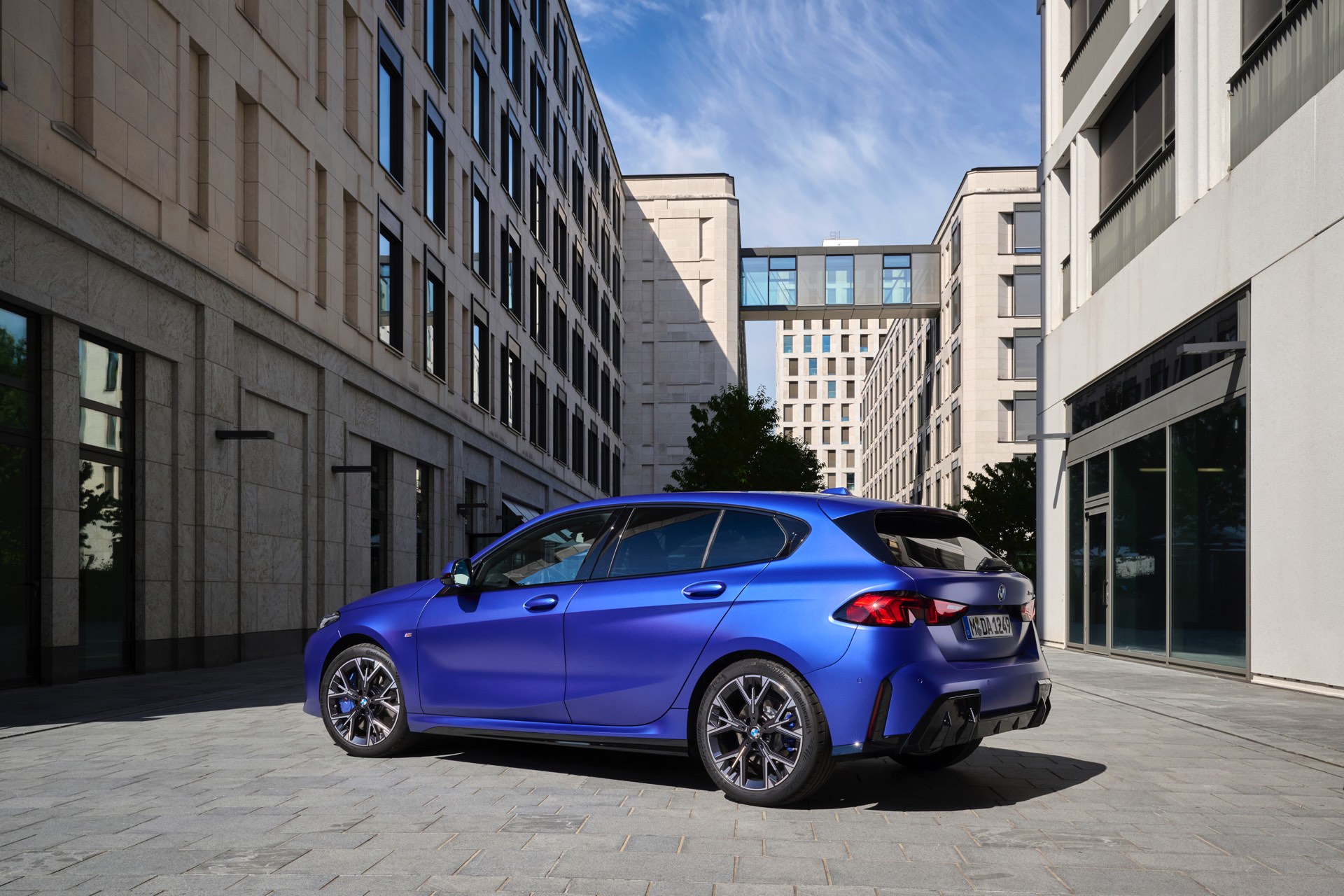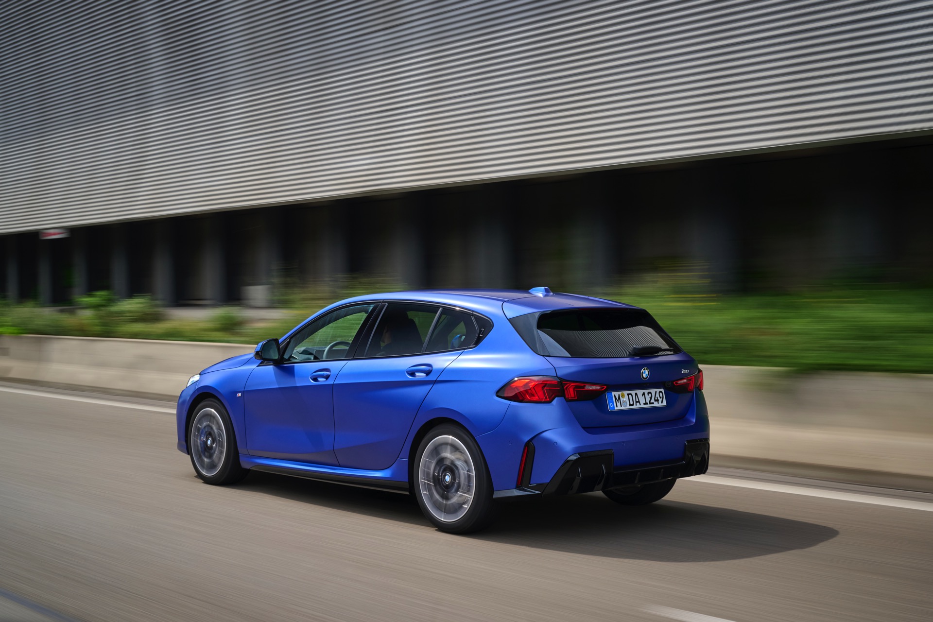 Zu diesem Eindruck tragen – neben dem matten BMW Individual-Lack Frozen Portimao Blue – auch die kleinere, steiler stehende Doppelniere und der weit nach vorn gezogene Frontsplitter des M Sportpakets bei. Selbiges beschert der Heckpartie einen stark ausgeprägten Diffusoreinsatz in Hochglanzschwarz. Sichtbare Endrohre bleiben jedoch grundsätzlich dem BMW M135 xDrive vorbehalten – der bekommt dafür gleich vier Stück.