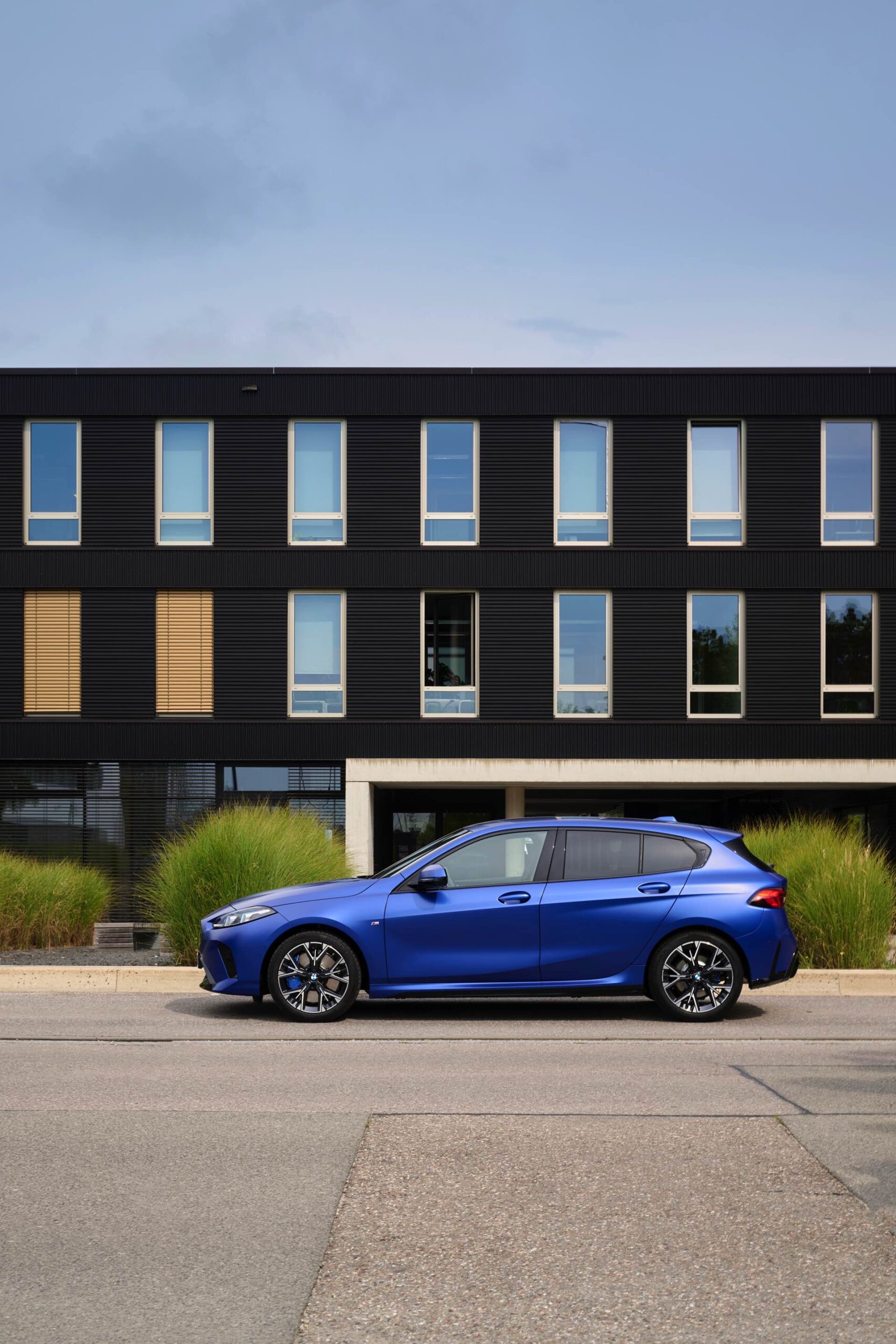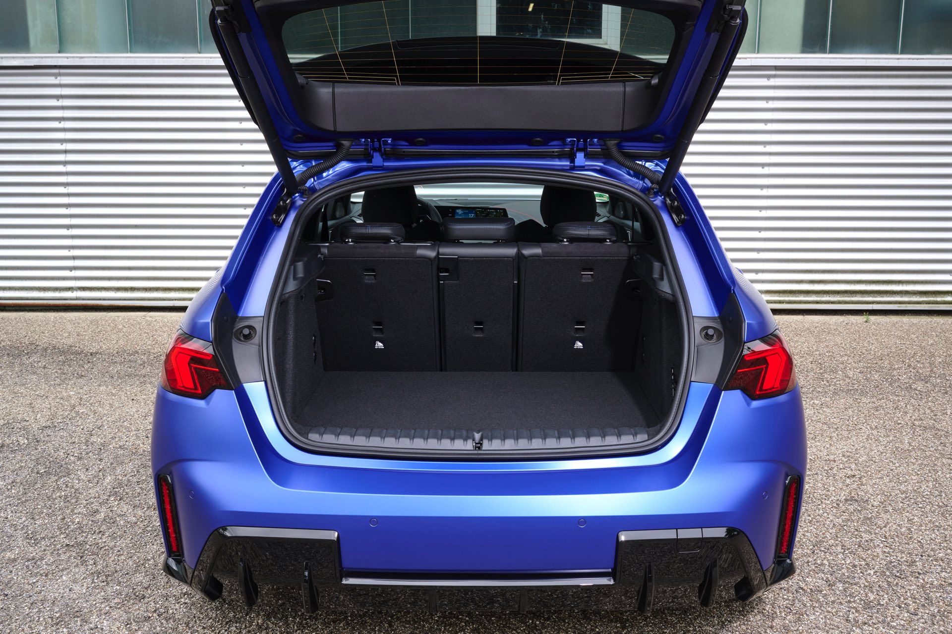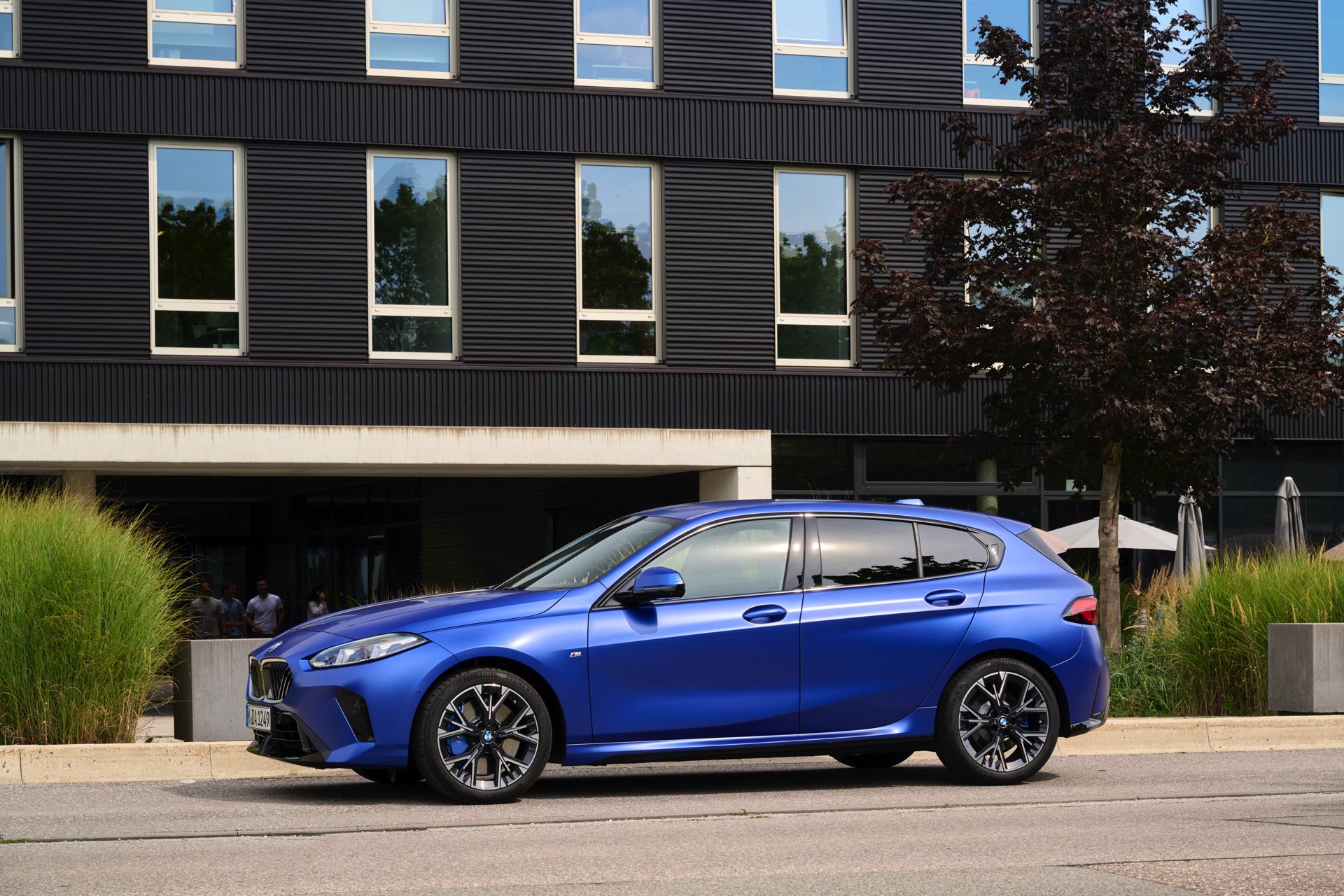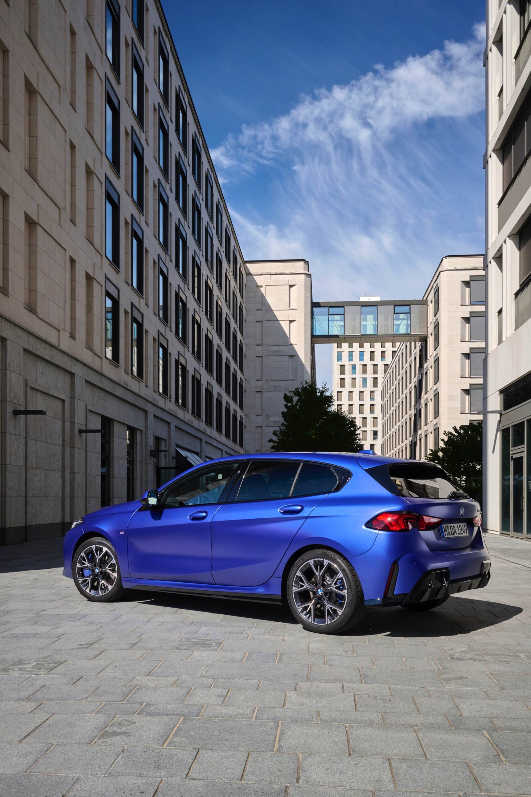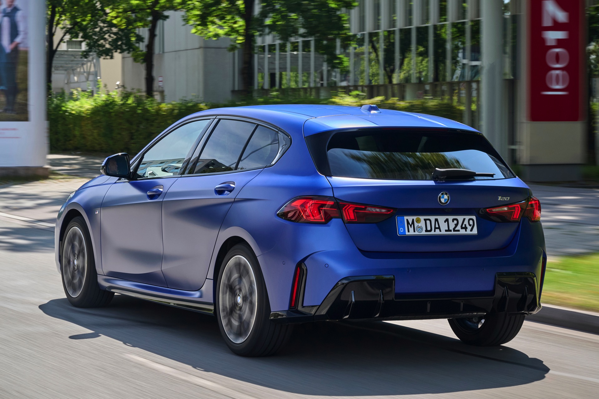 Zu diesem Eindruck tragen – neben dem matten BMW Individual-Lack Frozen Portimao Blue – auch die kleinere, steiler stehende Doppelniere und der weit nach vorn gezogene Frontsplitter des M Sportpakets bei. Selbiges beschert der Heckpartie einen stark ausgeprägten Diffusoreinsatz in Hochglanzschwarz. Sichtbare Endrohre bleiben jedoch grundsätzlich dem BMW M135 xDrive vorbehalten – der bekommt dafür gleich vier Stück.