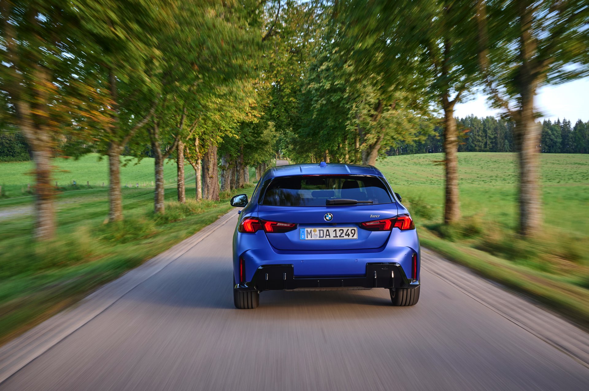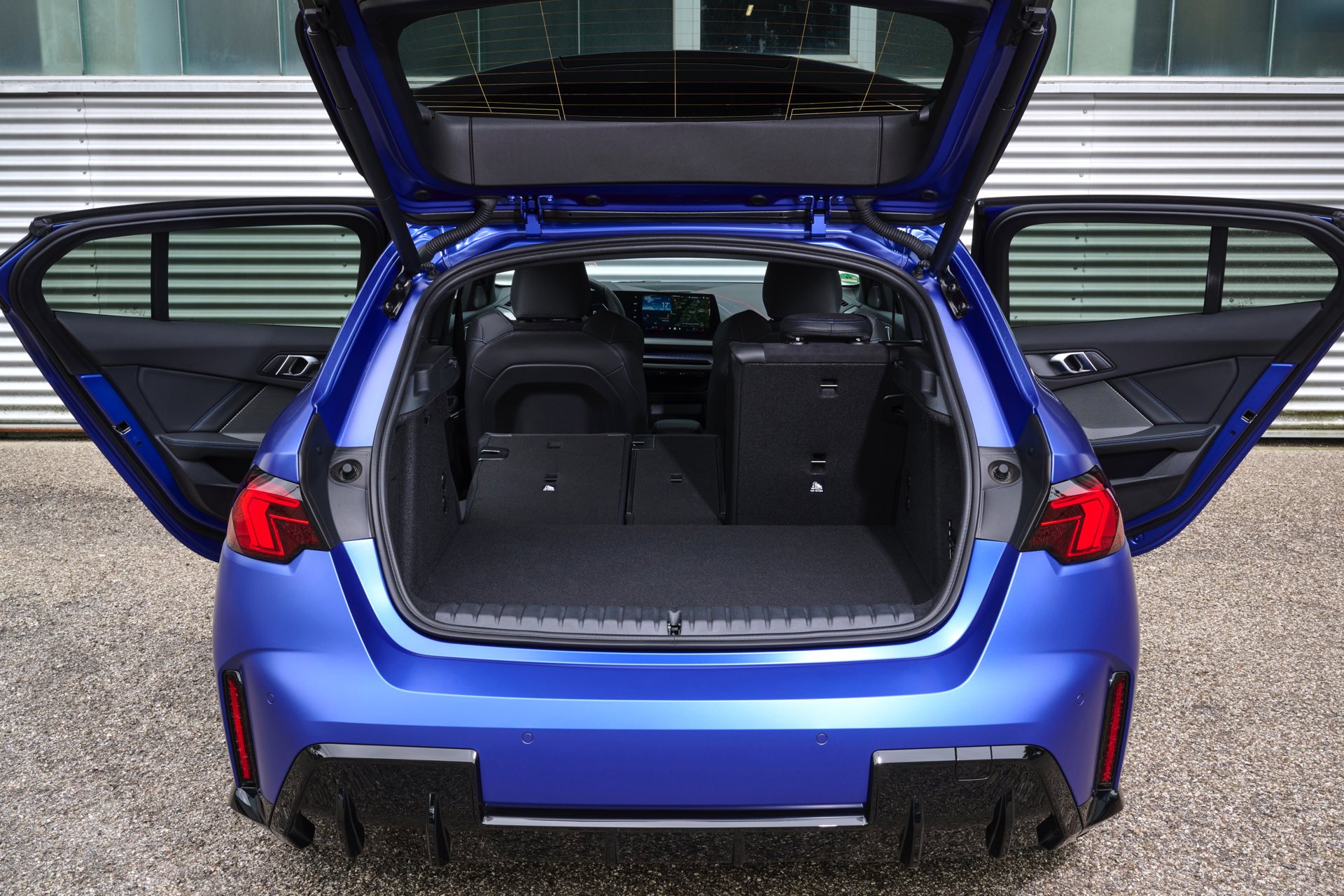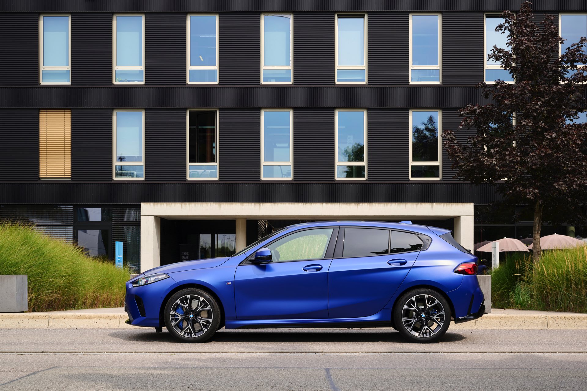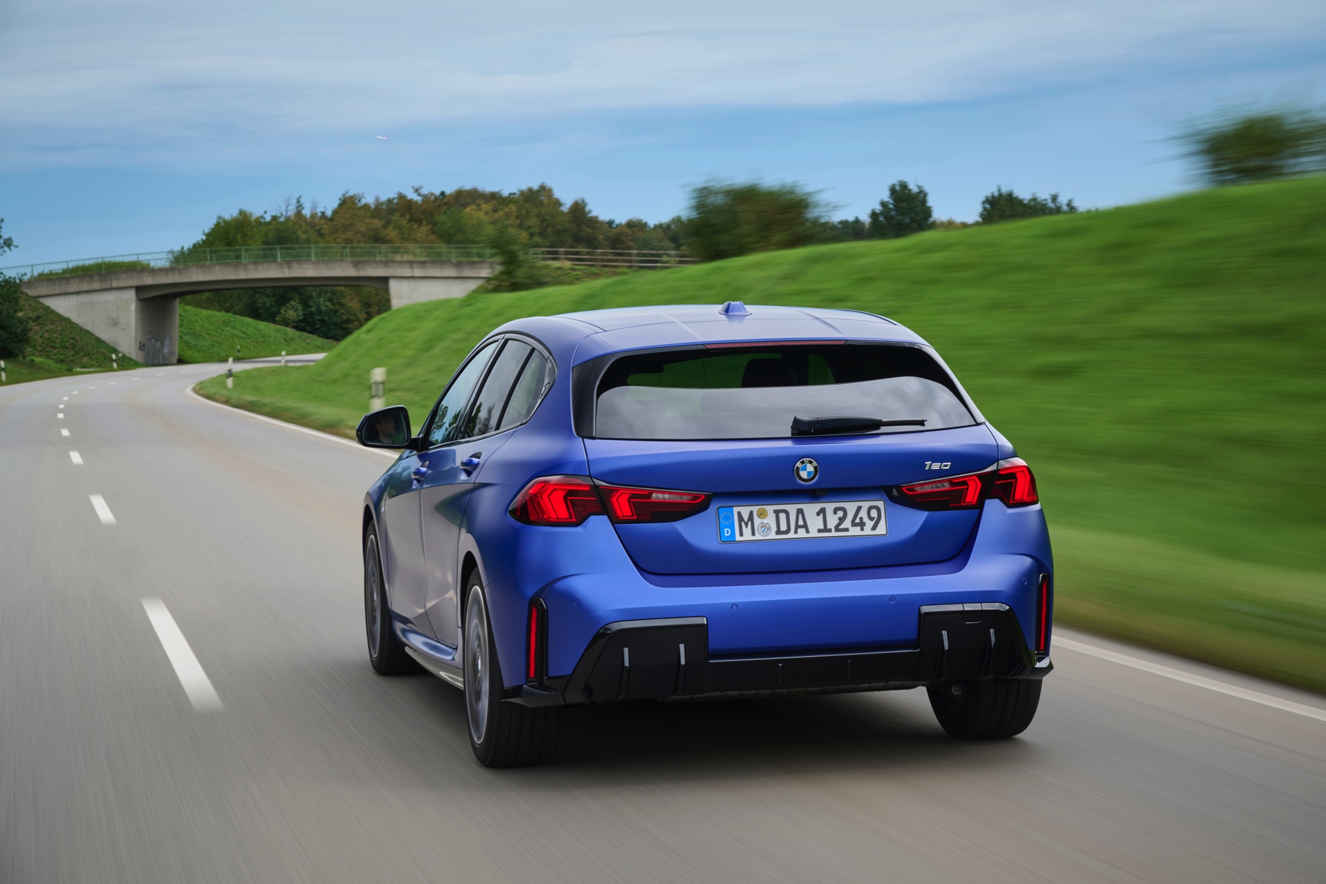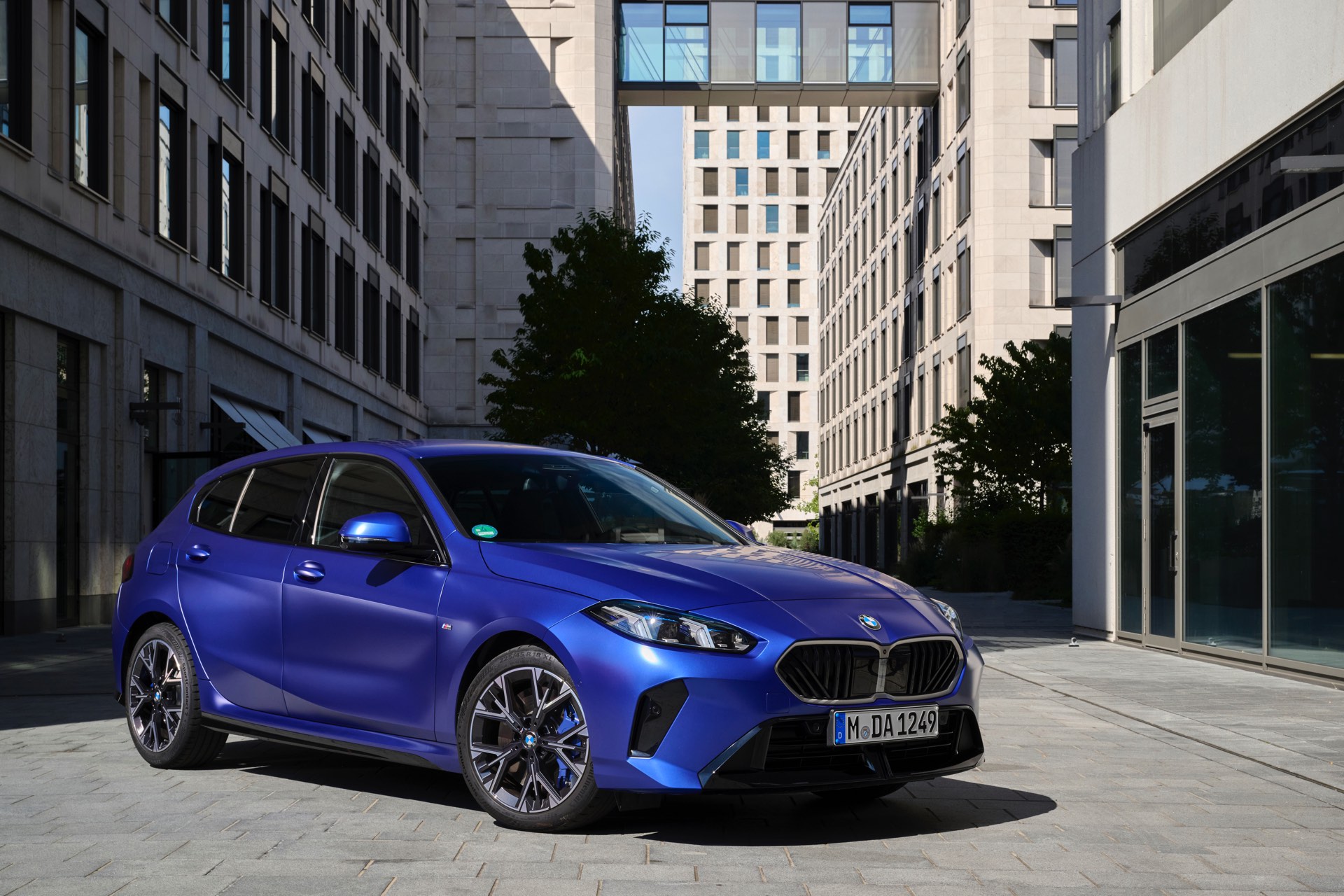 Zu diesem Eindruck tragen – neben dem matten BMW Individual-Lack Frozen Portimao Blue – auch die kleinere, steiler stehende Doppelniere und der weit nach vorn gezogene Frontsplitter des M Sportpakets bei. Selbiges beschert der Heckpartie einen stark ausgeprägten Diffusoreinsatz in Hochglanzschwarz. Sichtbare Endrohre bleiben jedoch grundsätzlich dem BMW M135 xDrive vorbehalten – der bekommt dafür gleich vier Stück.