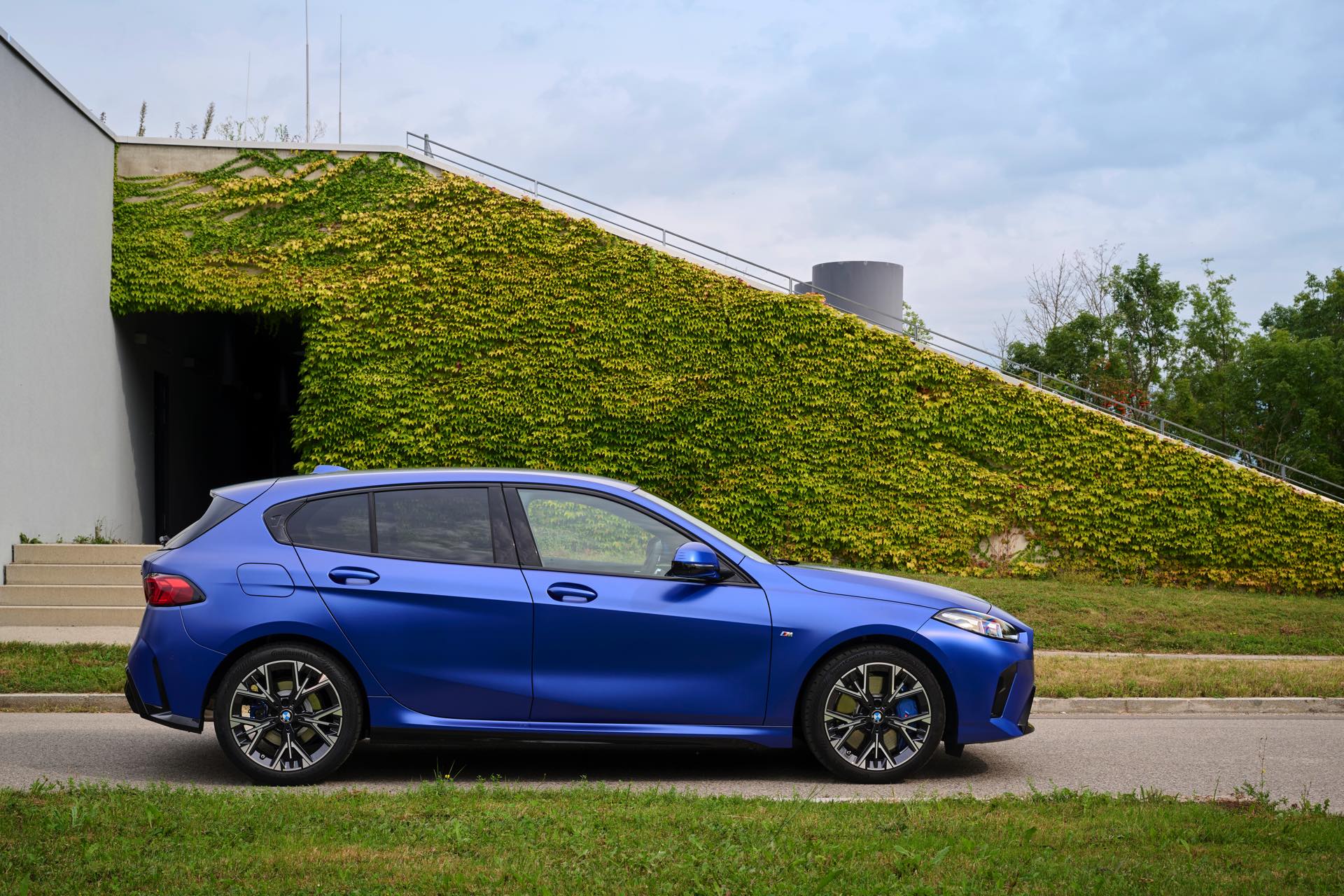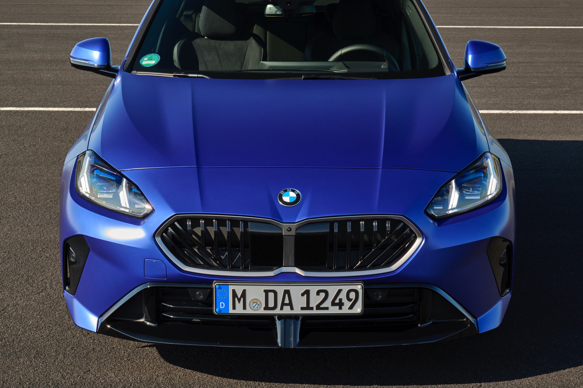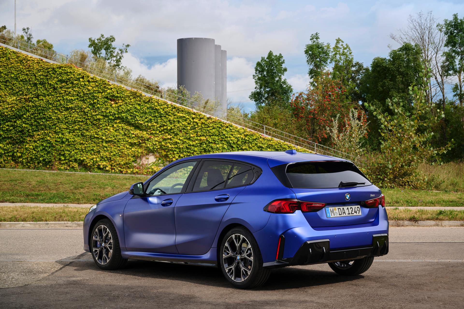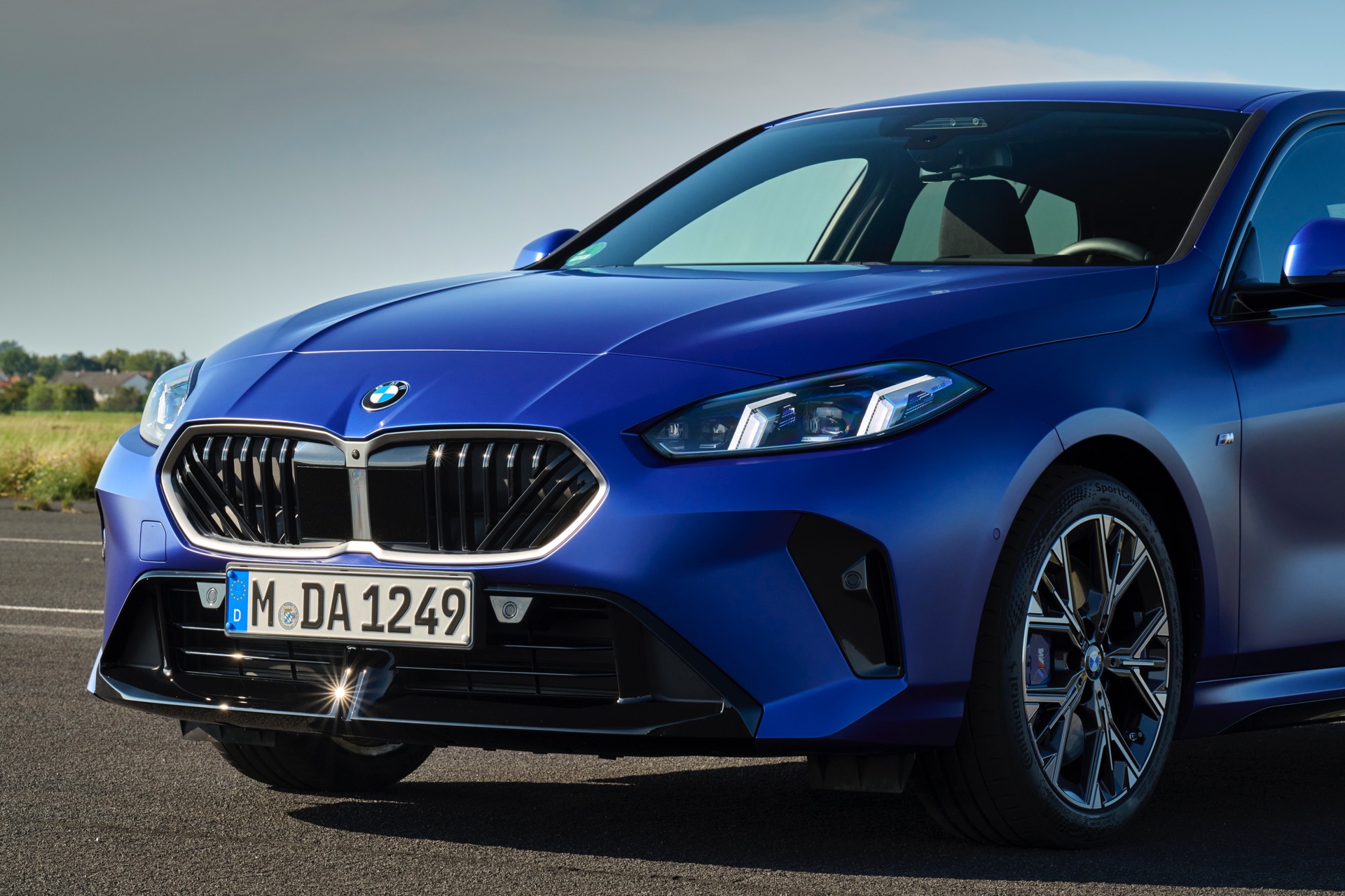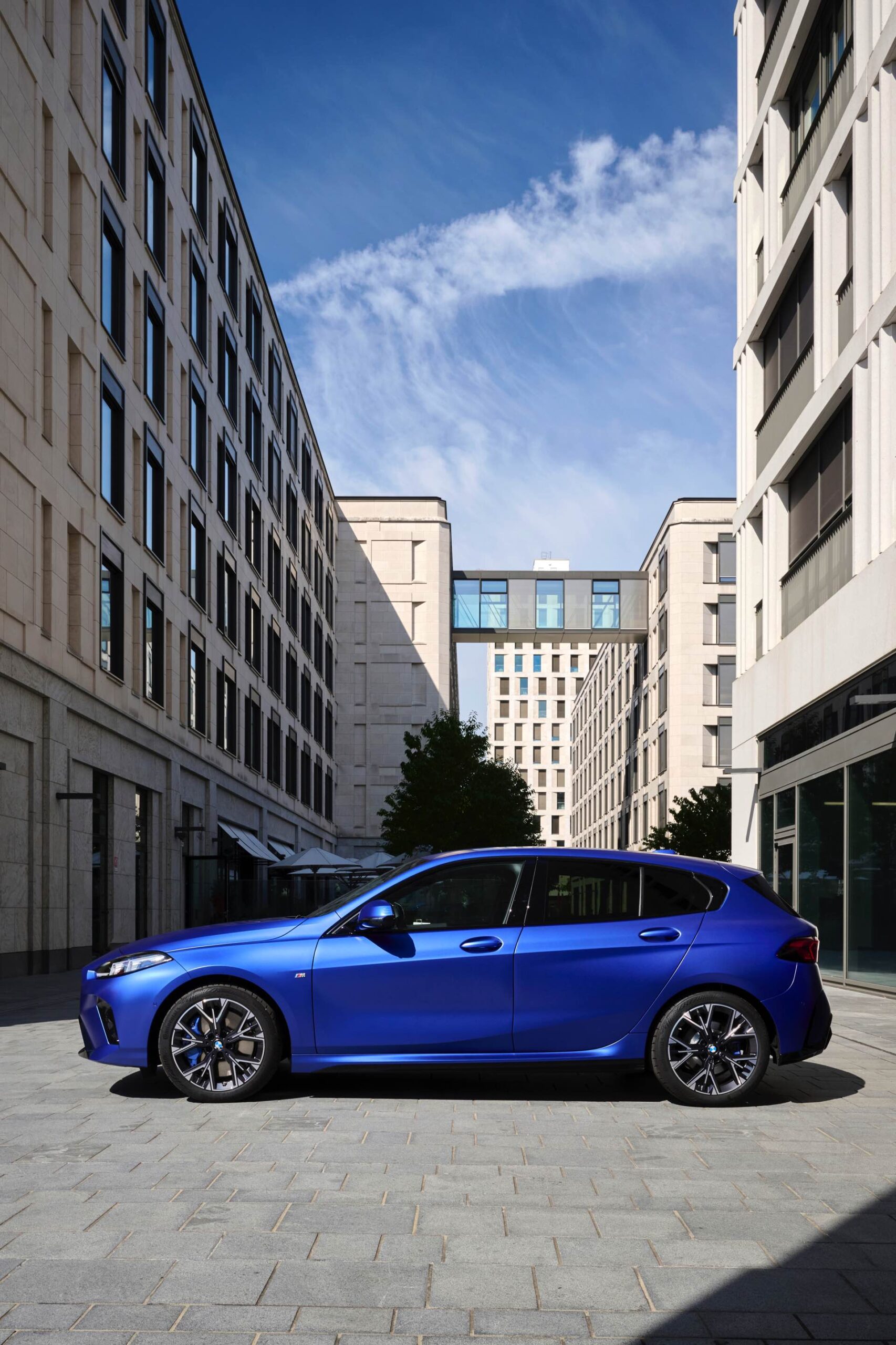 Zu diesem Eindruck tragen – neben dem matten BMW Individual-Lack Frozen Portimao Blue – auch die kleinere, steiler stehende Doppelniere und der weit nach vorn gezogene Frontsplitter des M Sportpakets bei. Selbiges beschert der Heckpartie einen stark ausgeprägten Diffusoreinsatz in Hochglanzschwarz. Sichtbare Endrohre bleiben jedoch grundsätzlich dem BMW M135 xDrive vorbehalten – der bekommt dafür gleich vier Stück.