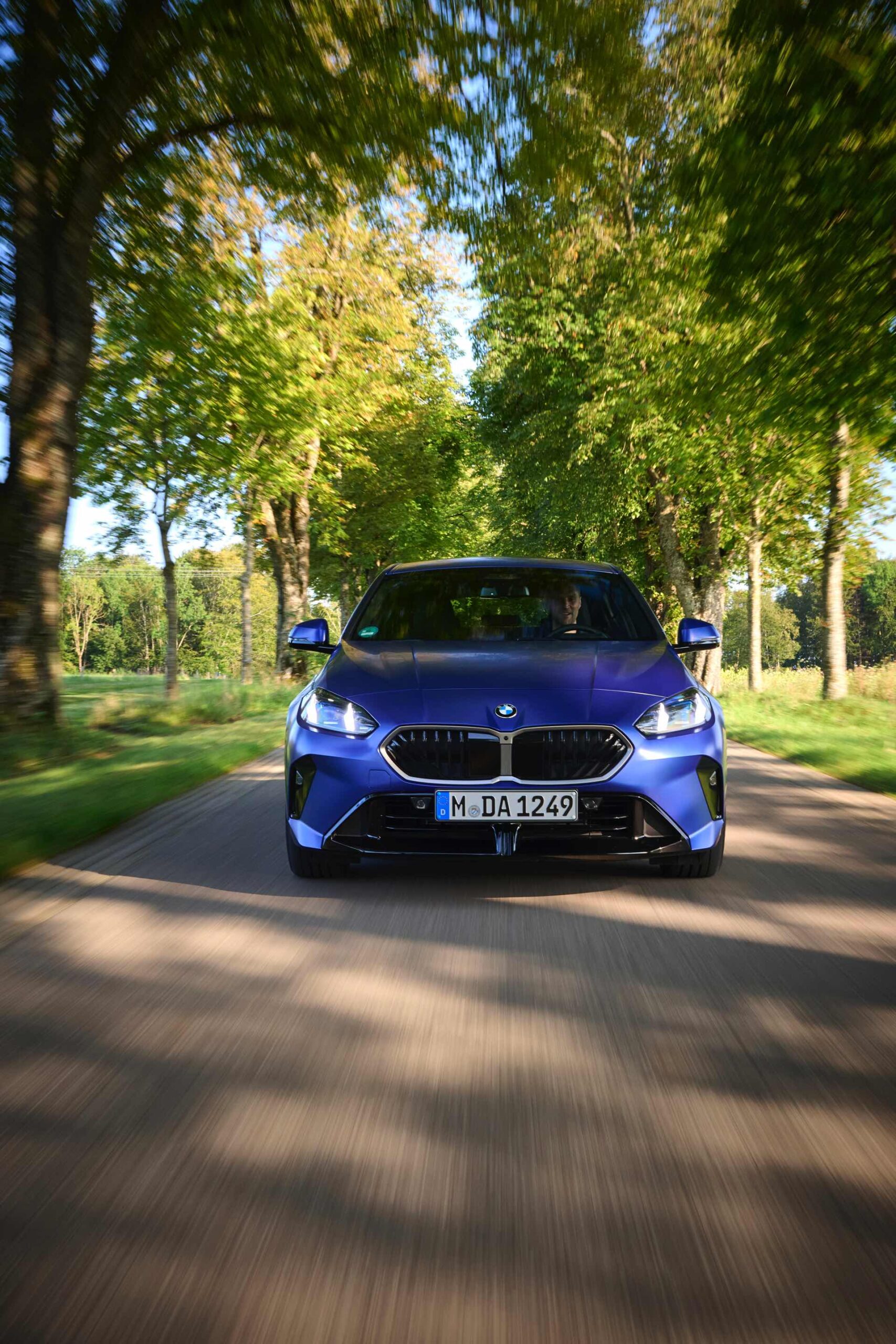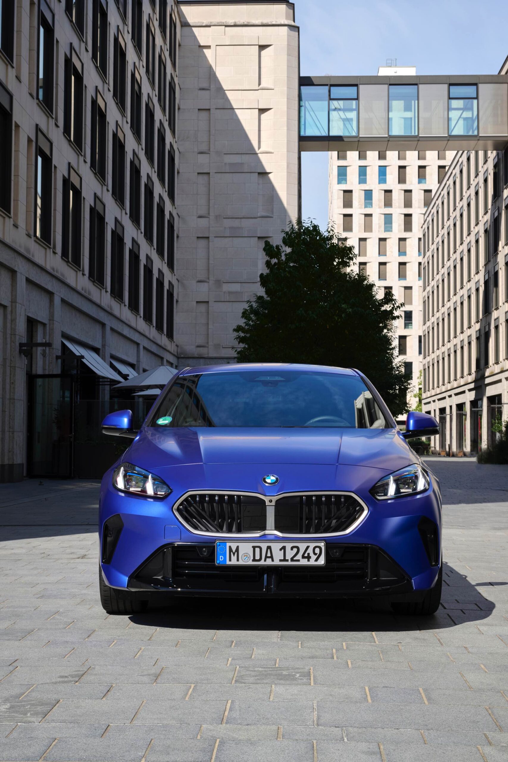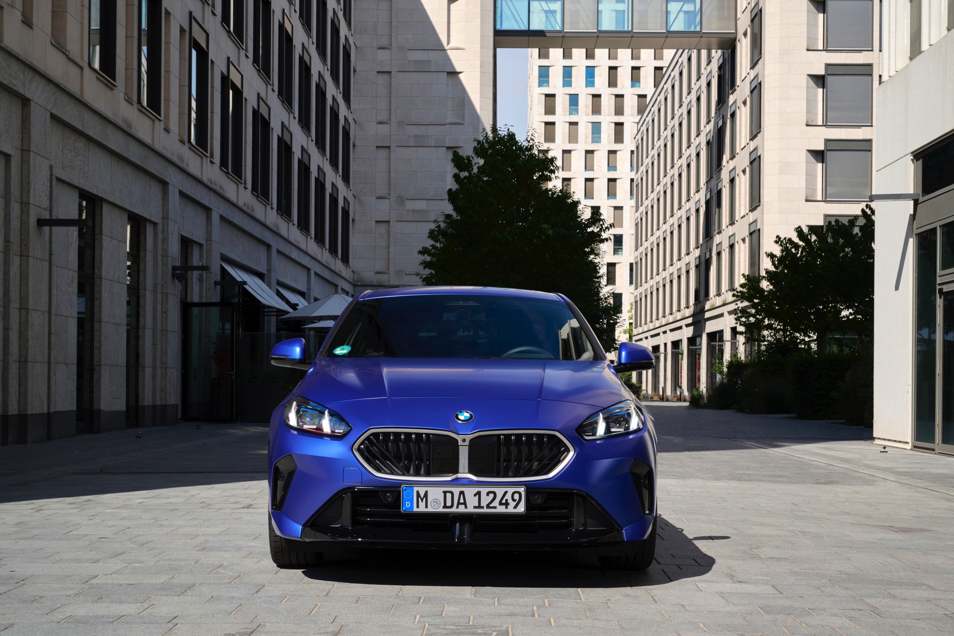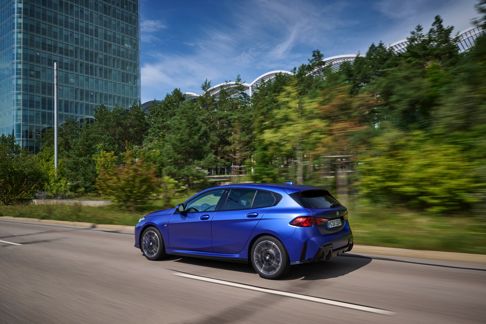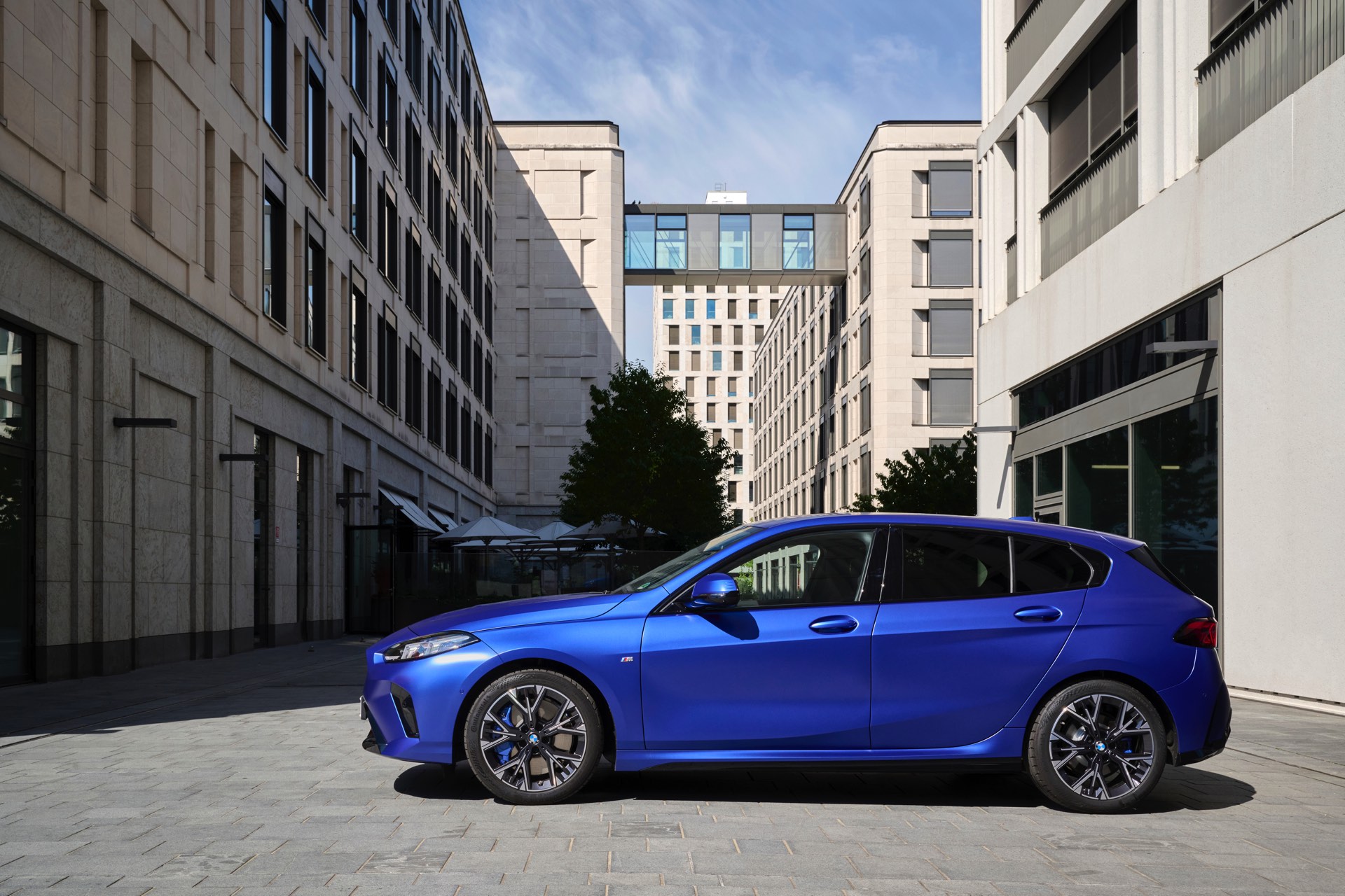 Zu diesem Eindruck tragen – neben dem matten BMW Individual-Lack Frozen Portimao Blue – auch die kleinere, steiler stehende Doppelniere und der weit nach vorn gezogene Frontsplitter des M Sportpakets bei. Selbiges beschert der Heckpartie einen stark ausgeprägten Diffusoreinsatz in Hochglanzschwarz. Sichtbare Endrohre bleiben jedoch grundsätzlich dem BMW M135 xDrive vorbehalten – der bekommt dafür gleich vier Stück.
