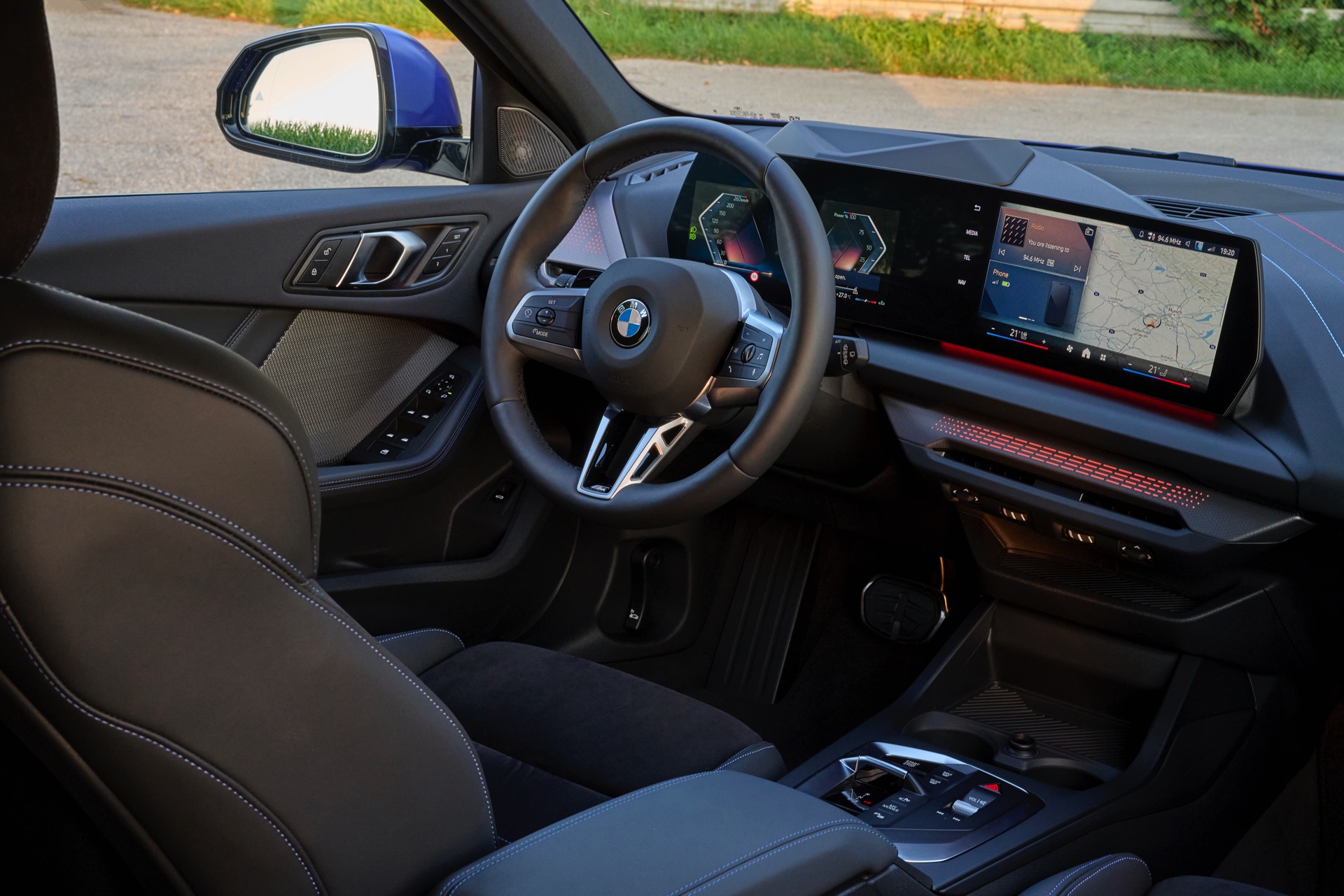 Zum Abschluss unserer Testfahrt tauschen wir die Smartphone-Schlüssel und nehmen auf den bequemen Sportsitzen des M Performance Modells Platz. Selbstbewusster Sonderlack in Signal Grün verspricht Blickfänger-Qualitäten – und der 2,0-Liter-Vierzylinder scharrt 221 kW/300 PS und 400 Newtonmeter Drehmoment in den Asphalt. Entsprechend vehement arbeitet sich der neue BMW M135 durchs Drehzahlband und klingt dabei im Innenraum angenehm charakterstark, trotz Lautsprecherverstärkung aber nicht zu synthetisch.