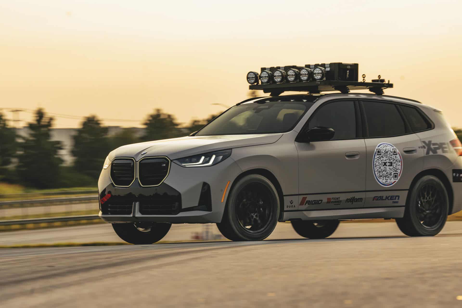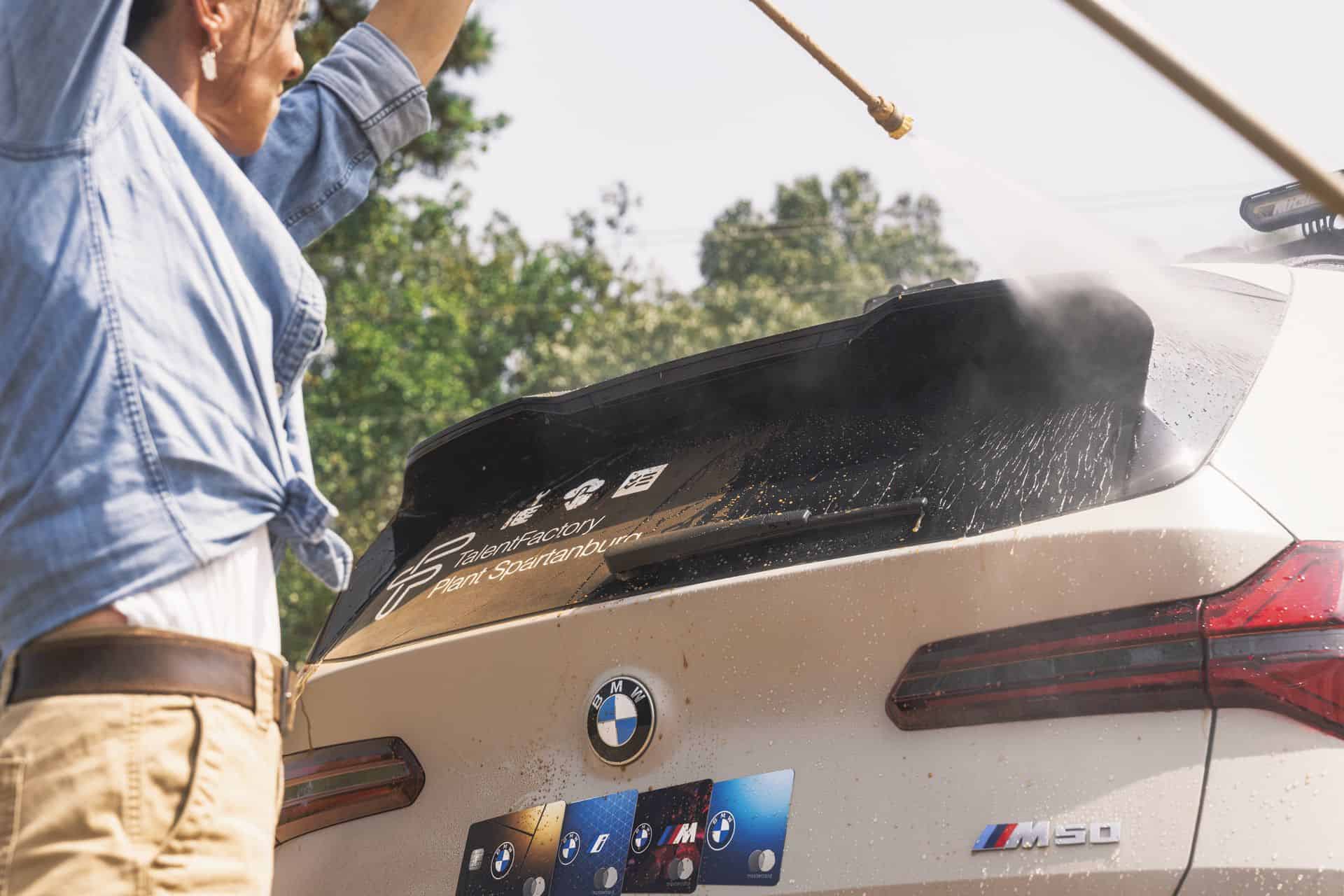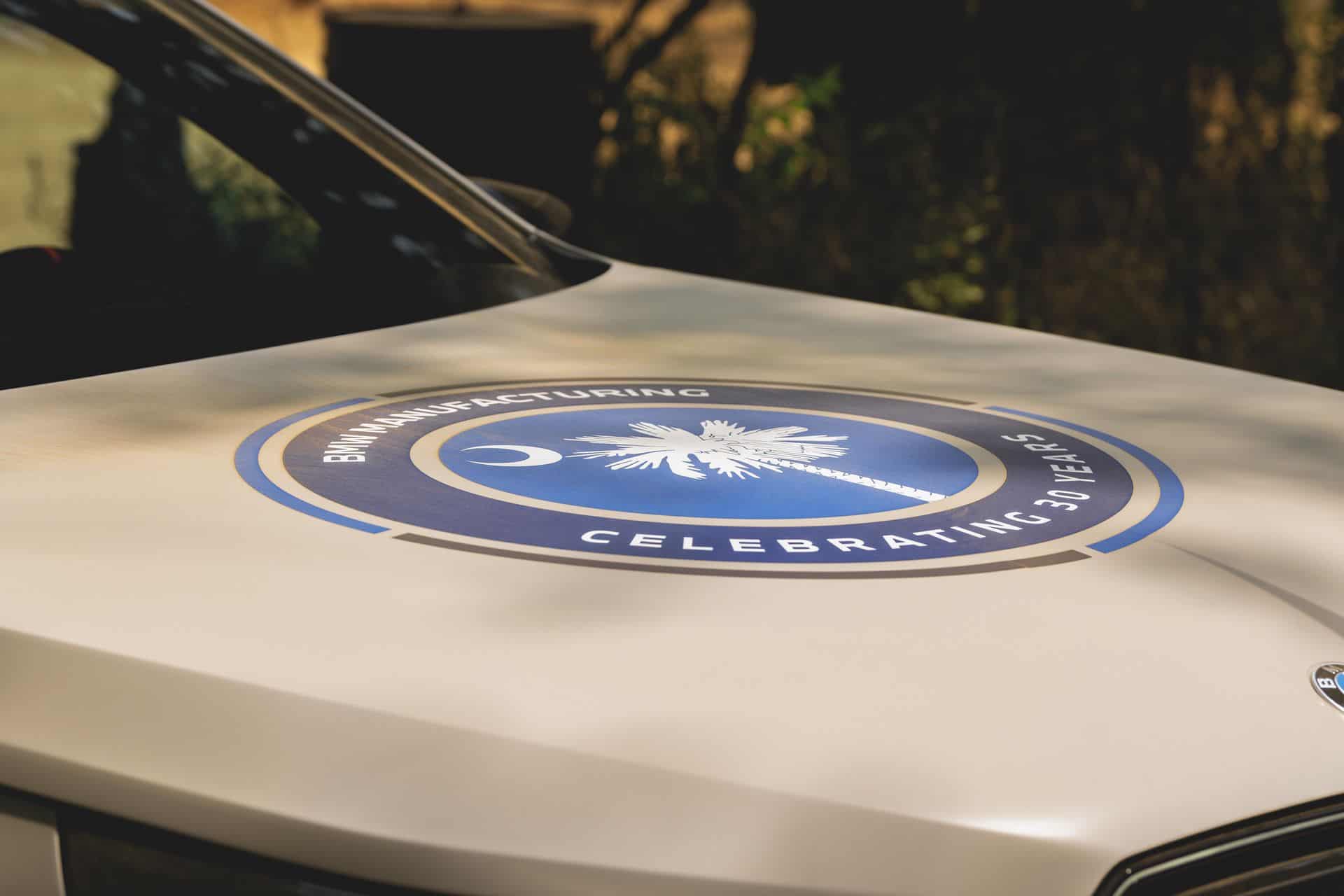 Als Schutz vor Steinschlägen und anderen kleinen Schrammen wurde der BMW X3 M50 mit einer durchsichtigen Schutzfolie von XPEL foliert, außerdem dürfen im Motorsport natürlich auch einige Sponsoren-Aufkleber nicht fehlen. Den prominenten Platz auf der Motorhaube nimmt dabei das kreisrunde Jubiläums-Logo des BMW Werks Spartanburg ein, mit dem 30 Jahre bayerisch inspirierte Automobil-Produktion in South Carolina gefeiert werden.