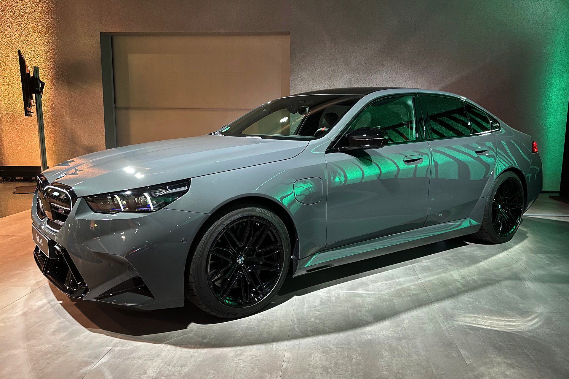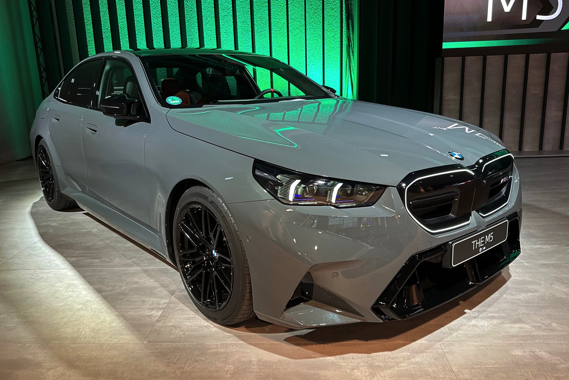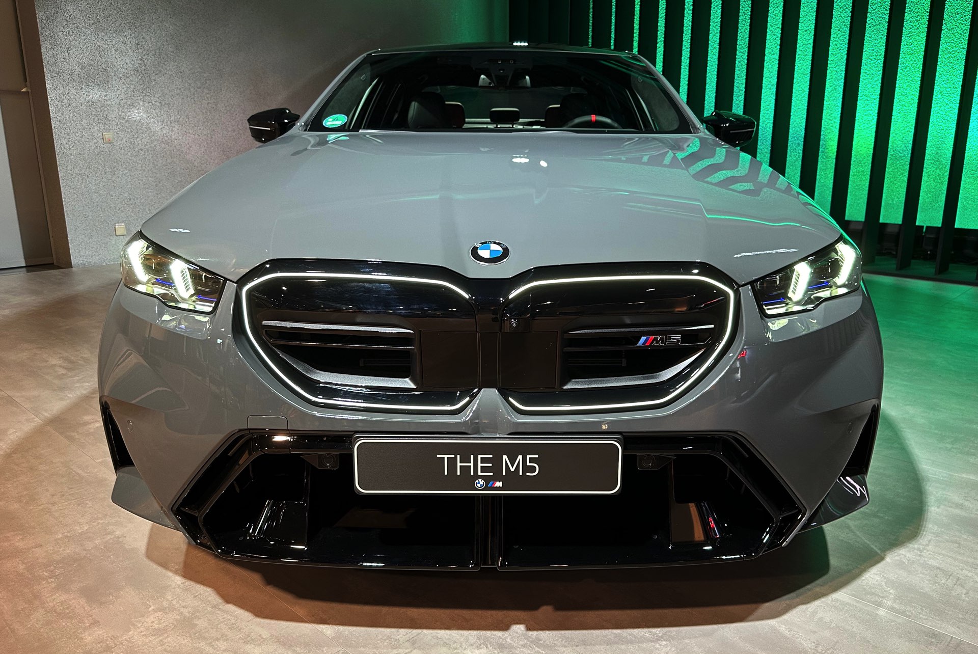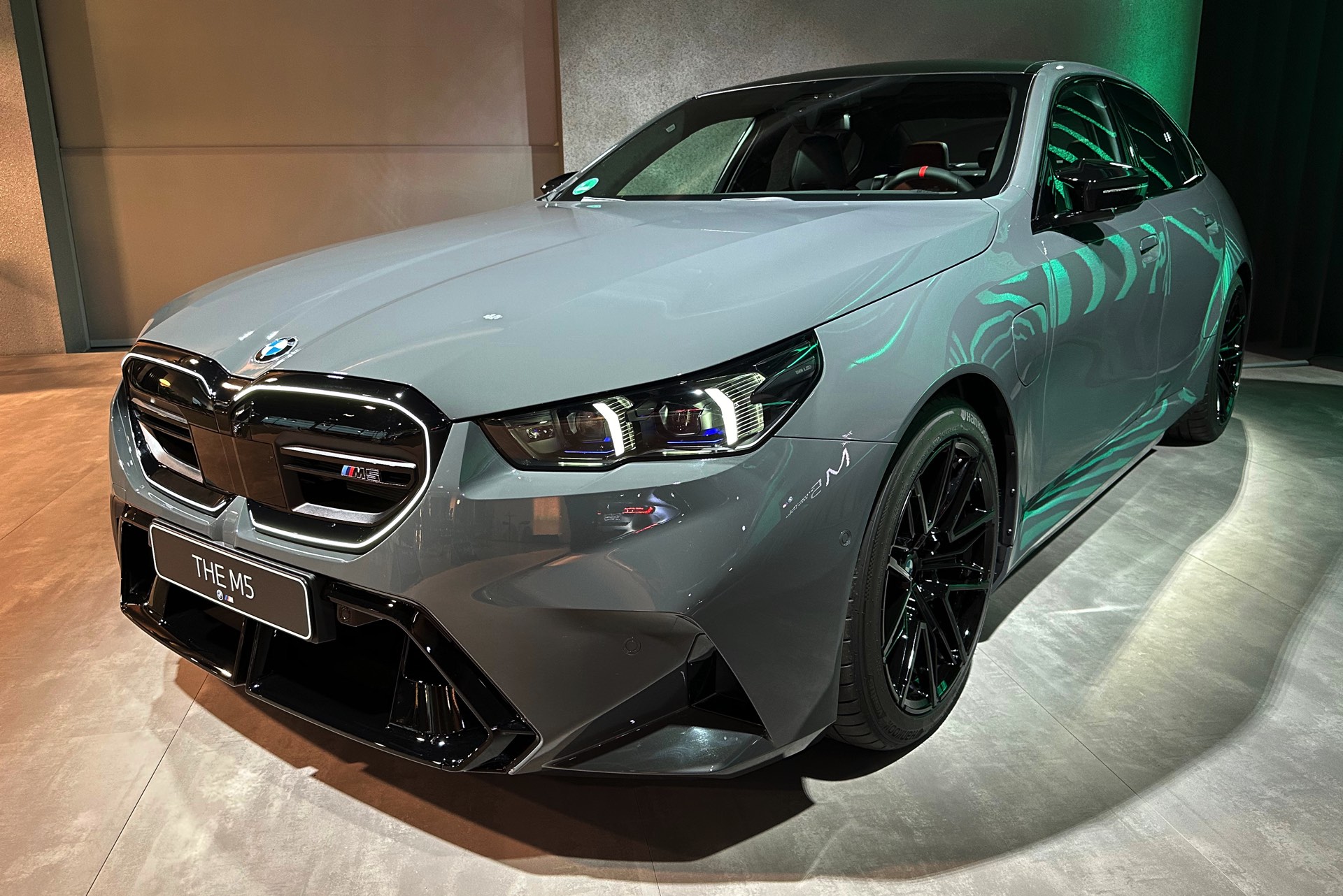 Verglichen mit intensiven Farben wie Isle of Man Green, Speed Gelb oder gar Feuerorange zählt Grigio Telesto ohne Frage zu den weniger auffälligen Optionen für die Außenhaut des neuen BMW M5 (G90), aber die Power-Limousine macht aus Ihrer enormen Kraft dennoch keinen Hehl: Die vorne wie hinten deutlich verbreiterten Kotflügel bescheren dem M5 im Zusammenspiel mit den markanter gestalteten Schürzen einen Auftritt, der sich nicht nur für geübte Augen klar vom regulären 5er (G60) abgrenzt.
