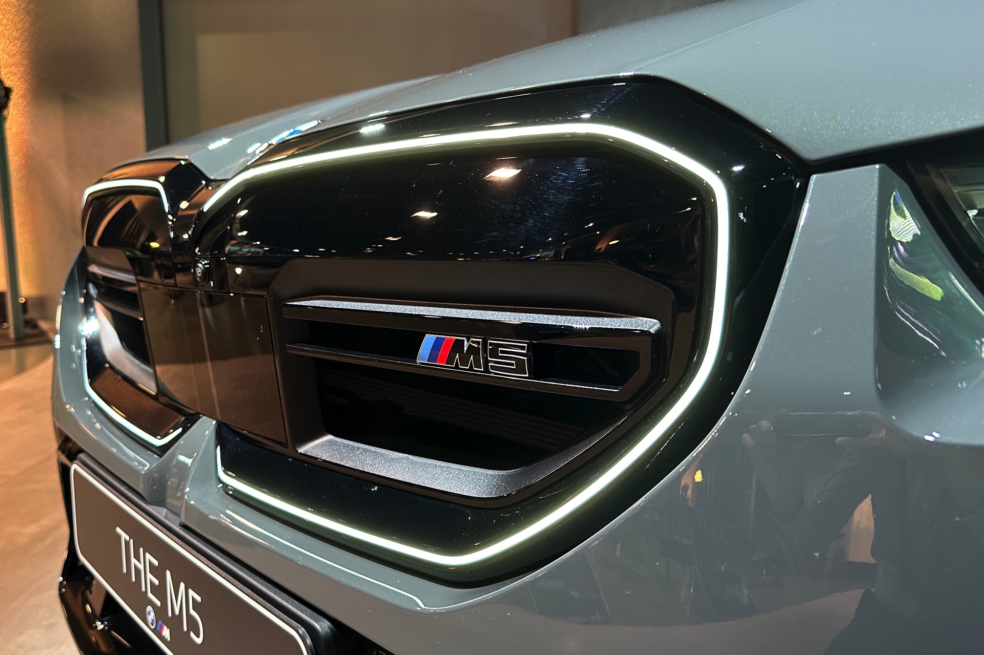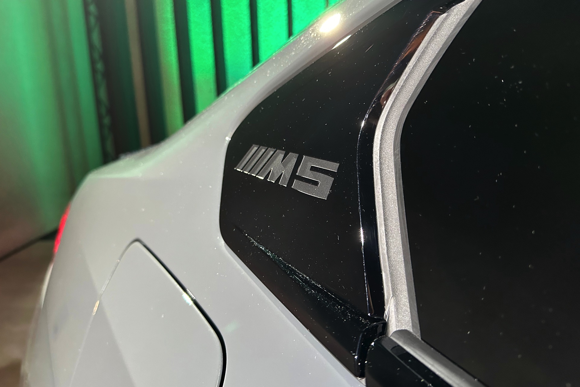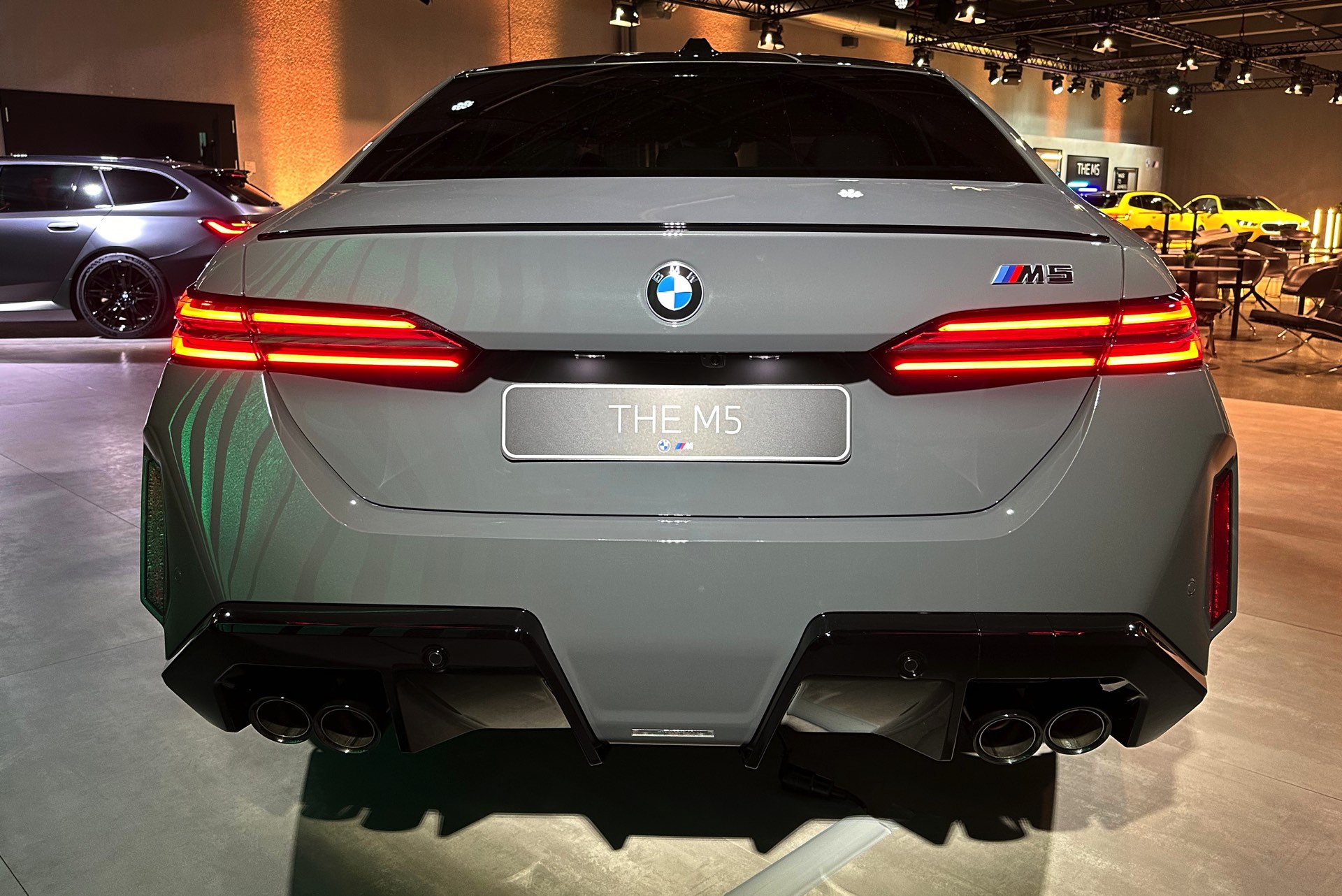 An der Front dominiert der zentrale Lufteinlass unterhalb der von beleuchteten Iconic Glow-Einfassungen zusätzlich betonten Nieren die Optik, aber auch das exklusiv M5 und i5 M60 vorbehaltene Nieren-Innenleben mit horizontalen Streben trägt zur Breitenwirkung bei. Dass die Niere im oberen Teil auch beim M5 mit seinem doppelt aufgeladenen Achtzylinder geschlossen ist, hängt übrigens mit der Sensorik für die Assistenzsysteme zusammen. Am Heck sind Missverständnisse erst Recht ausgeschlossen, denn neben den verbreiterten Kotflügeln sprechen hier auch der zweigeteilte Diffusor und die vier Endrohre eine unmissverständliche Sprache. "