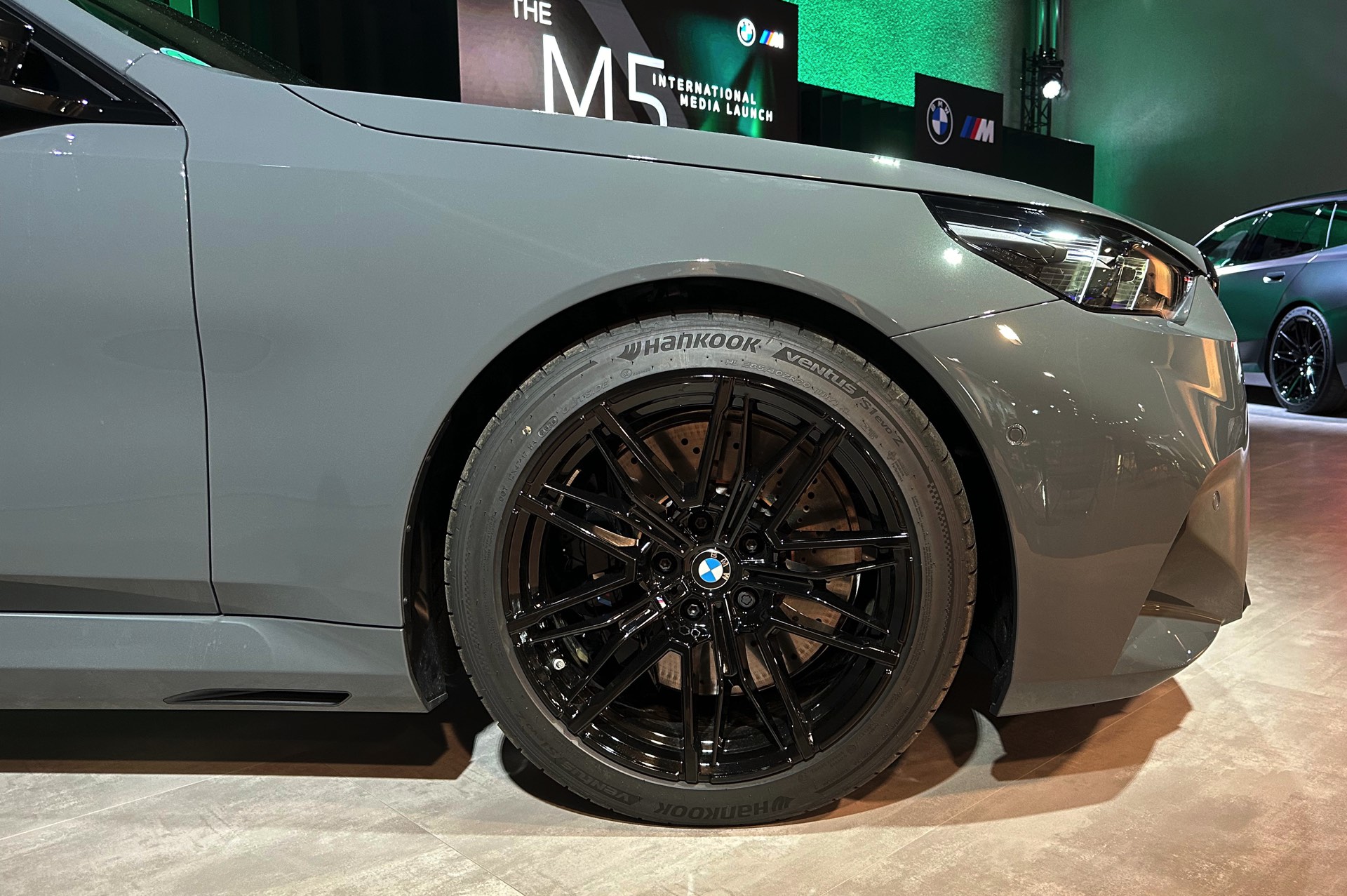 Auf unseren Fotos aus Garching sehen wir den neuen BMW M5 (G90) in einer vergleichsweise zurückhaltenden Konfiguration: Die graue Individual-Lackierung in Grigio Telesto wird praktisch ausschließlich mit schwarzen Akzente kombiniert. In den verbreiterten Radhäusern sehen wir die schwarze Ausführung der vorne 20 und hinten 21 Zoll großen Leichtmetallräder im Design Doppelspeiche 951 M, auf denen der Hankook Ventus S1 Evo Z montiert ist. Von den drei Reifen-Optionen bietet diese den geringsten Rollwiderstand und daher auch die höchste Effizienz, in Sachen Grip kann sie aber nicht ganz mit den Alternativen von Pirelli und Michelin mithalten.