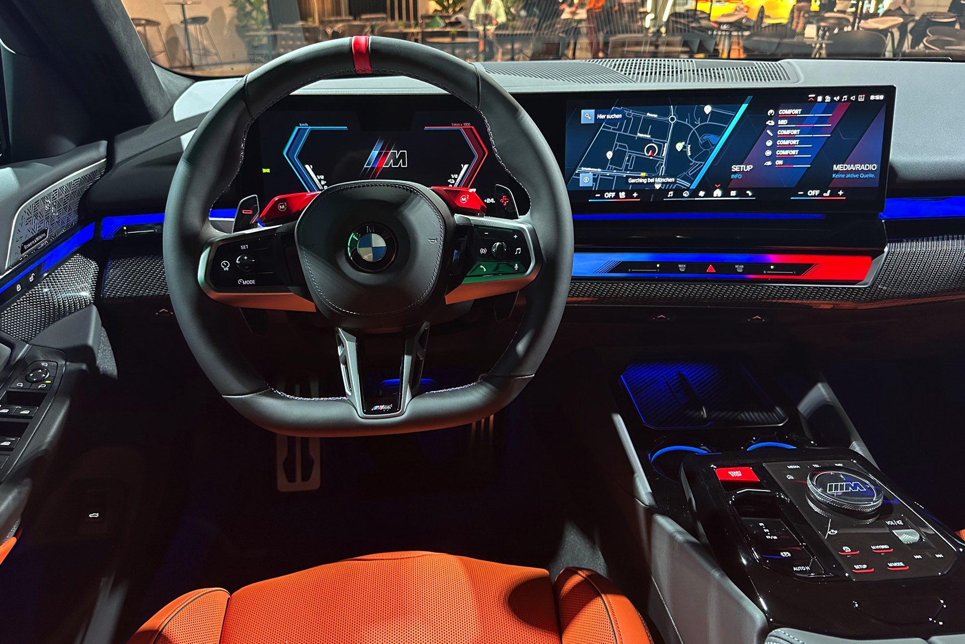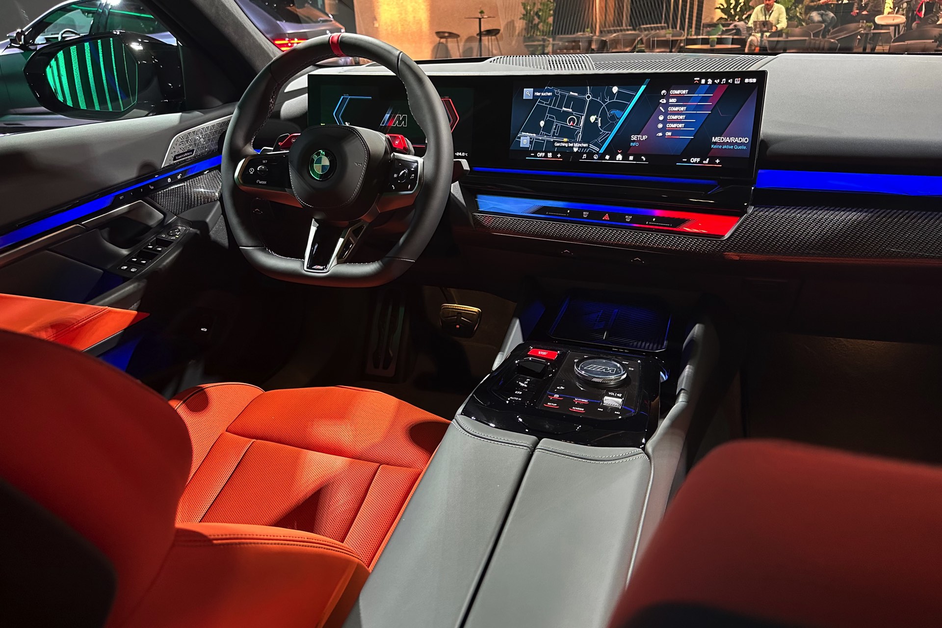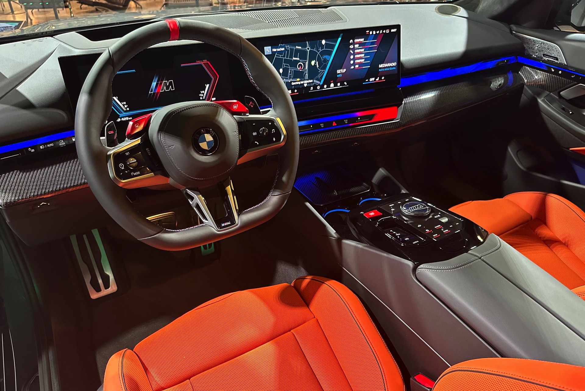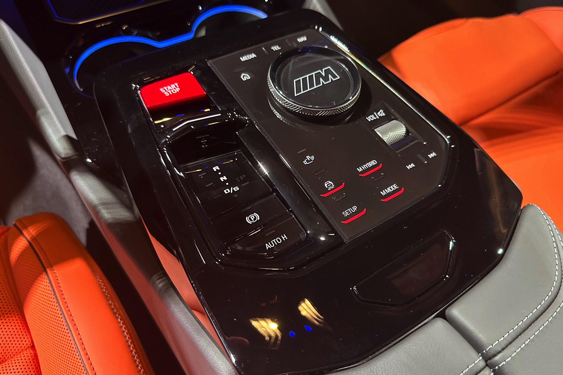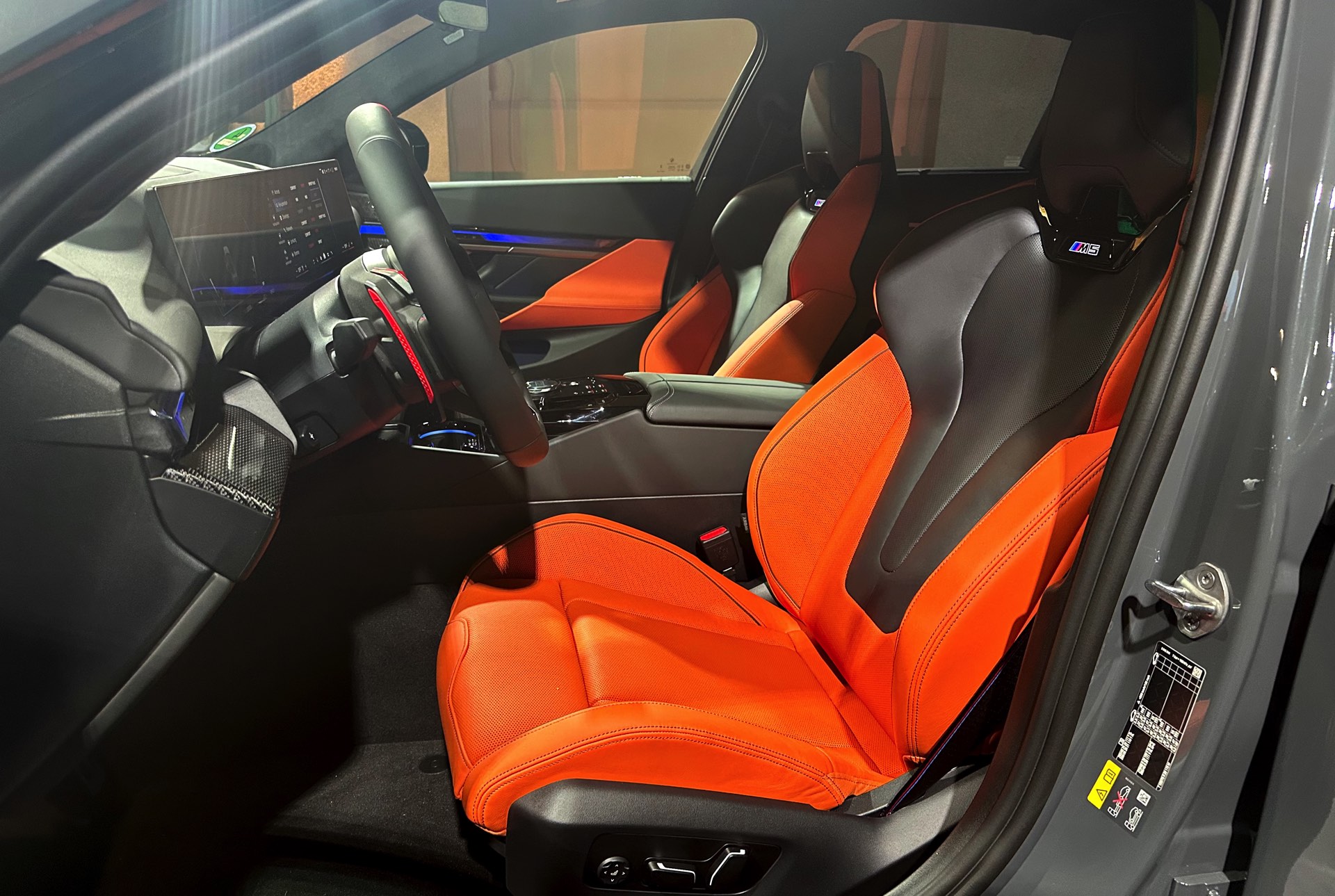 Auf den Fotos vom Innenraum sehen wir die Bicolor-Lederausstattung Merino in Kyalami Orange und Schwarz sowie die Interieurleisten ‘Carbon Fibre’. Zu den M5-spezifischen Details zählen das M-Lenkrad mit roter 12-Uhr-Markierung, großen Schaltwippen und zusätzlichen M1- und M2-Knöpfen zur schnellen Setup-Wahl. Ganz neu ist auch die Mittelkonsole bestückt, denn neben dem M-Logo im gläsernen iDrive-Controller finden sich hier auch die Tasten zur Wahl von M Mode, Setup, DSC- und MDM-Optionen, M Hybrid-Einstellungen und natürlich der rote Start-Stopp-Knopf.