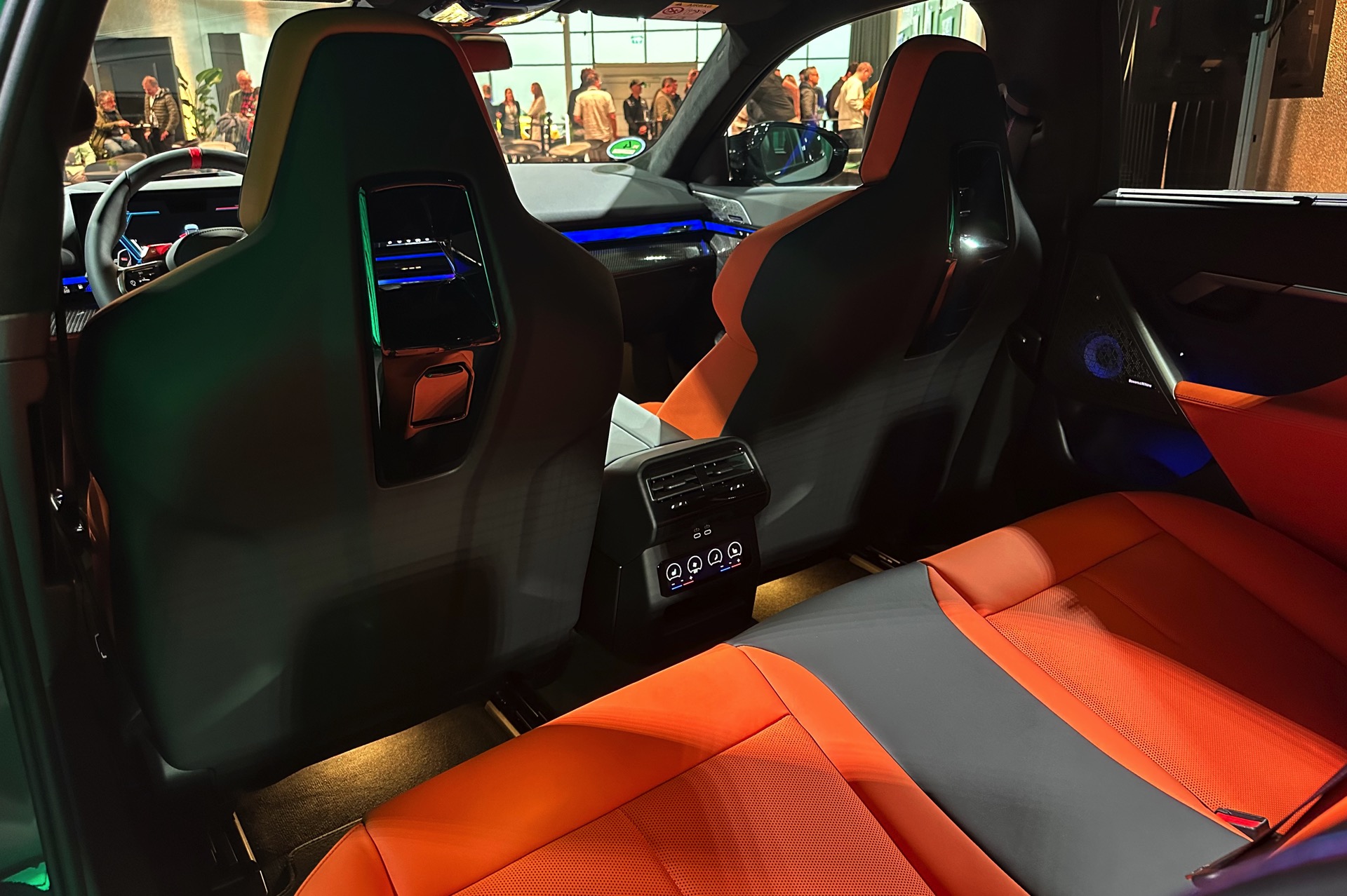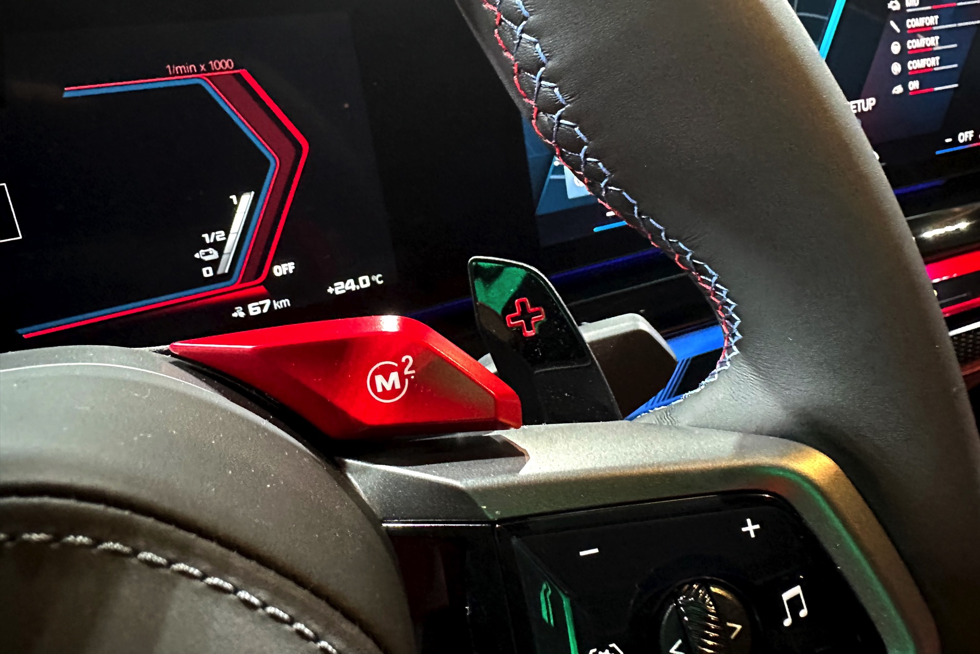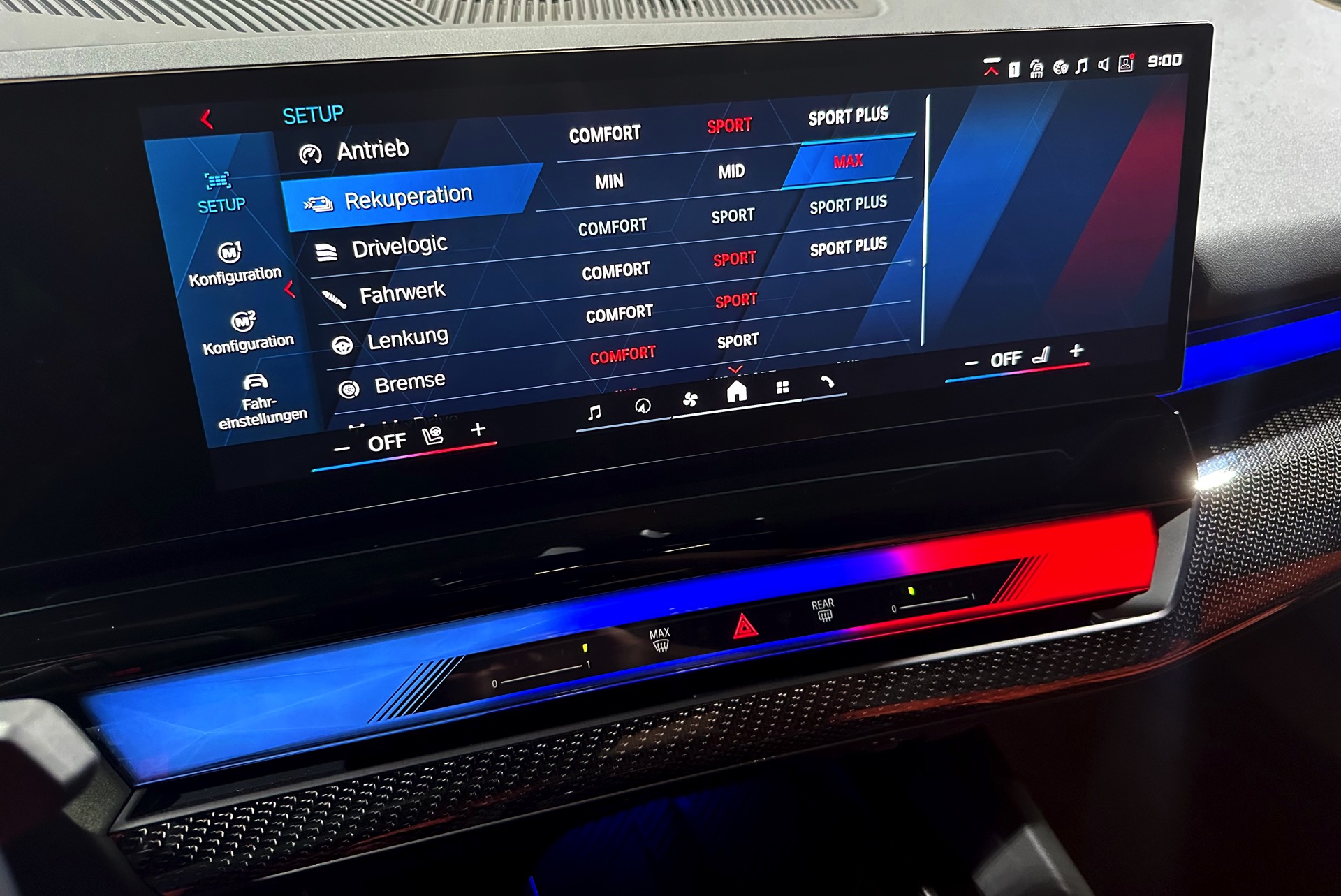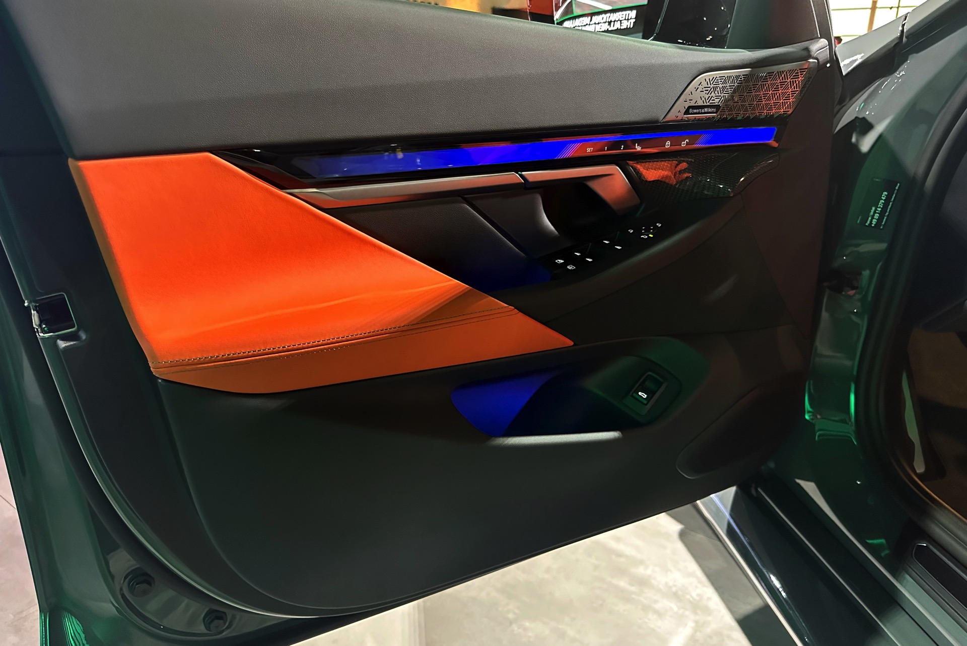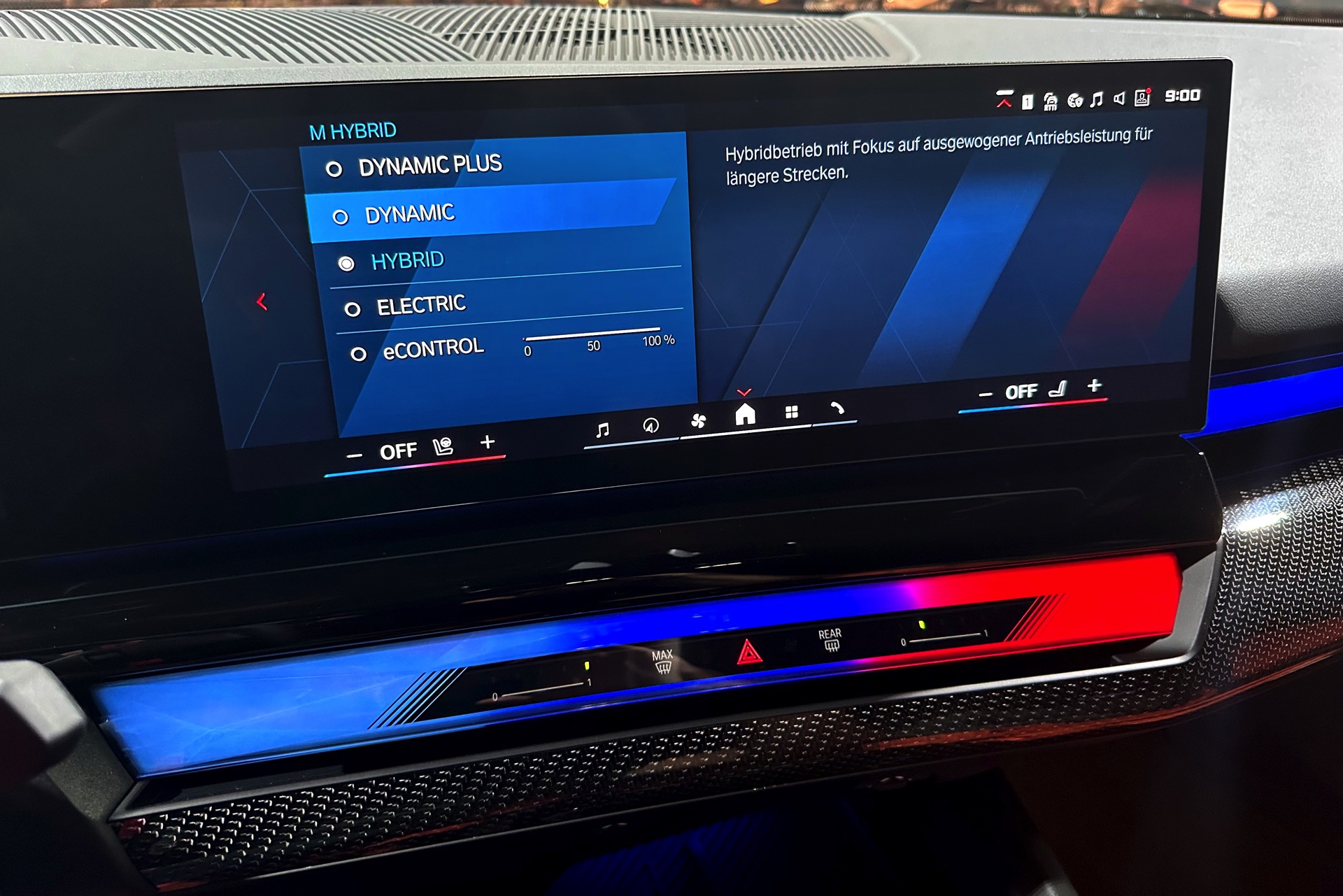 Auf den Fotos vom Innenraum sehen wir die Bicolor-Lederausstattung Merino in Kyalami Orange und Schwarz sowie die Interieurleisten ‘Carbon Fibre’. Zu den M5-spezifischen Details zählen das M-Lenkrad mit roter 12-Uhr-Markierung, großen Schaltwippen und zusätzlichen M1- und M2-Knöpfen zur schnellen Setup-Wahl. Ganz neu ist auch die Mittelkonsole bestückt, denn neben dem M-Logo im gläsernen iDrive-Controller finden sich hier auch die Tasten zur Wahl von M Mode, Setup, DSC- und MDM-Optionen, M Hybrid-Einstellungen und natürlich der rote Start-Stopp-Knopf.