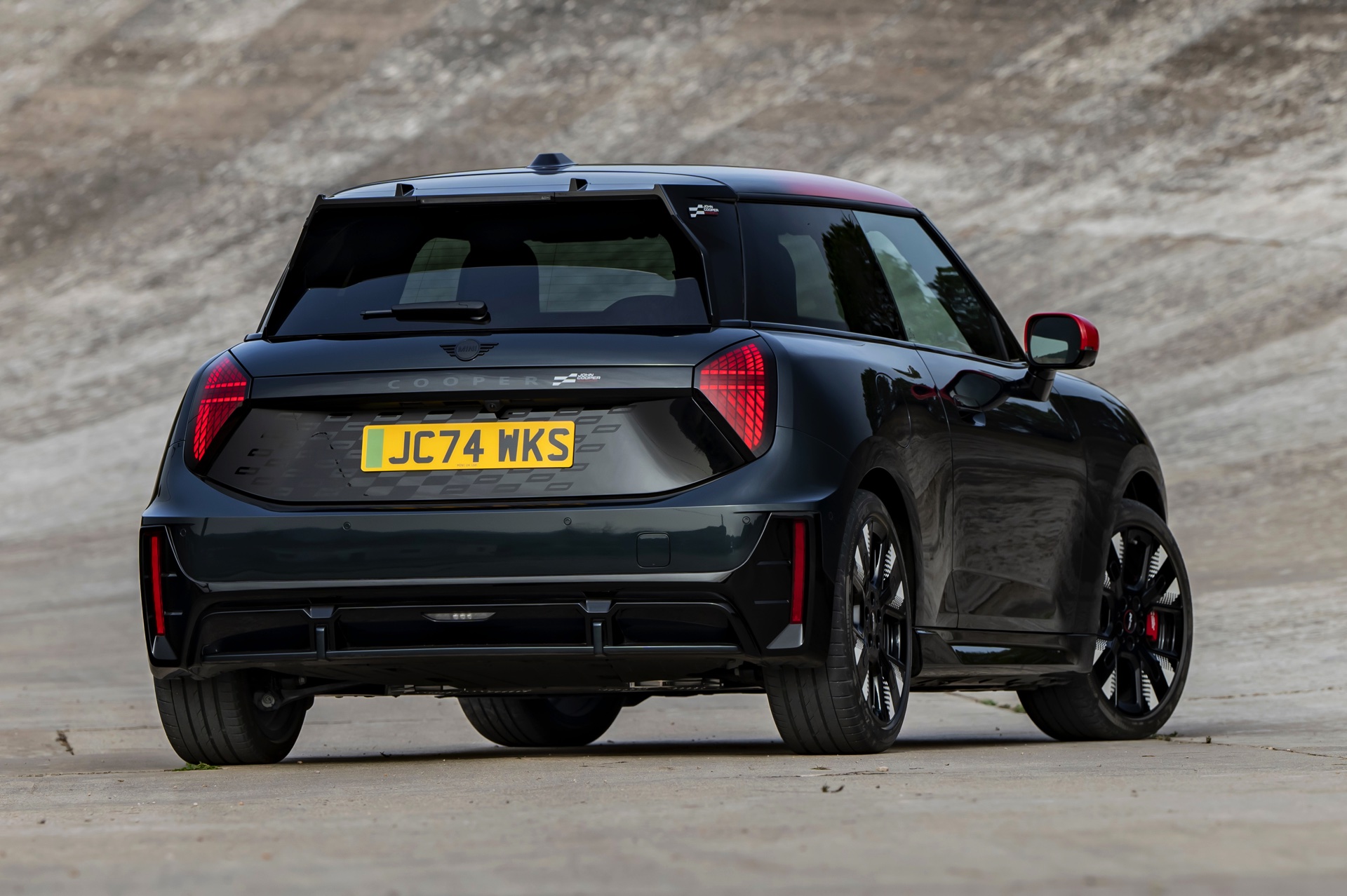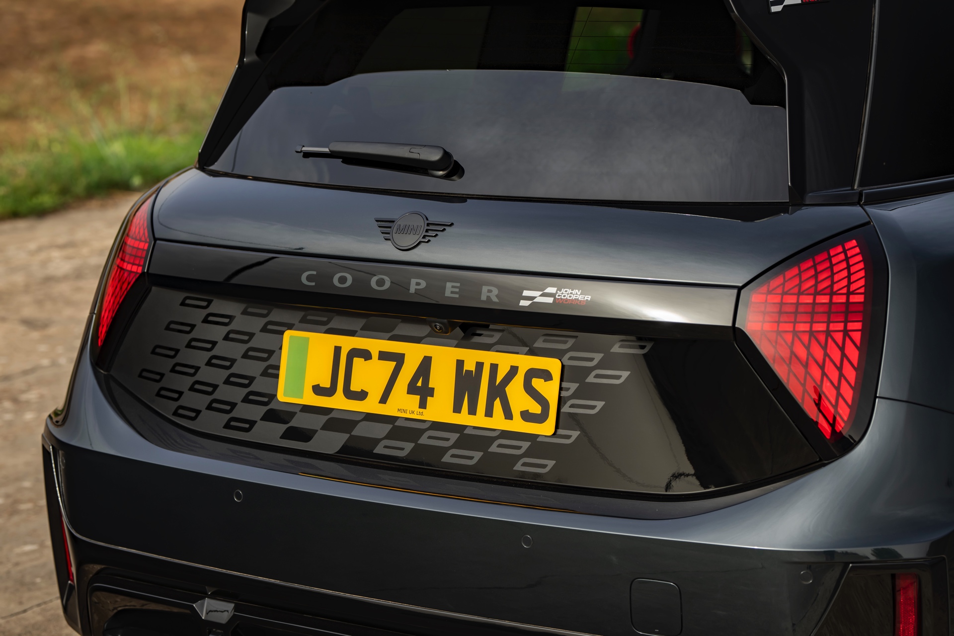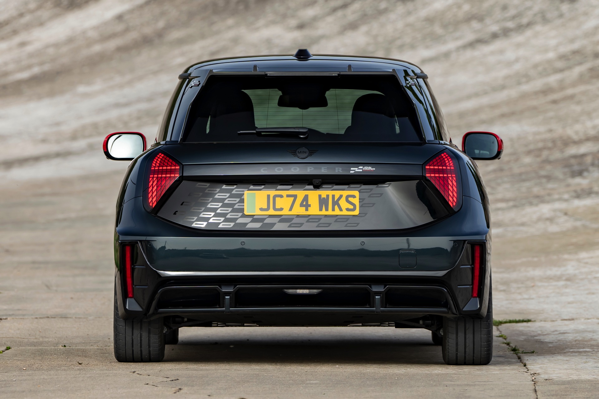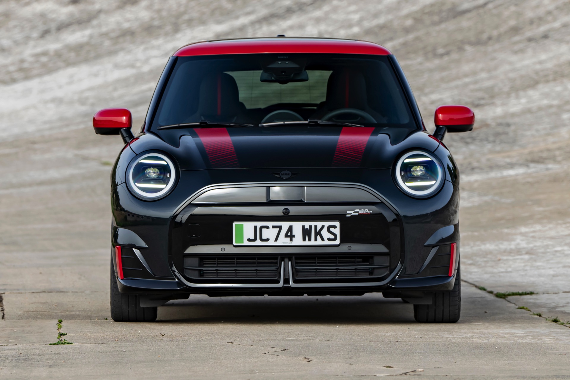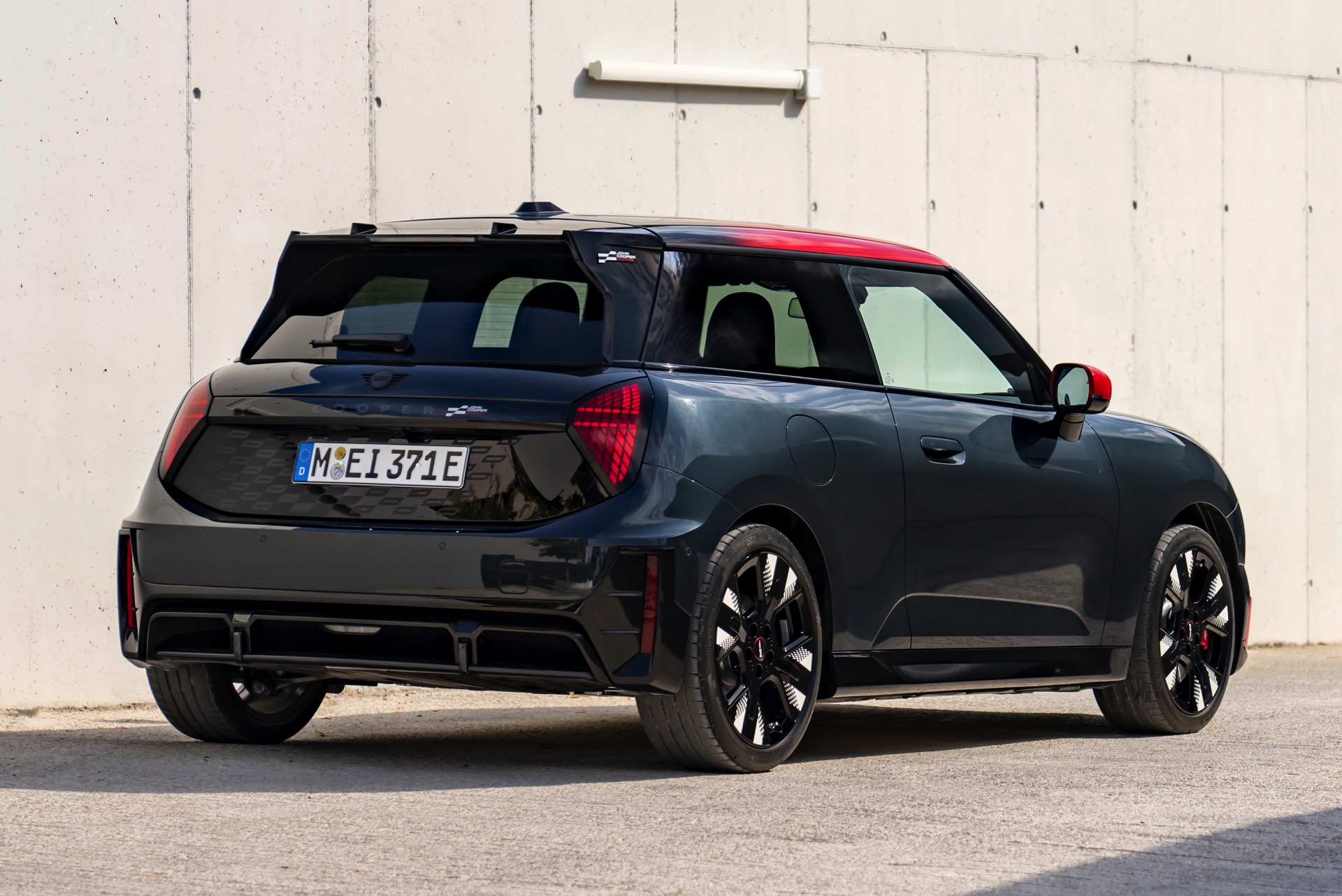 Anders als alle bisherigen John Cooper Works-Modelle können sich die neuen Elektroautos nicht durch eine besonders markante Abgasanlage von den schwächeren Modellen abgrenzen. Ins Auge stoßen deshalb Aspekte wie der markante Heckspoiler und das Kontrastdach, das wahlweise komplett in Chili Red oder als Multitone-Roof mit Farbverlauf von Rot zu Schwarz lackiert wird. Ein Hinweis für Kenner ist die JCW-Signatur der Frontscheinwerfer, die mit horizontalen Balken auf sich aufmerksam machen können.