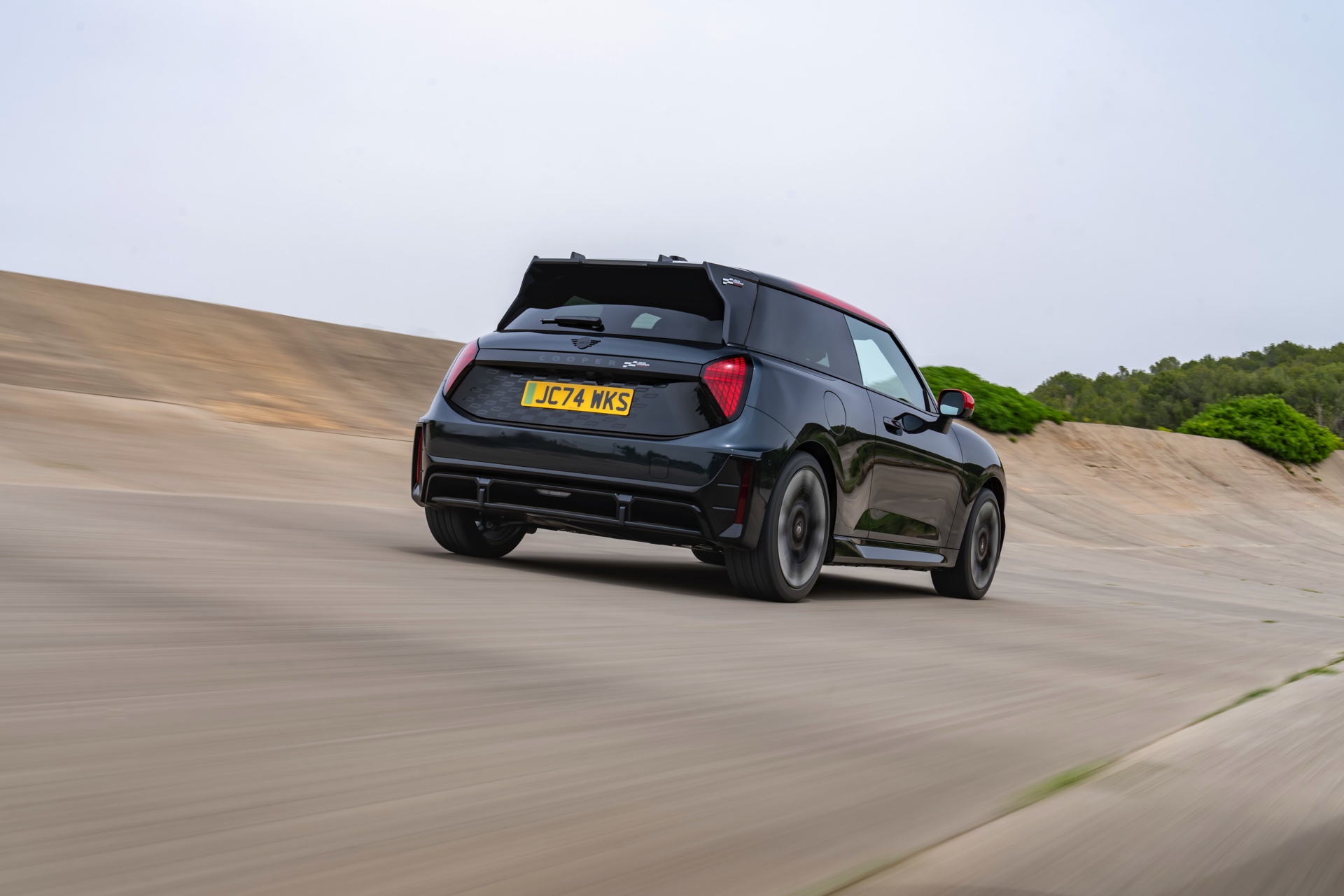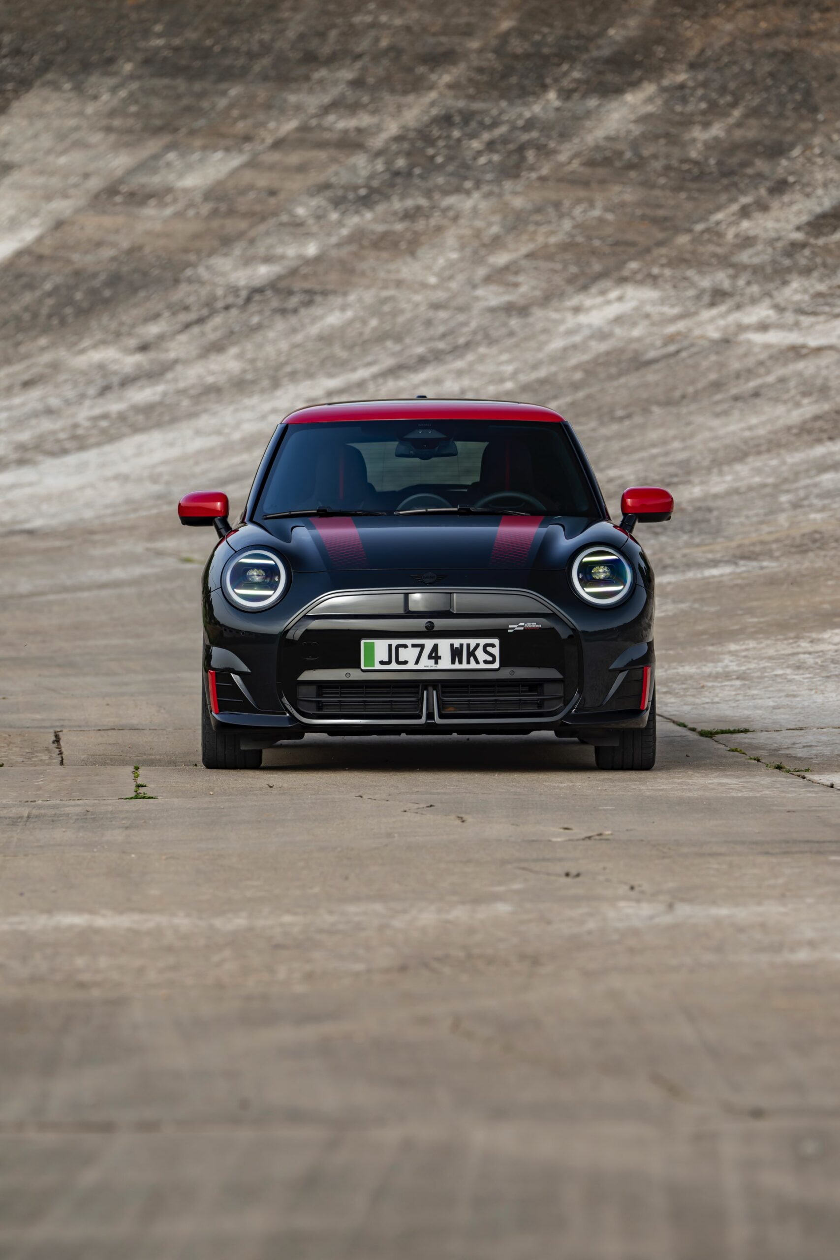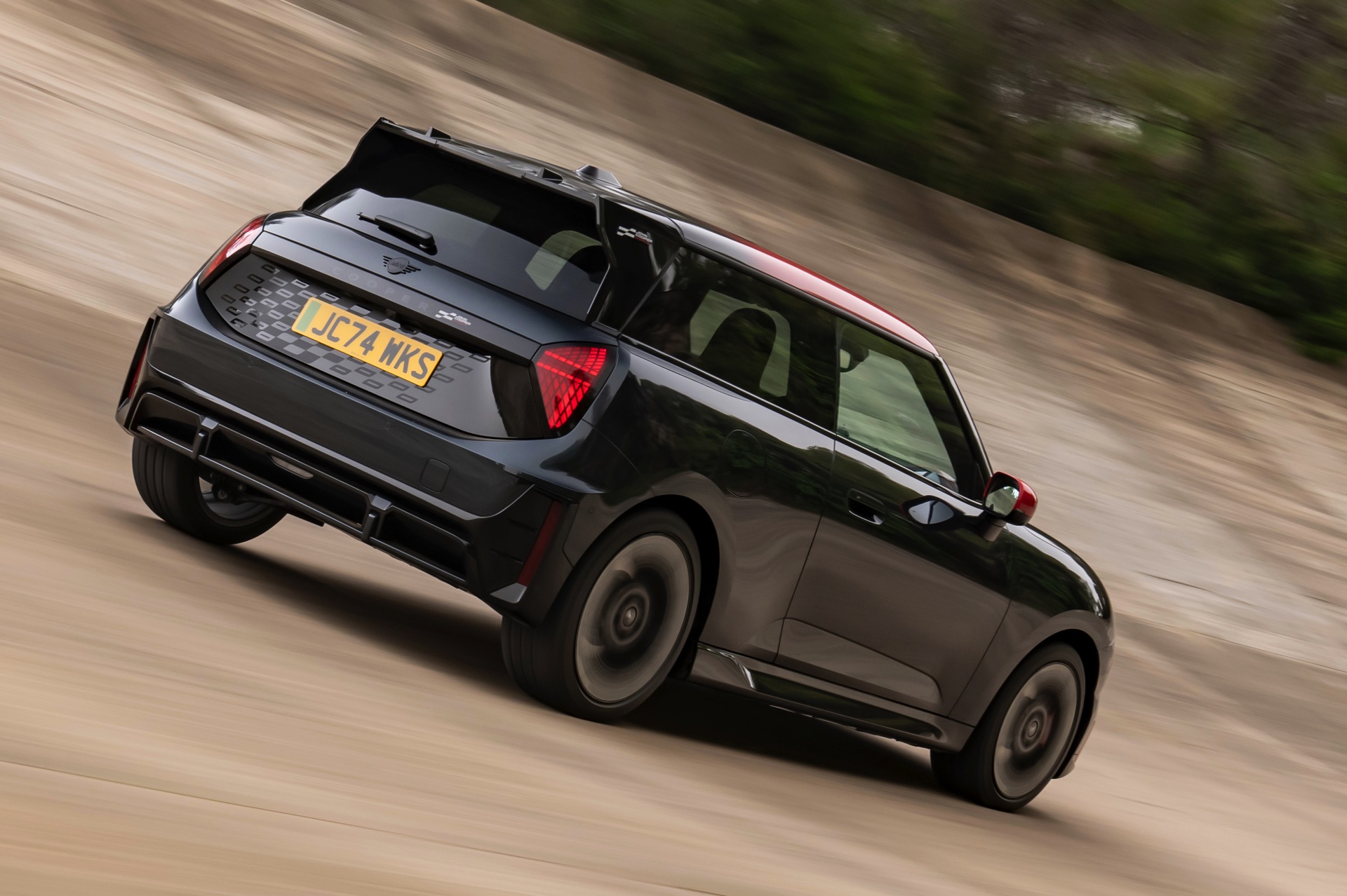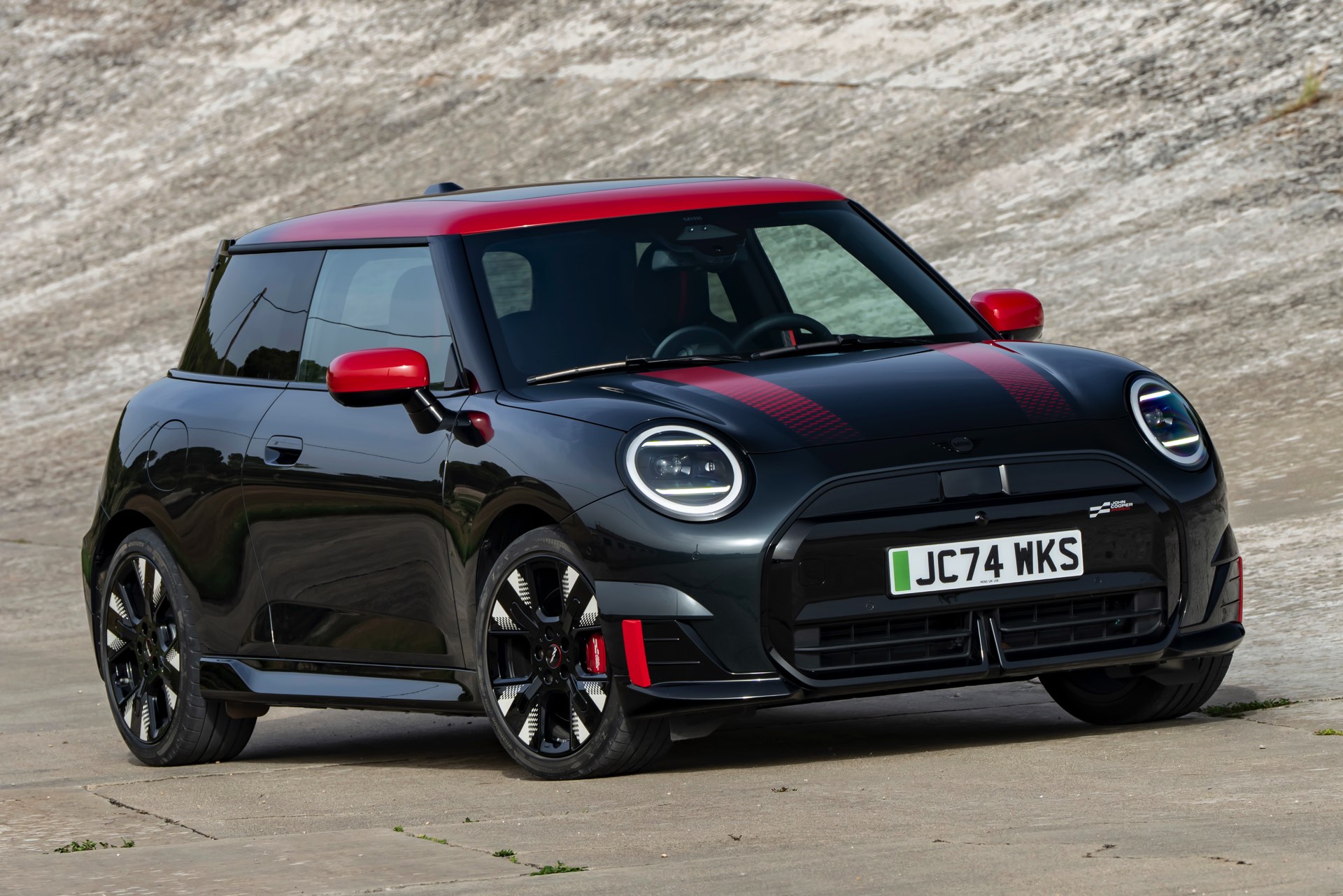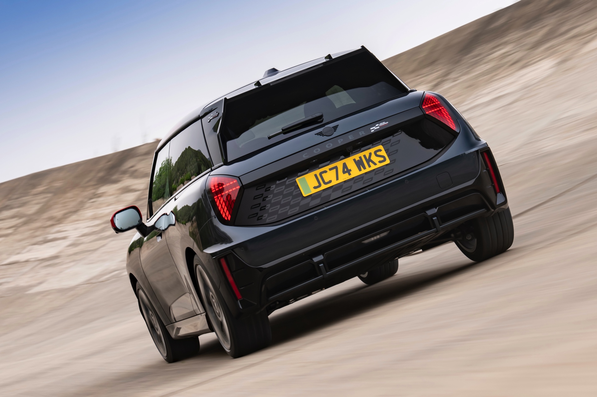 Anders als alle bisherigen John Cooper Works-Modelle können sich die neuen Elektroautos nicht durch eine besonders markante Abgasanlage von den schwächeren Modellen abgrenzen. Ins Auge stoßen deshalb Aspekte wie der markante Heckspoiler und das Kontrastdach, das wahlweise komplett in Chili Red oder als Multitone-Roof mit Farbverlauf von Rot zu Schwarz lackiert wird. Ein Hinweis für Kenner ist die JCW-Signatur der Frontscheinwerfer, die mit horizontalen Balken auf sich aufmerksam machen können.