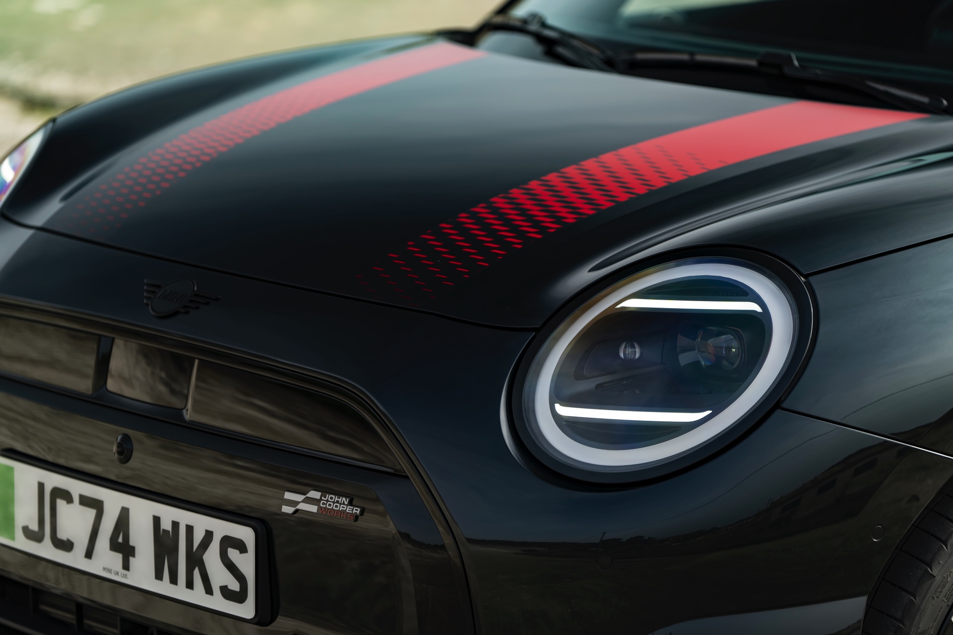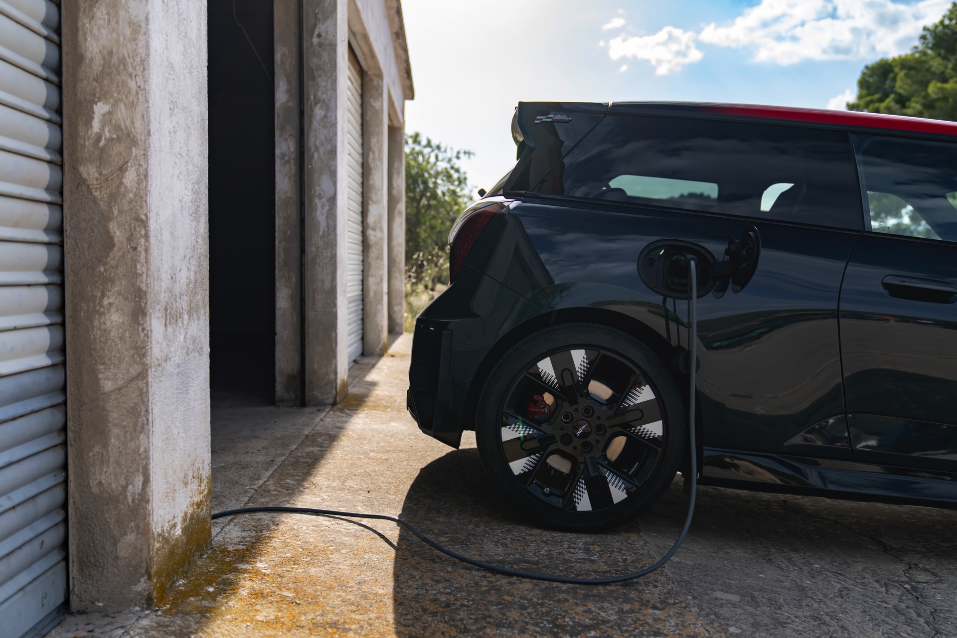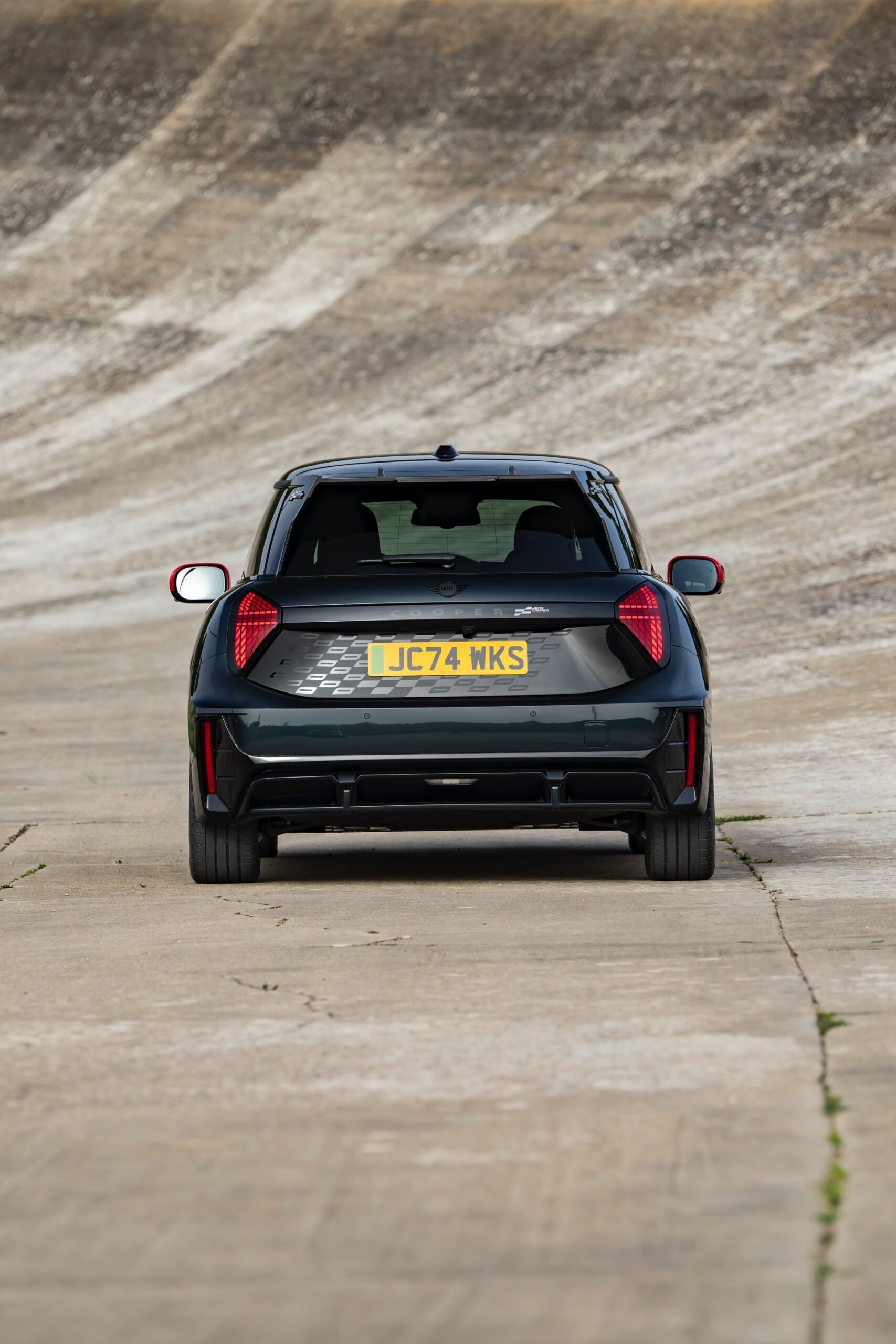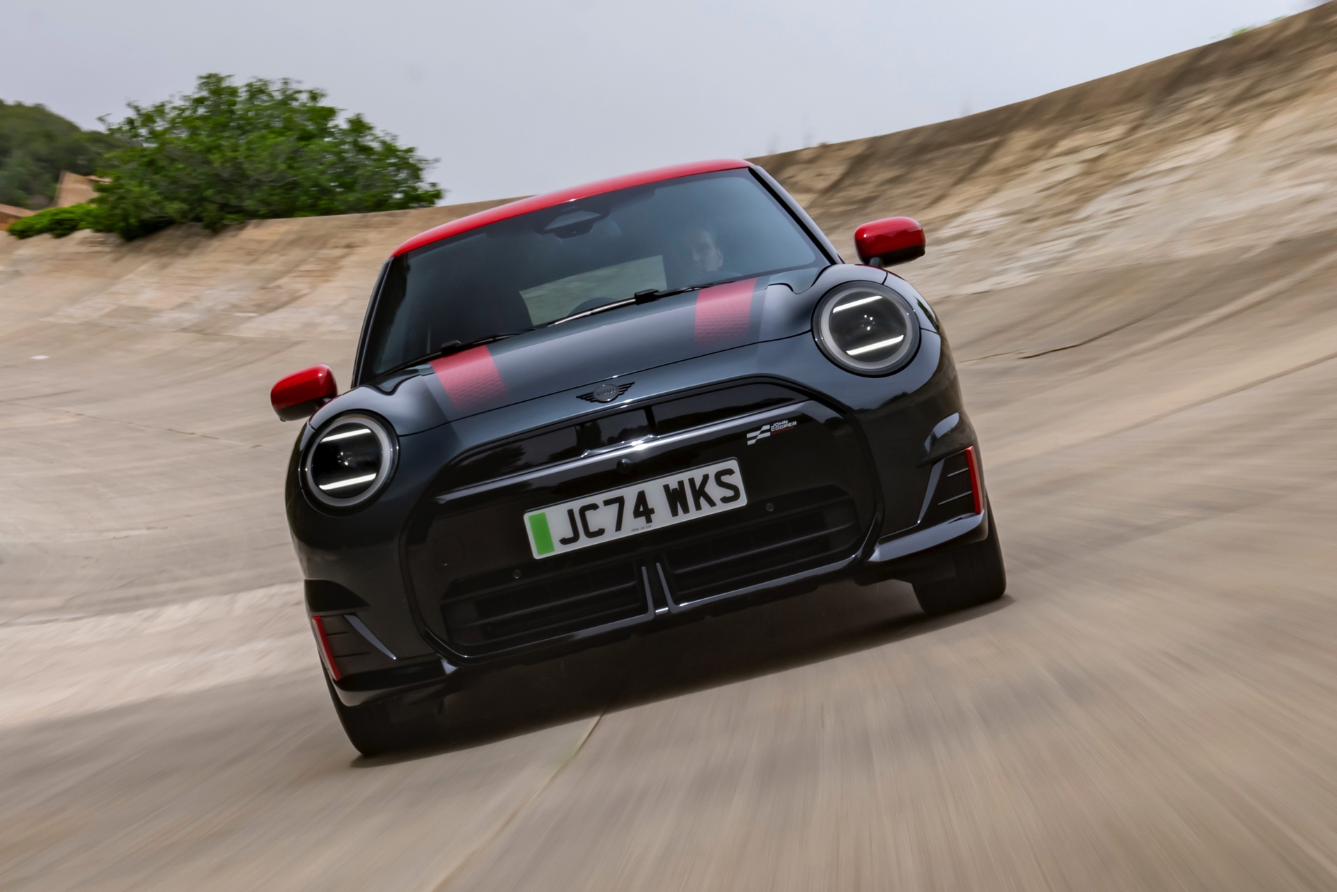 Anders als alle bisherigen John Cooper Works-Modelle können sich die neuen Elektroautos nicht durch eine besonders markante Abgasanlage von den schwächeren Modellen abgrenzen. Ins Auge stoßen deshalb Aspekte wie der markante Heckspoiler und das Kontrastdach, das wahlweise komplett in Chili Red oder als Multitone-Roof mit Farbverlauf von Rot zu Schwarz lackiert wird. Ein Hinweis für Kenner ist die JCW-Signatur der Frontscheinwerfer, die mit horizontalen Balken auf sich aufmerksam machen können.