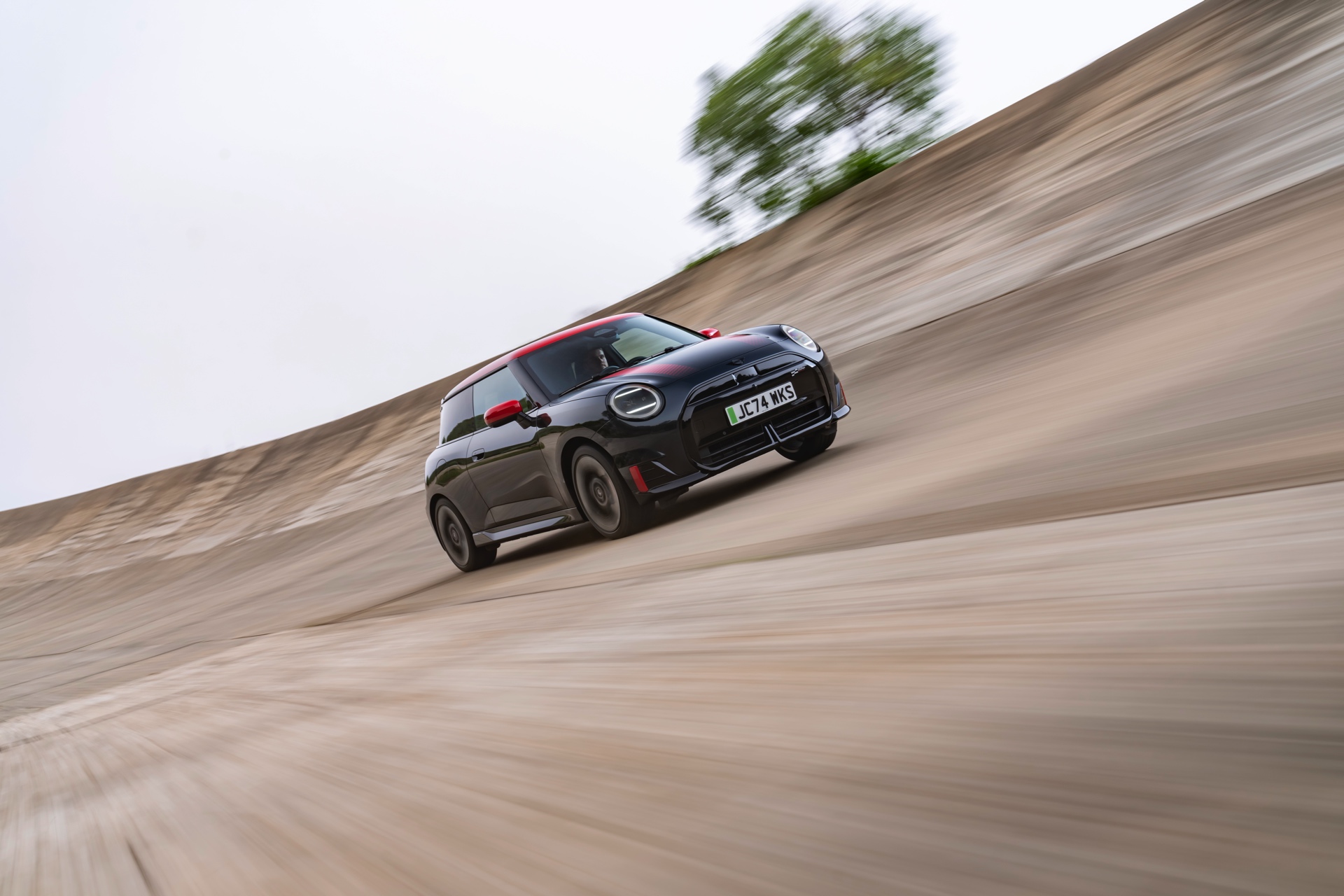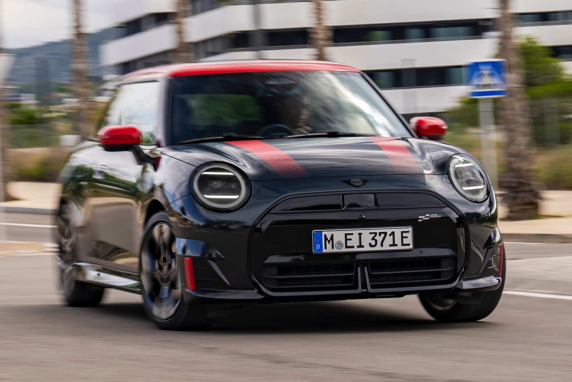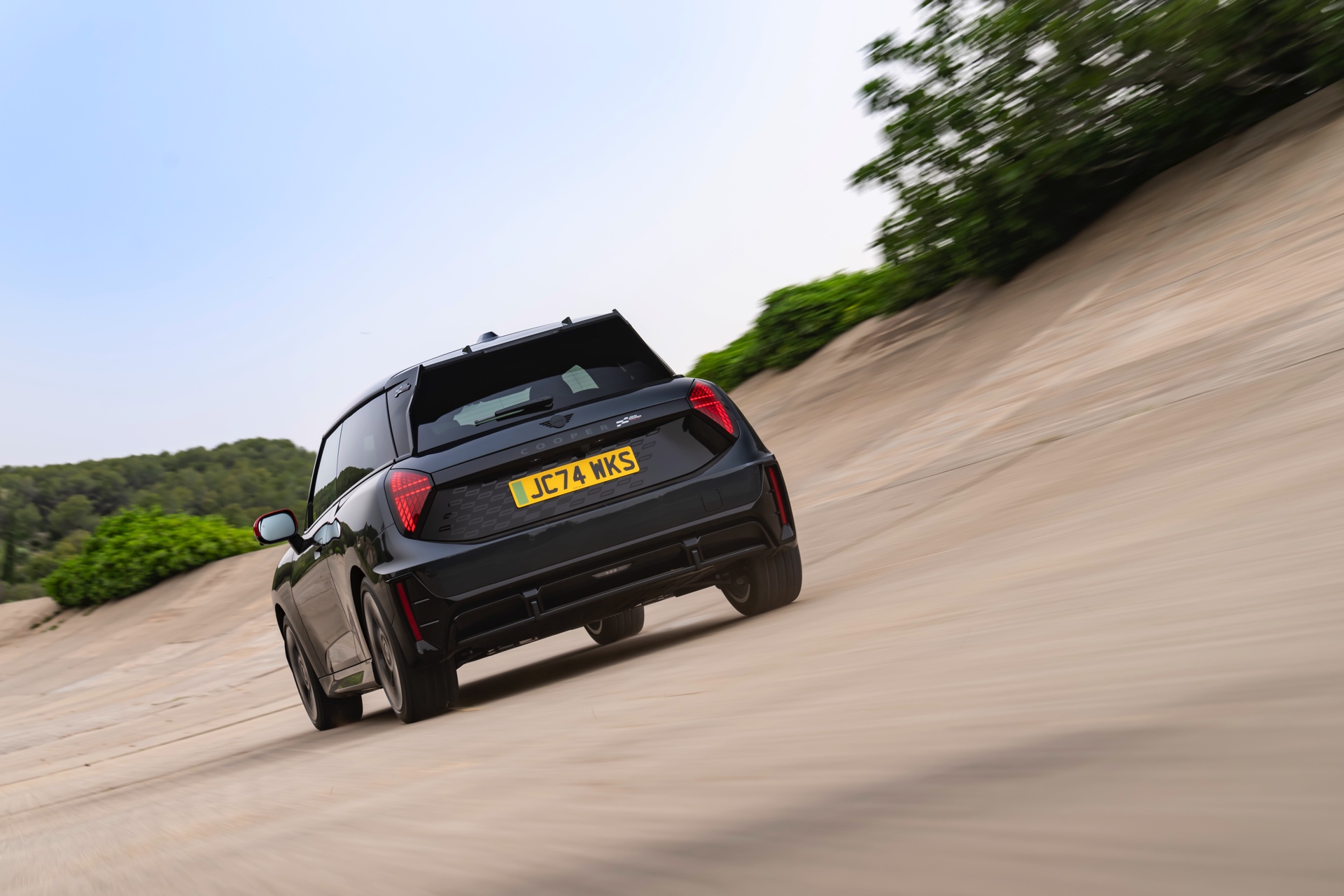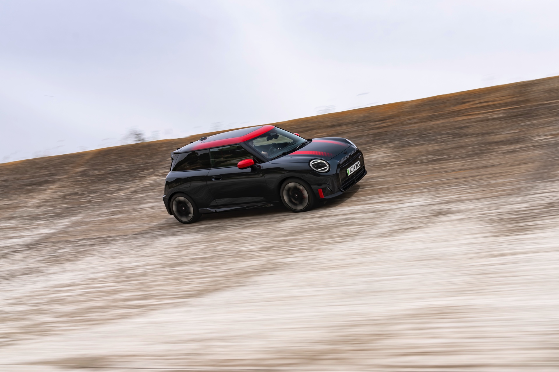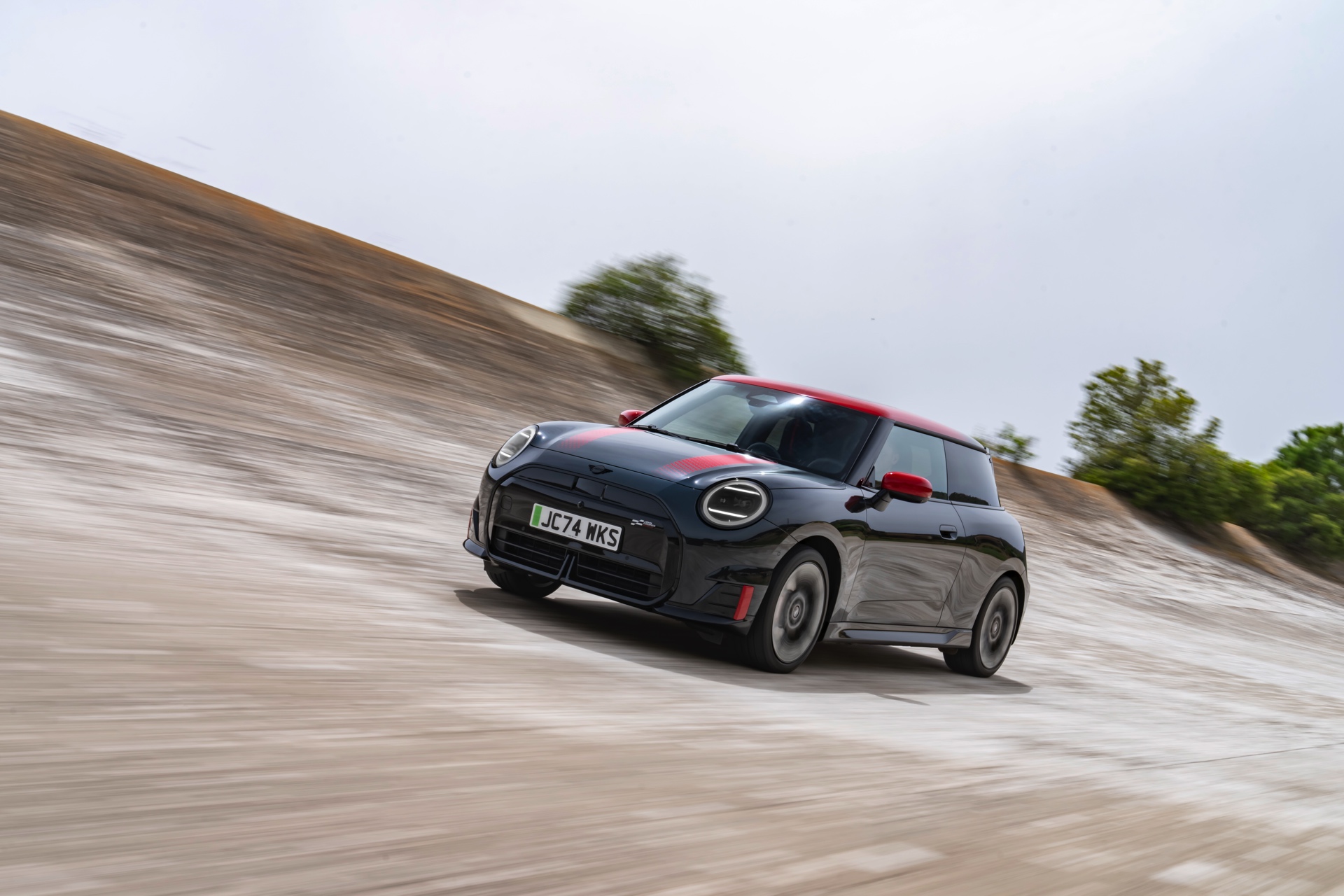 Anders als alle bisherigen John Cooper Works-Modelle können sich die neuen Elektroautos nicht durch eine besonders markante Abgasanlage von den schwächeren Modellen abgrenzen. Ins Auge stoßen deshalb Aspekte wie der markante Heckspoiler und das Kontrastdach, das wahlweise komplett in Chili Red oder als Multitone-Roof mit Farbverlauf von Rot zu Schwarz lackiert wird. Ein Hinweis für Kenner ist die JCW-Signatur der Frontscheinwerfer, die mit horizontalen Balken auf sich aufmerksam machen können.