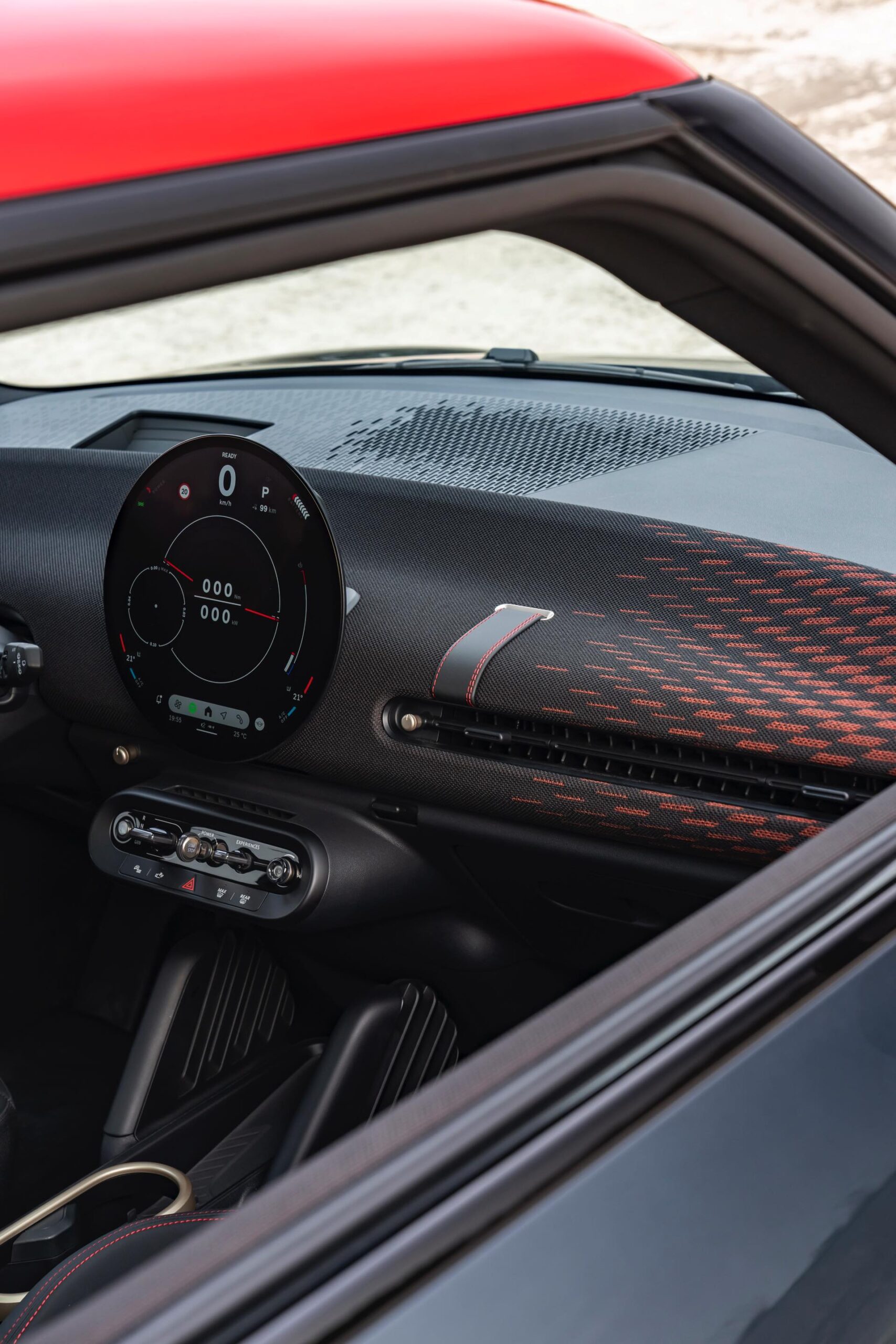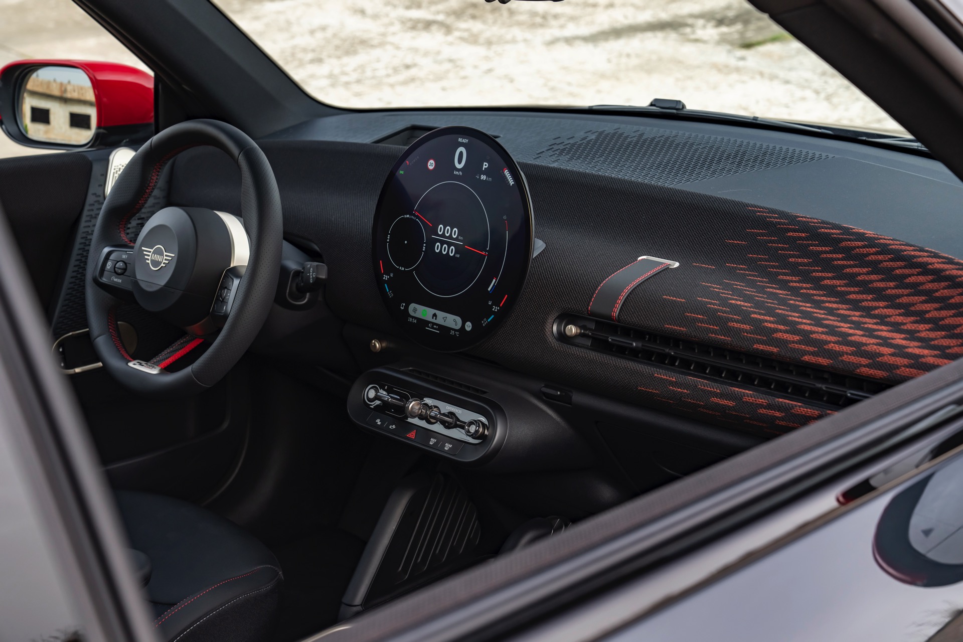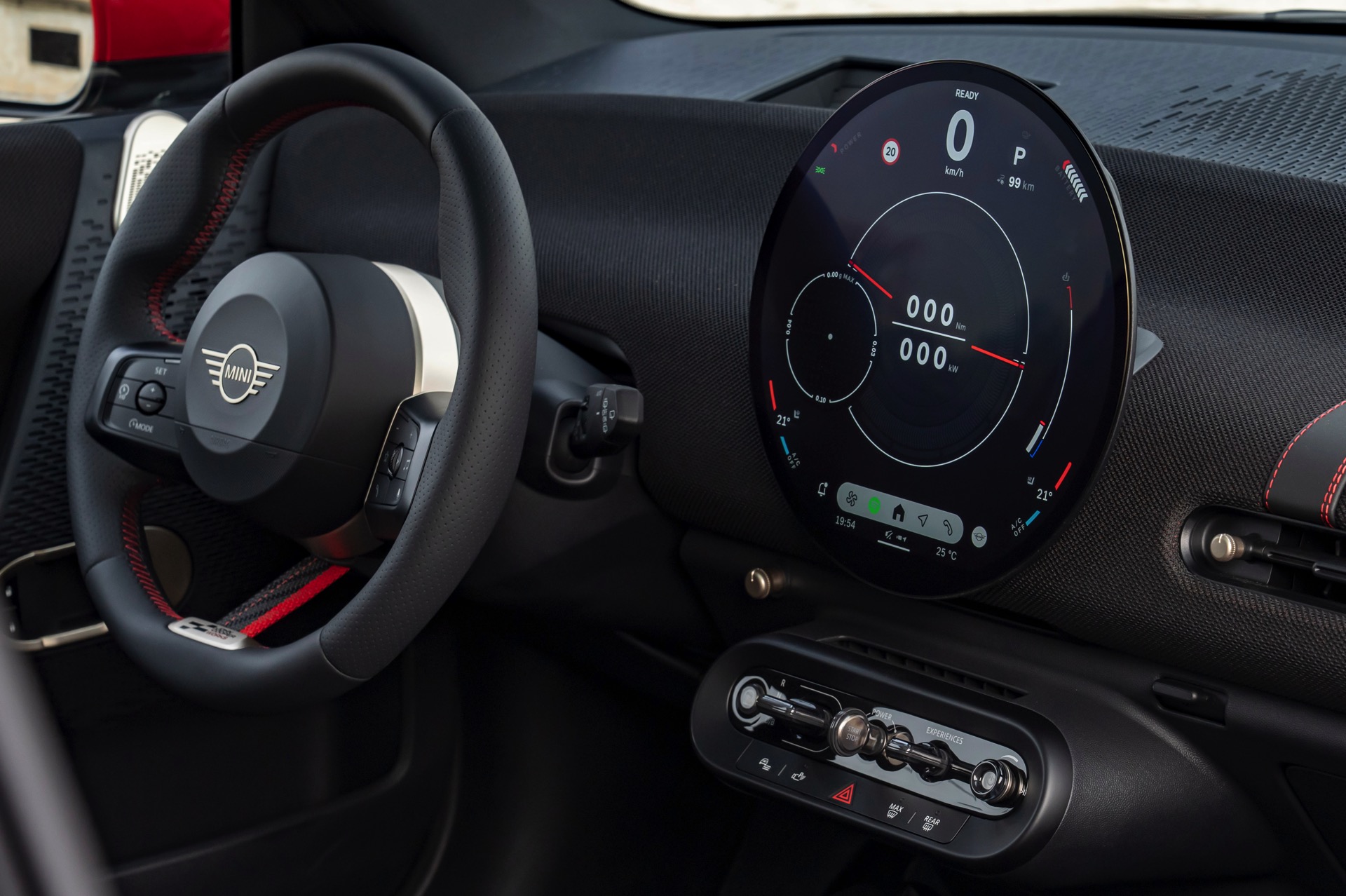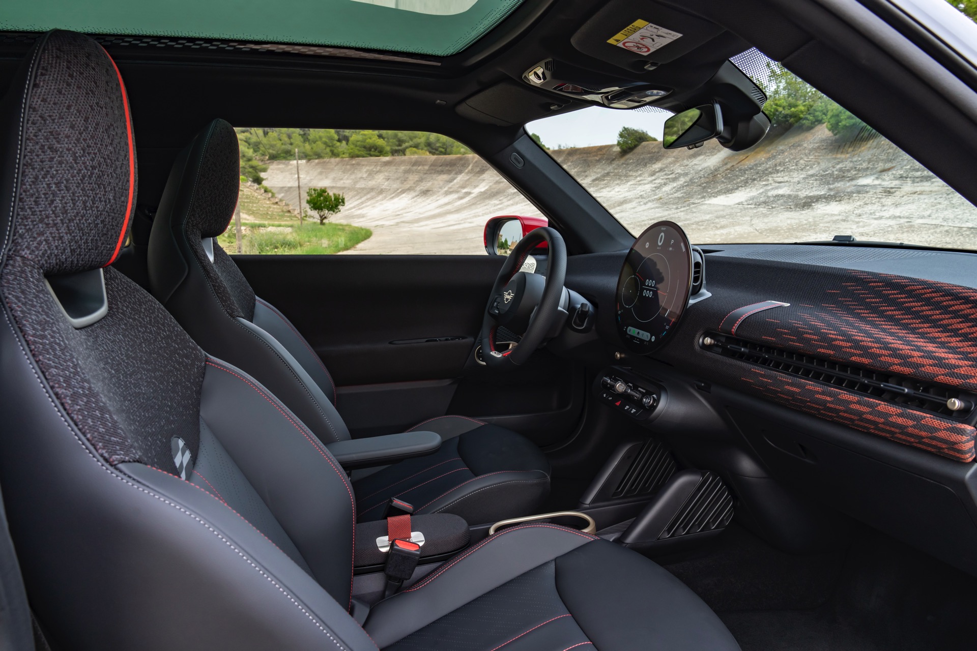Schwarz und Rot dominieren auch den Innenraum, unter anderem ist vor dem Beifahrer ein gestricktes Chequered-Flag-Muster erhältlich. Abgesehen davon tragen natürlich auch die John Cooper Works-Modelle das große OLED Display mit 240 Millimeter Durchmesser, das wir bereits von den schwächeren Varianten kennen.