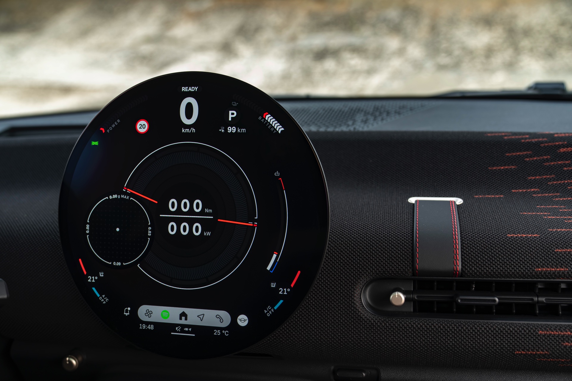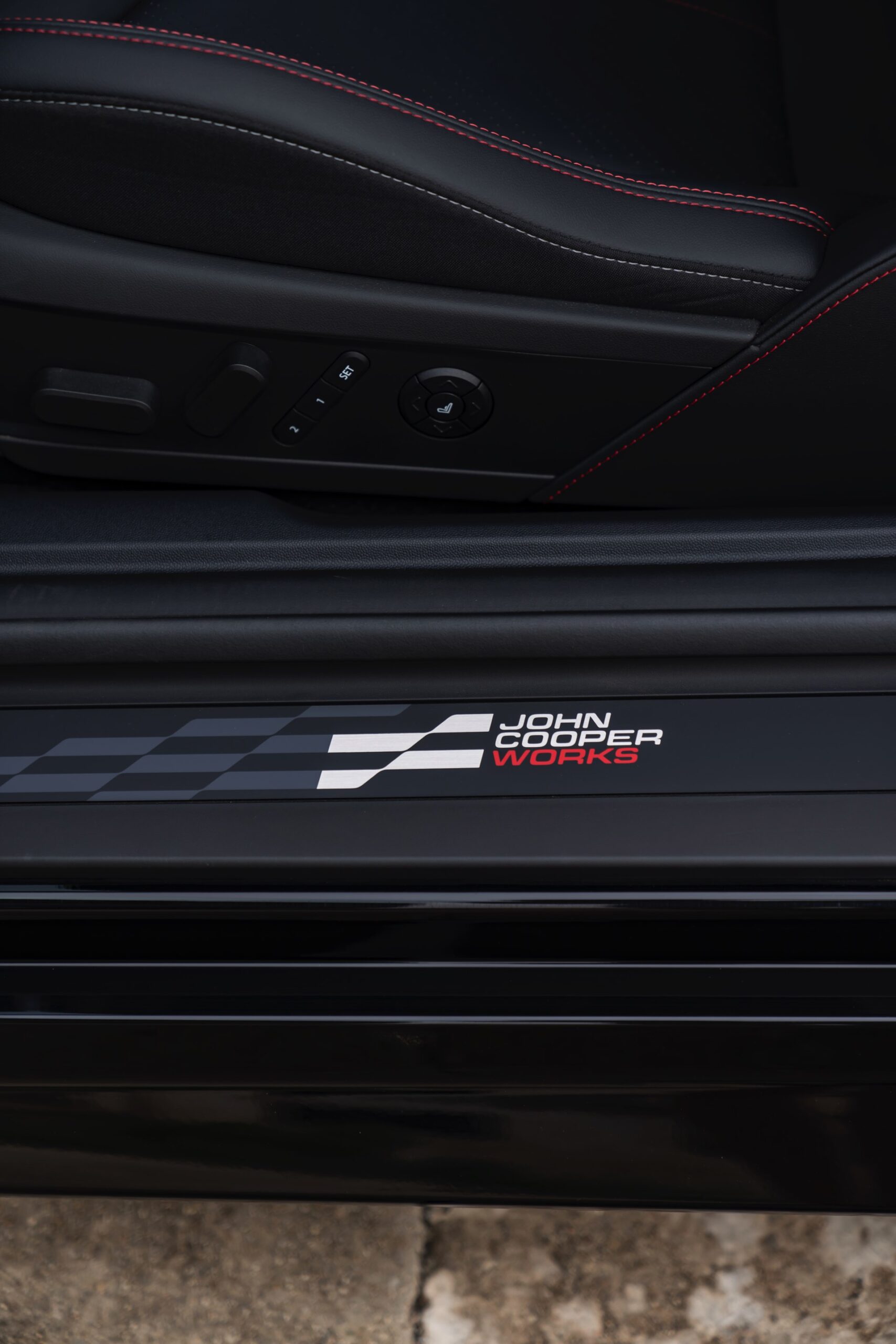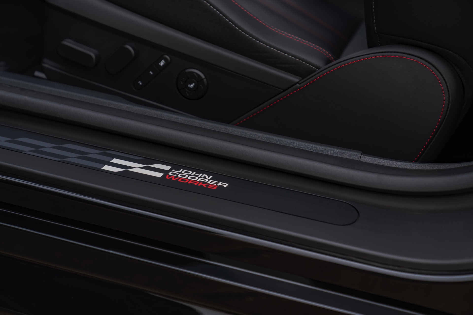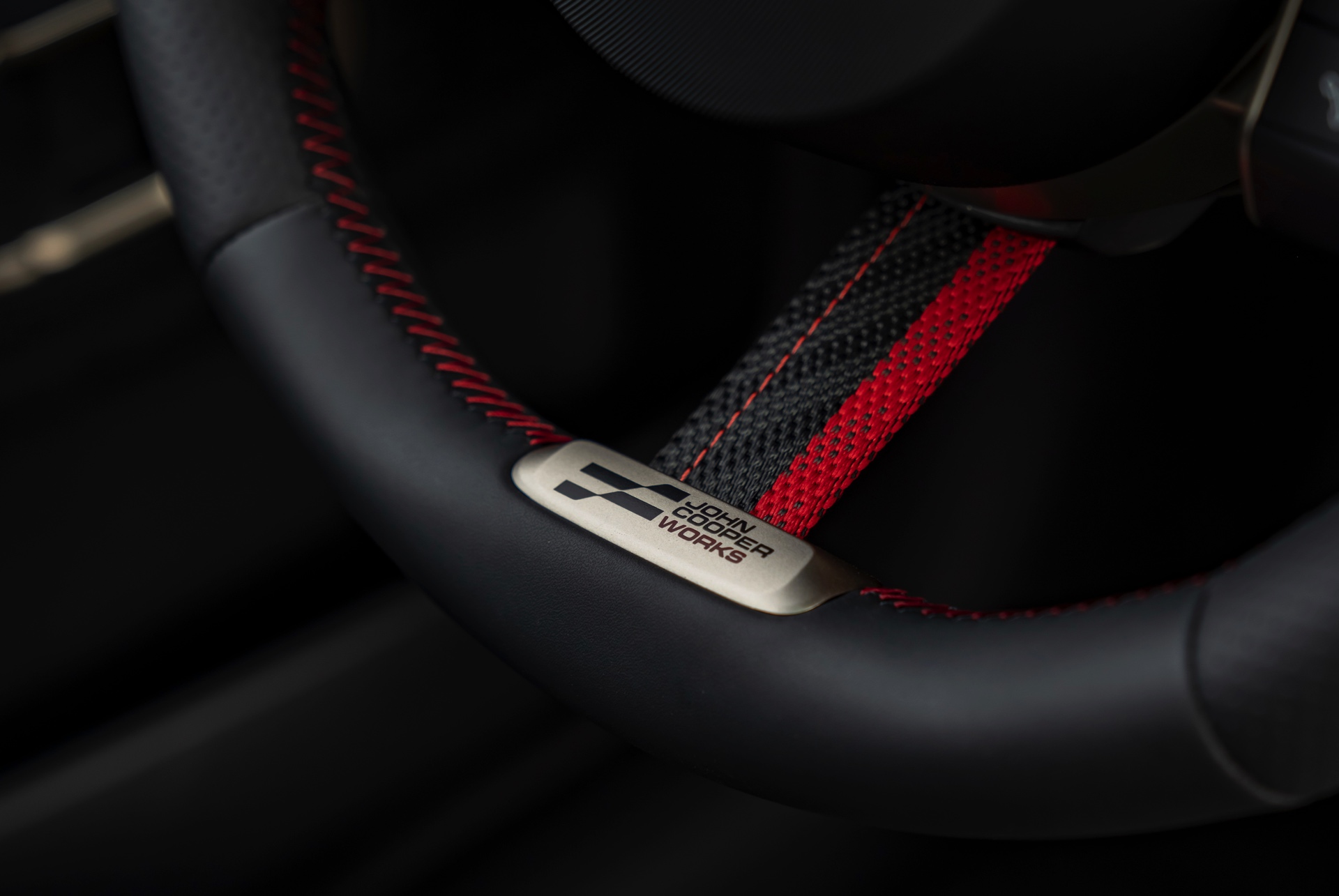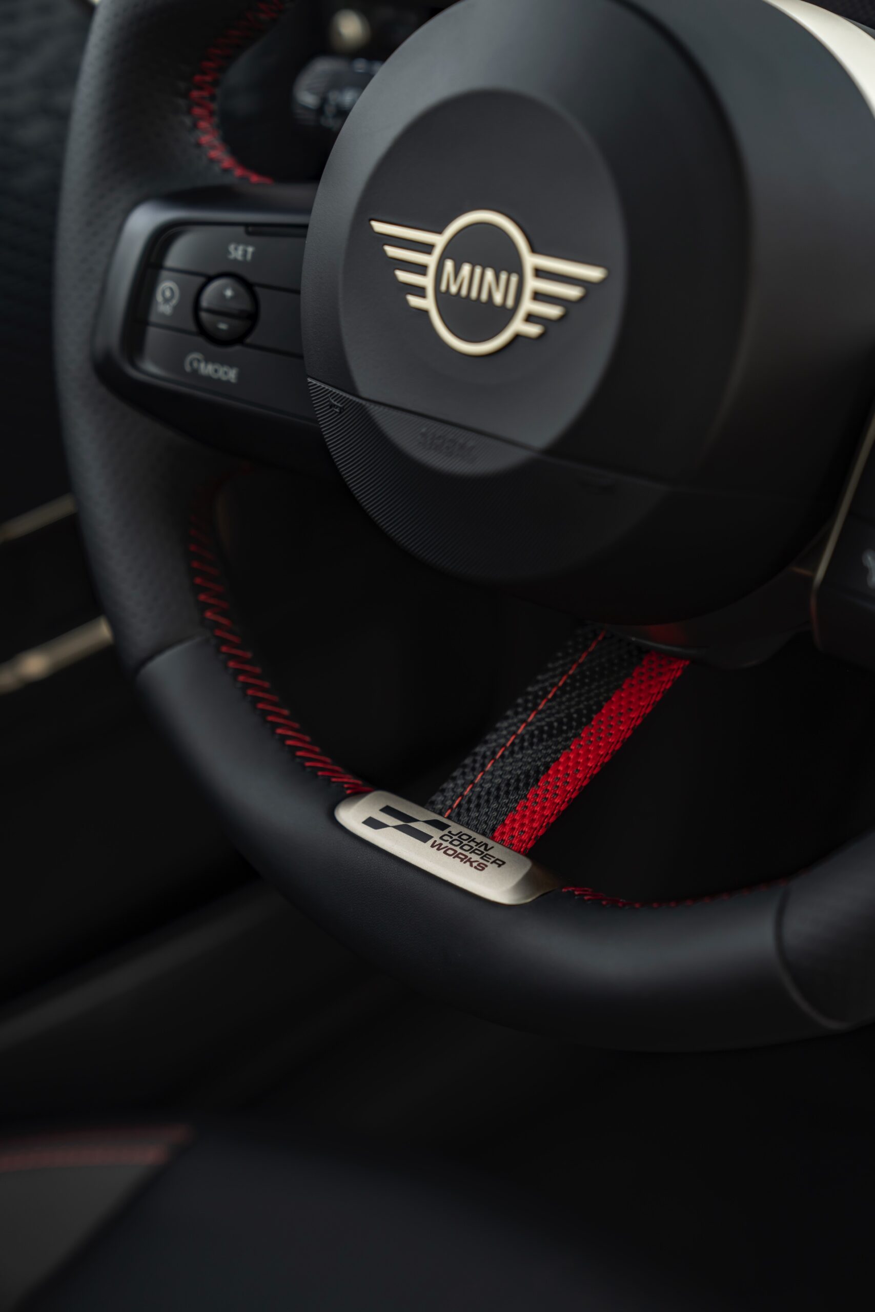 Schwarz und Rot dominieren auch den Innenraum, unter anderem ist vor dem Beifahrer ein gestricktes Chequered-Flag-Muster erhältlich. Abgesehen davon tragen natürlich auch die John Cooper Works-Modelle das große OLED Display mit 240 Millimeter Durchmesser, das wir bereits von den schwächeren Varianten kennen.