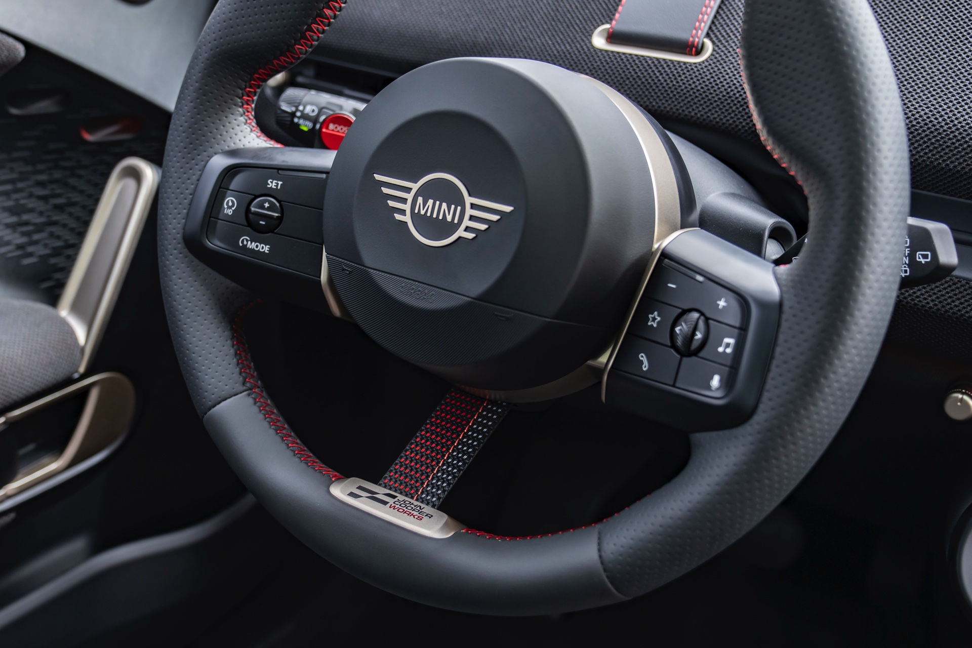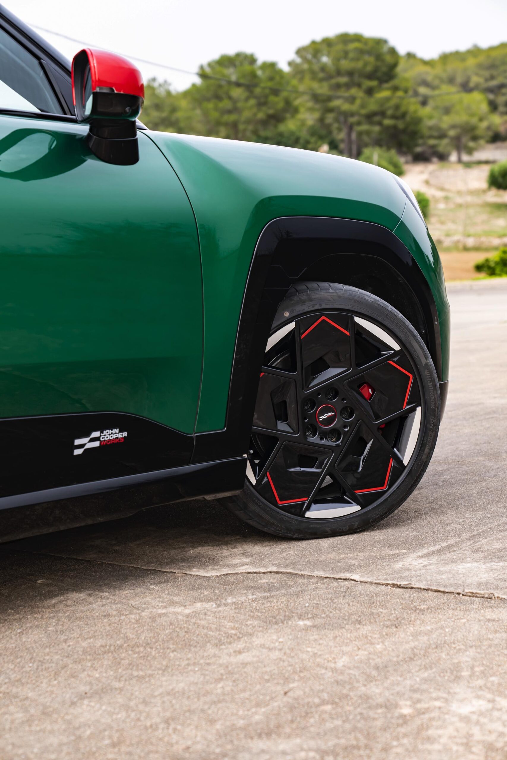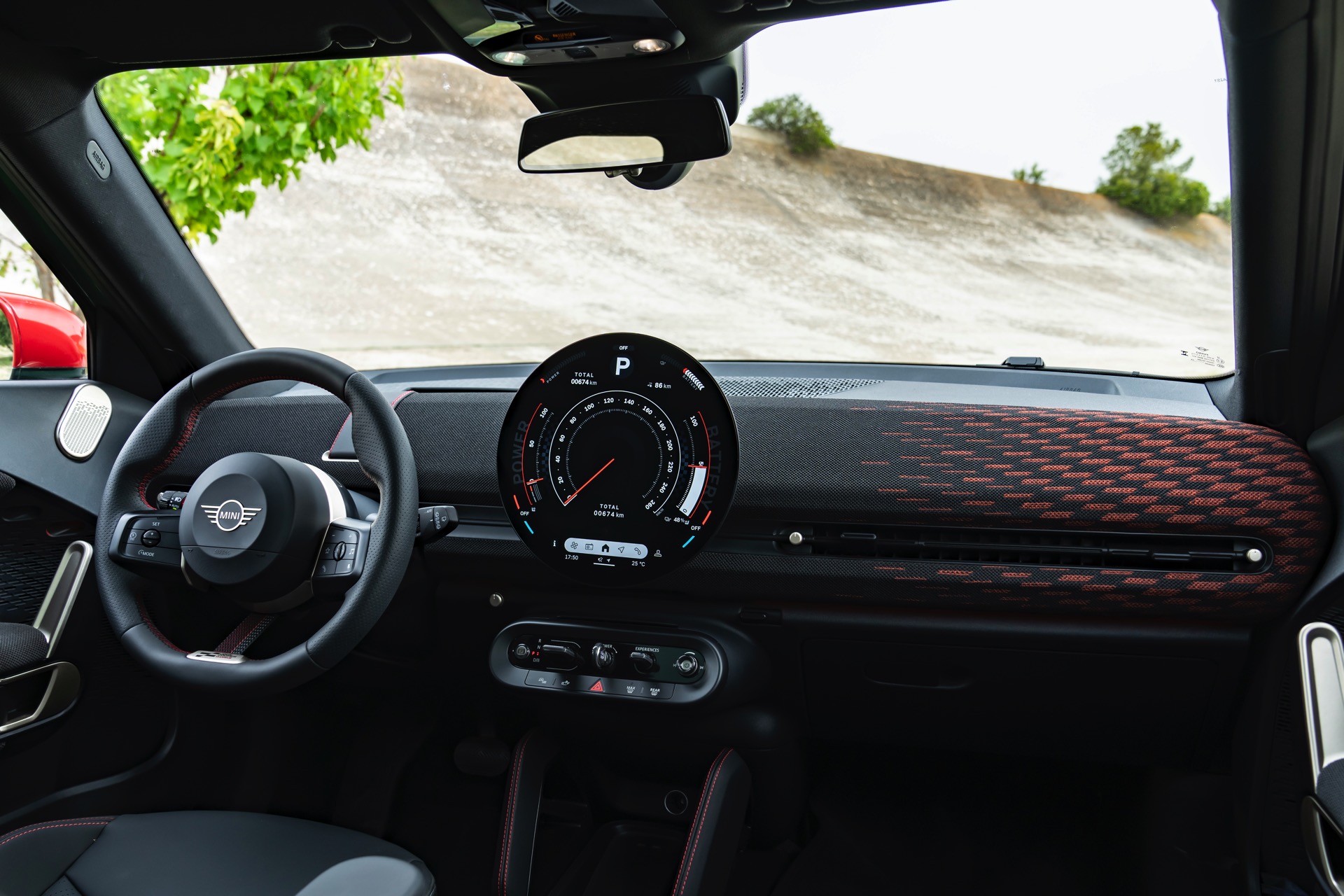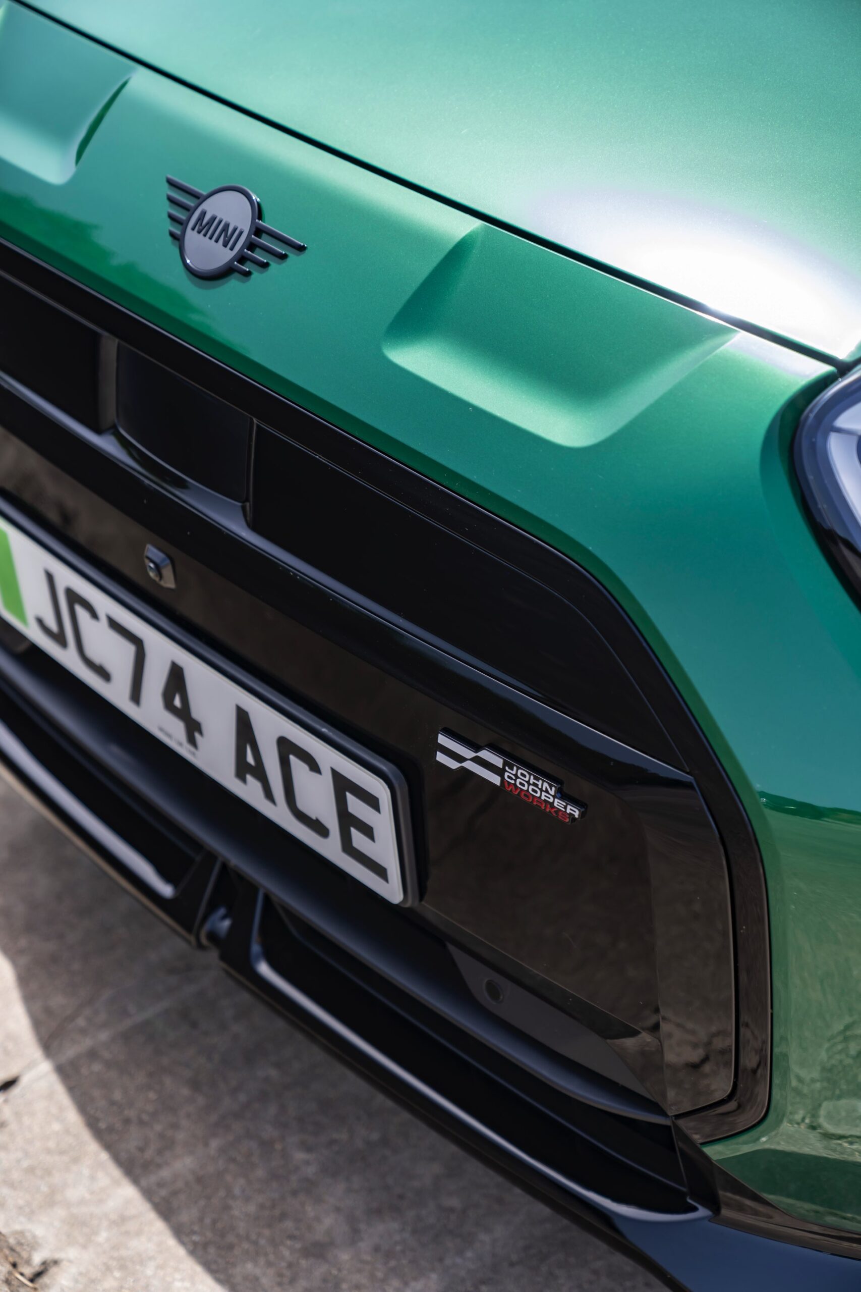 Neben der höheren Spitzenleistung bietet das neue Topmodell eine JCW-spezifische Fahrwerksabstimmung, eine leistungsfähigere Bremsanlage und High-Performance-Reifen. Aus optischer Sicht sind es vor allem die senkrechten roten Akzente unterhalb der Scheinwerfer, die den John Cooper Works von den schwächeren Varianten abgrenzen – Dach und Spiegelkappen gibt es im JCW-Trim schließlich auch unabhängig von der gewählten Motorisierung in leuchtendem Rot.