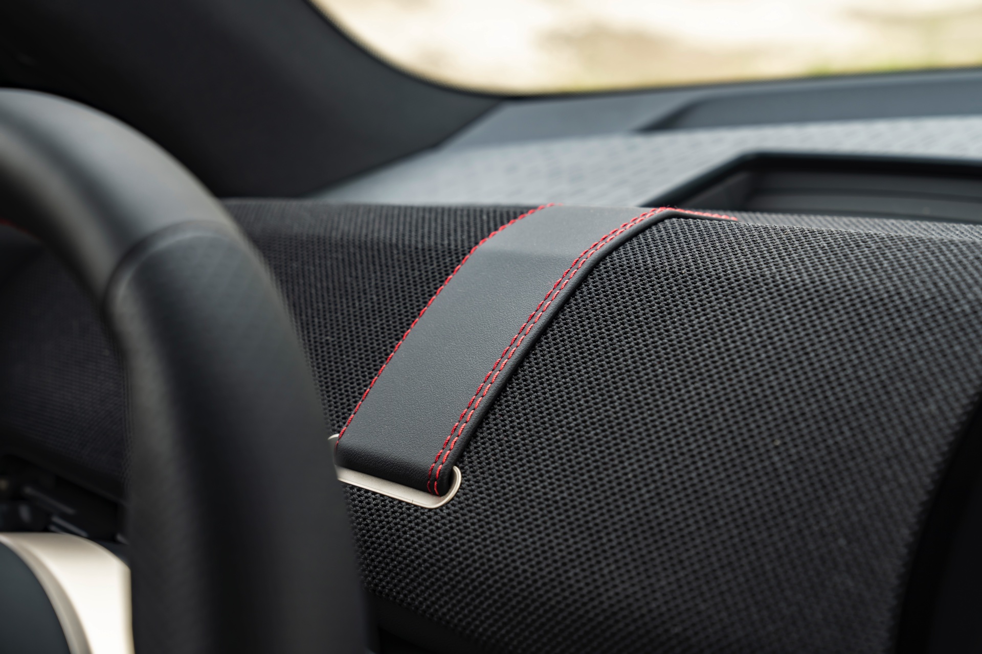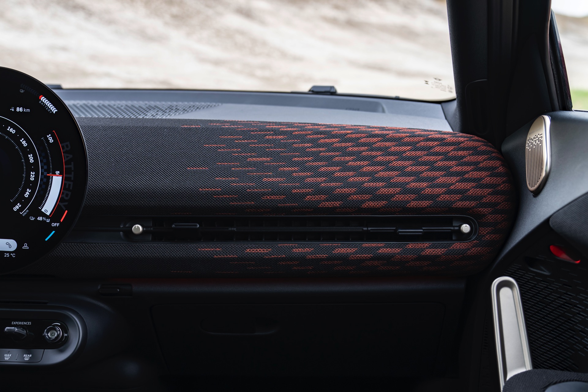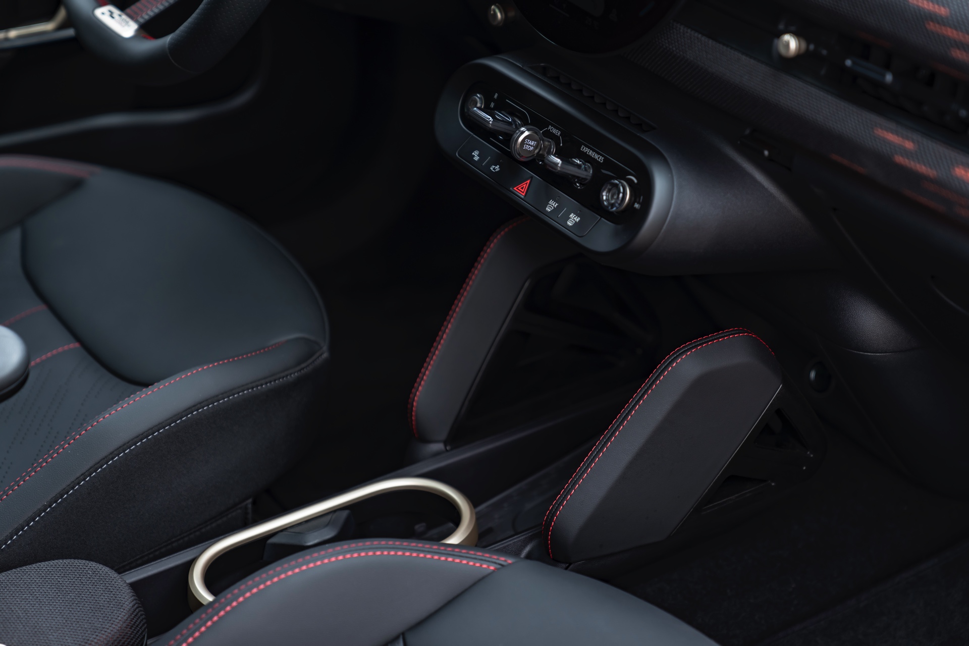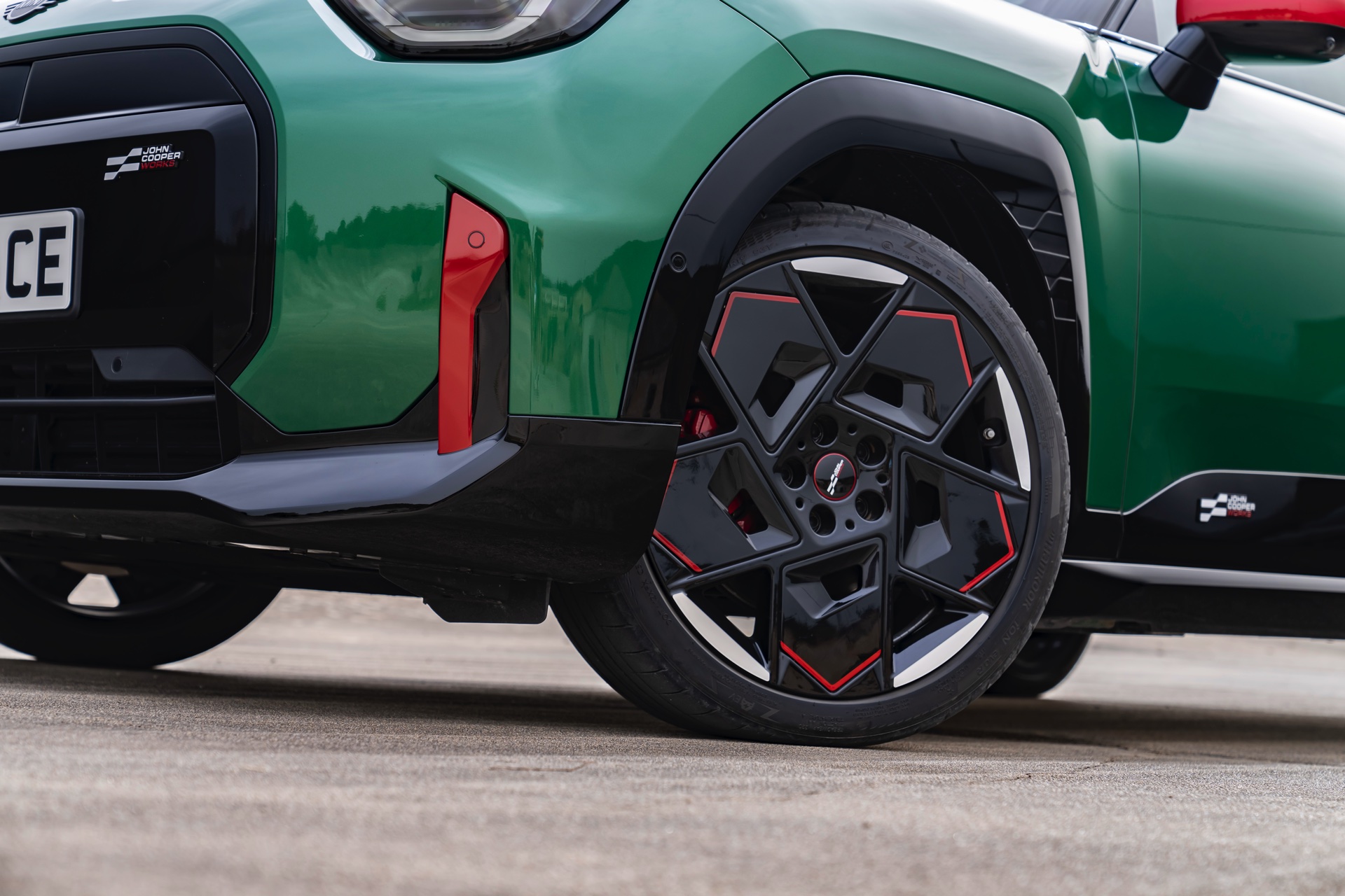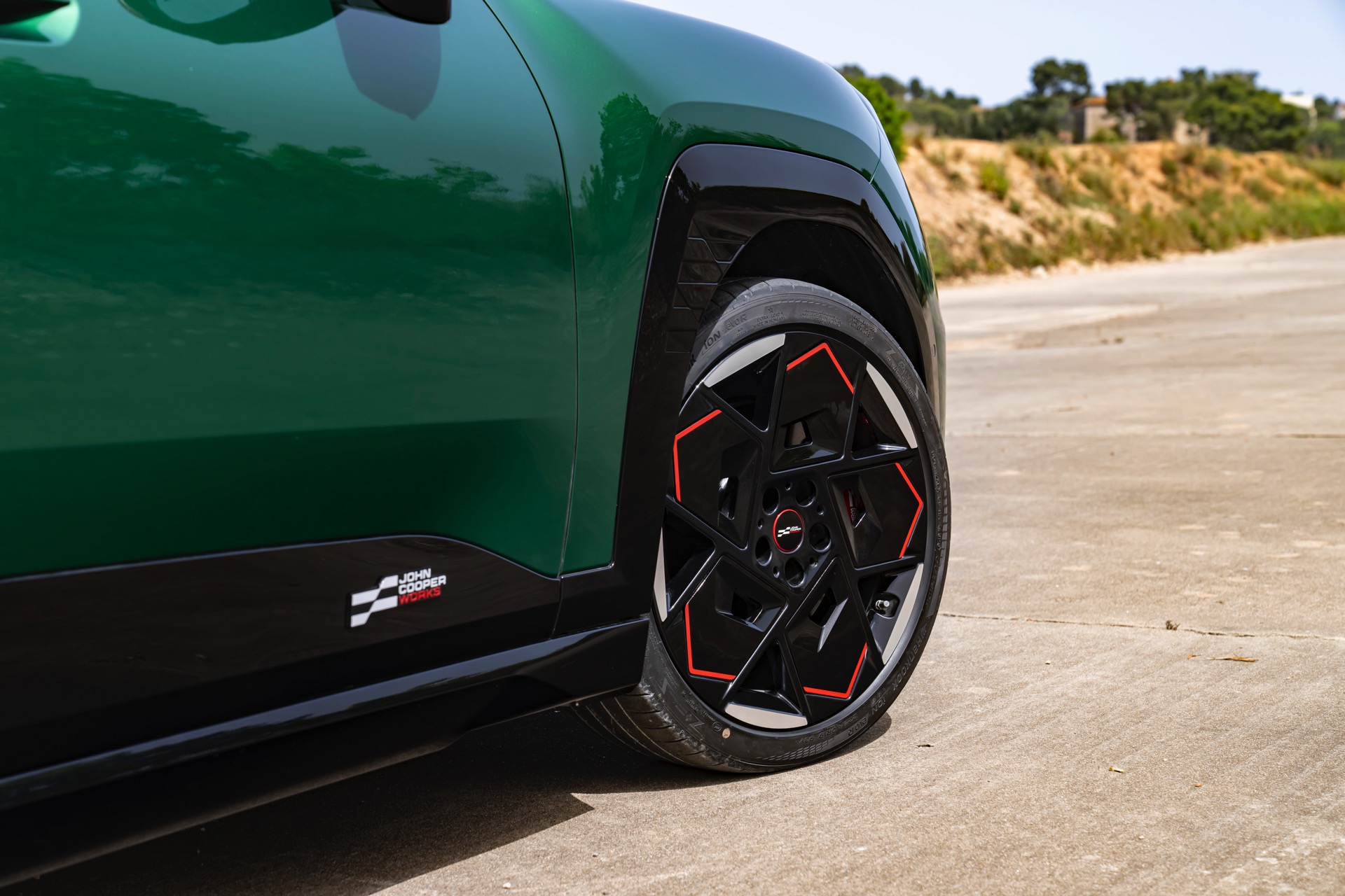 Neben der höheren Spitzenleistung bietet das neue Topmodell eine JCW-spezifische Fahrwerksabstimmung, eine leistungsfähigere Bremsanlage und High-Performance-Reifen. Aus optischer Sicht sind es vor allem die senkrechten roten Akzente unterhalb der Scheinwerfer, die den John Cooper Works von den schwächeren Varianten abgrenzen – Dach und Spiegelkappen gibt es im JCW-Trim schließlich auch unabhängig von der gewählten Motorisierung in leuchtendem Rot.