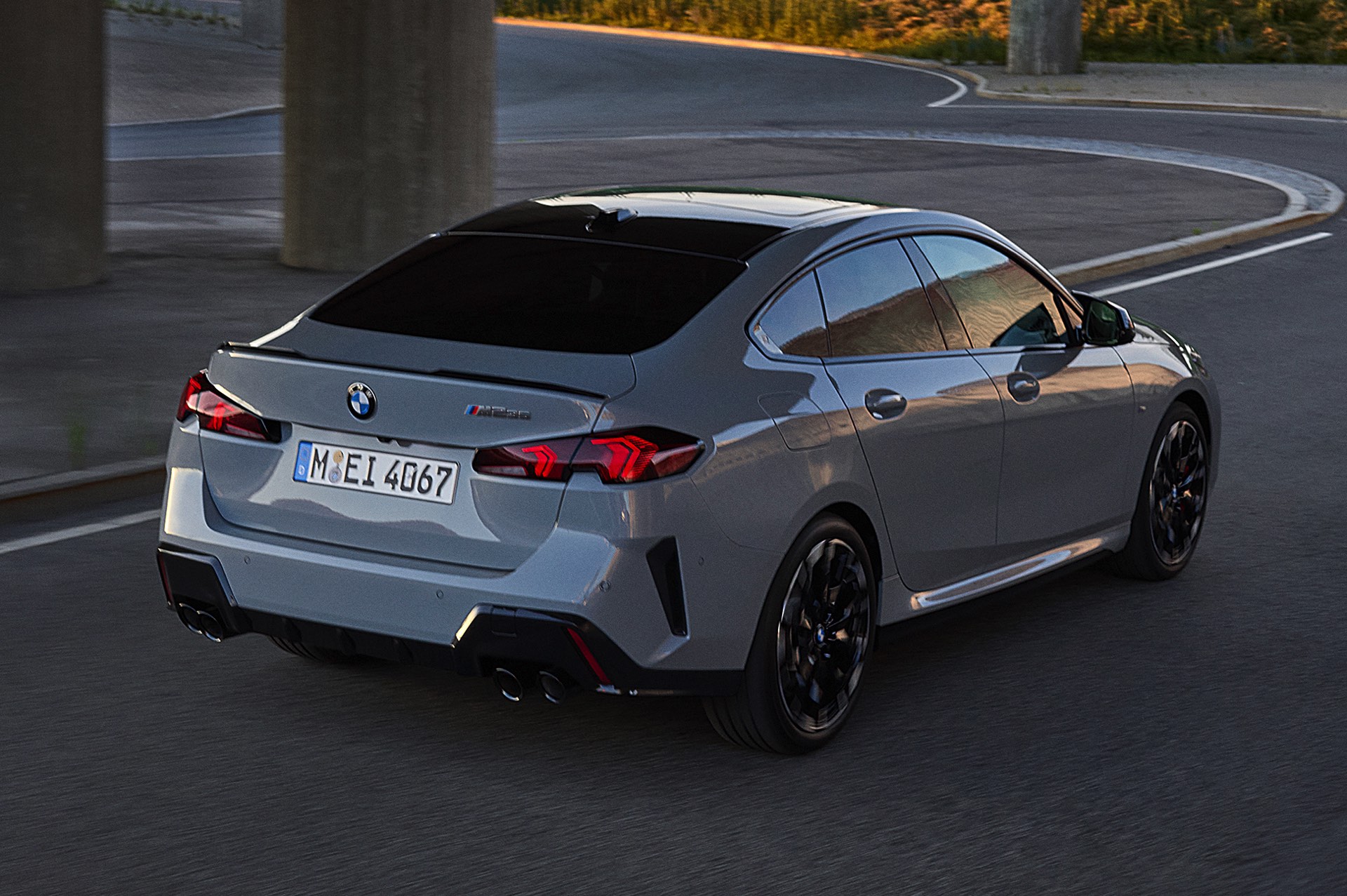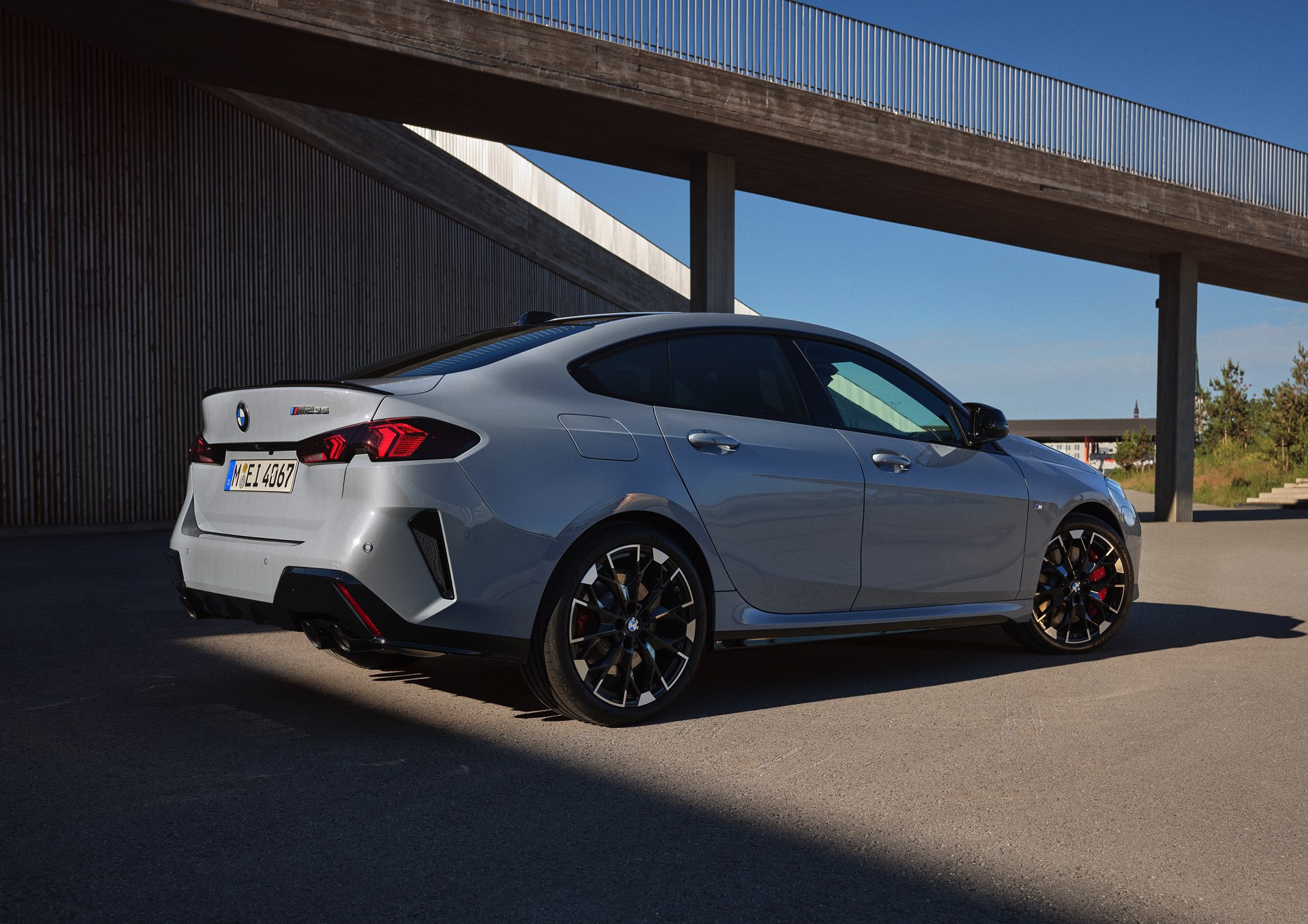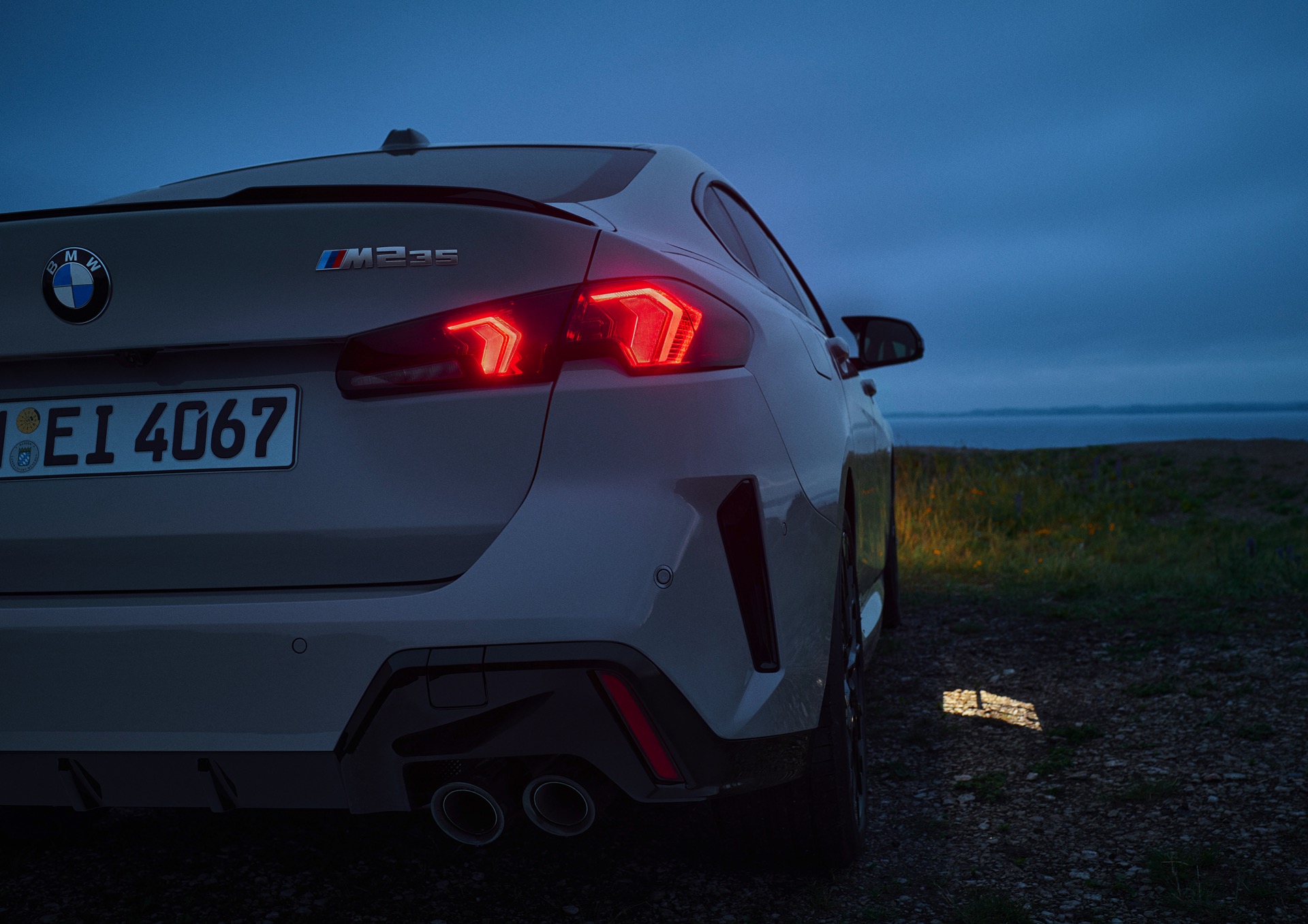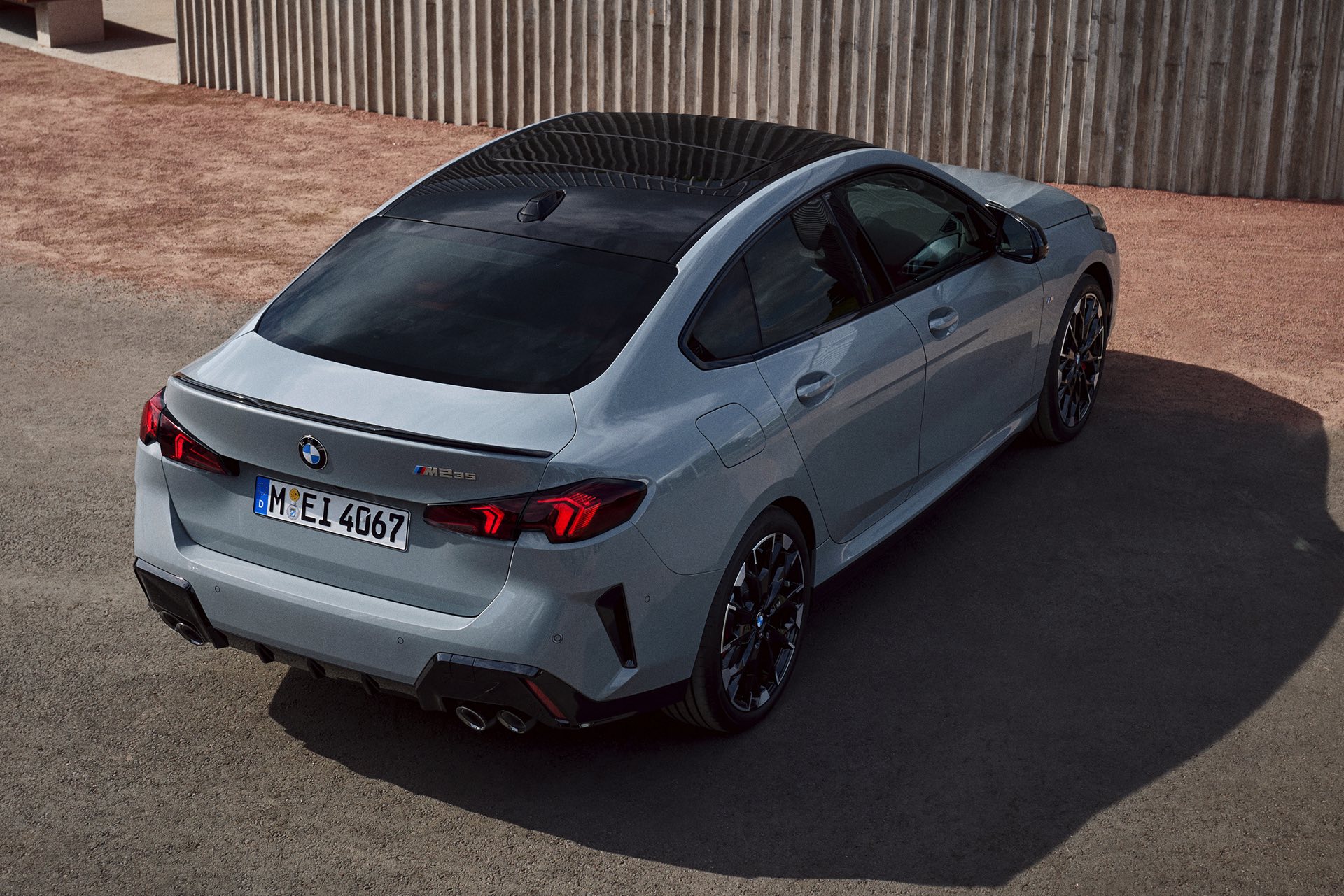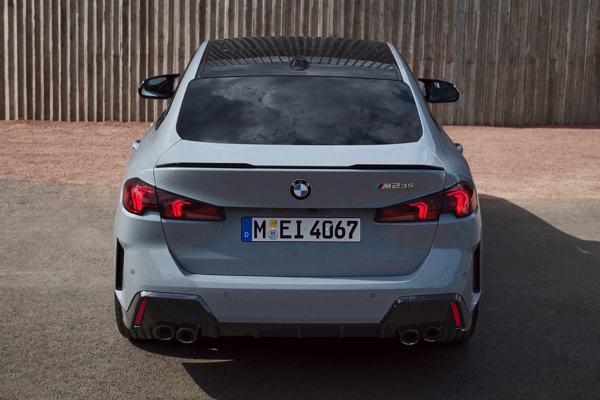 In den meisten Fällen verzichtet das 2er Gran Coupé künftig auf sichtbare Endrohre, nur das Topmodell M235 xDrive kommt mit gleich vier unübersehbaren Endrohren. Neben der exklusiven Abgasanlage trägt der M235 auch ein eigenständiges Nieren-Design mit horizontalen Streben, die schwächeren Varianten kommen mit der bisher nur von 1er und X3 bekannten Lösung mit einer Mischung aus senkrechten und diagonalen Stäben. Auch beim Antrieb geht der M235 einen Sonderweg, denn zum Marktstart im März 2025 wird er die einzige Allrad-Option sein – alle übrigen Varianten treiben ausschließlich die Vorderräder an.