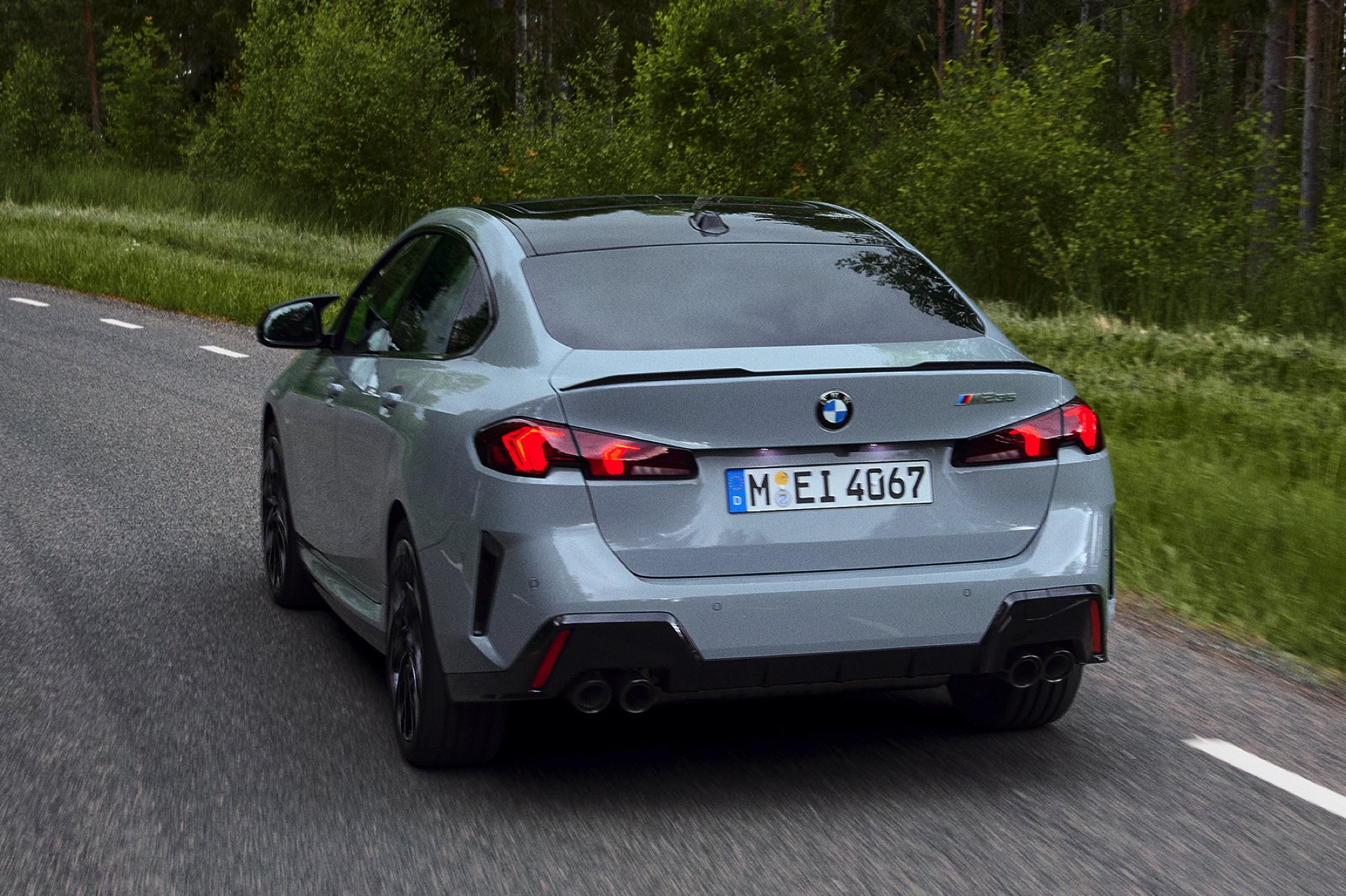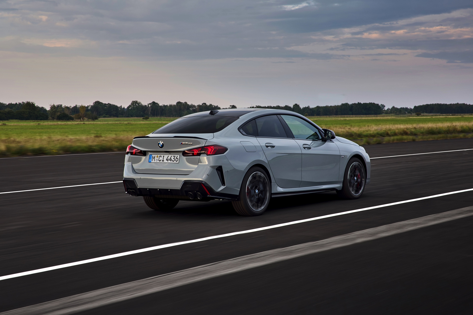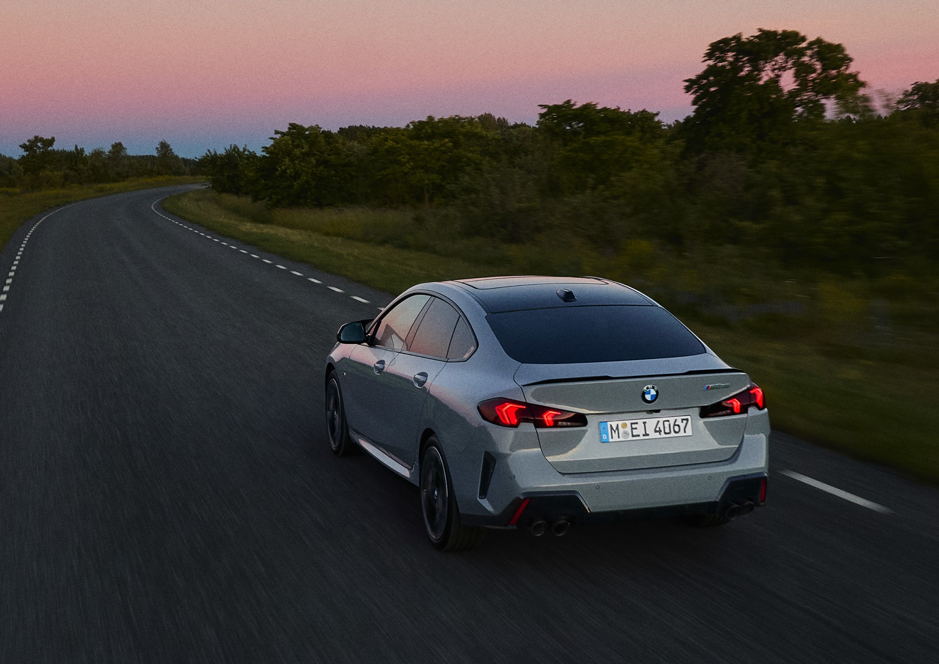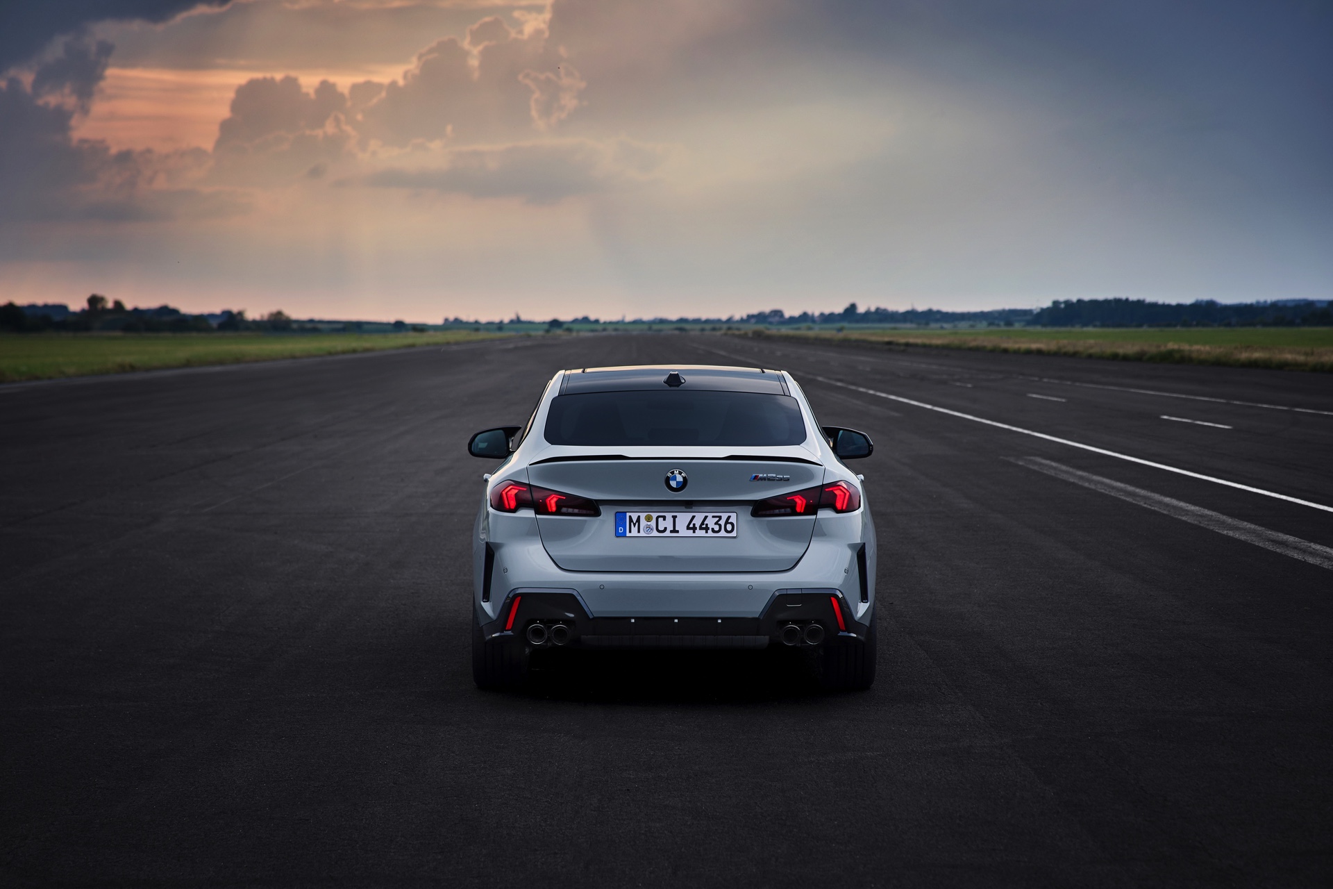 In den meisten Fällen verzichtet das 2er Gran Coupé künftig auf sichtbare Endrohre, nur das Topmodell M235 xDrive kommt mit gleich vier unübersehbaren Endrohren. Neben der exklusiven Abgasanlage trägt der M235 auch ein eigenständiges Nieren-Design mit horizontalen Streben, die schwächeren Varianten kommen mit der bisher nur von 1er und X3 bekannten Lösung mit einer Mischung aus senkrechten und diagonalen Stäben. Auch beim Antrieb geht der M235 einen Sonderweg, denn zum Marktstart im März 2025 wird er die einzige Allrad-Option sein – alle übrigen Varianten treiben ausschließlich die Vorderräder an.