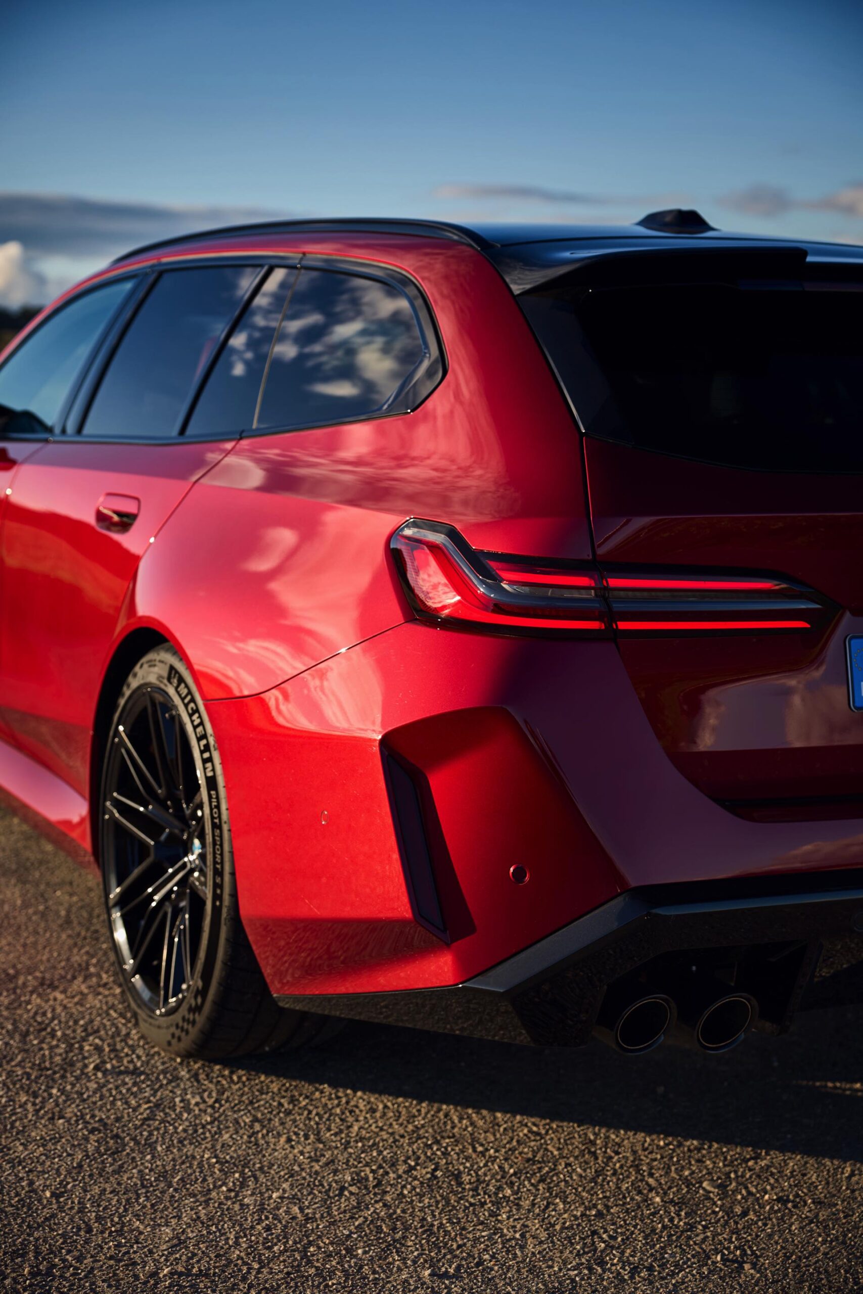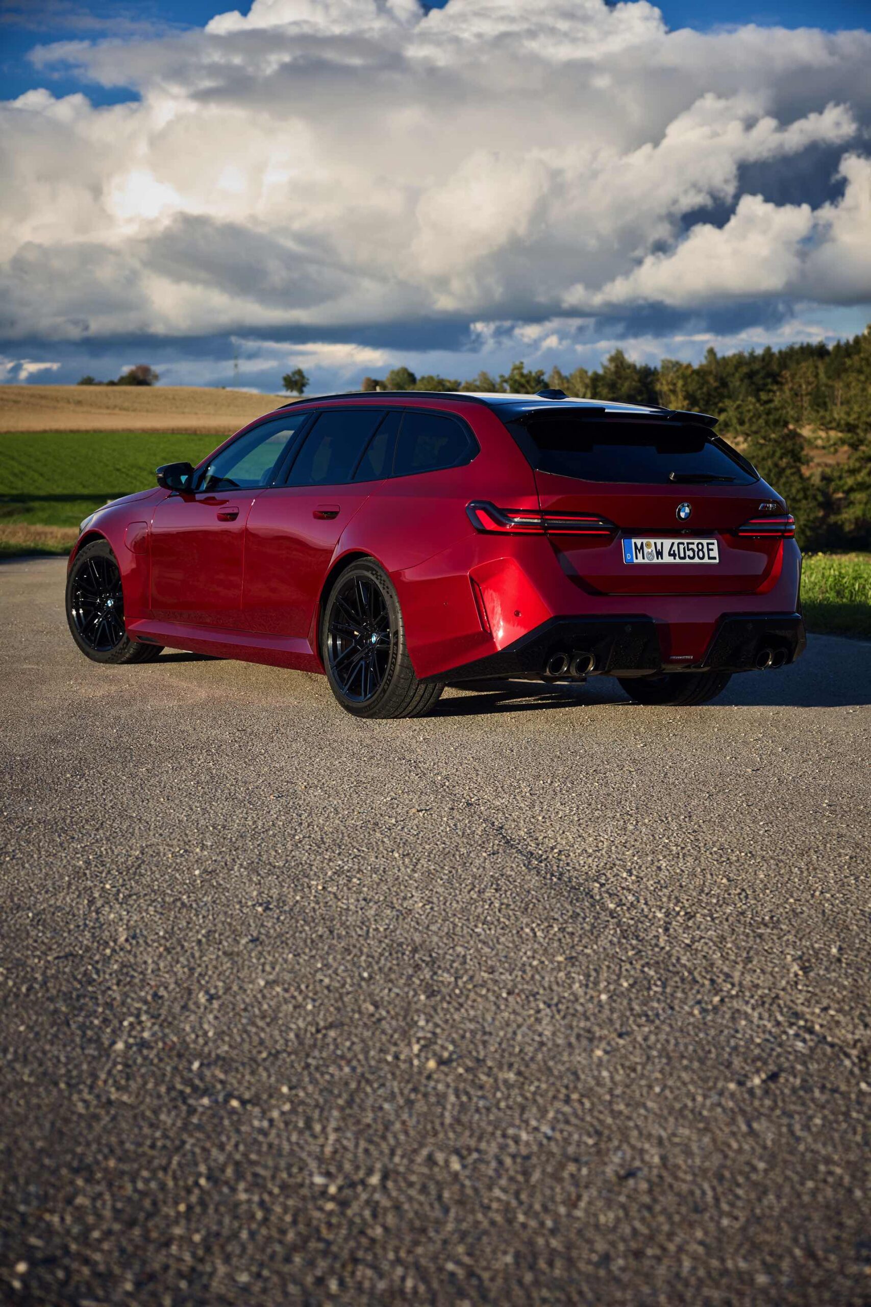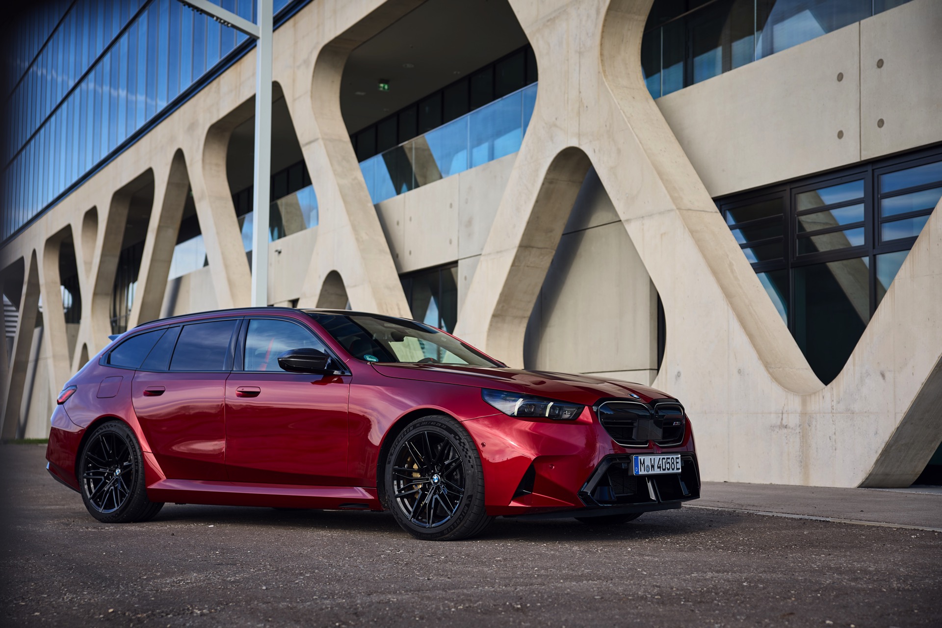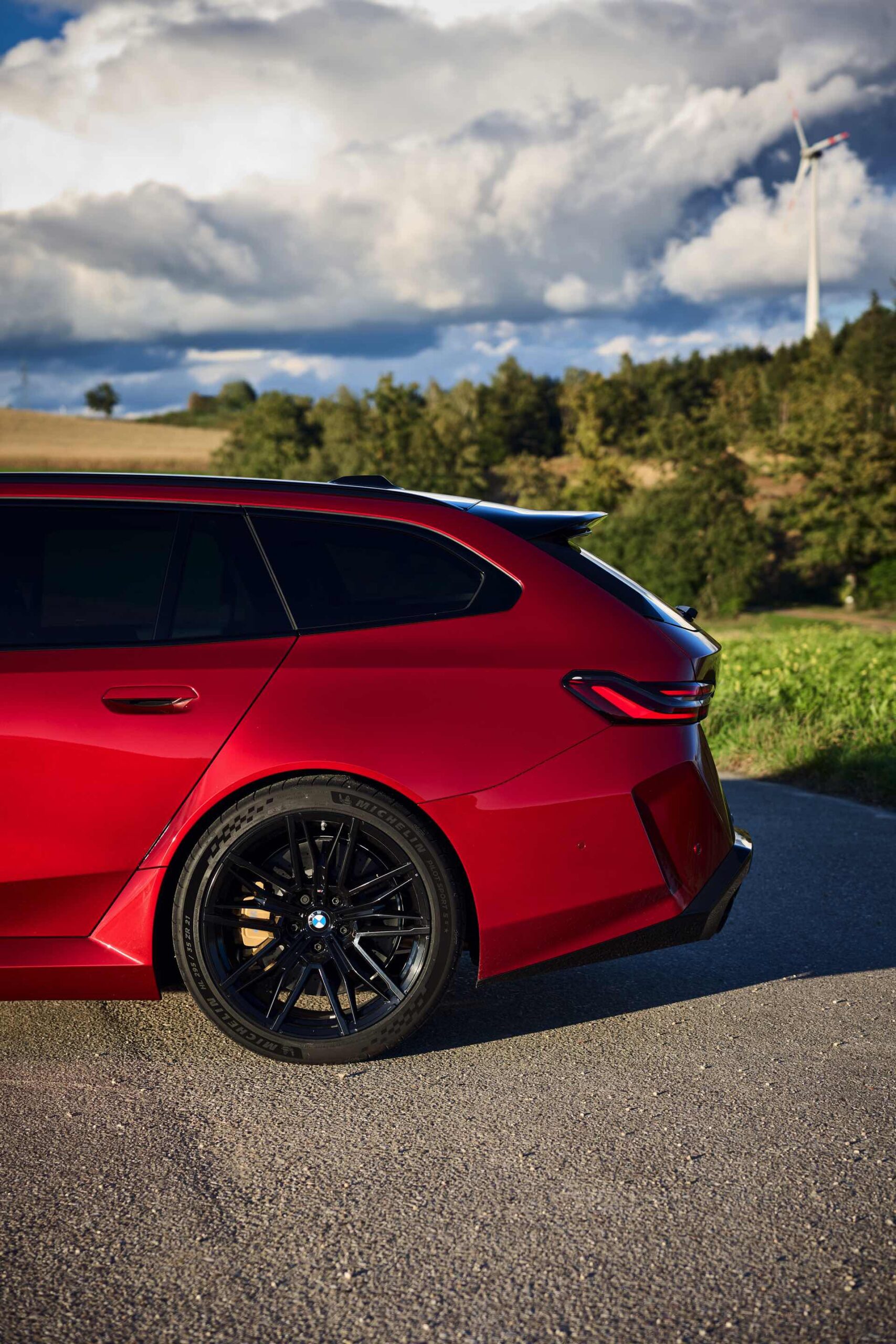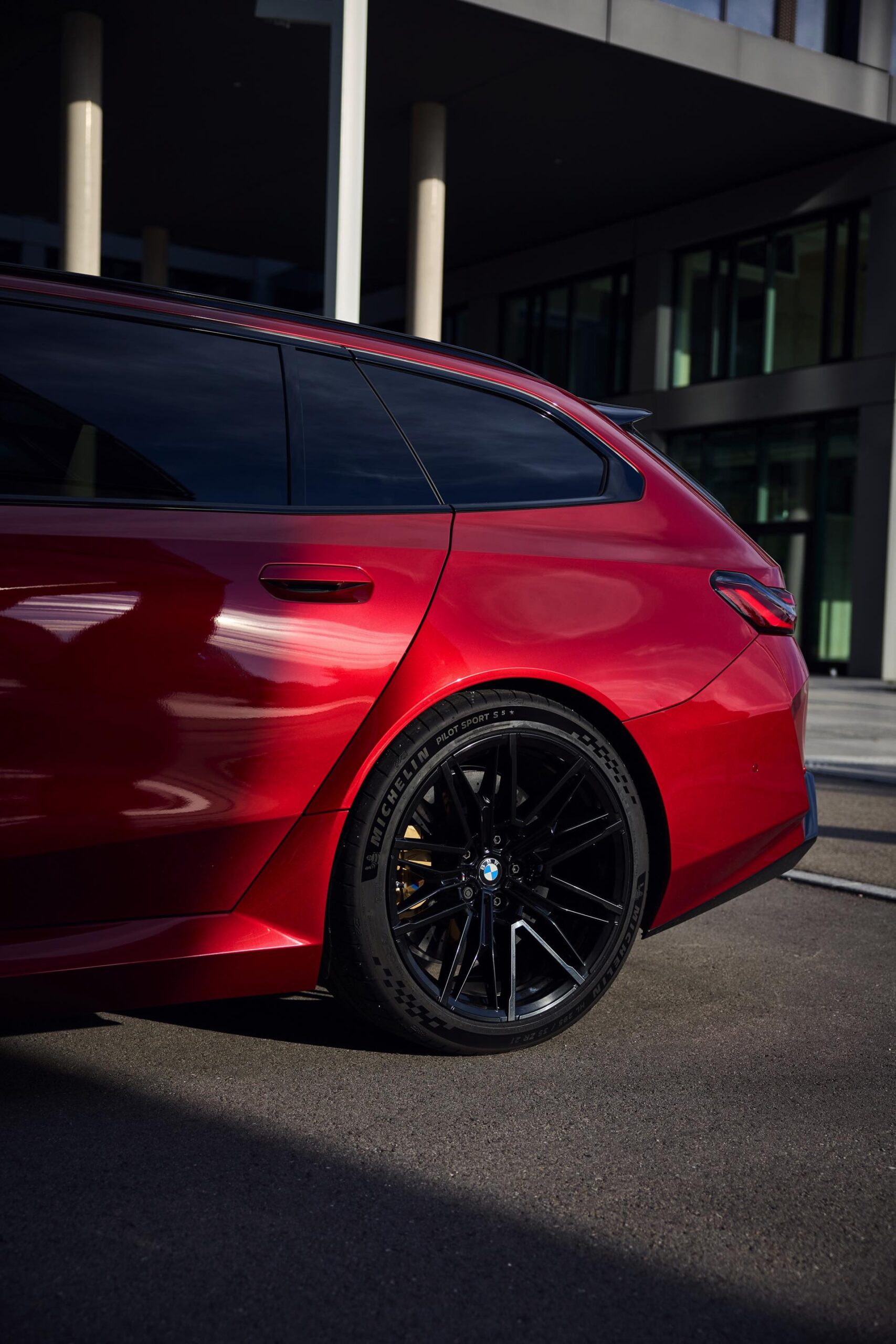 Im Vergleich zum gewöhnlichen BMW 5er Touring (G61) bietet der M5 Fire Red noch mehr Platz zur Entfaltung: Die vorne wie hinten deutlich verbreiterten Kotflügel lassen den Über-Kombi aus Garching noch stämmiger auftreten, außerdem sorgen viele schwarze Elemente für einen sehenswerten Kontrast zur leuchtenden Lackierung. Der hier gezeigte M5 setzt ganz auf Rot und Schwarz, denn er trägt auch die schwarze Variante der vorne 20 und hinten 21 Zoll großen Felgen im Design Doppelspeiche 951 M.