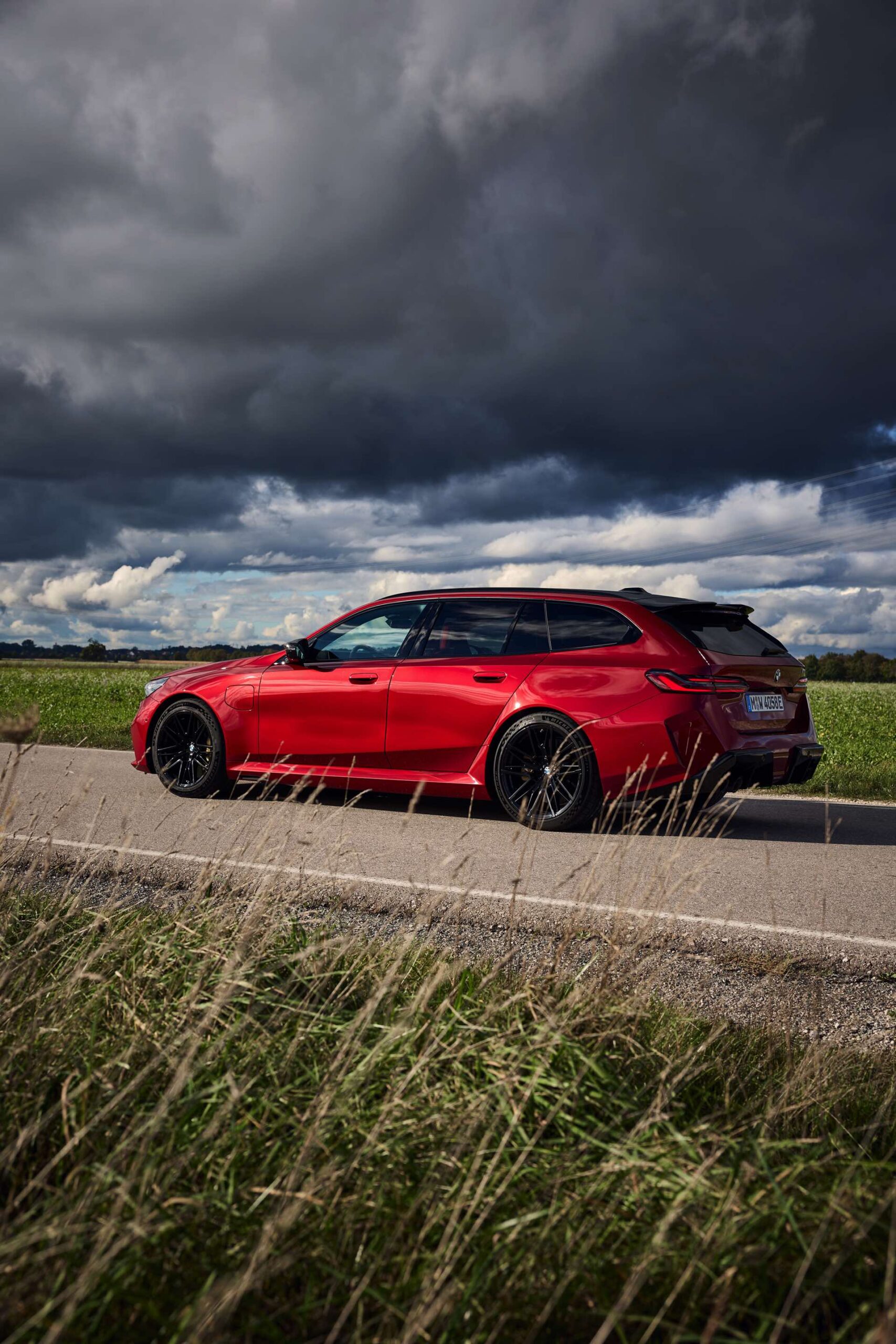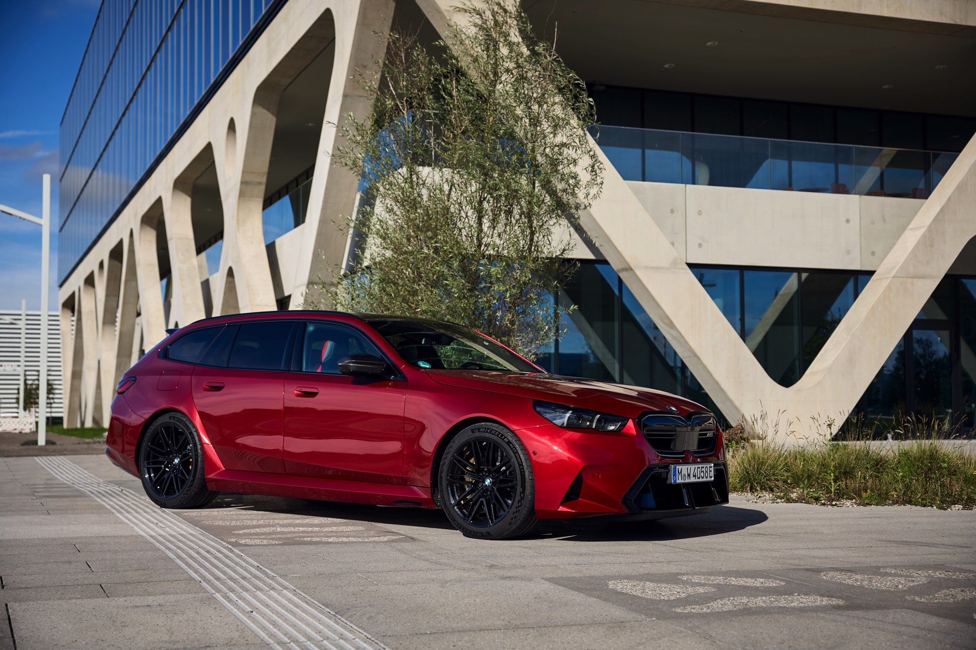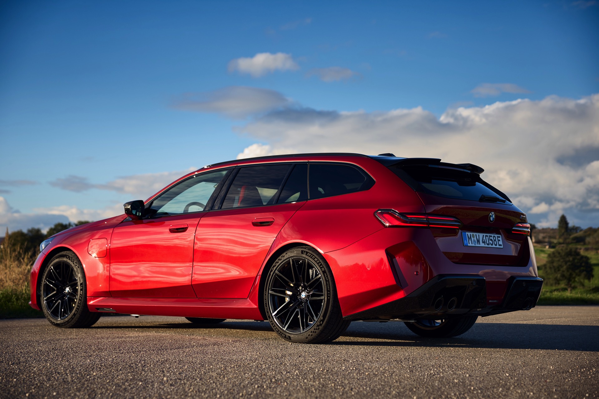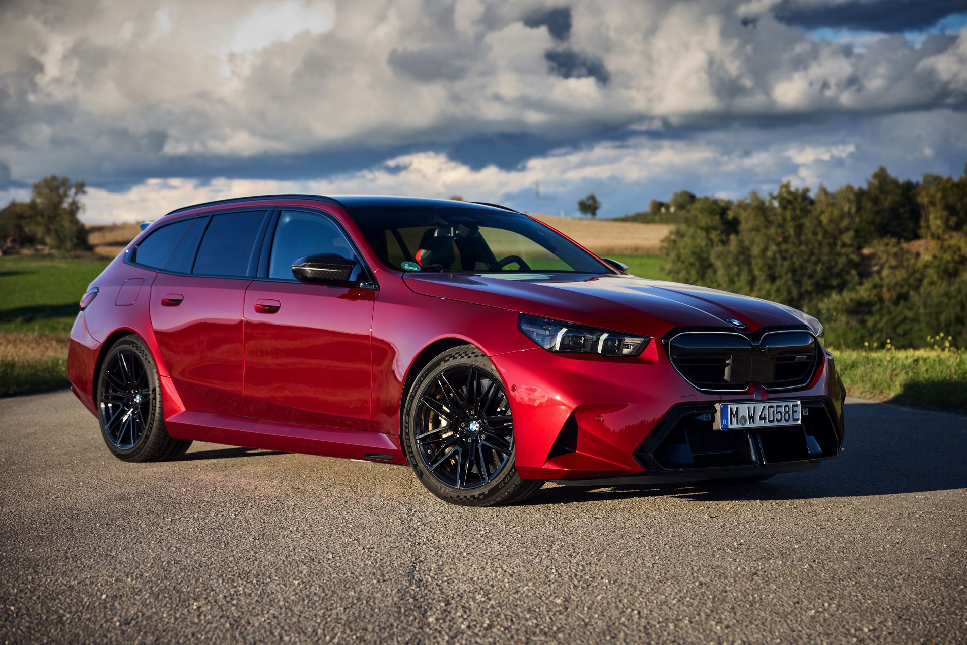 Im Vergleich zum gewöhnlichen BMW 5er Touring (G61) bietet der M5 Fire Red noch mehr Platz zur Entfaltung: Die vorne wie hinten deutlich verbreiterten Kotflügel lassen den Über-Kombi aus Garching noch stämmiger auftreten, außerdem sorgen viele schwarze Elemente für einen sehenswerten Kontrast zur leuchtenden Lackierung. Der hier gezeigte M5 setzt ganz auf Rot und Schwarz, denn er trägt auch die schwarze Variante der vorne 20 und hinten 21 Zoll großen Felgen im Design Doppelspeiche 951 M.