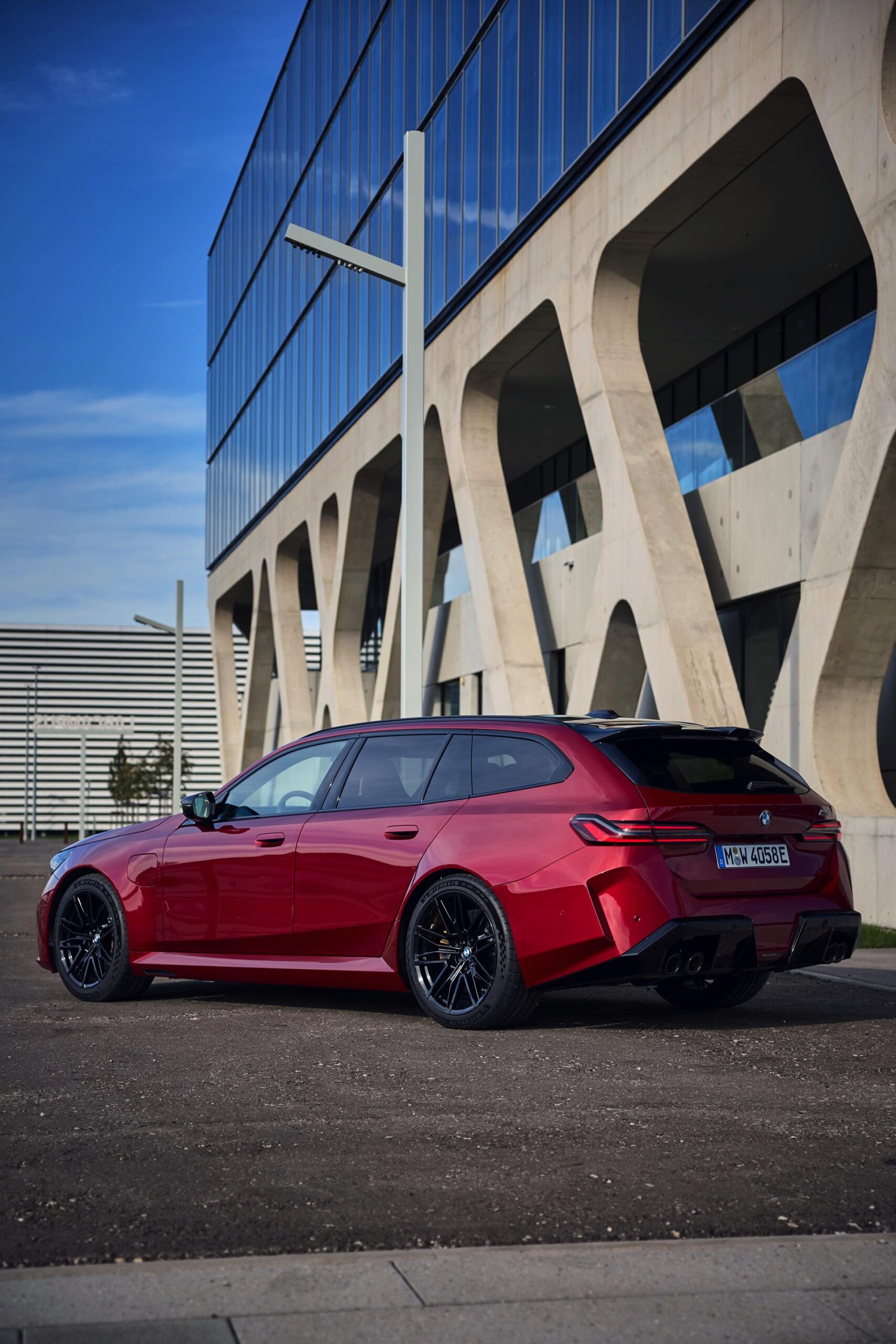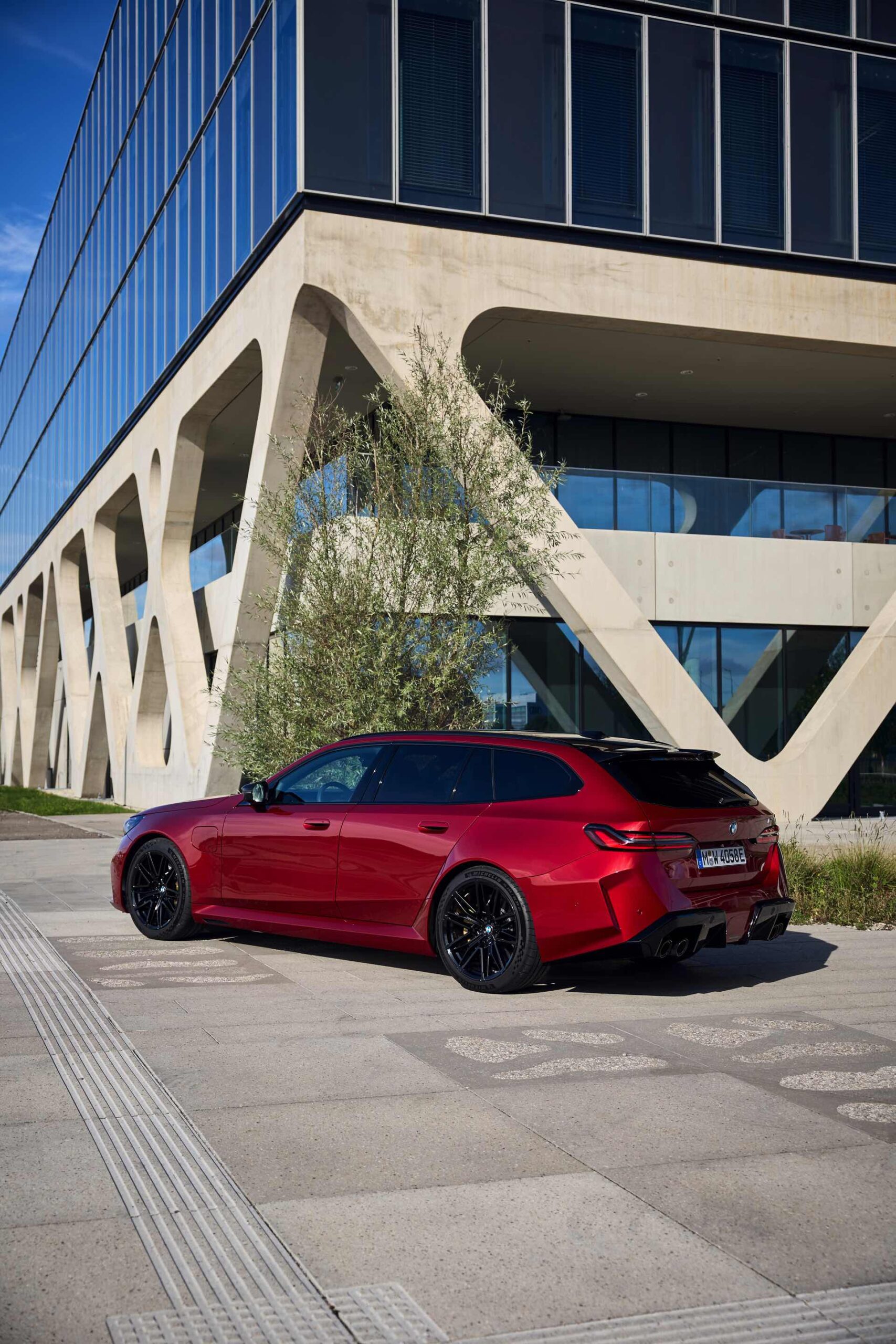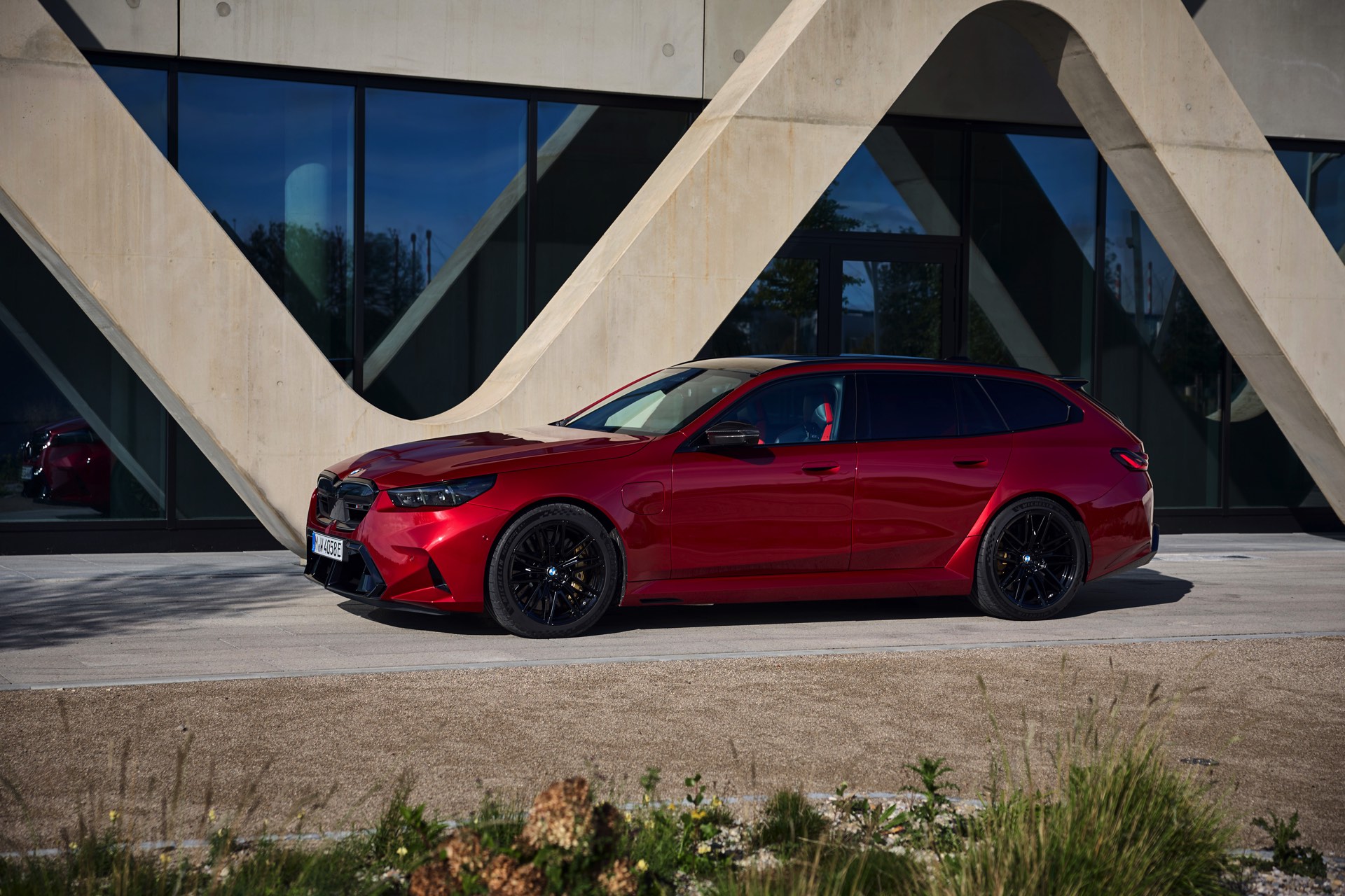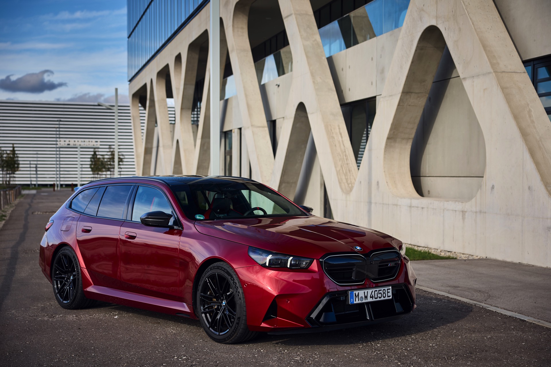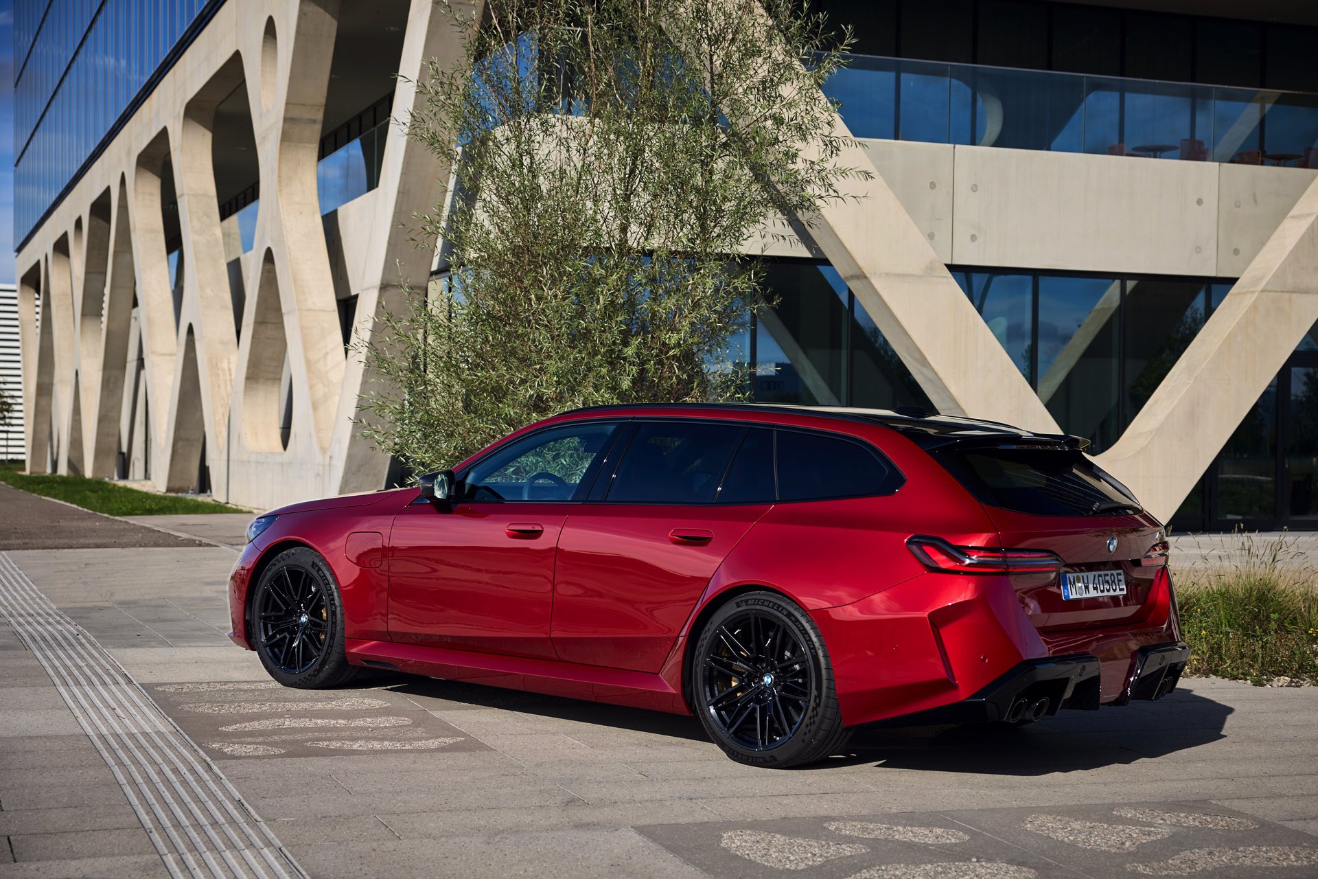 Im Vergleich zum gewöhnlichen BMW 5er Touring (G61) bietet der M5 Fire Red noch mehr Platz zur Entfaltung: Die vorne wie hinten deutlich verbreiterten Kotflügel lassen den Über-Kombi aus Garching noch stämmiger auftreten, außerdem sorgen viele schwarze Elemente für einen sehenswerten Kontrast zur leuchtenden Lackierung. Der hier gezeigte M5 setzt ganz auf Rot und Schwarz, denn er trägt auch die schwarze Variante der vorne 20 und hinten 21 Zoll großen Felgen im Design Doppelspeiche 951 M.