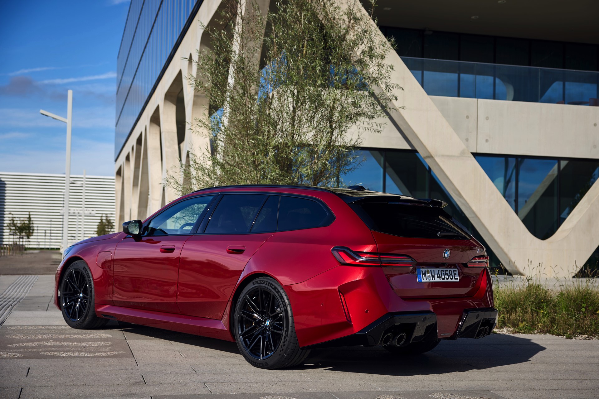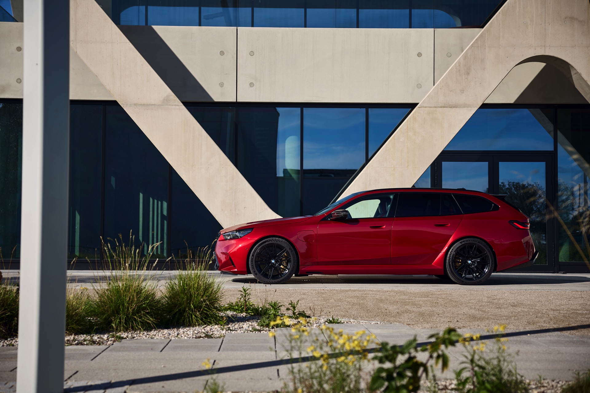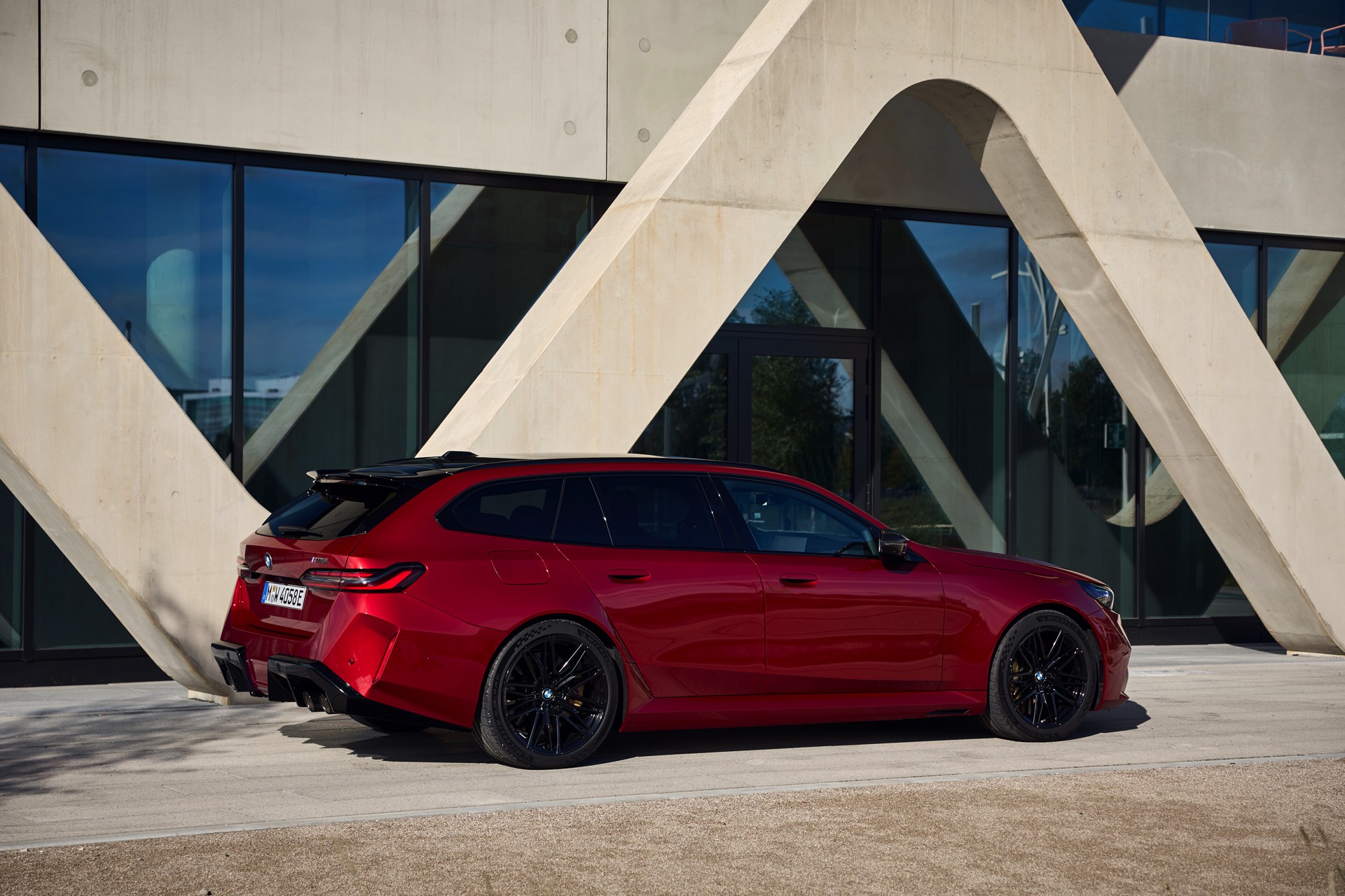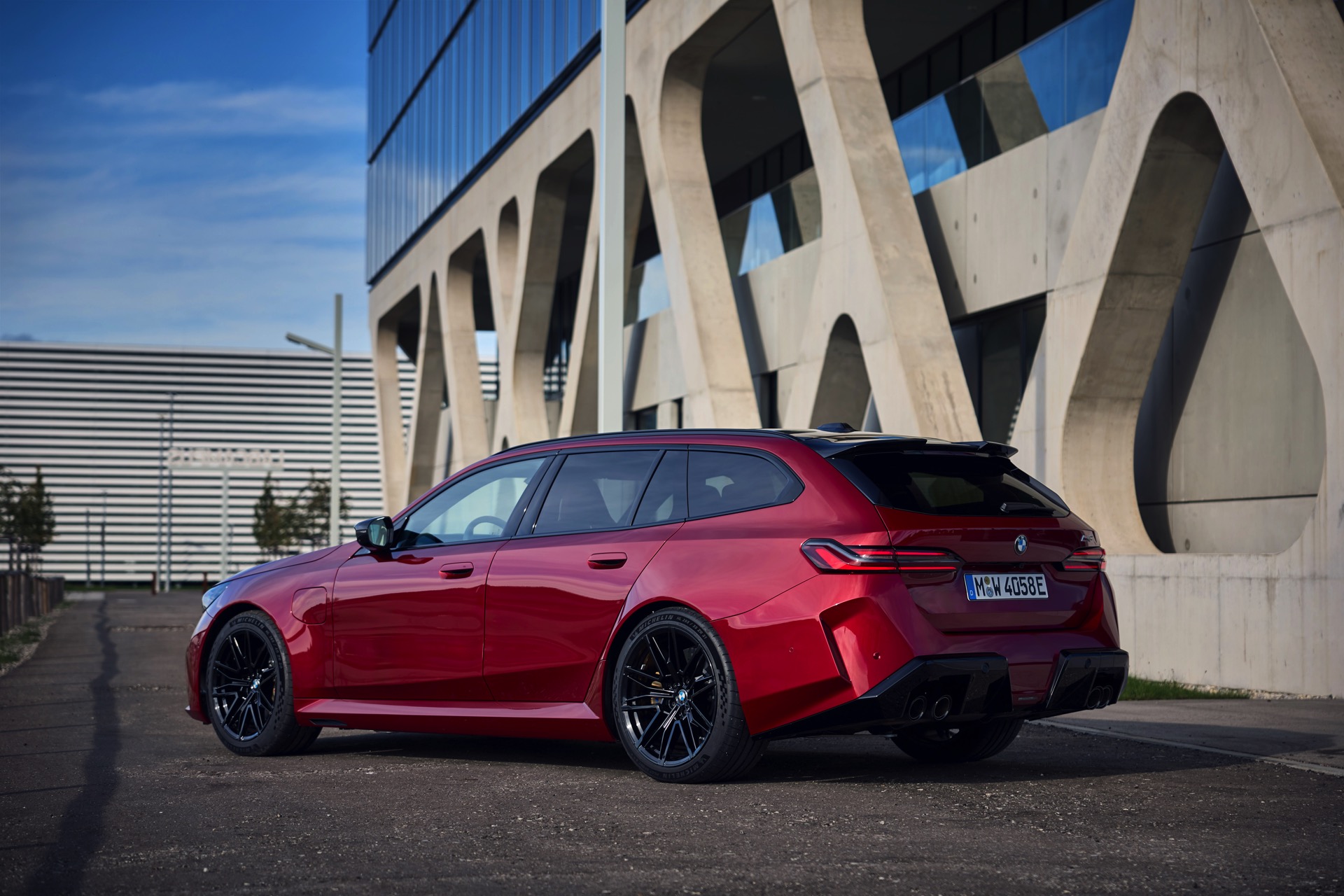 Im Vergleich zum gewöhnlichen BMW 5er Touring (G61) bietet der M5 Fire Red noch mehr Platz zur Entfaltung: Die vorne wie hinten deutlich verbreiterten Kotflügel lassen den Über-Kombi aus Garching noch stämmiger auftreten, außerdem sorgen viele schwarze Elemente für einen sehenswerten Kontrast zur leuchtenden Lackierung. Der hier gezeigte M5 setzt ganz auf Rot und Schwarz, denn er trägt auch die schwarze Variante der vorne 20 und hinten 21 Zoll großen Felgen im Design Doppelspeiche 951 M.