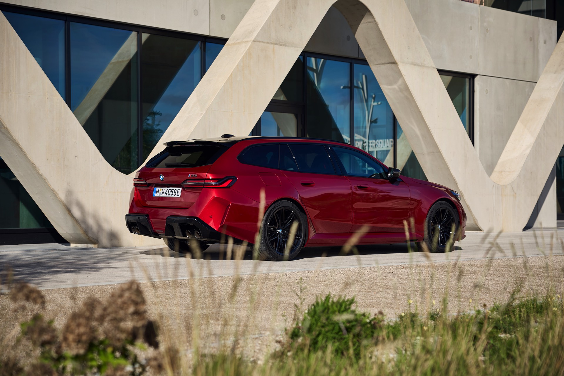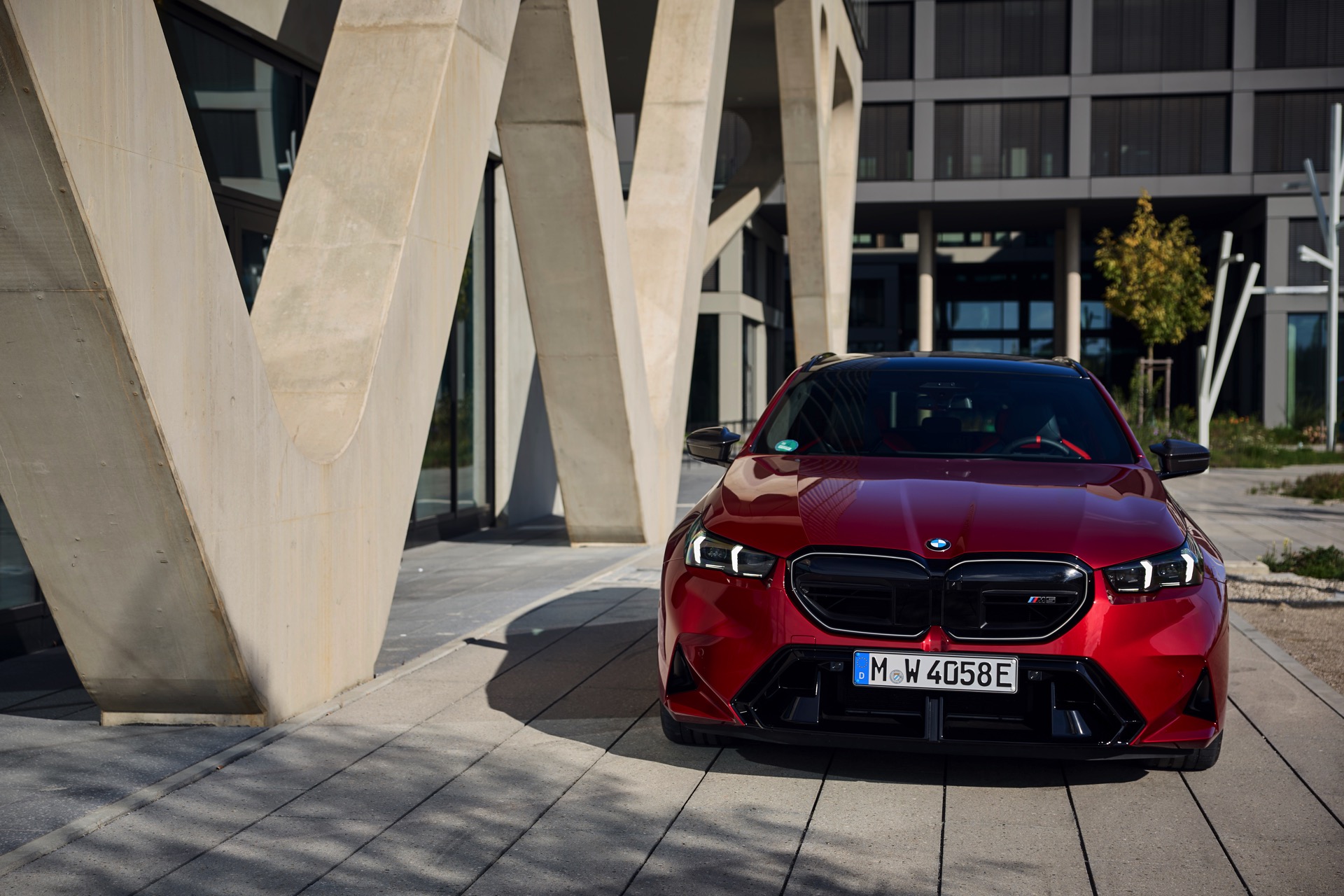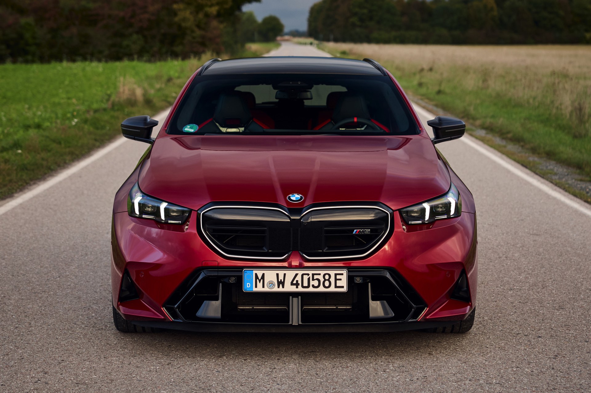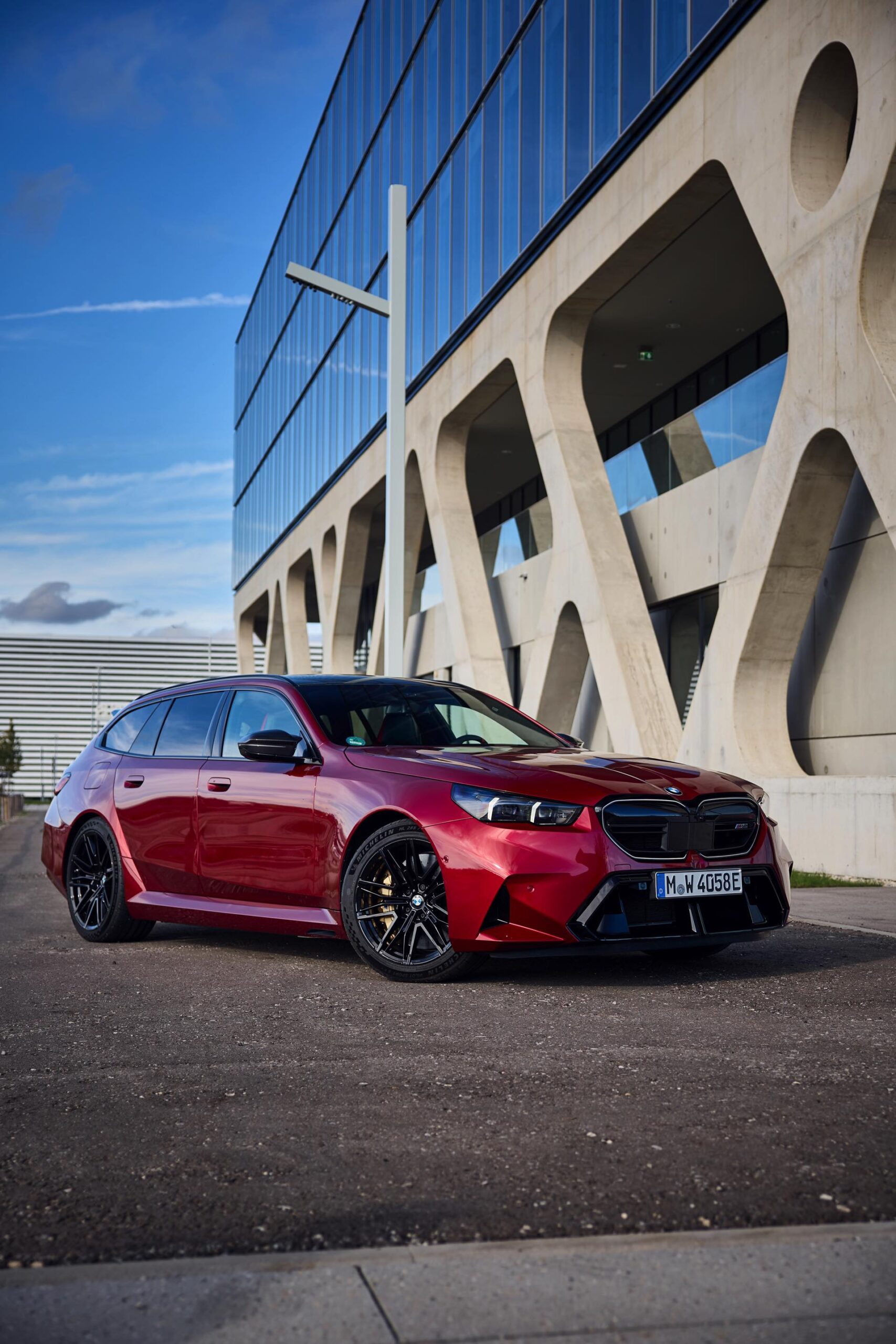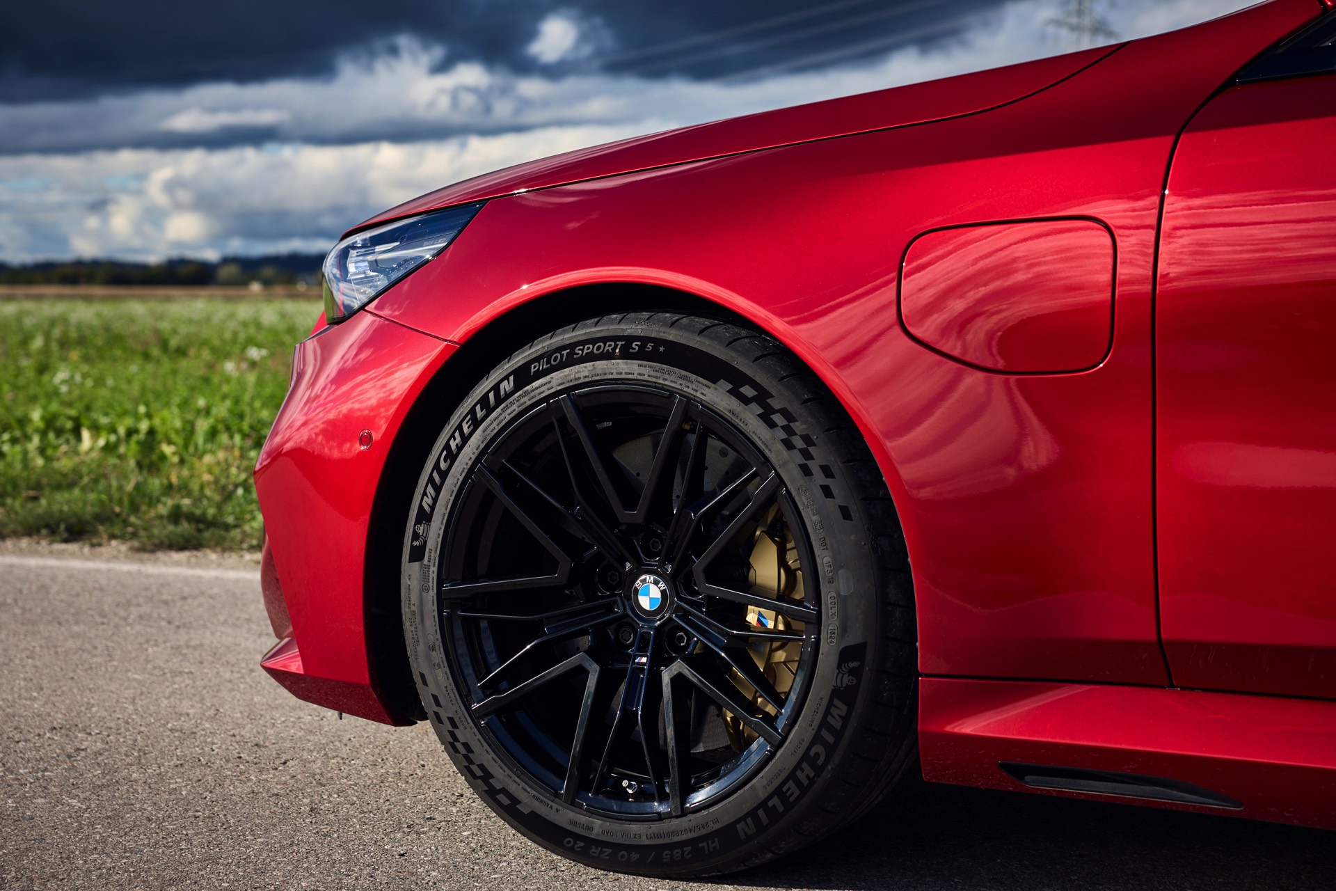 Im Vergleich zum gewöhnlichen BMW 5er Touring (G61) bietet der M5 Fire Red noch mehr Platz zur Entfaltung: Die vorne wie hinten deutlich verbreiterten Kotflügel lassen den Über-Kombi aus Garching noch stämmiger auftreten, außerdem sorgen viele schwarze Elemente für einen sehenswerten Kontrast zur leuchtenden Lackierung. Der hier gezeigte M5 setzt ganz auf Rot und Schwarz, denn er trägt auch die schwarze Variante der vorne 20 und hinten 21 Zoll großen Felgen im Design Doppelspeiche 951 M.