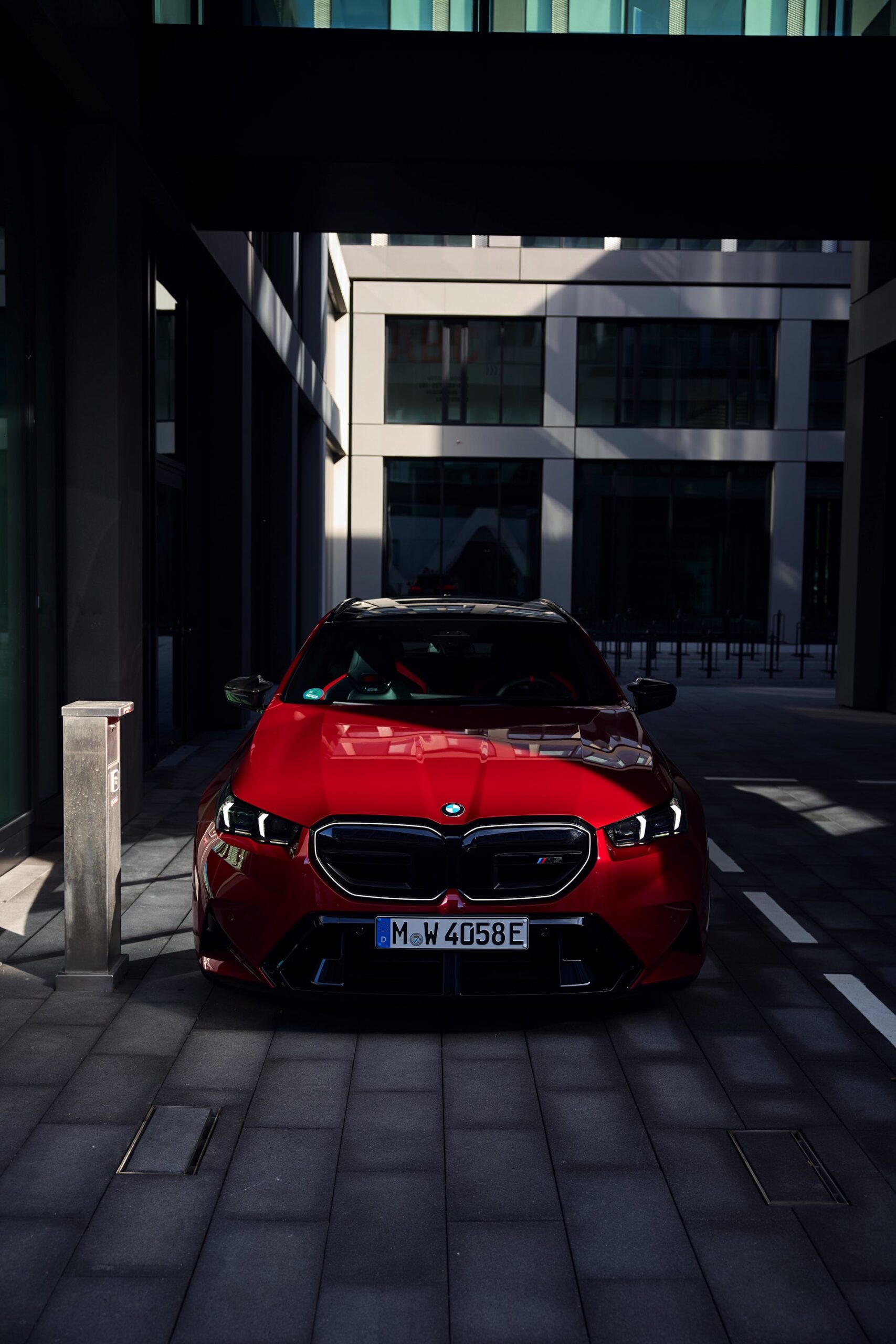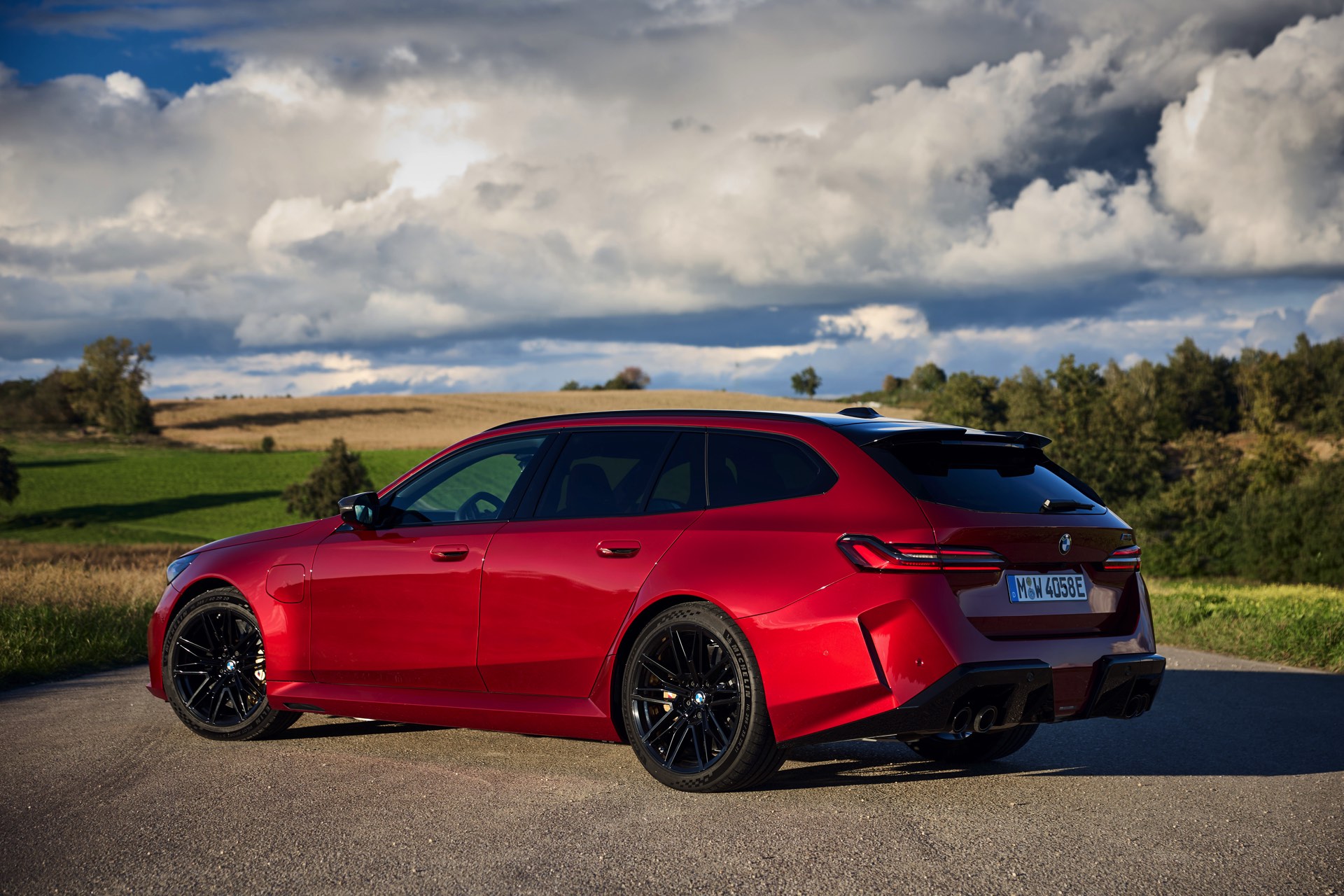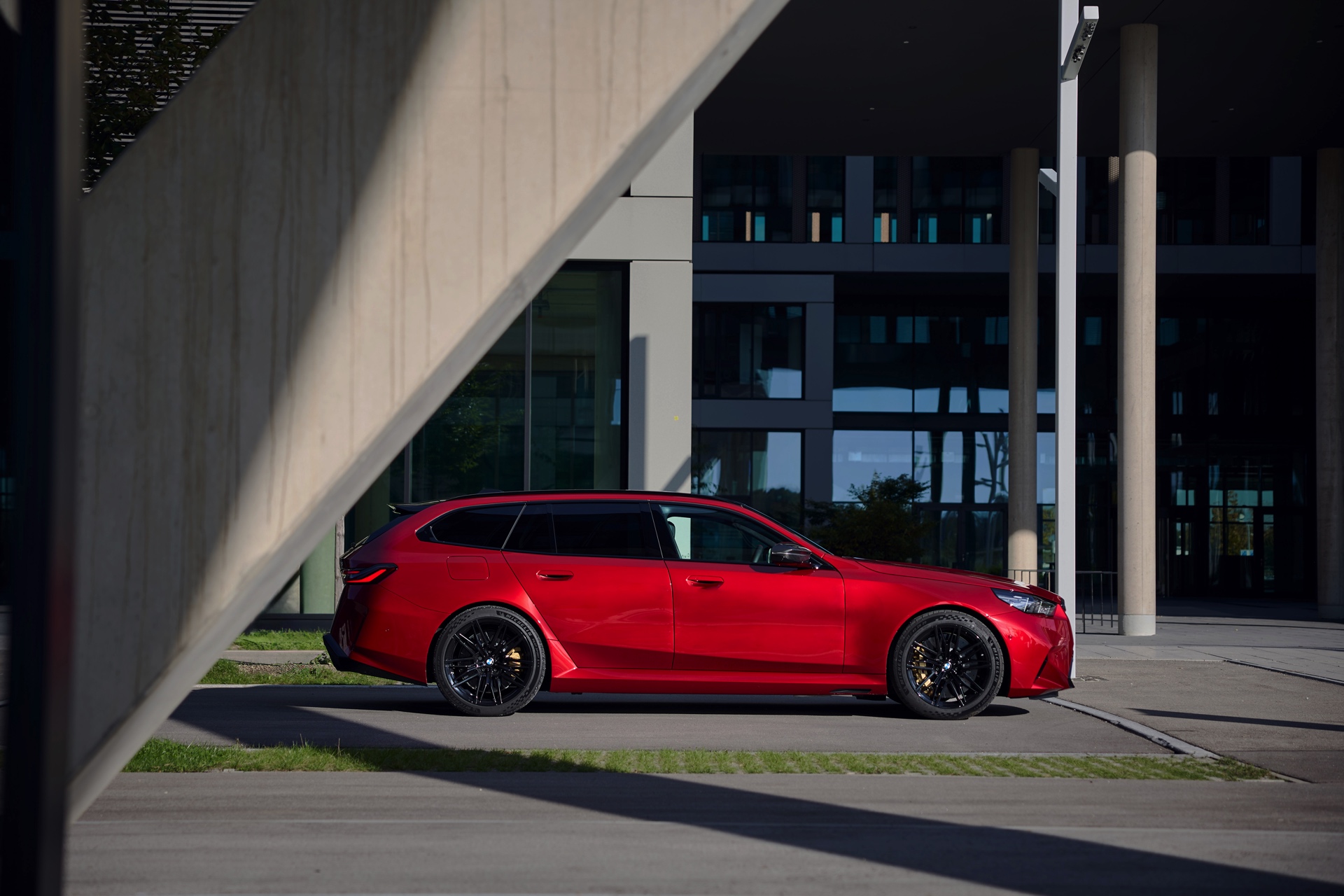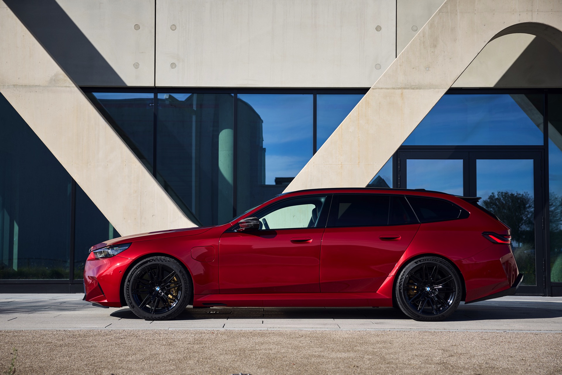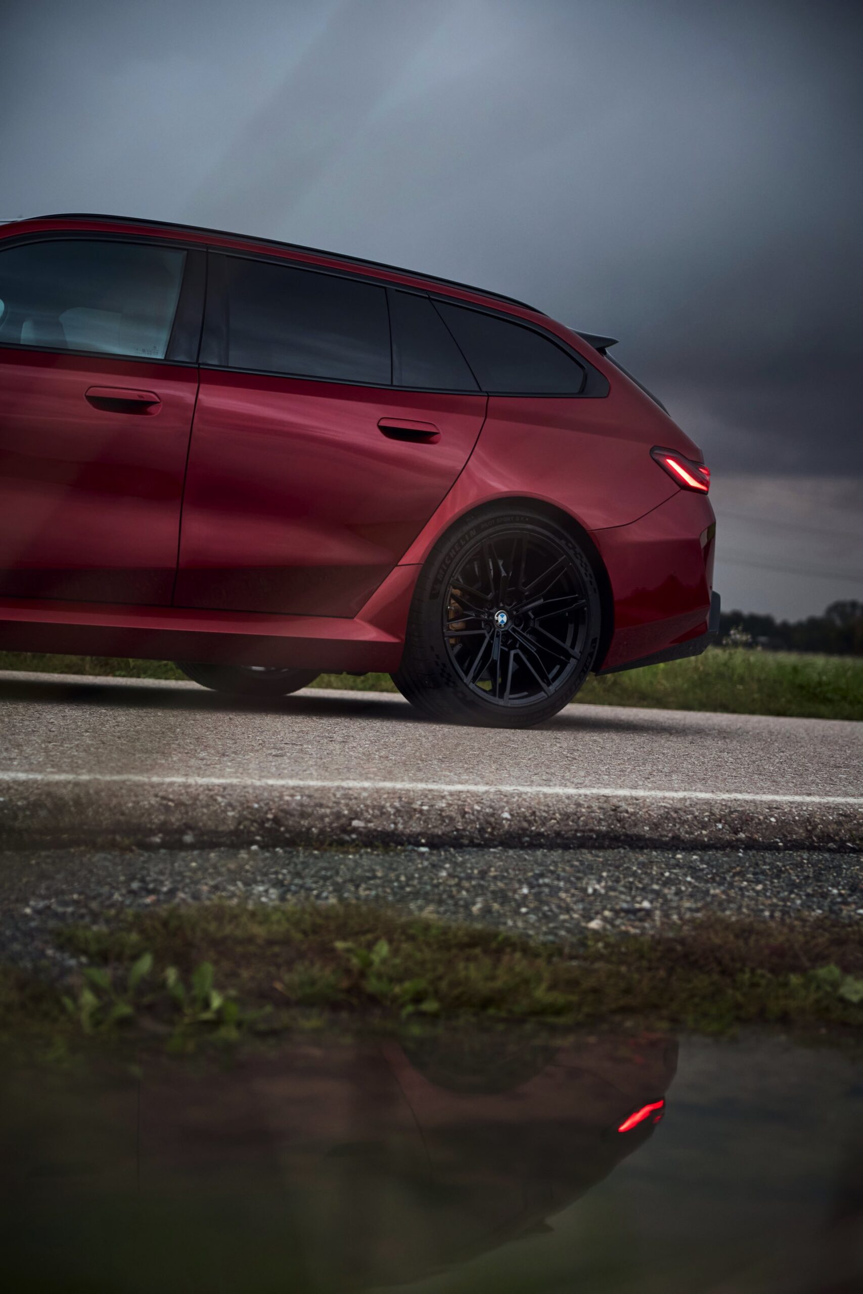 Im Vergleich zum gewöhnlichen BMW 5er Touring (G61) bietet der M5 Fire Red noch mehr Platz zur Entfaltung: Die vorne wie hinten deutlich verbreiterten Kotflügel lassen den Über-Kombi aus Garching noch stämmiger auftreten, außerdem sorgen viele schwarze Elemente für einen sehenswerten Kontrast zur leuchtenden Lackierung. Der hier gezeigte M5 setzt ganz auf Rot und Schwarz, denn er trägt auch die schwarze Variante der vorne 20 und hinten 21 Zoll großen Felgen im Design Doppelspeiche 951 M.