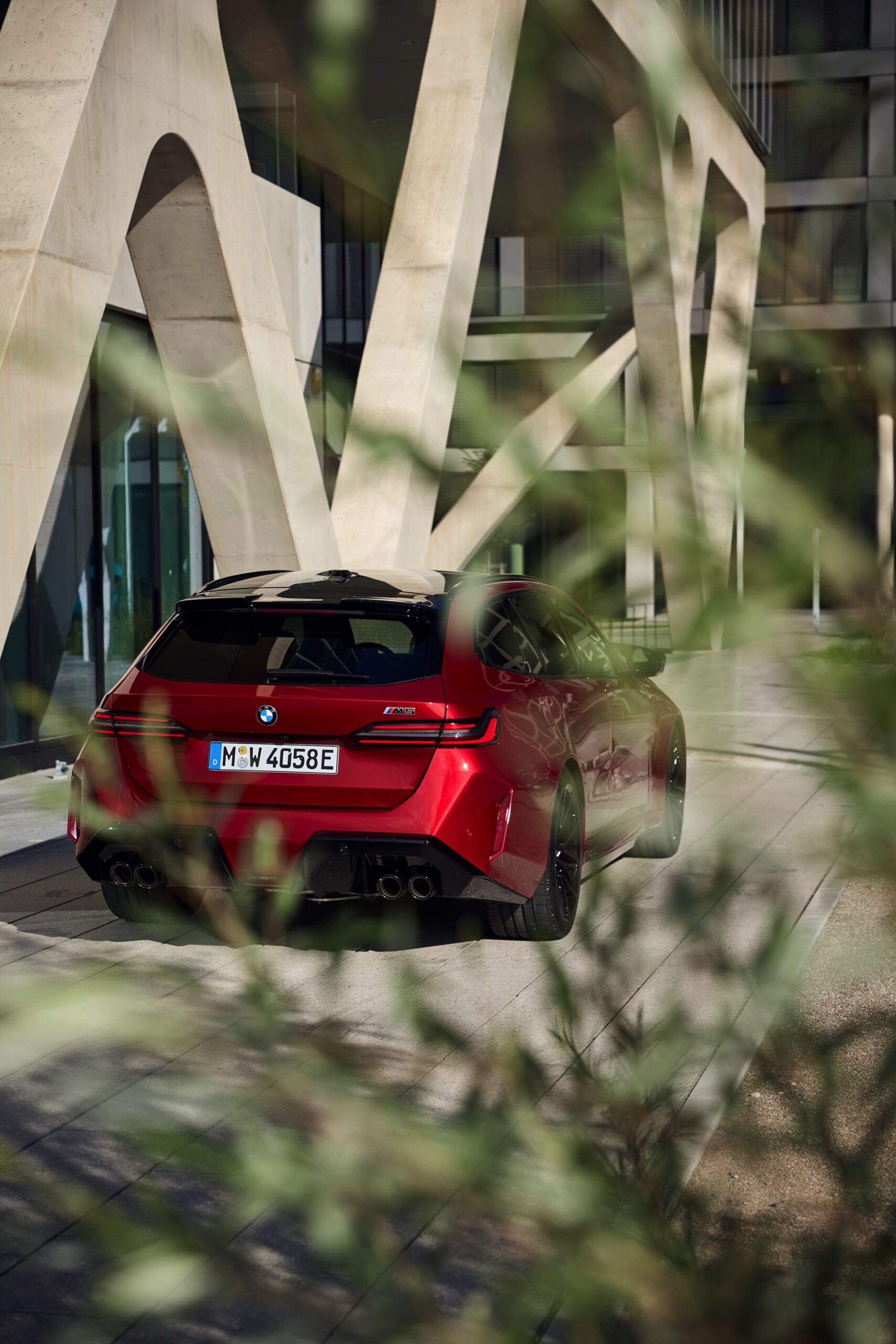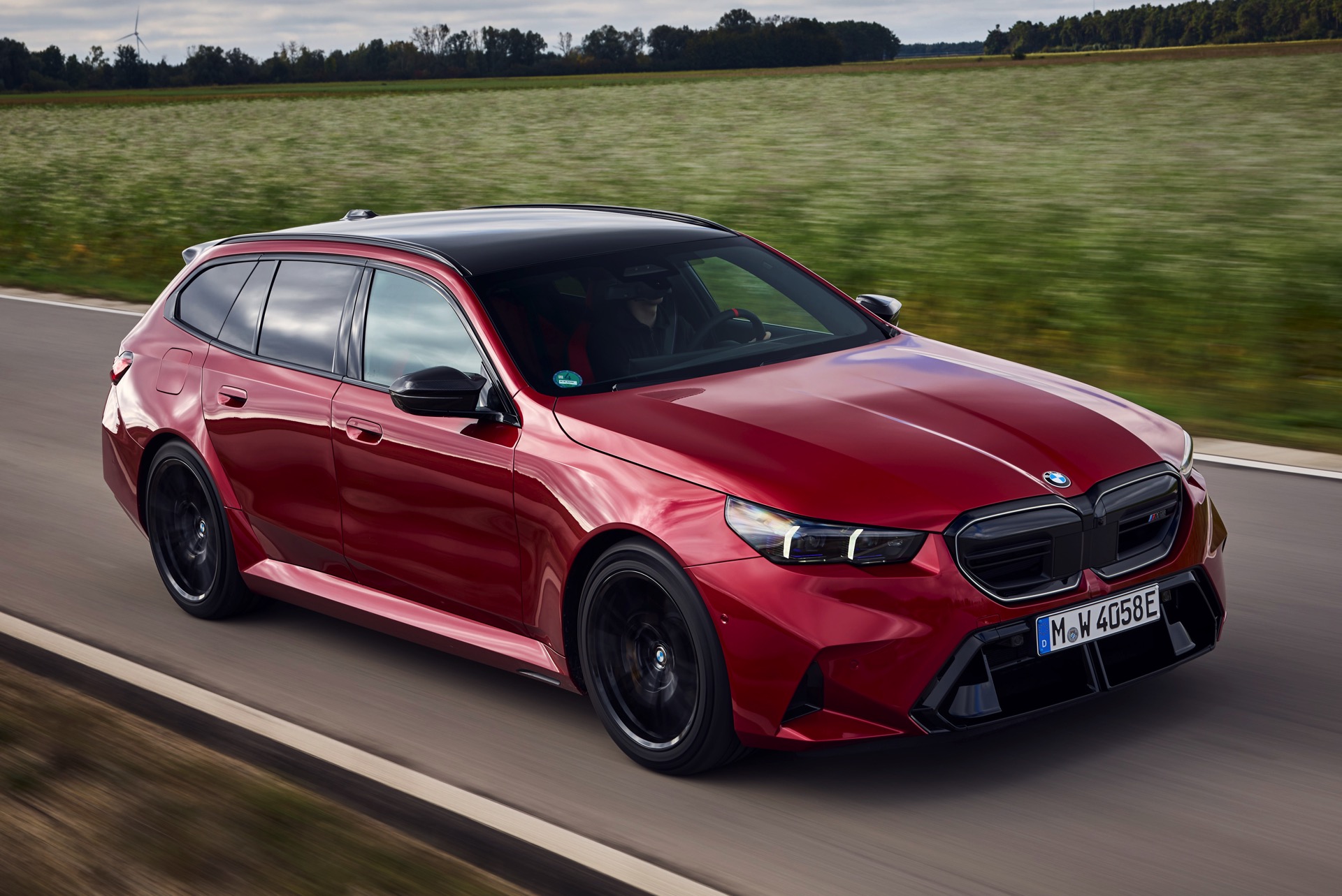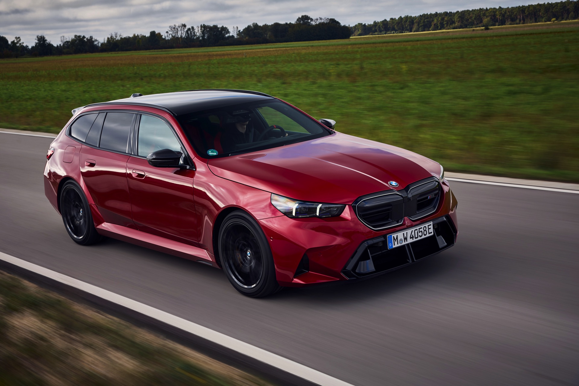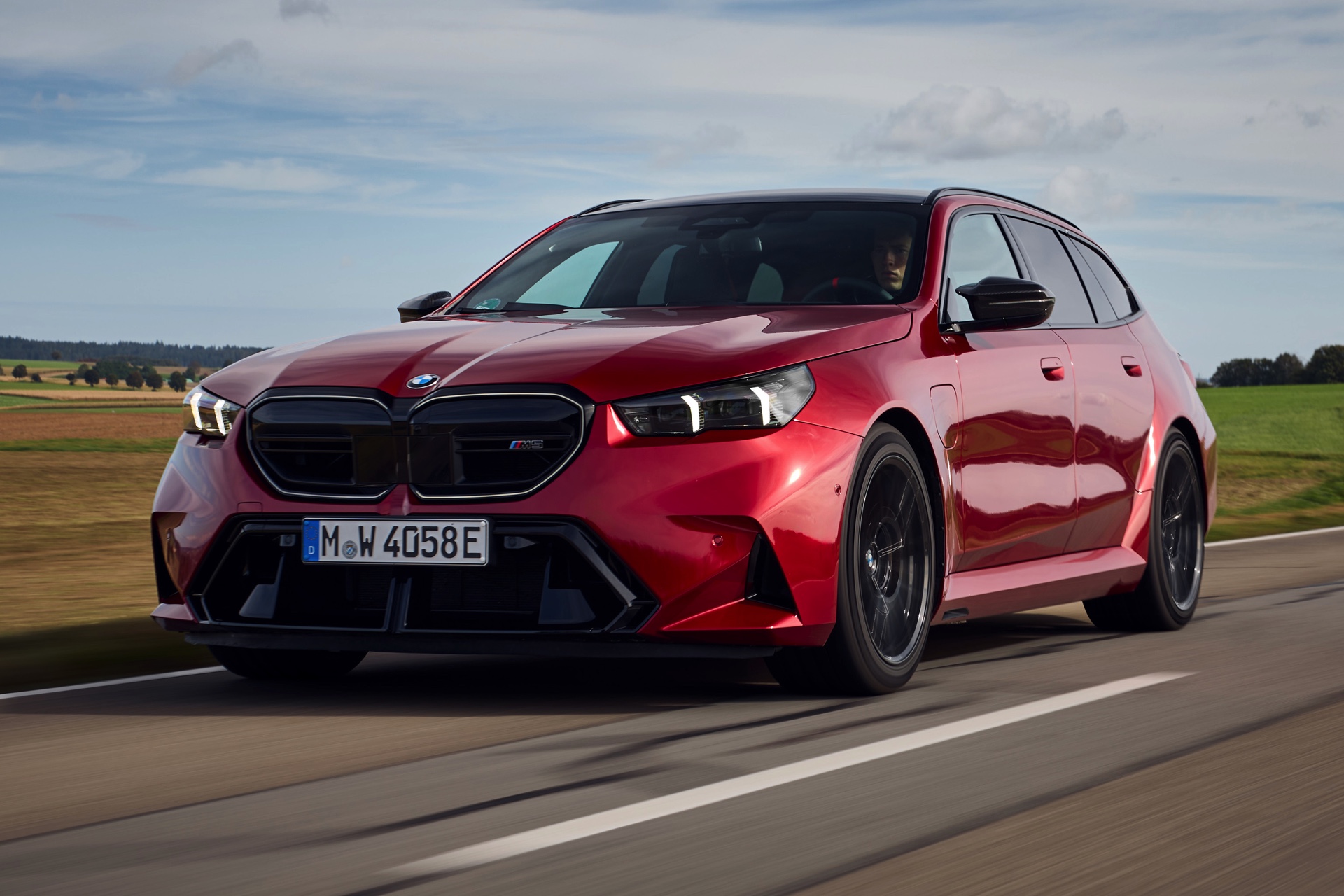 Im Vergleich zum gewöhnlichen BMW 5er Touring (G61) bietet der M5 Fire Red noch mehr Platz zur Entfaltung: Die vorne wie hinten deutlich verbreiterten Kotflügel lassen den Über-Kombi aus Garching noch stämmiger auftreten, außerdem sorgen viele schwarze Elemente für einen sehenswerten Kontrast zur leuchtenden Lackierung. Der hier gezeigte M5 setzt ganz auf Rot und Schwarz, denn er trägt auch die schwarze Variante der vorne 20 und hinten 21 Zoll großen Felgen im Design Doppelspeiche 951 M.
