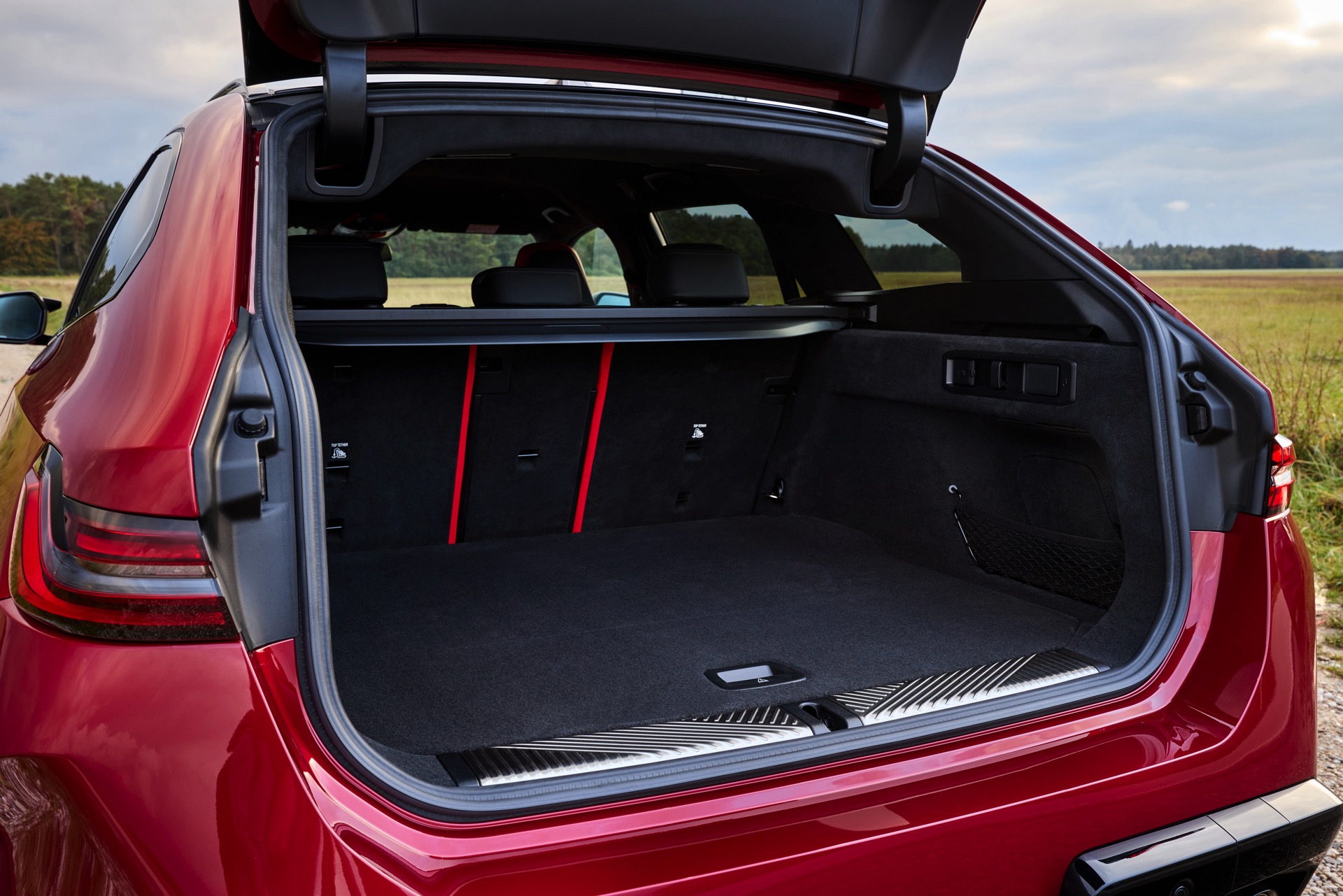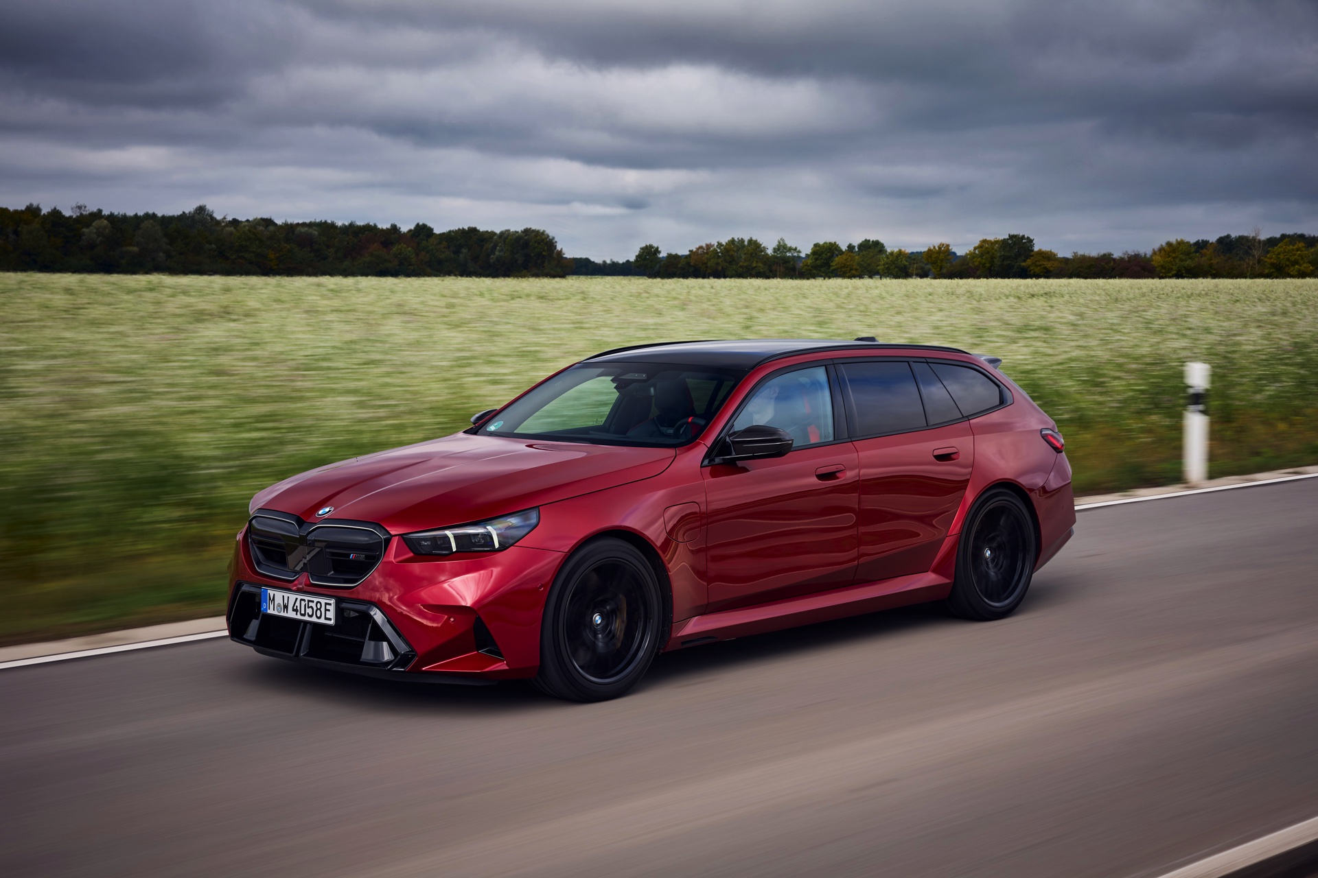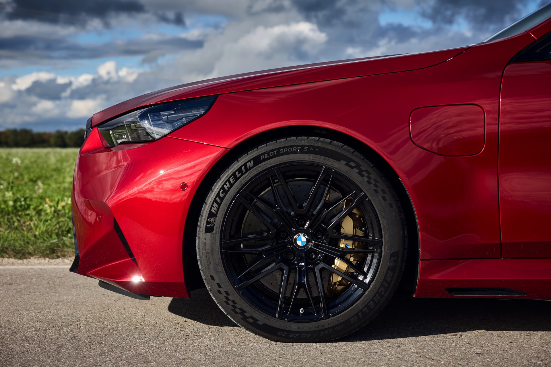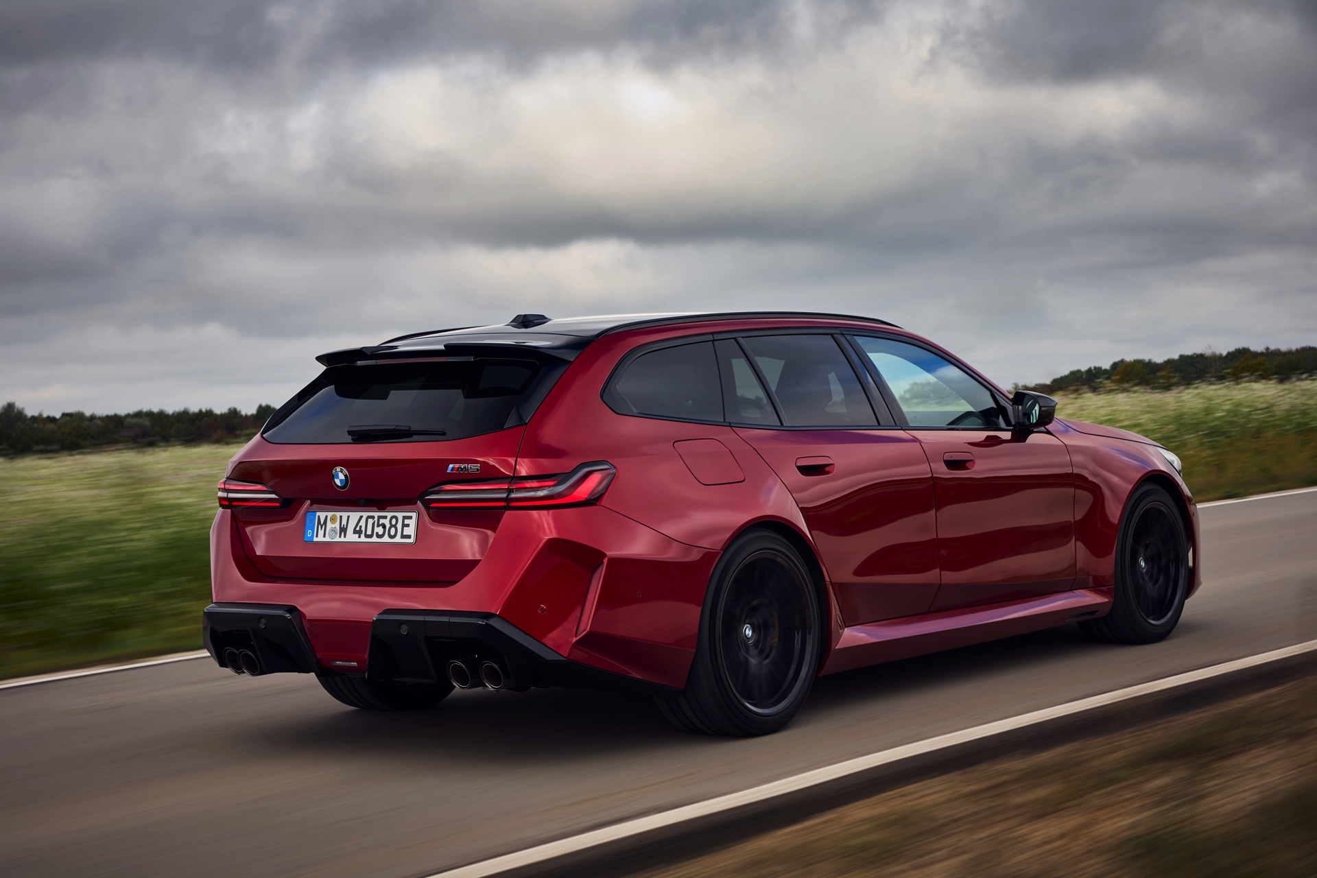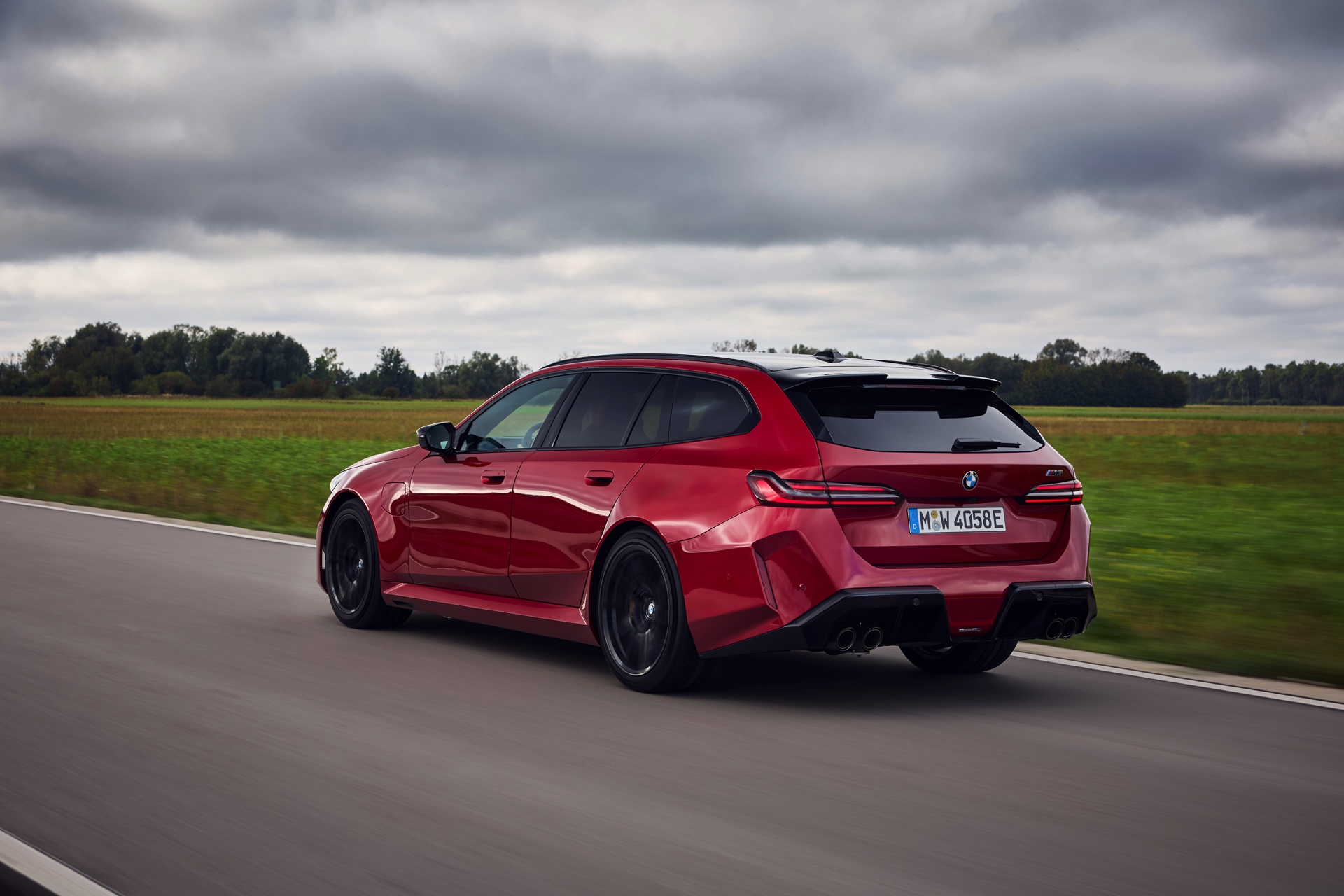Im Vergleich zum gewöhnlichen BMW 5er Touring (G61) bietet der M5 Fire Red noch mehr Platz zur Entfaltung: Die vorne wie hinten deutlich verbreiterten Kotflügel lassen den Über-Kombi aus Garching noch stämmiger auftreten, außerdem sorgen viele schwarze Elemente für einen sehenswerten Kontrast zur leuchtenden Lackierung. Der hier gezeigte M5 setzt ganz auf Rot und Schwarz, denn er trägt auch die schwarze Variante der vorne 20 und hinten 21 Zoll großen Felgen im Design Doppelspeiche 951 M.