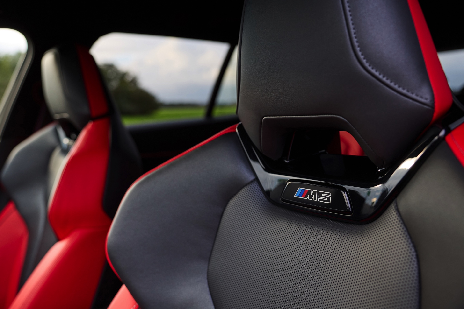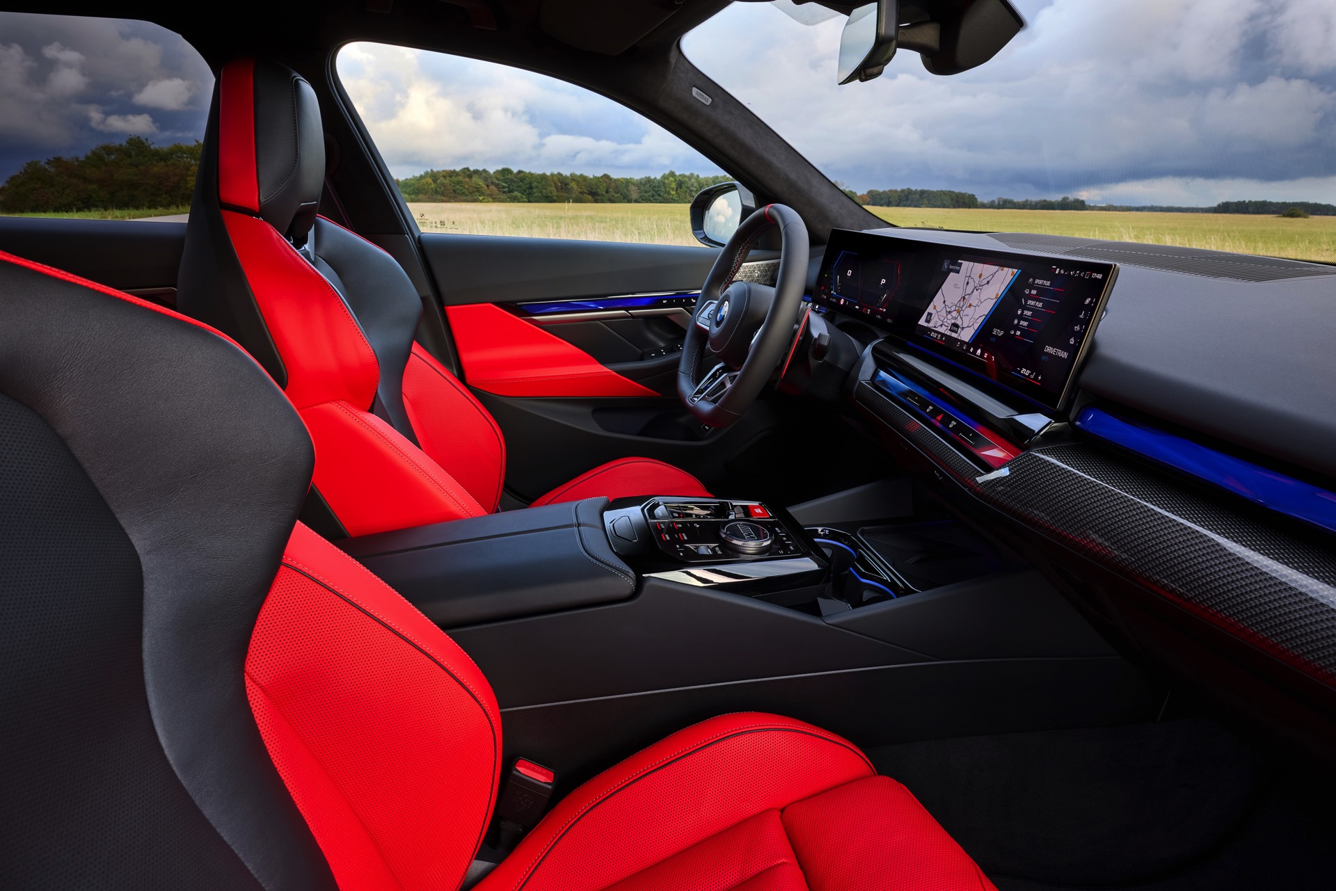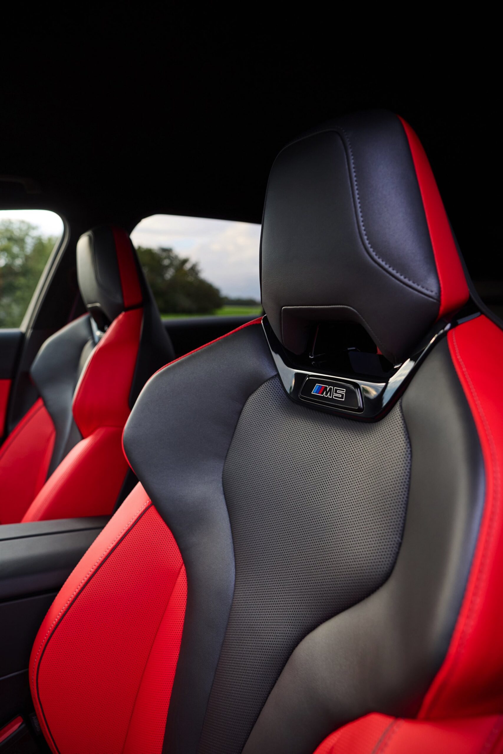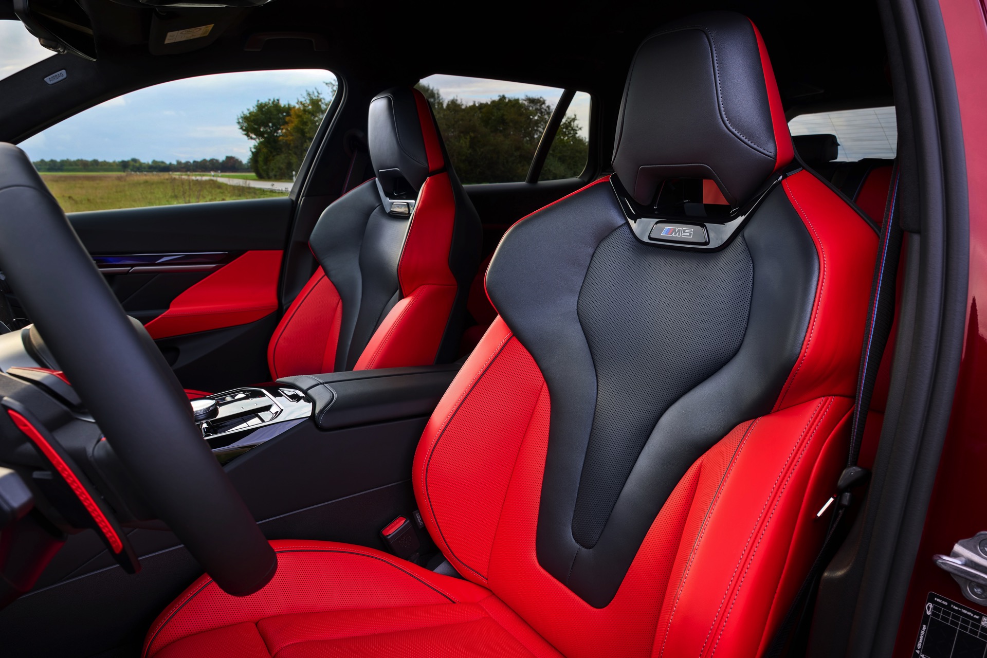 Die Farbkombination des Exterieurs setzt der gezeigte BMW M5 Touring auch im Innenraum konsequent fort: Wir sehen die Bicolor-Lederausstattung Merino in Rot und Schwarz, dazu gibt es die Interieurleisten ‘Carbon Fibre’ mit integrierten Silberfäden.
