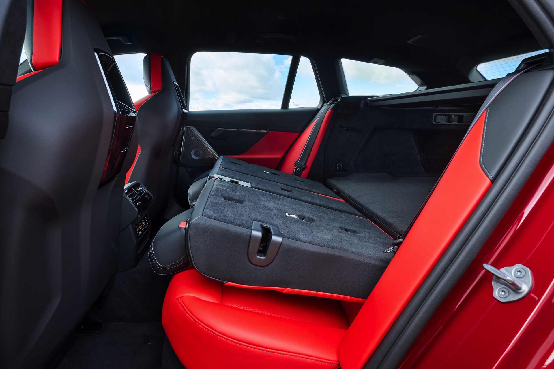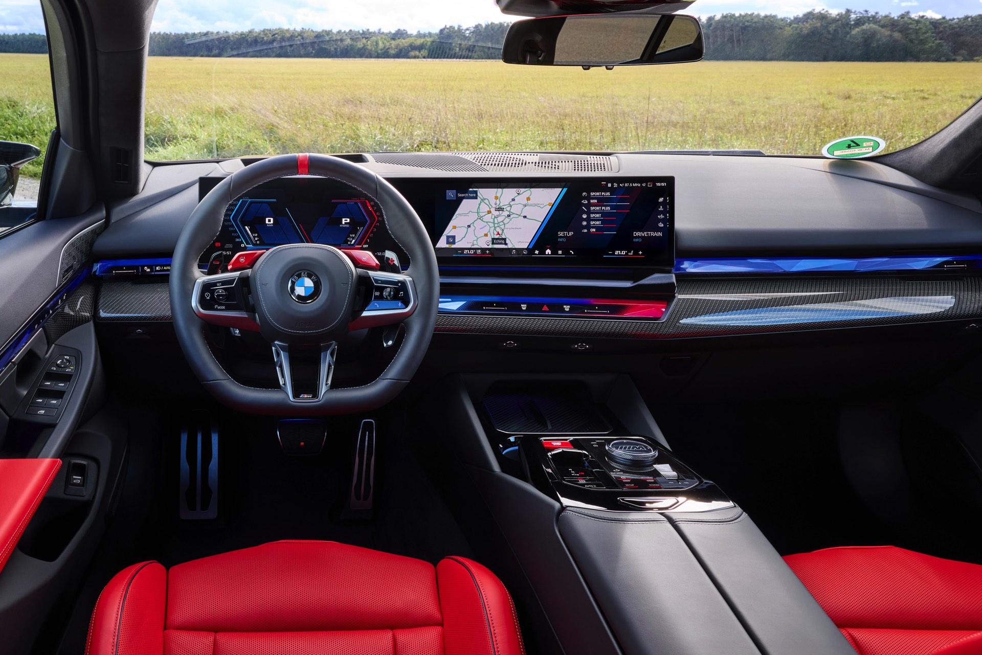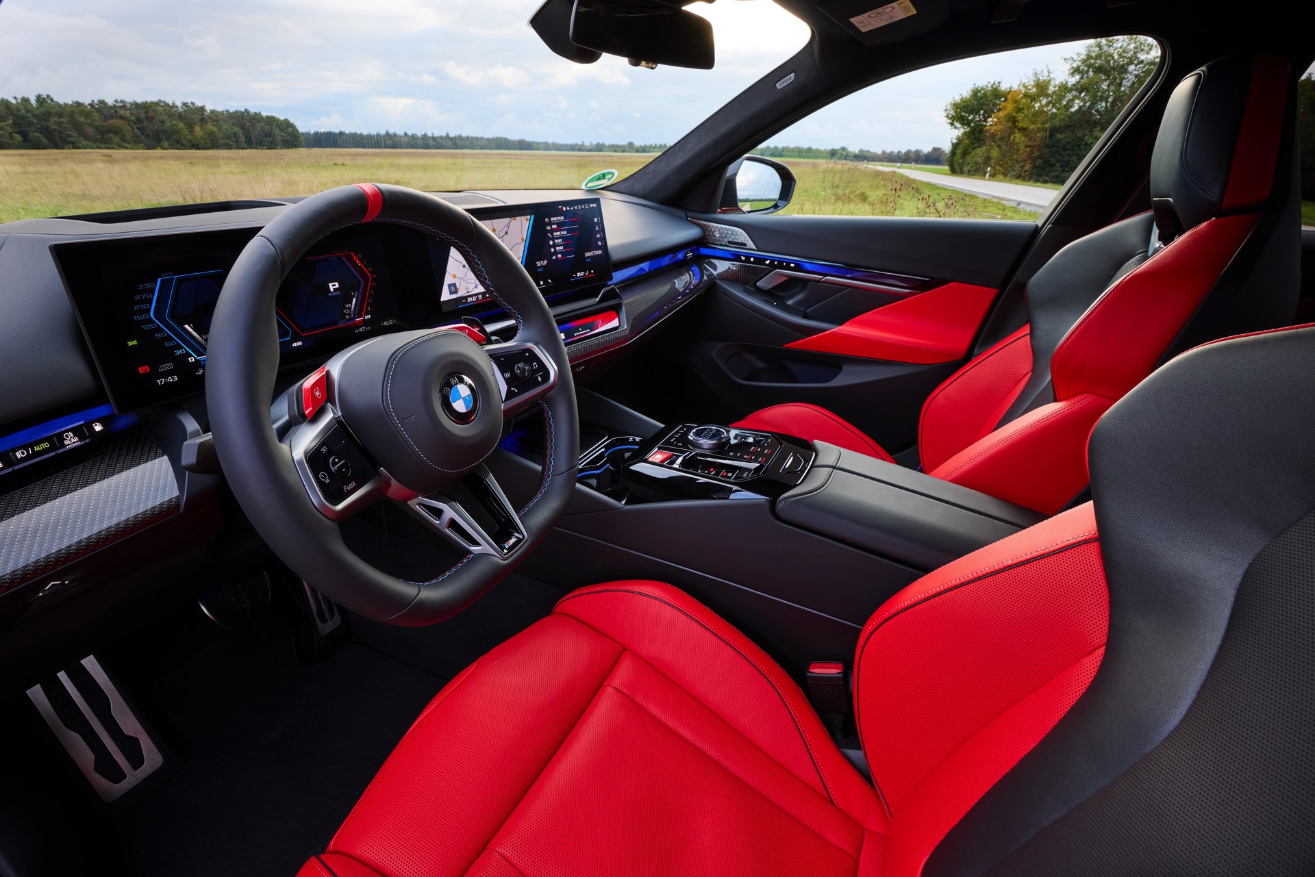 Die Farbkombination des Exterieurs setzt der gezeigte BMW M5 Touring auch im Innenraum konsequent fort: Wir sehen die Bicolor-Lederausstattung Merino in Rot und Schwarz, dazu gibt es die Interieurleisten ‘Carbon Fibre’ mit integrierten Silberfäden.