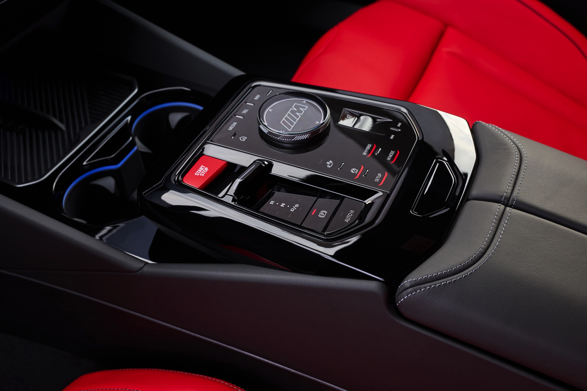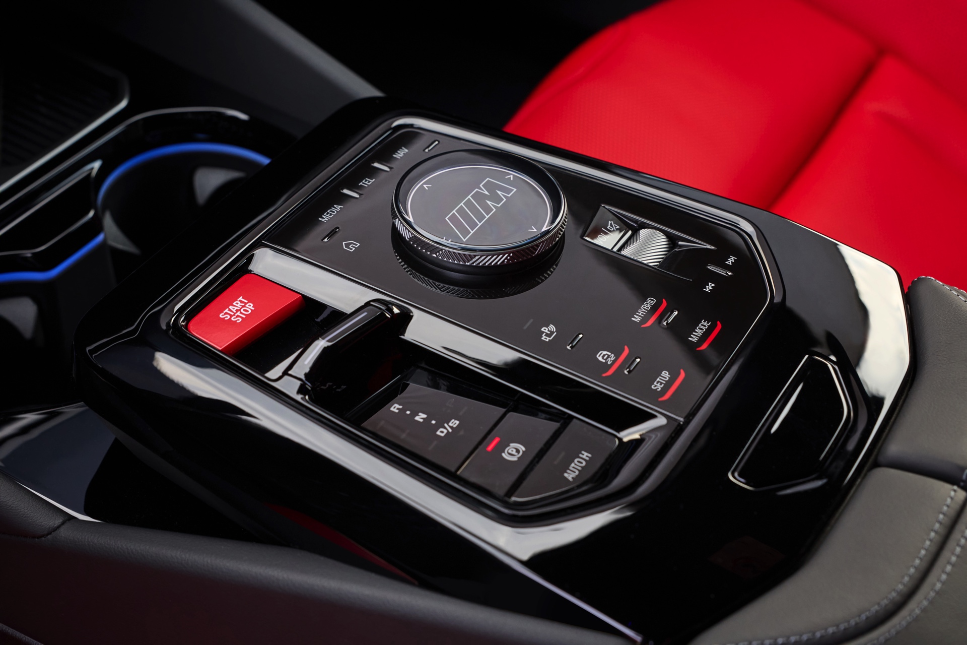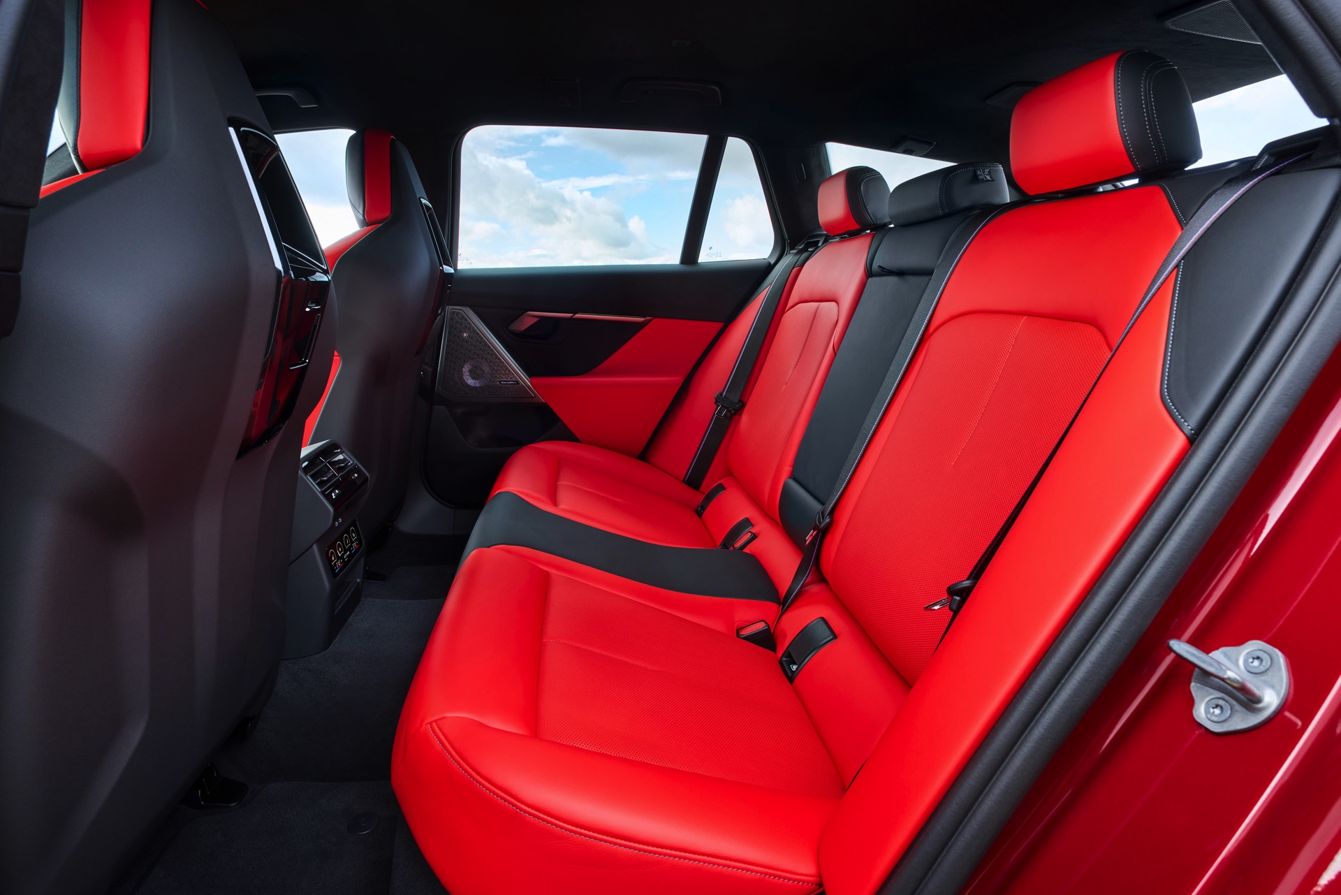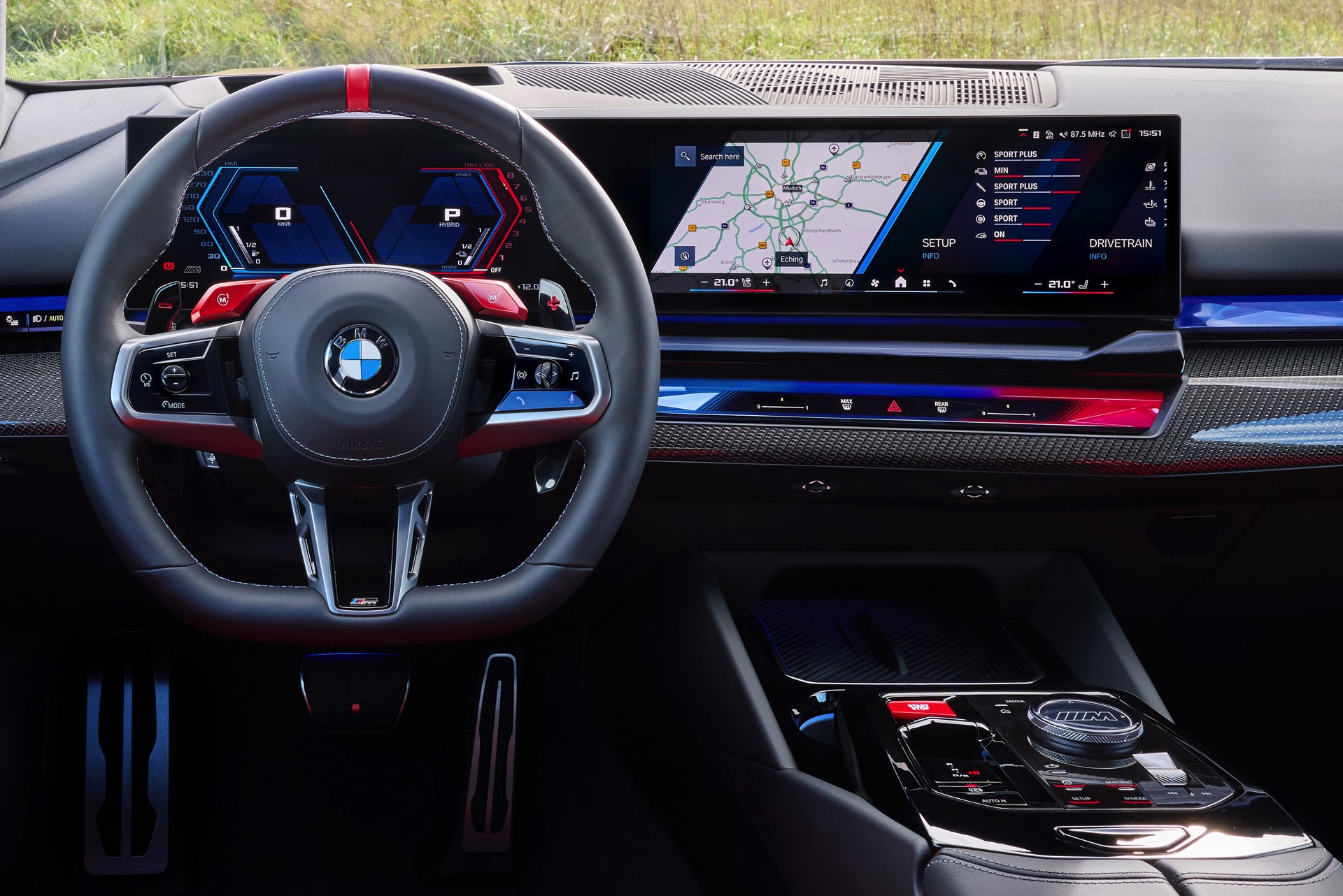 Die Farbkombination des Exterieurs setzt der gezeigte BMW M5 Touring auch im Innenraum konsequent fort: Wir sehen die Bicolor-Lederausstattung Merino in Rot und Schwarz, dazu gibt es die Interieurleisten ‘Carbon Fibre’ mit integrierten Silberfäden.