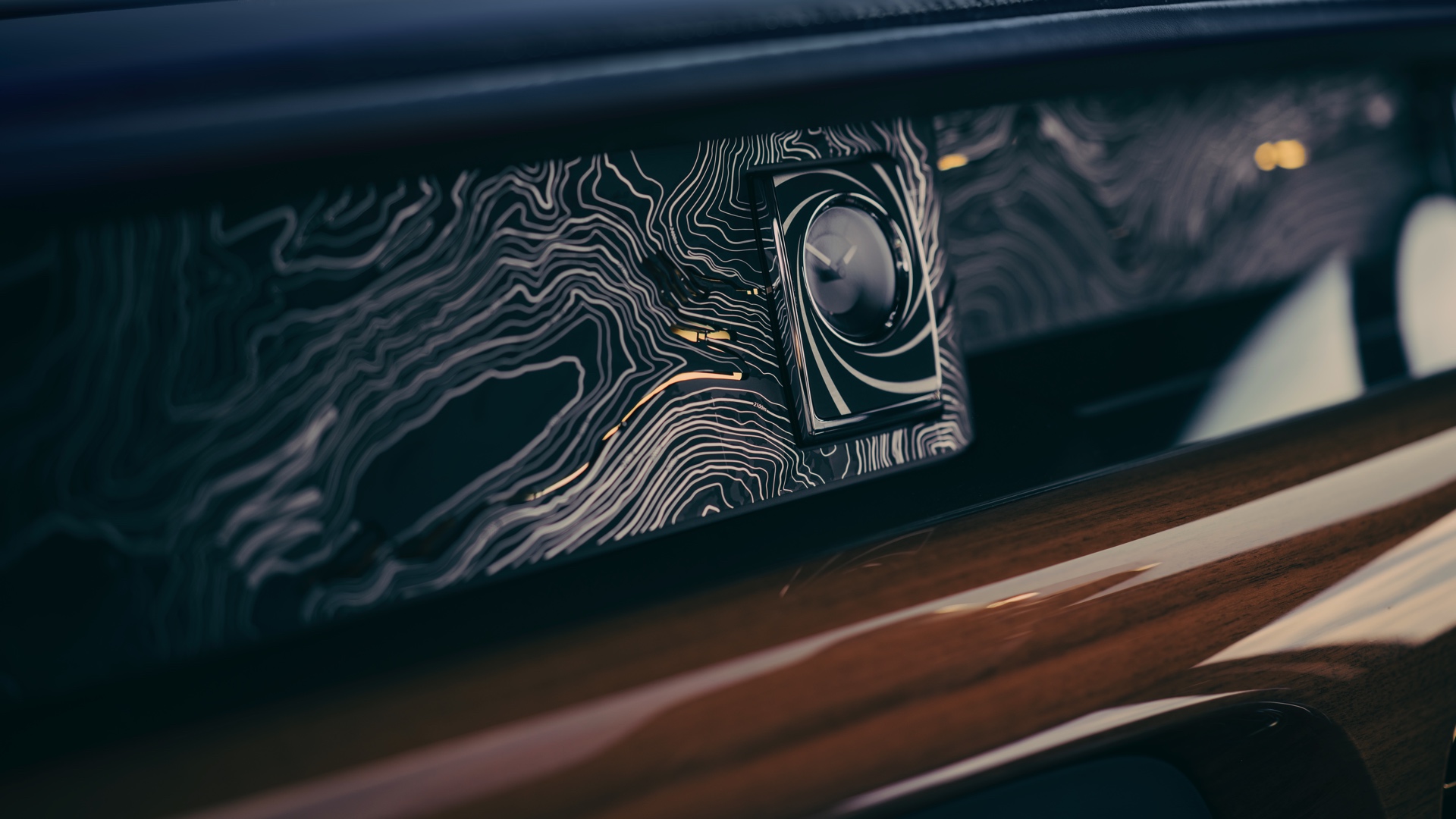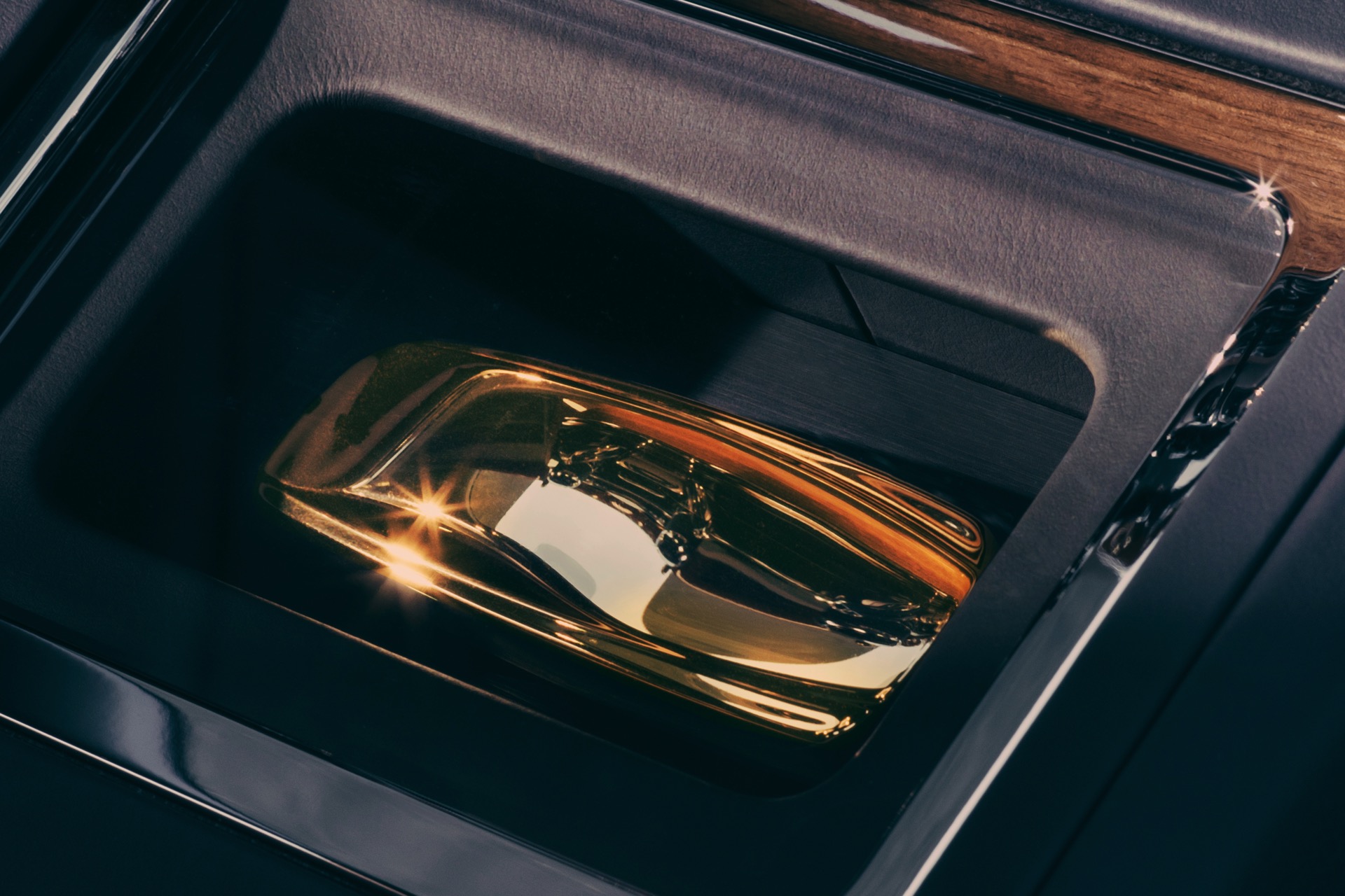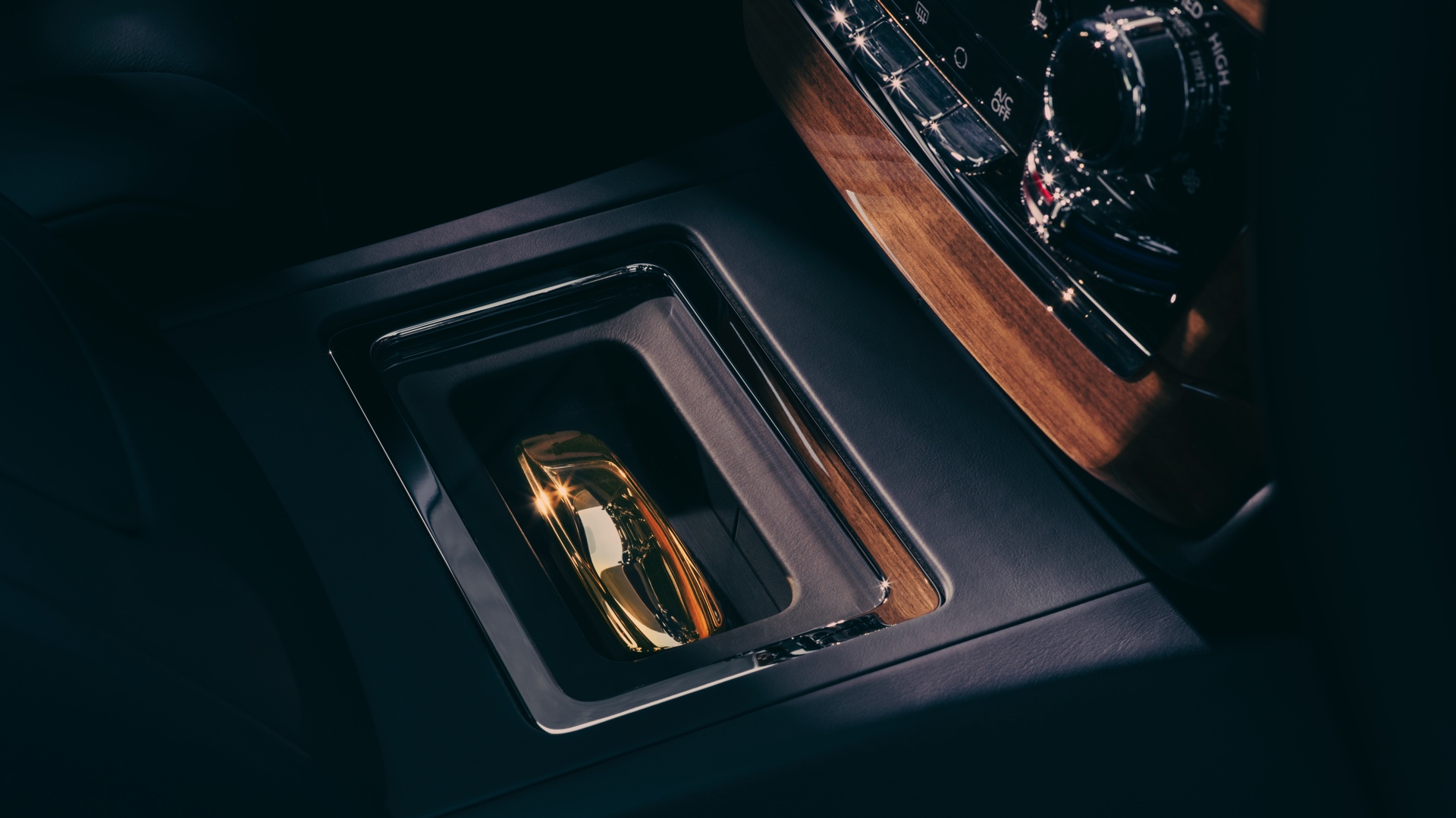 Im Innenraum des Rolls-Royce Phantom Goldfinger finden sich außerdem zahlreiche weitere goldene Details, darunter die Lüftungsdüsen und Lautsprecher-Abdeckungen ebenso wie Teile der Interieurleisten und die an einen Goldbarren erinnernden Einstiegsleisten. In der Mittelkonsole wurde als Krönung ein 18 Karat-Goldstück integriert, dessen Form an die Silhouette eines Rolls-Royce angelehnt ist.