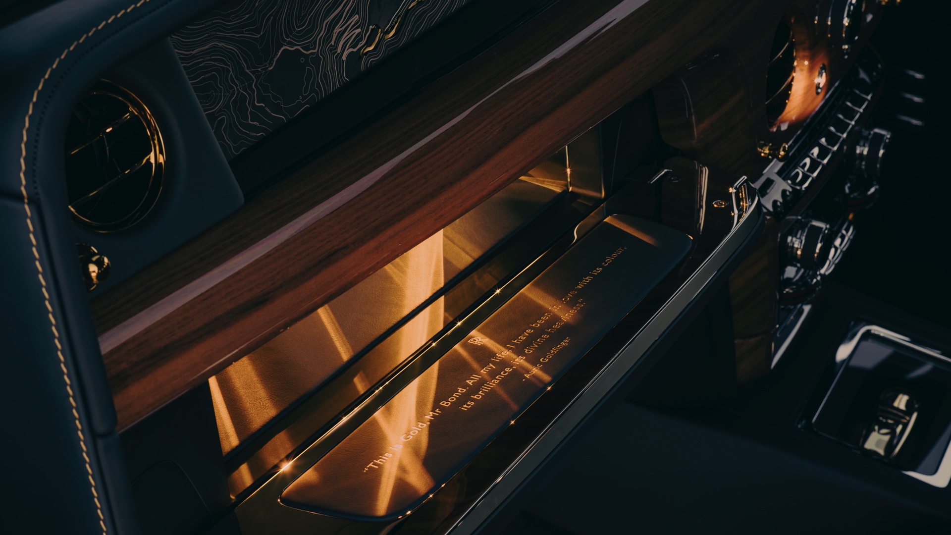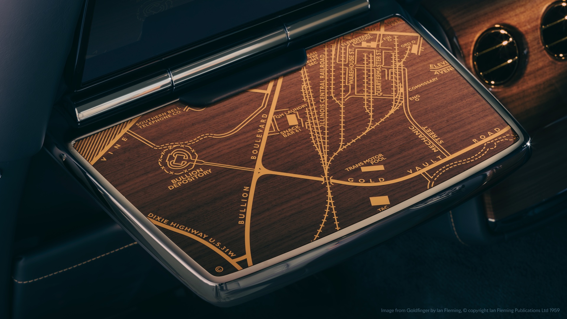 Angefangen von der gelben Lackierung über die golden schimmernde Spirit of Ecstasy bis hin zu einer goldenen Karte des im Film zentralen Gold-Lagers Fort Knox finden sich überall Hinweise auf den legendären Bond-Film. Dabei mangelt es nicht an liebevollen Details: In Anspielung auf die Story, in der Auric Goldfinger Gold hinter Panelen seines Rolls-Royce schmuggelte, scheint auch die Spirit of Ecstasy ihren goldenen Kern unter einem silbernem Kleid zu verbergen. "