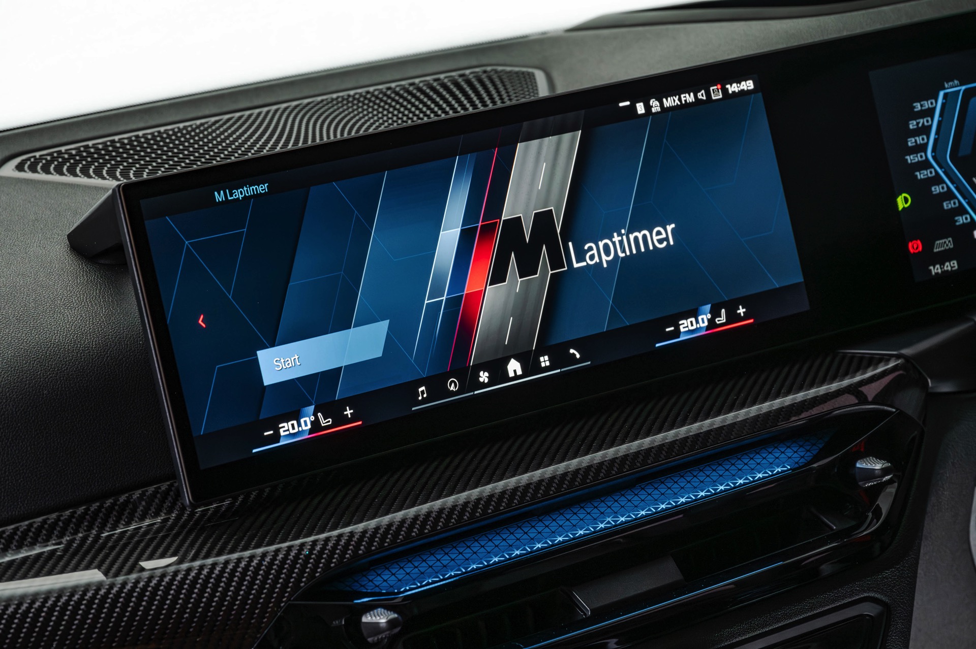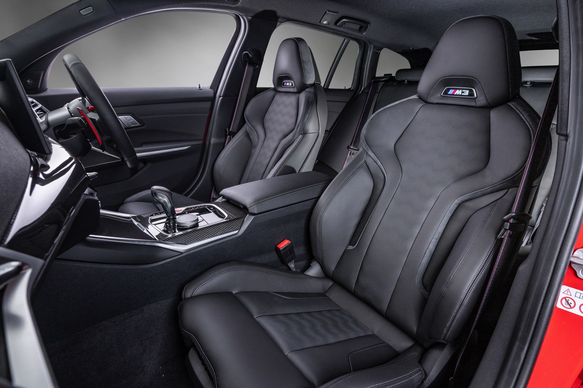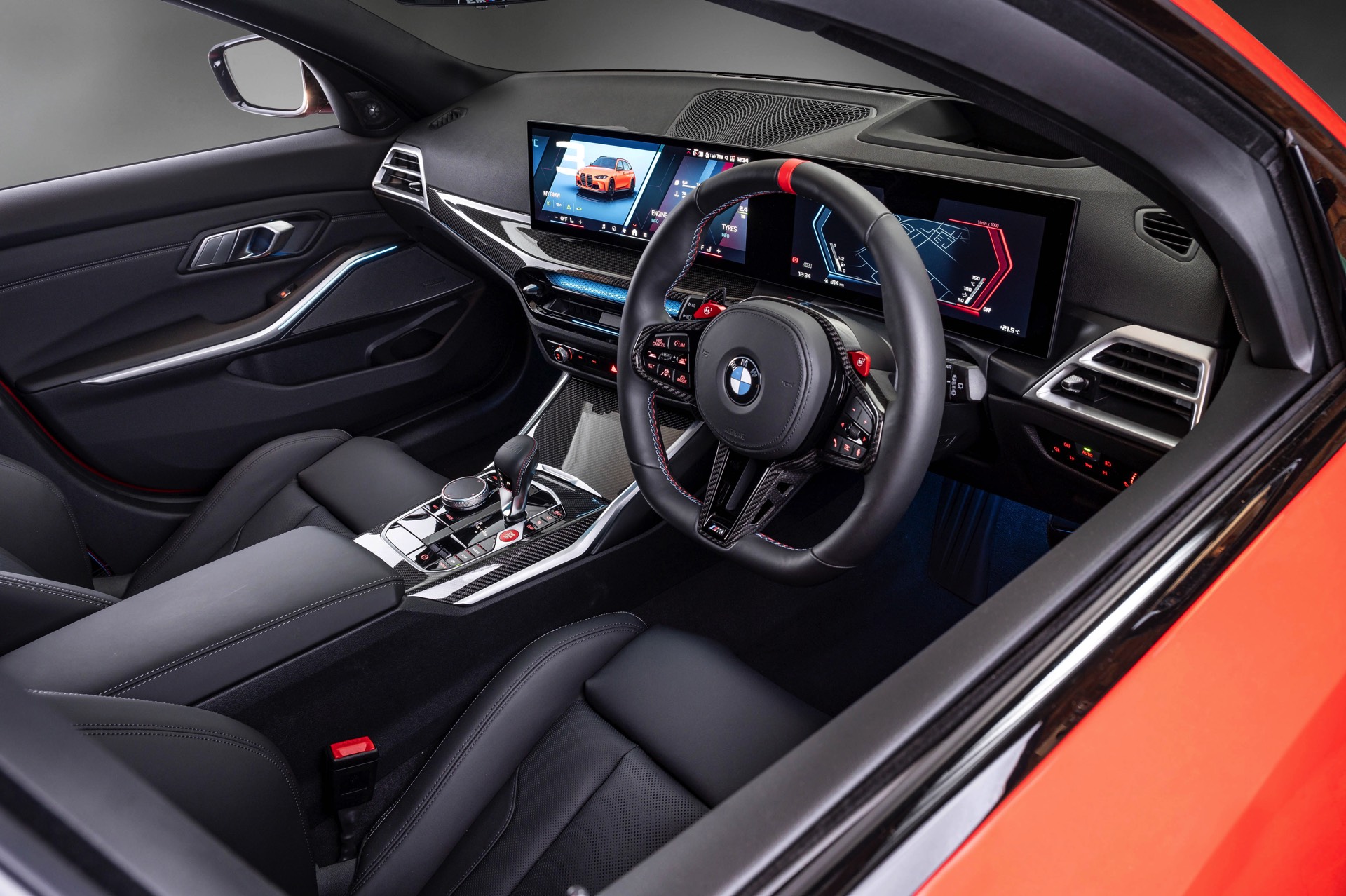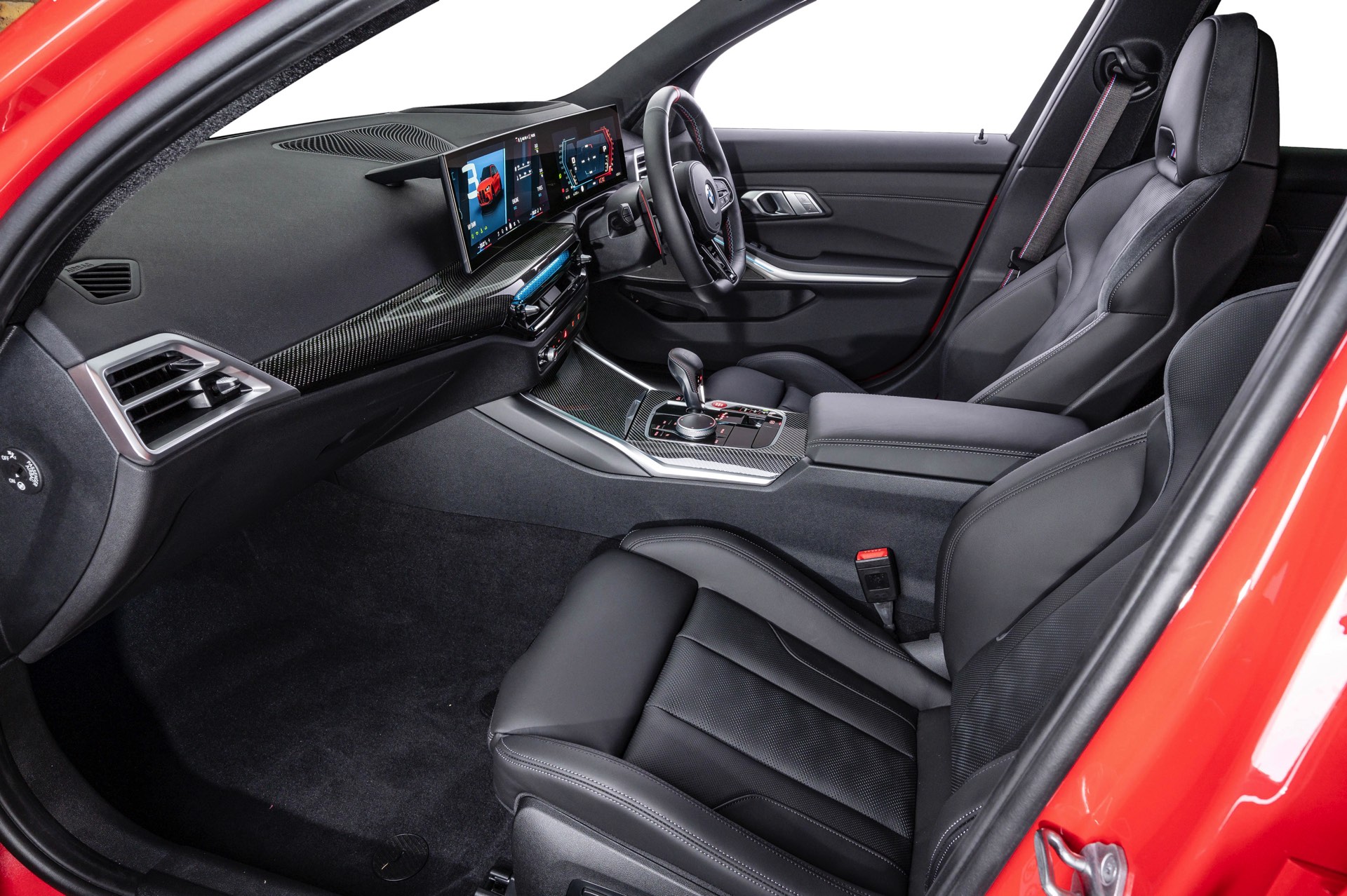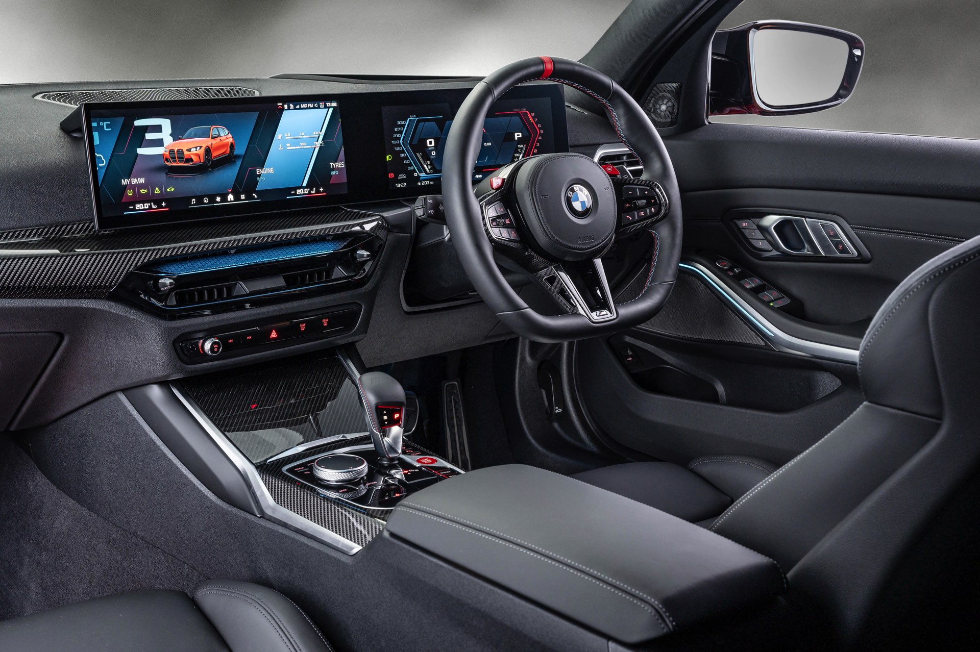 Die serienmäßigen M Sportsitze mit schwarzem Leder Merino werden mit den Interieurleisten ‘Carbon Fibre’ kombiniert, die für einen zum Anspruch des BMW M3 Touring passenden High Performance-Touch sorgen. Unterhalb des Curved Displays sehen wir die neue Variante der Ambientebeleuchtung, die genau wie beim 4er Facelift und dem kurz darauf nachgereichten 3er Facelift II direkt in den zentralen Luftauslass intergriert ist.