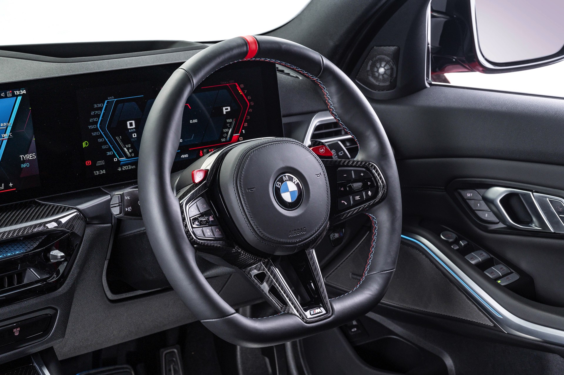 Für die meisten europäischen Augen ausgesprochen ungewohnt ist der Blick in den Innenraum, denn aufgrund des Linksverkehrs in Südafrika sehen wir den BMW M3 Touring als Rechtslenker. Das komplette Cockpit ist folglich gespiegelt, damit sich das Curved-Display auch weiterhin zum Fahrer orientiert und auch der Startknopf auf der Mittelkonsole gut zu erreichen ist.