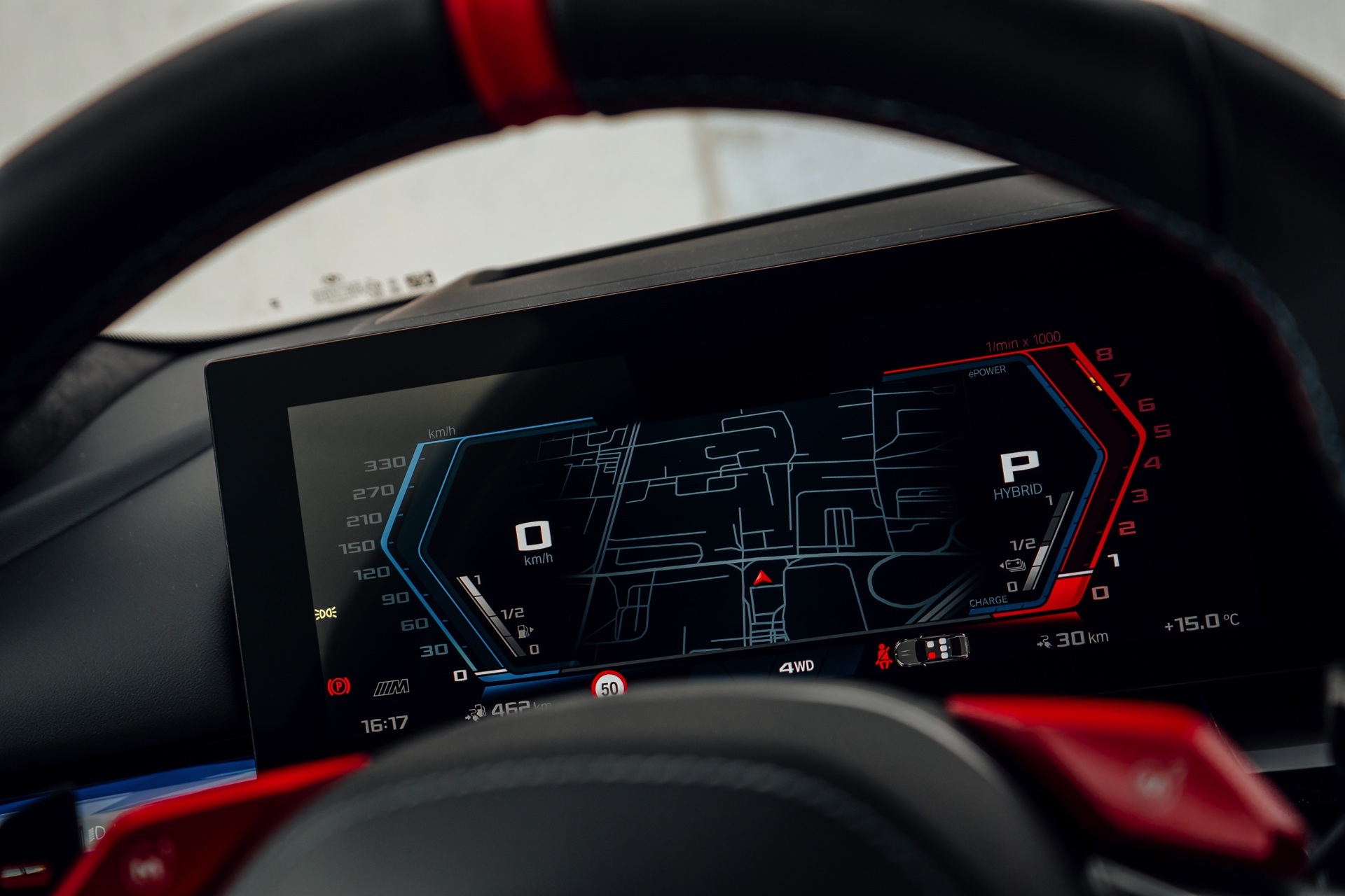 In den breiten Radhäusern des gezeigten BMW M5 (G90) sind die vorne 20 und hinten 21 Zoll großen Leichtmetallräder Doppelspeiche 951 M Bicolor montiert, die bereits im Grundpreis enthalten sind. Gegen einen Aufpreis von 950 Euro sind die gleichen Felgen auch ab Werk mit ausgewiesenen Sportreifen erhältlich. Für die imposante Beschleunigung ist dieser Klick nicht erforderlich, denn die Höchstgeschwindigkeit von offiziell 305 km/h erreicht der M5 auch im Serienzustand ziemlich mühelos: