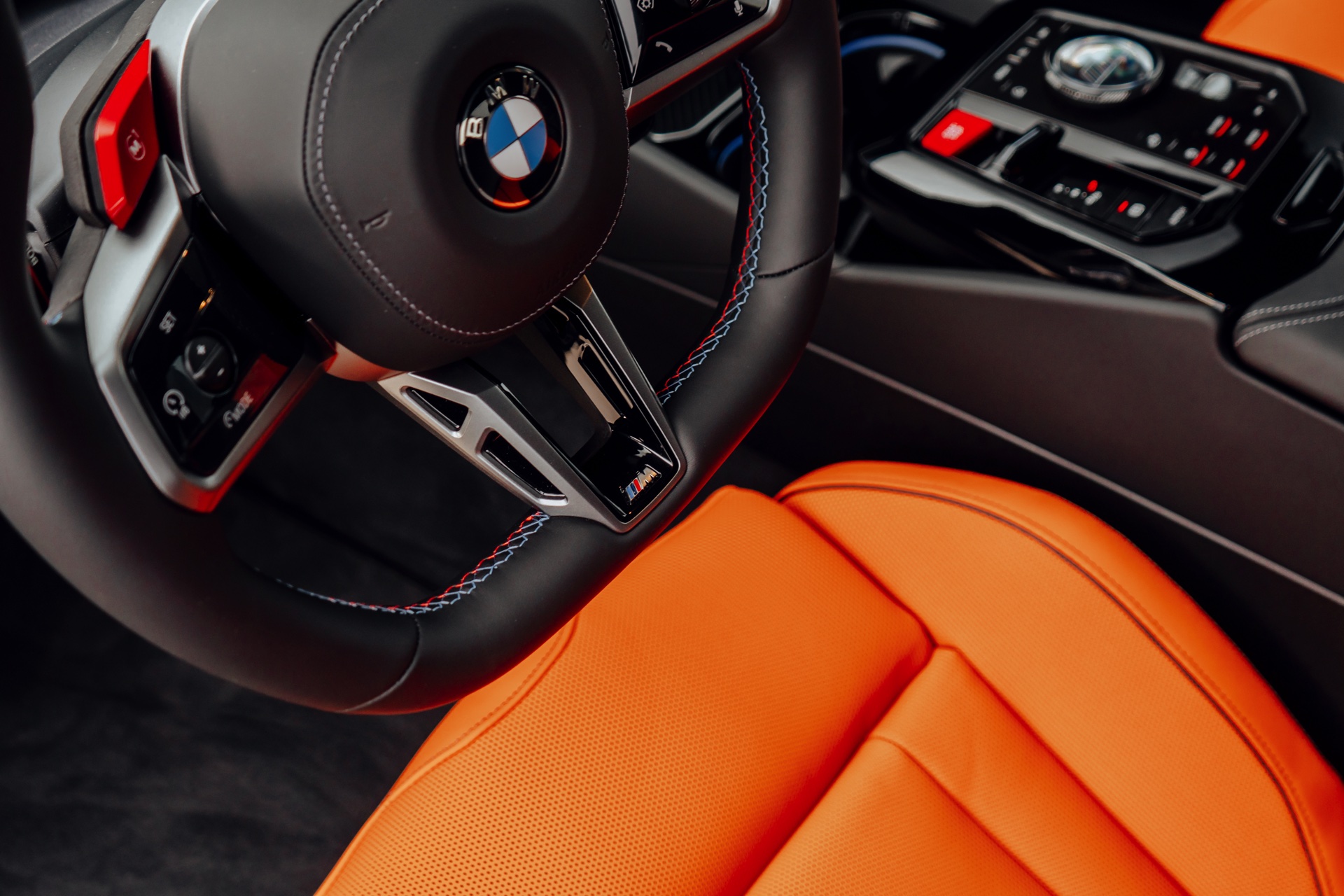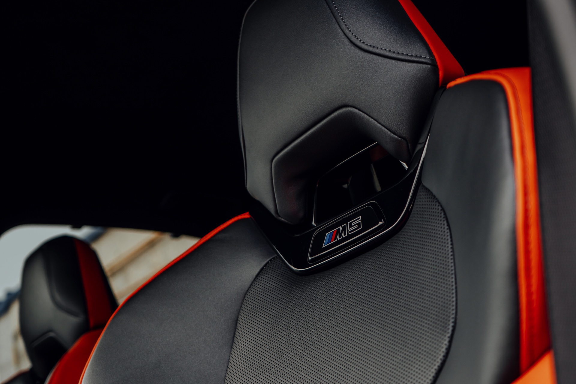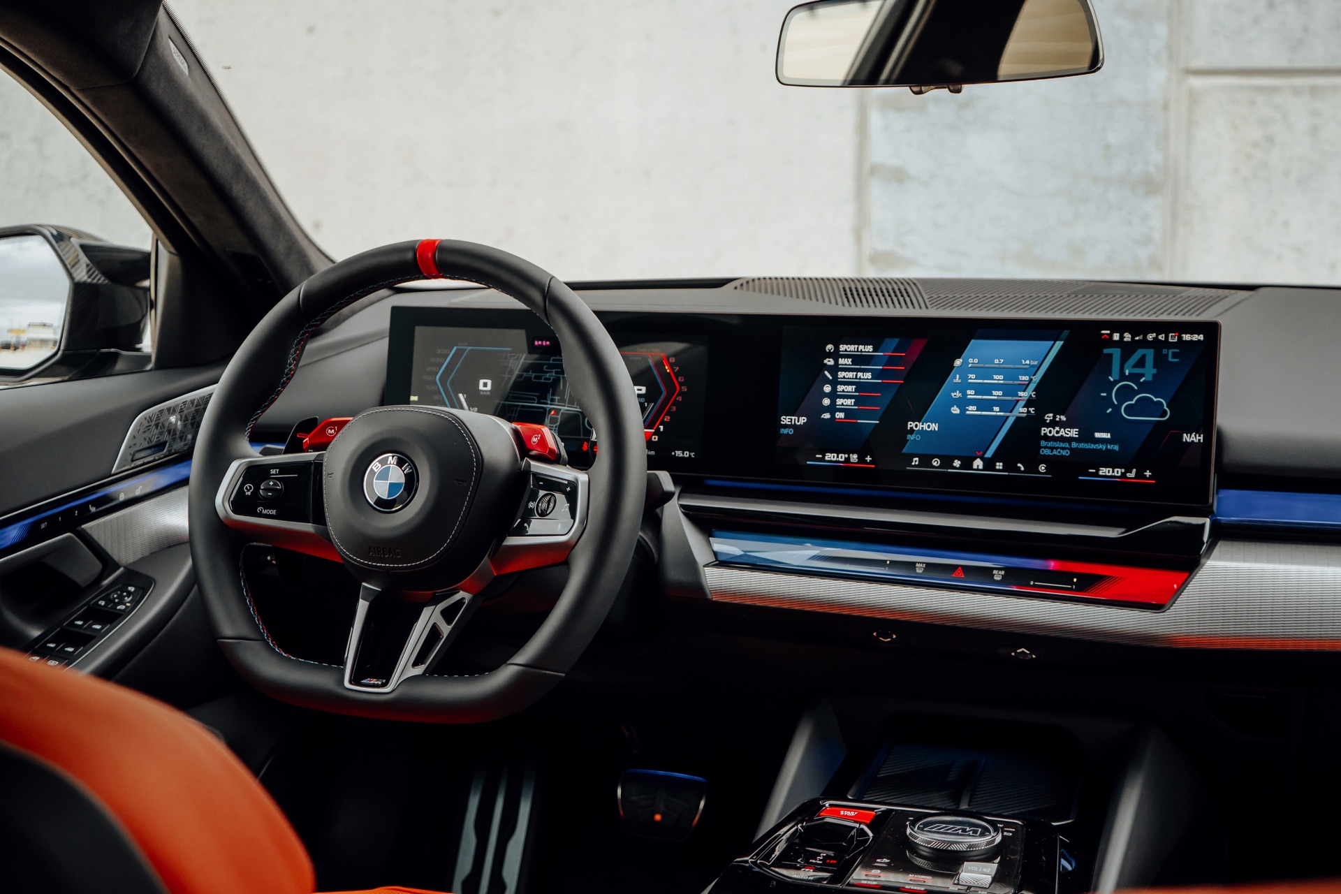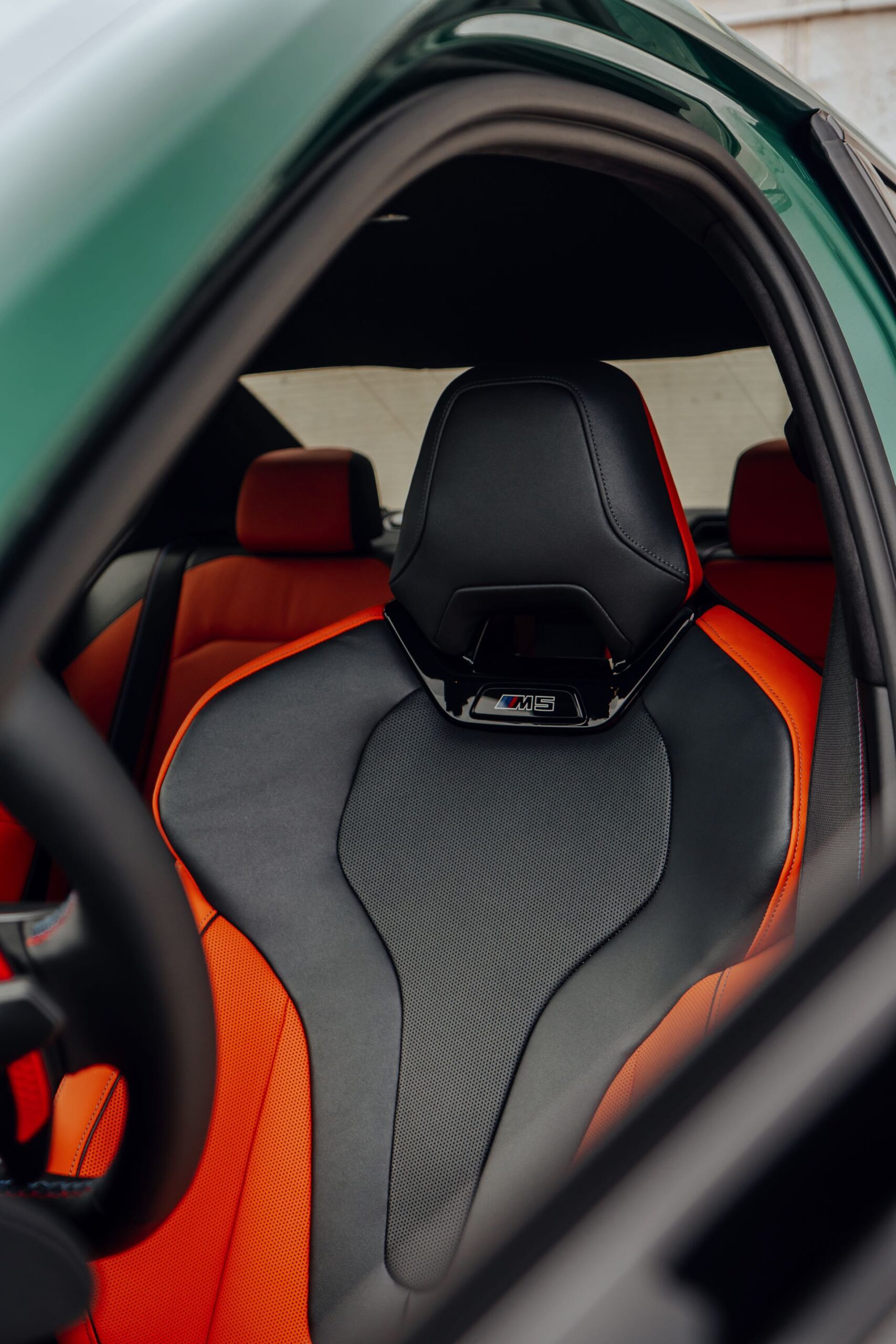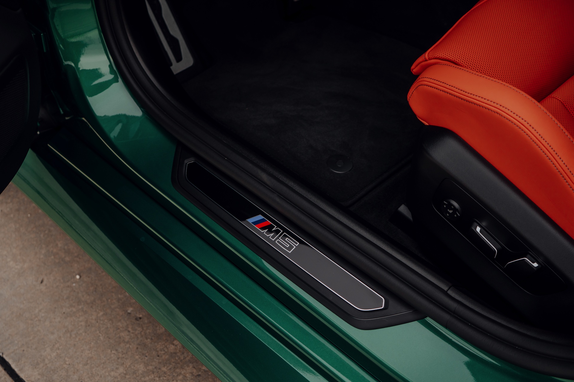 Der Blick in den Innenraum des slowakischen BMW M5 lohnt sich nicht nur aufgrund der Bicolor-Lederausstattung in Kyalami Orange und Schwarz, sondern auch aufgrund der Interieurleisten: Während die meisten bisher abgelichteten M5 die betont-sportliche Variante ‘Carbon Fibre’ getragen haben, sehen wir hier die serienmäßigen Leisten Aluminium Rhombicle mit M Akzent Dunkelsilber: