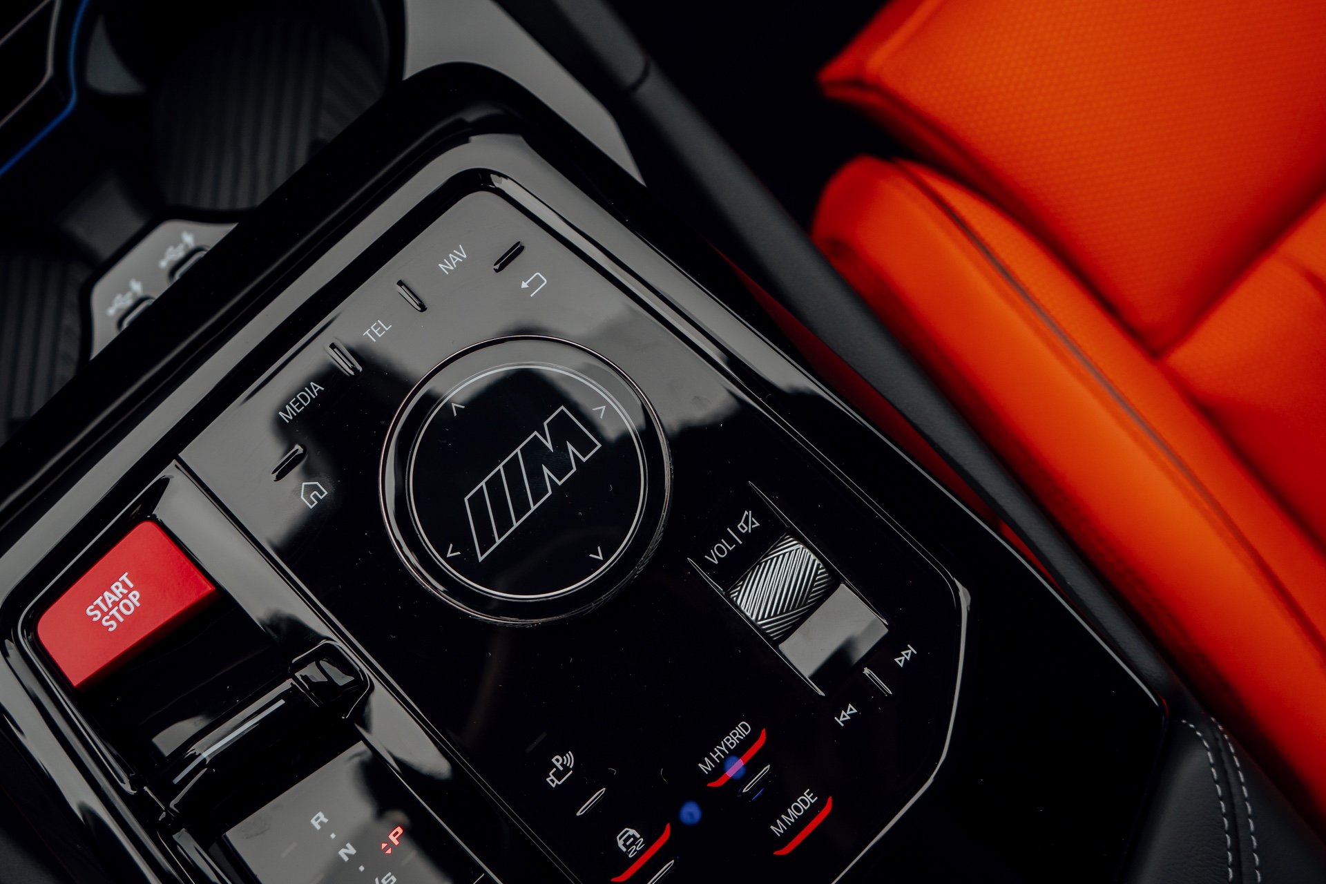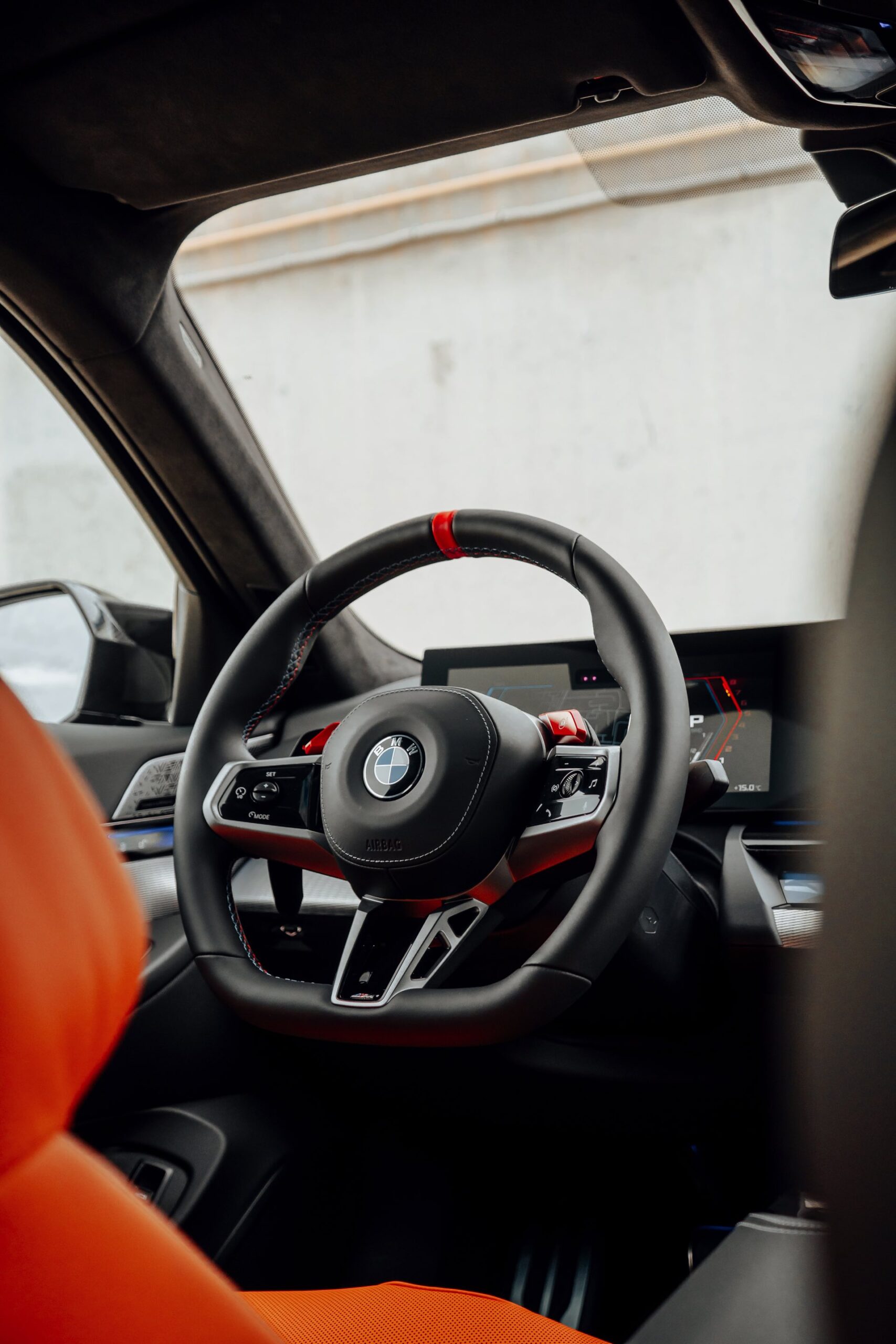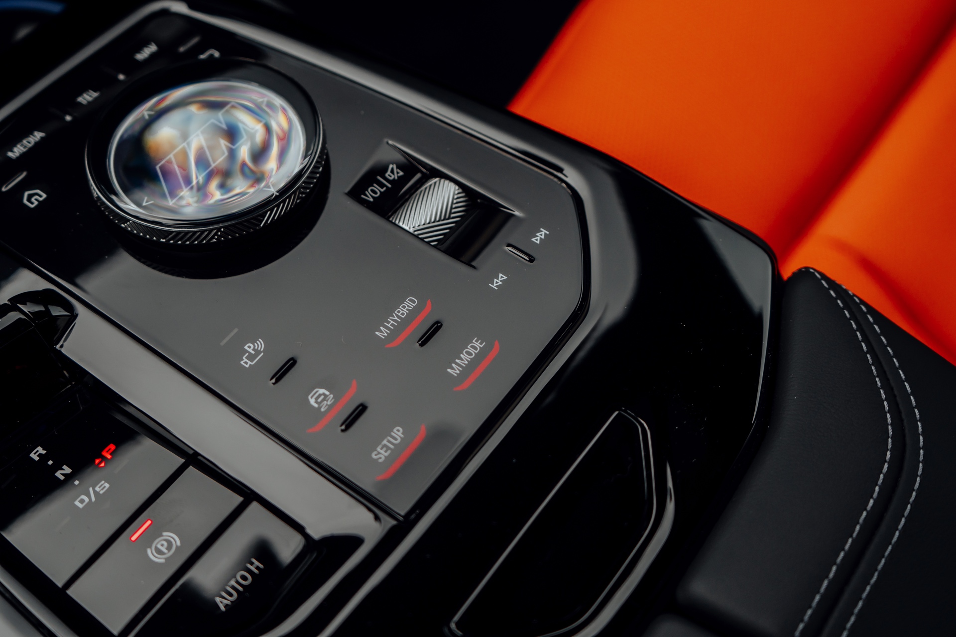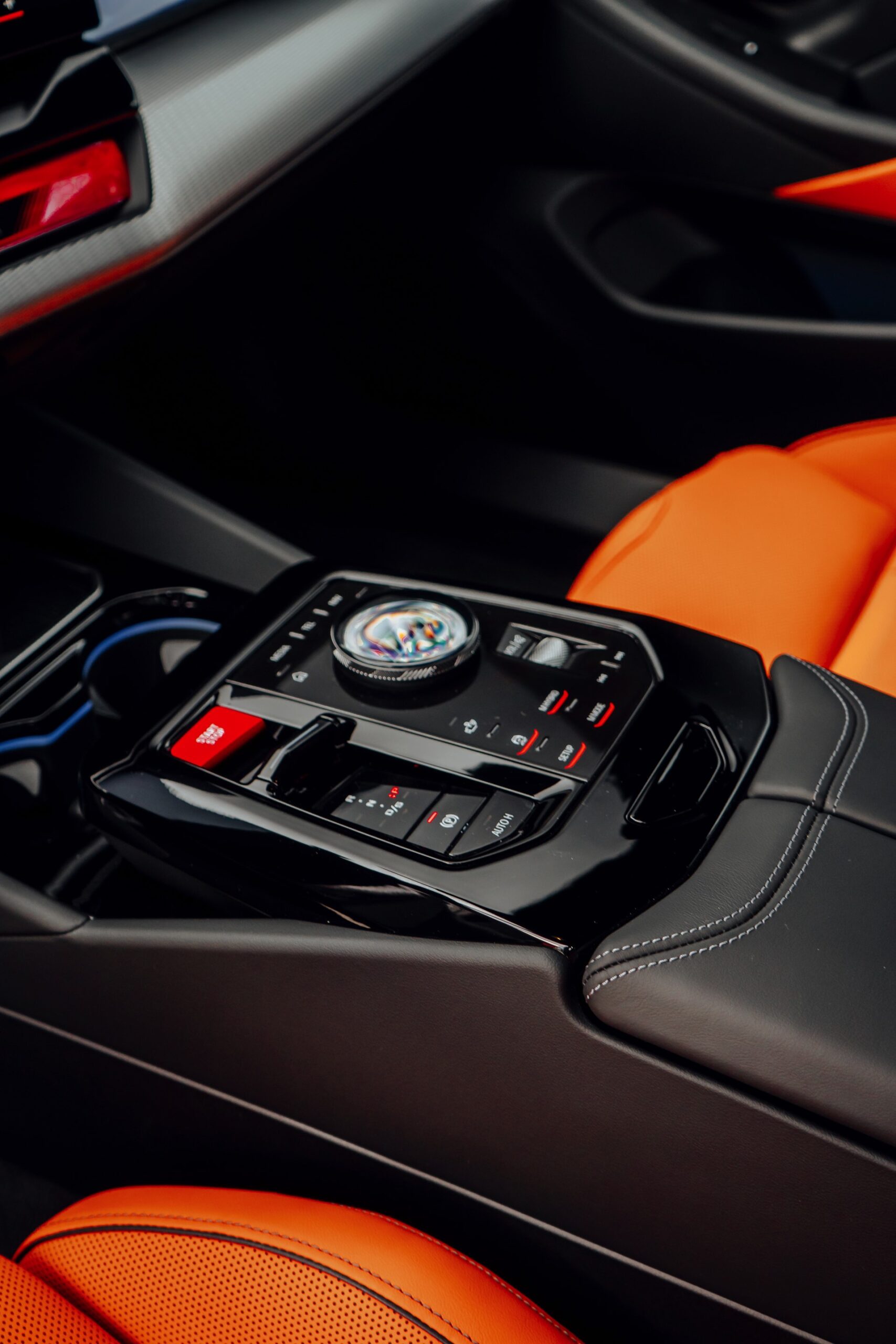 Der Blick in den Innenraum des slowakischen BMW M5 lohnt sich nicht nur aufgrund der Bicolor-Lederausstattung in Kyalami Orange und Schwarz, sondern auch aufgrund der Interieurleisten: Während die meisten bisher abgelichteten M5 die betont-sportliche Variante ‘Carbon Fibre’ getragen haben, sehen wir hier die serienmäßigen Leisten Aluminium Rhombicle mit M Akzent Dunkelsilber:
